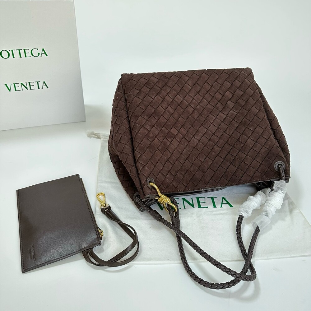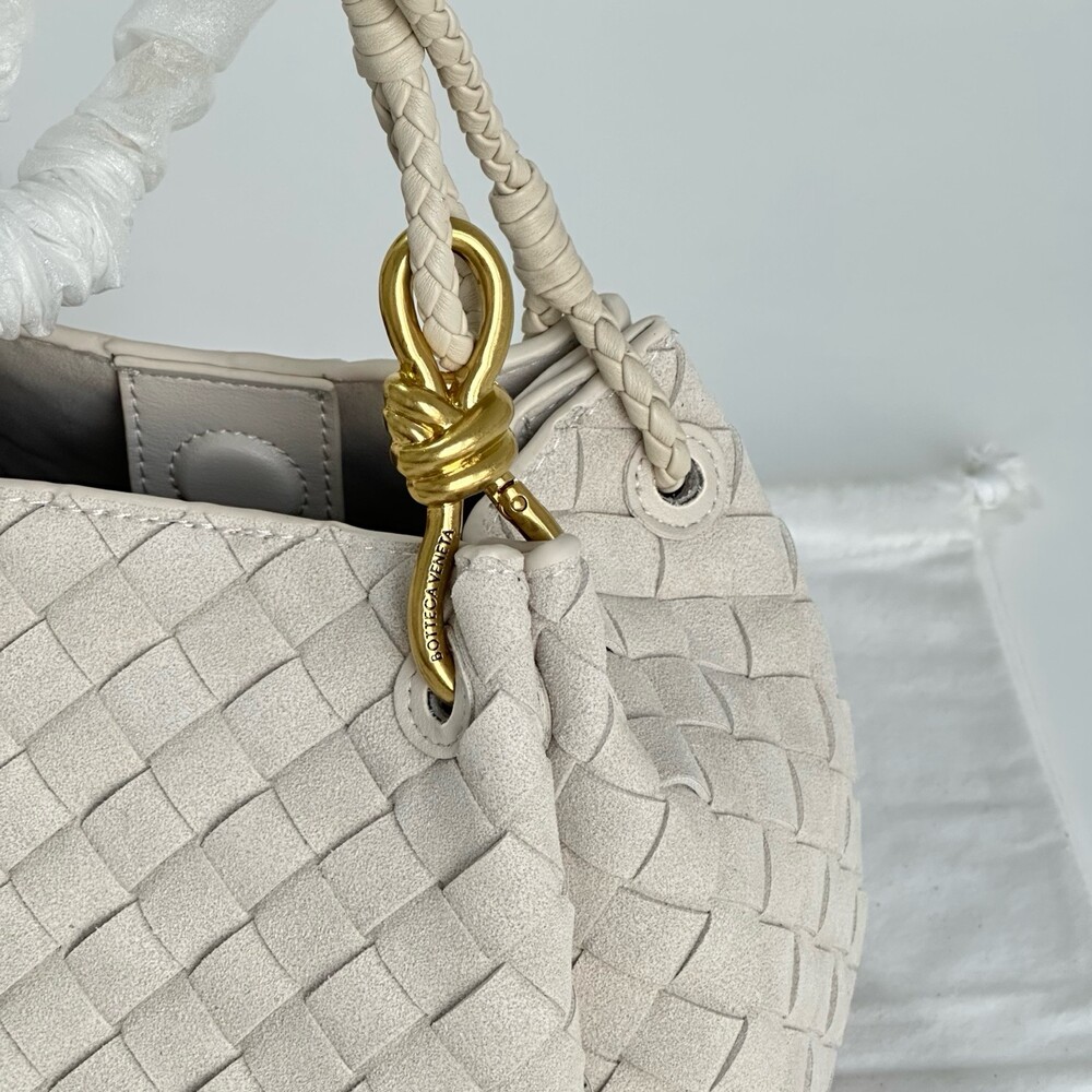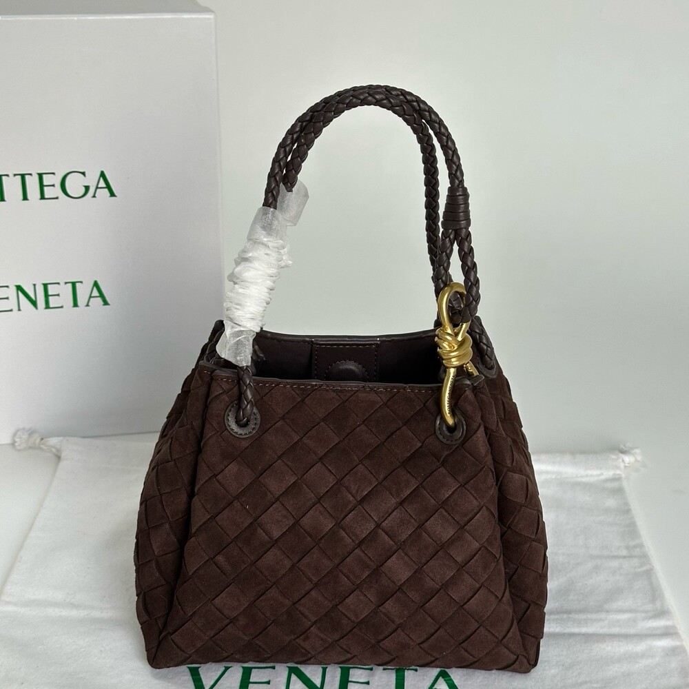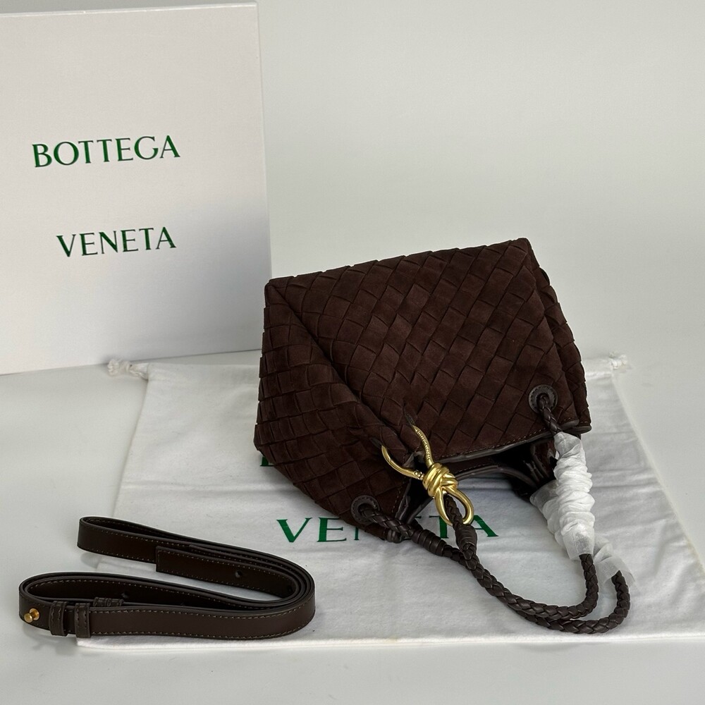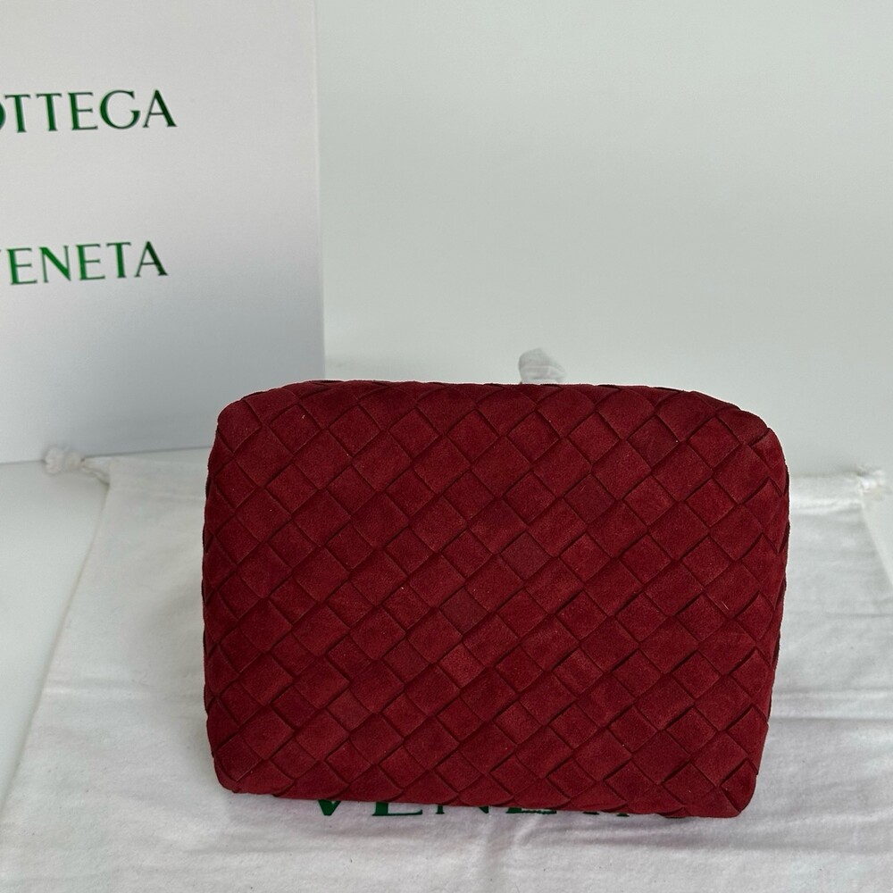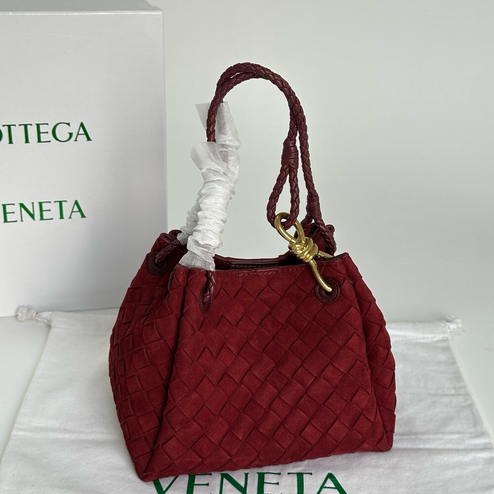 스웨이드 소재와 브랜드 시그니처 인트레치아토 직조 기법을 사용했습니다.