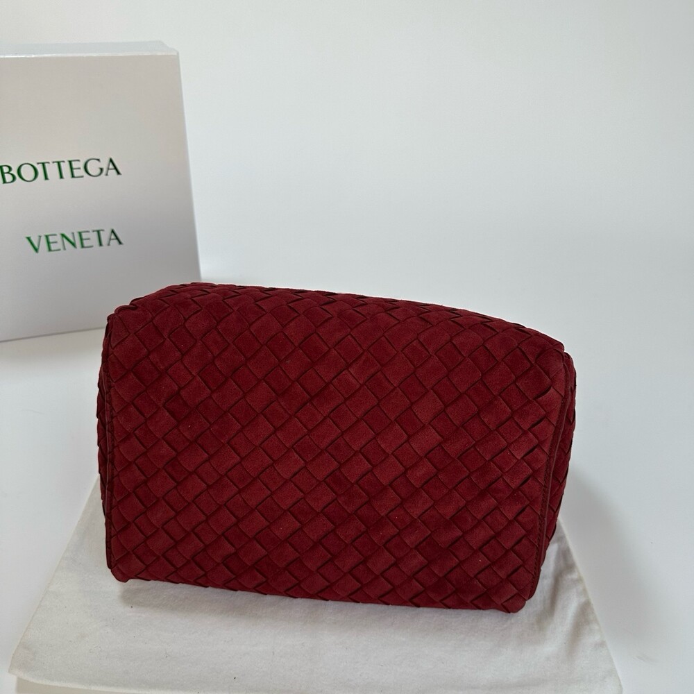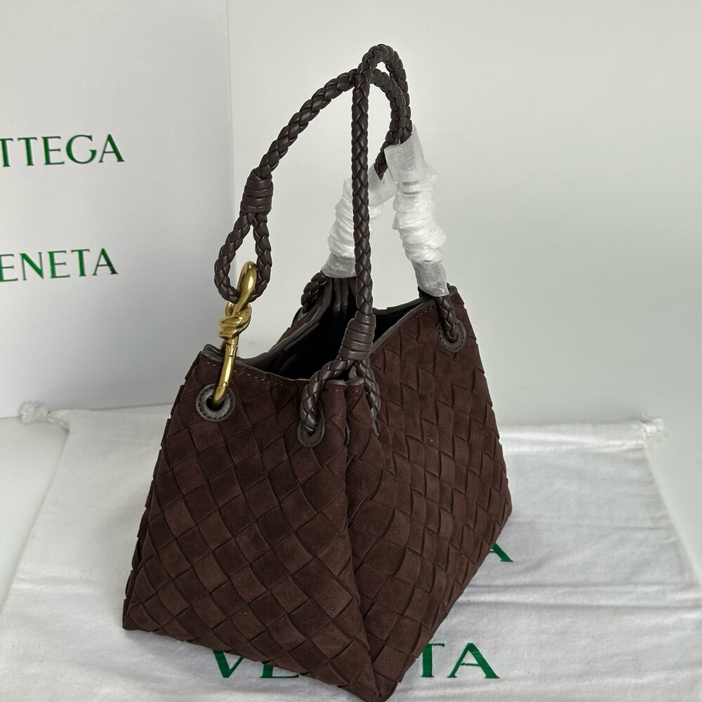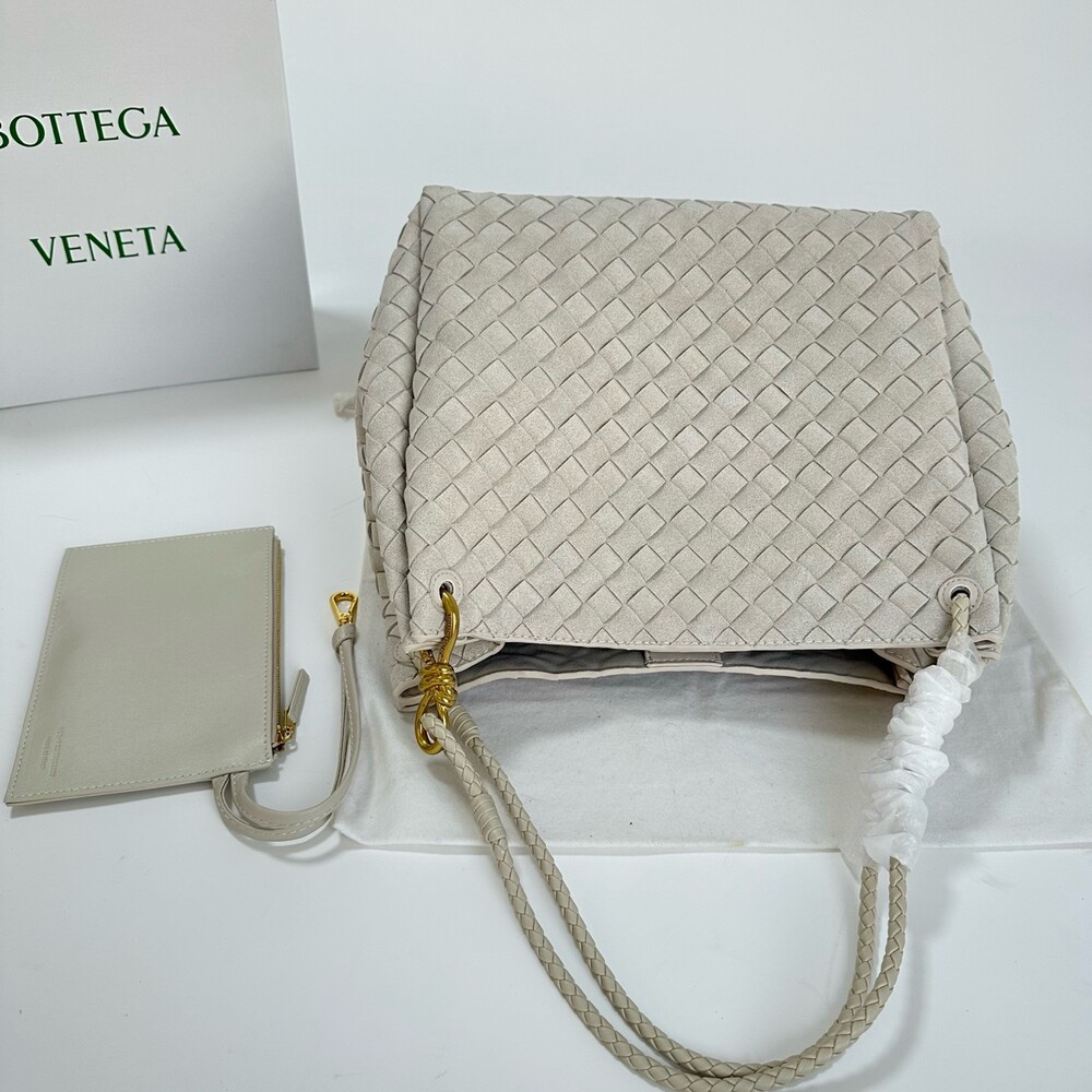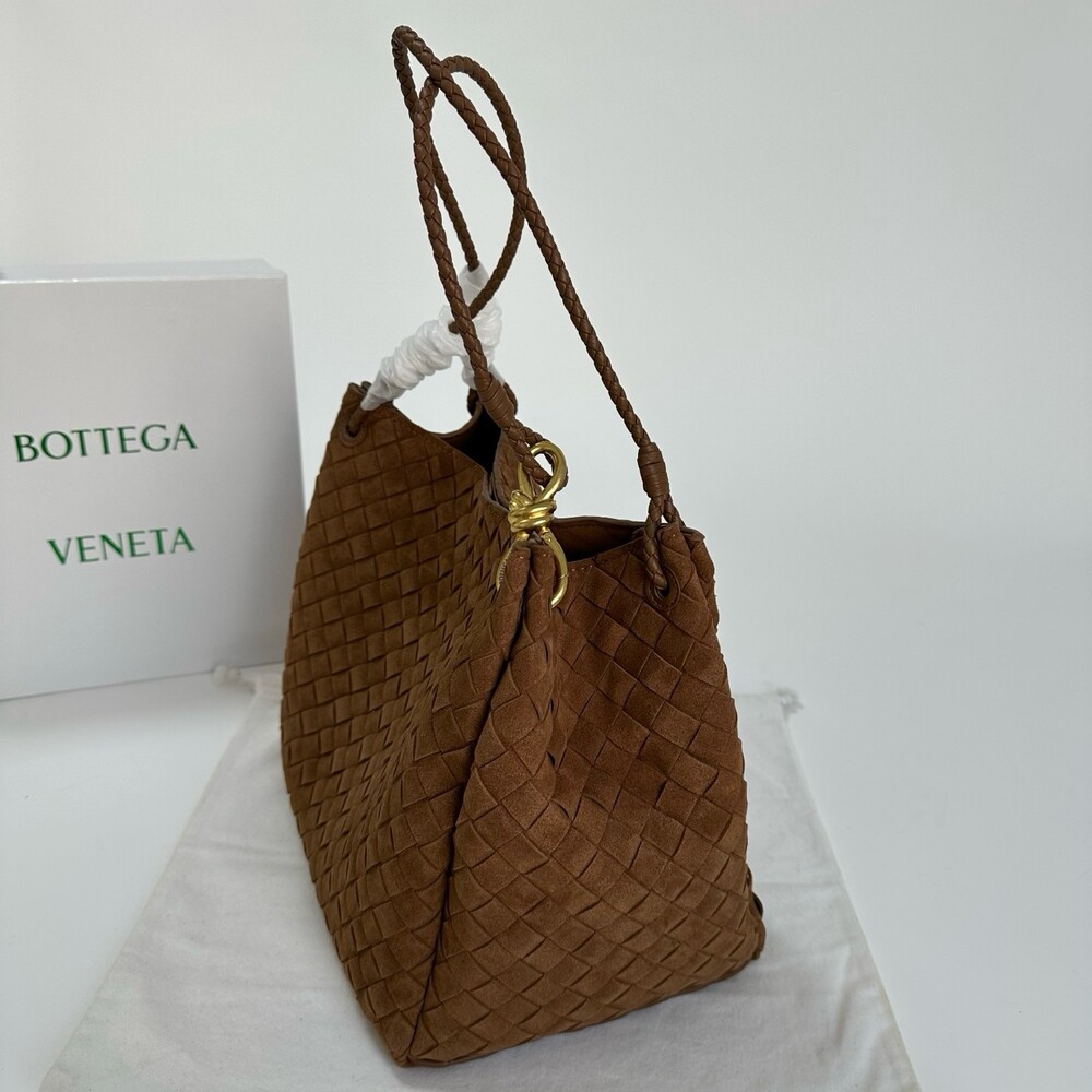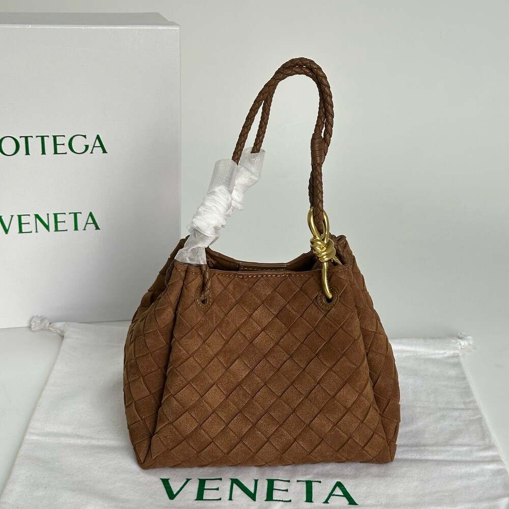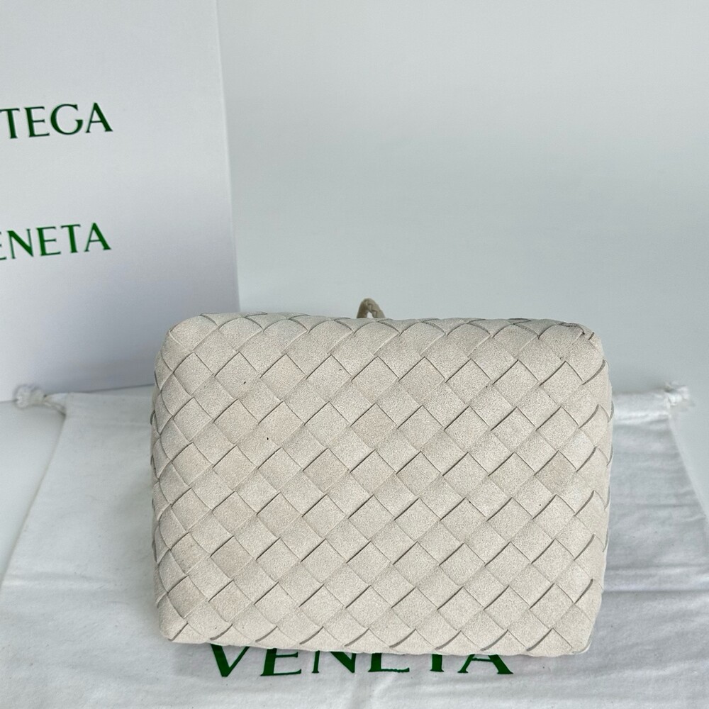 스웨이드 소재와 브랜드 시그니처 인트레치아토 직조 기법을 사용했습니다.