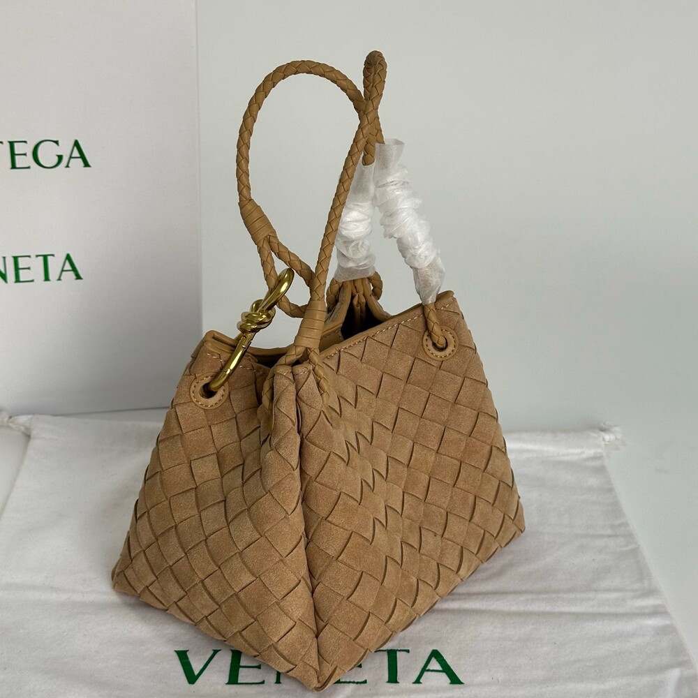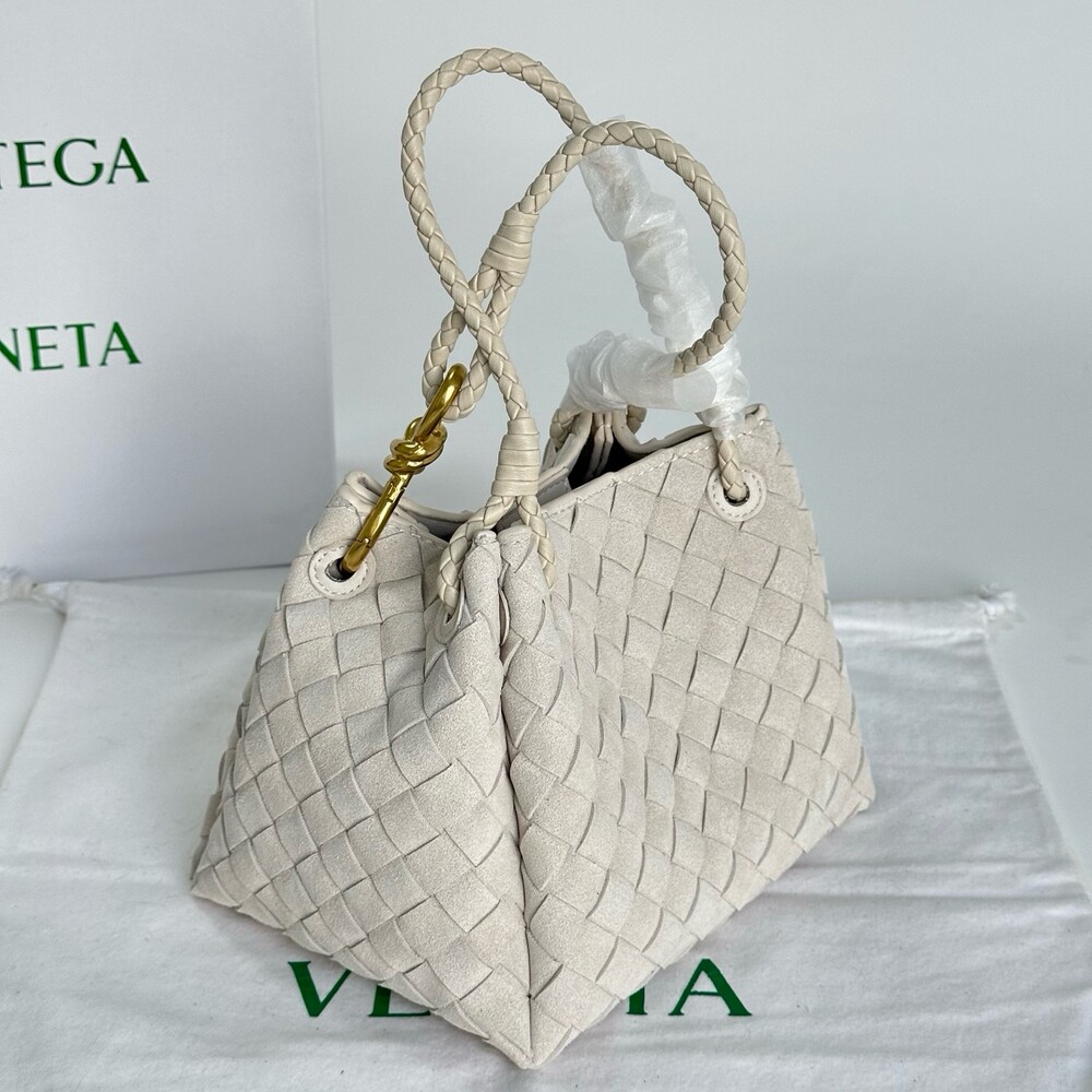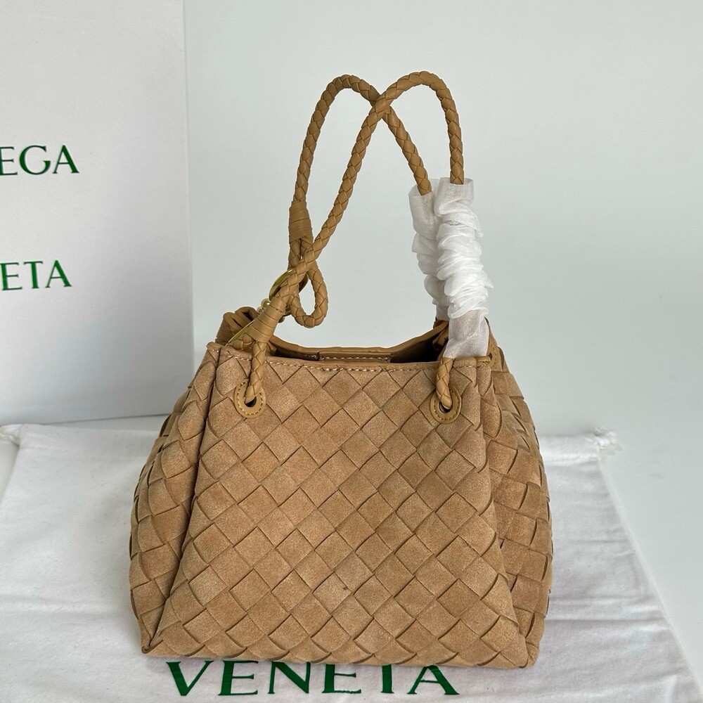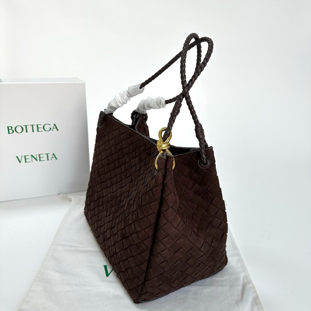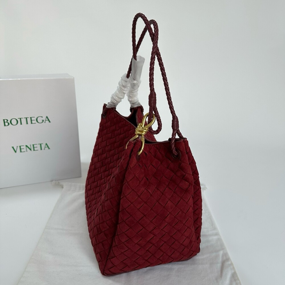 스웨이드 소재와 브랜드 시그니처 인트레치아토 직조 기법을 사용했습니다.