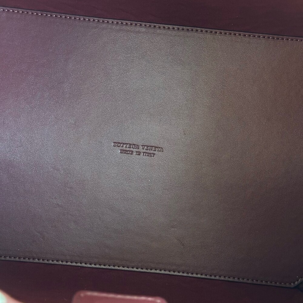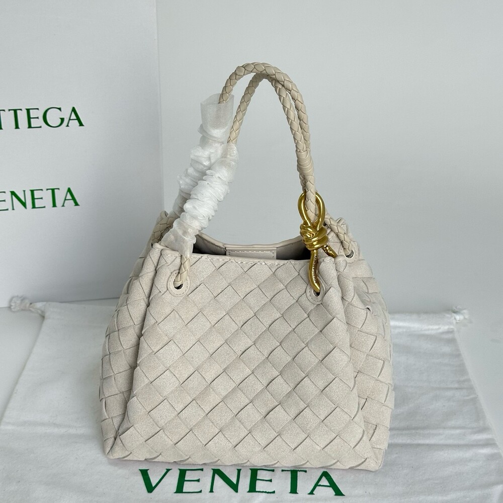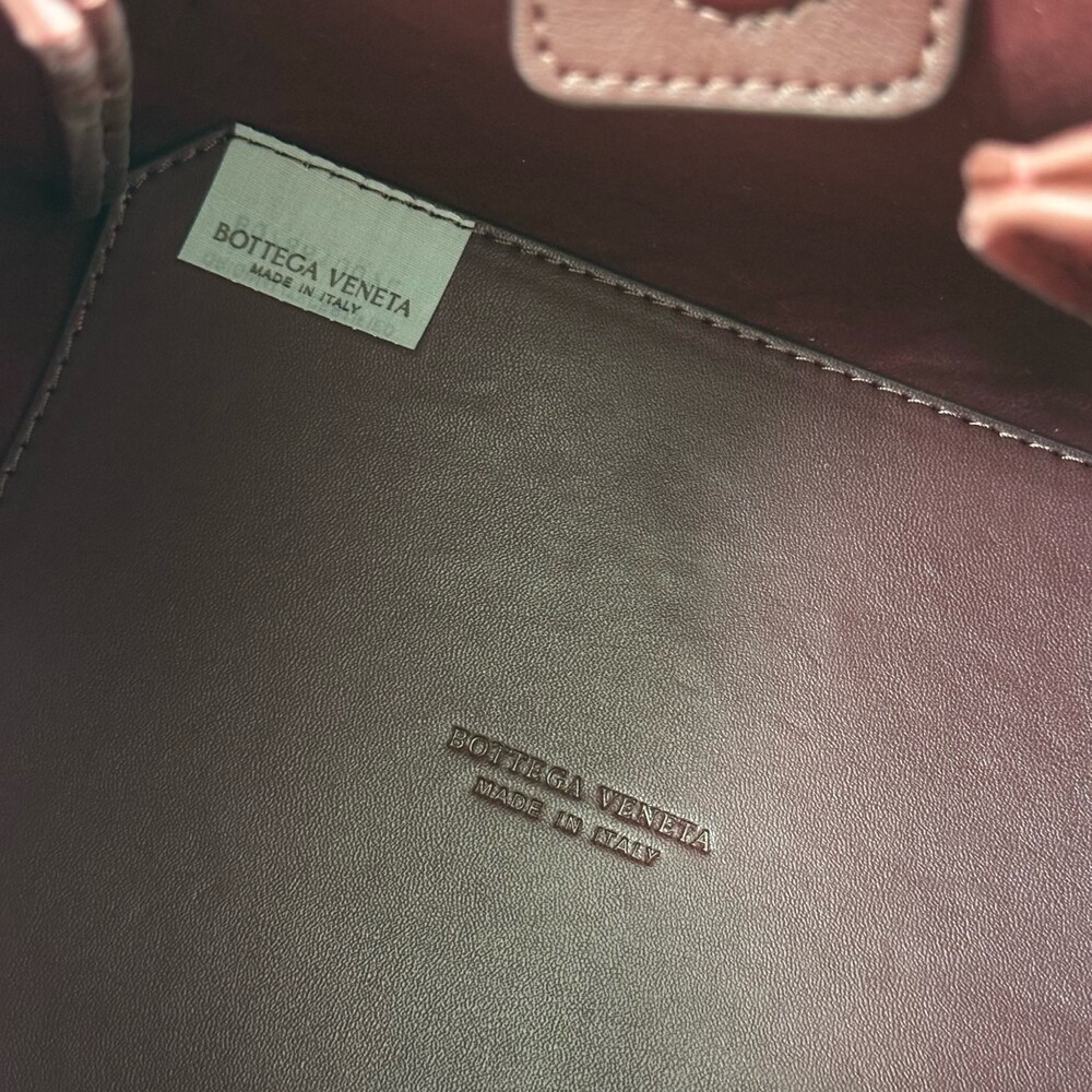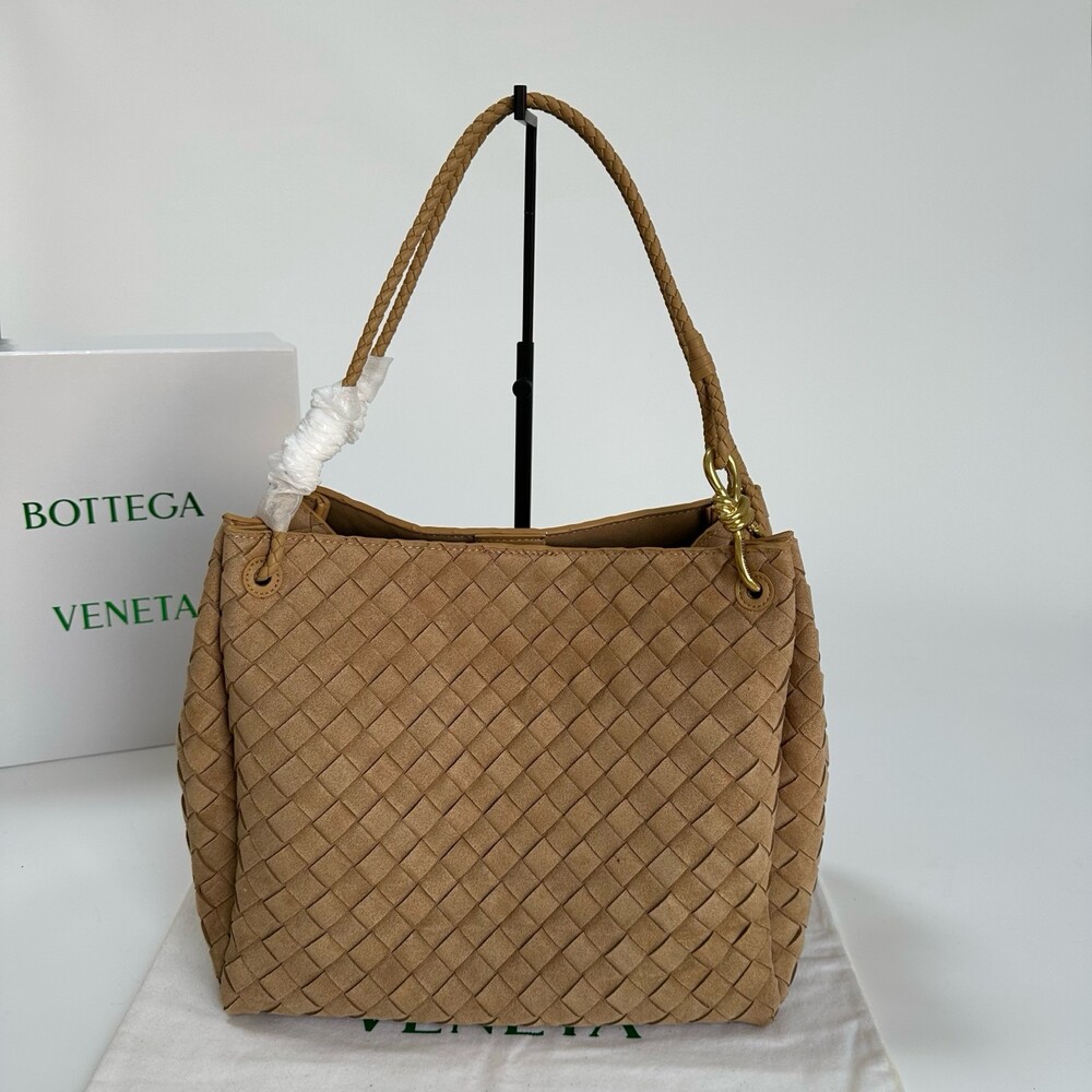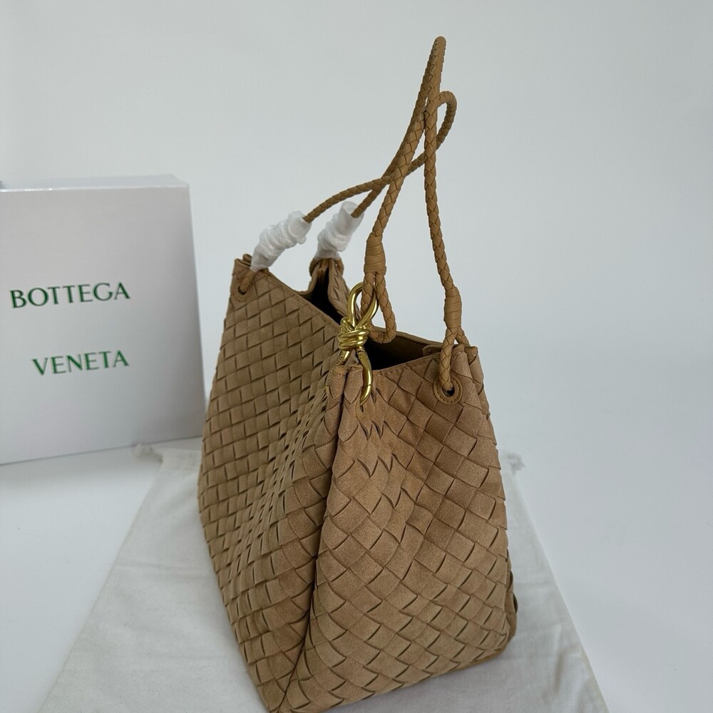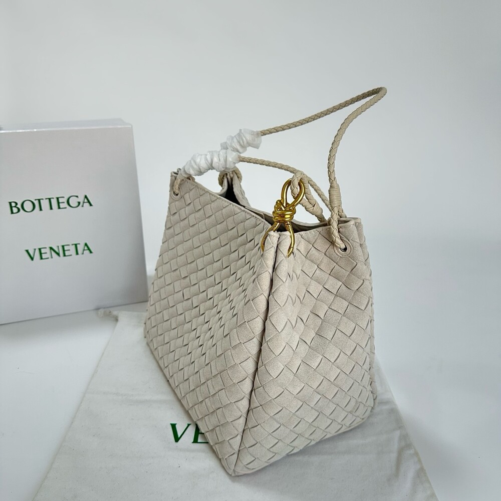스웨이드 소재와 브랜드 시그니처 인트레치아토 직조 기법을 사용했습니다.