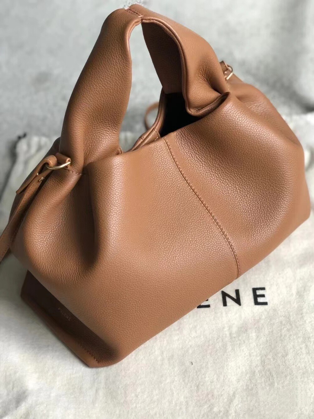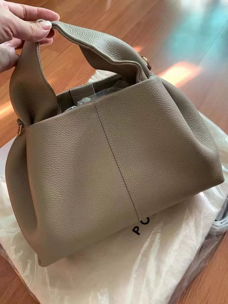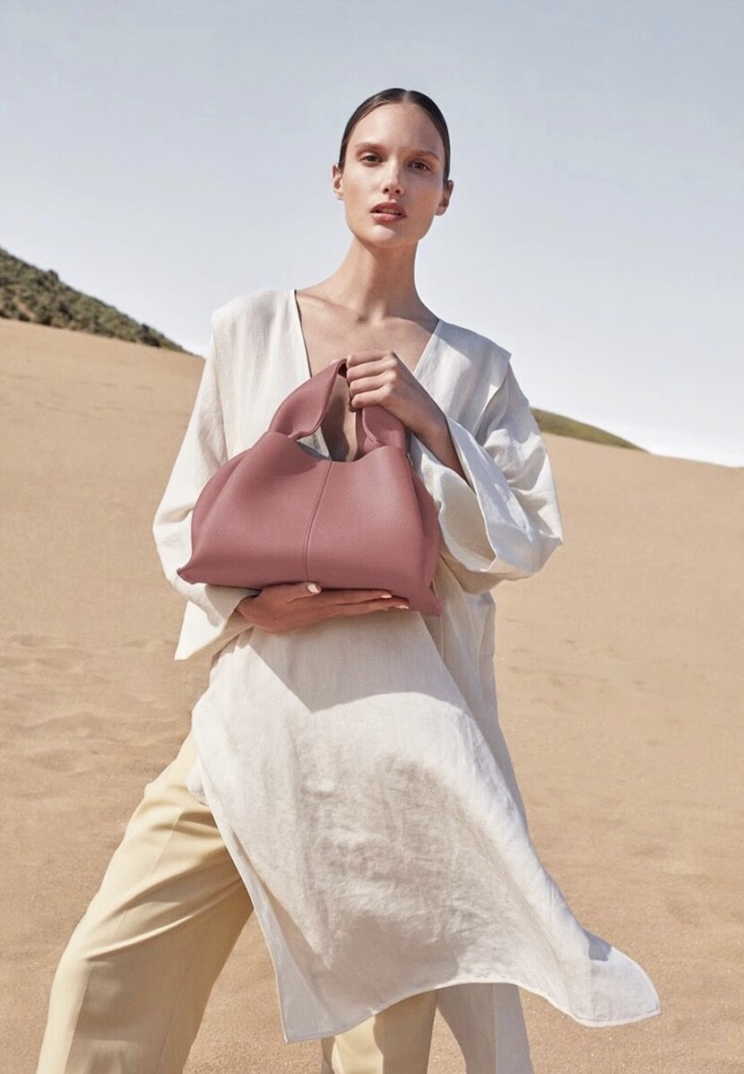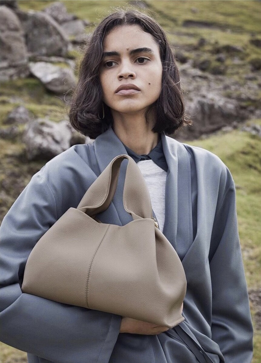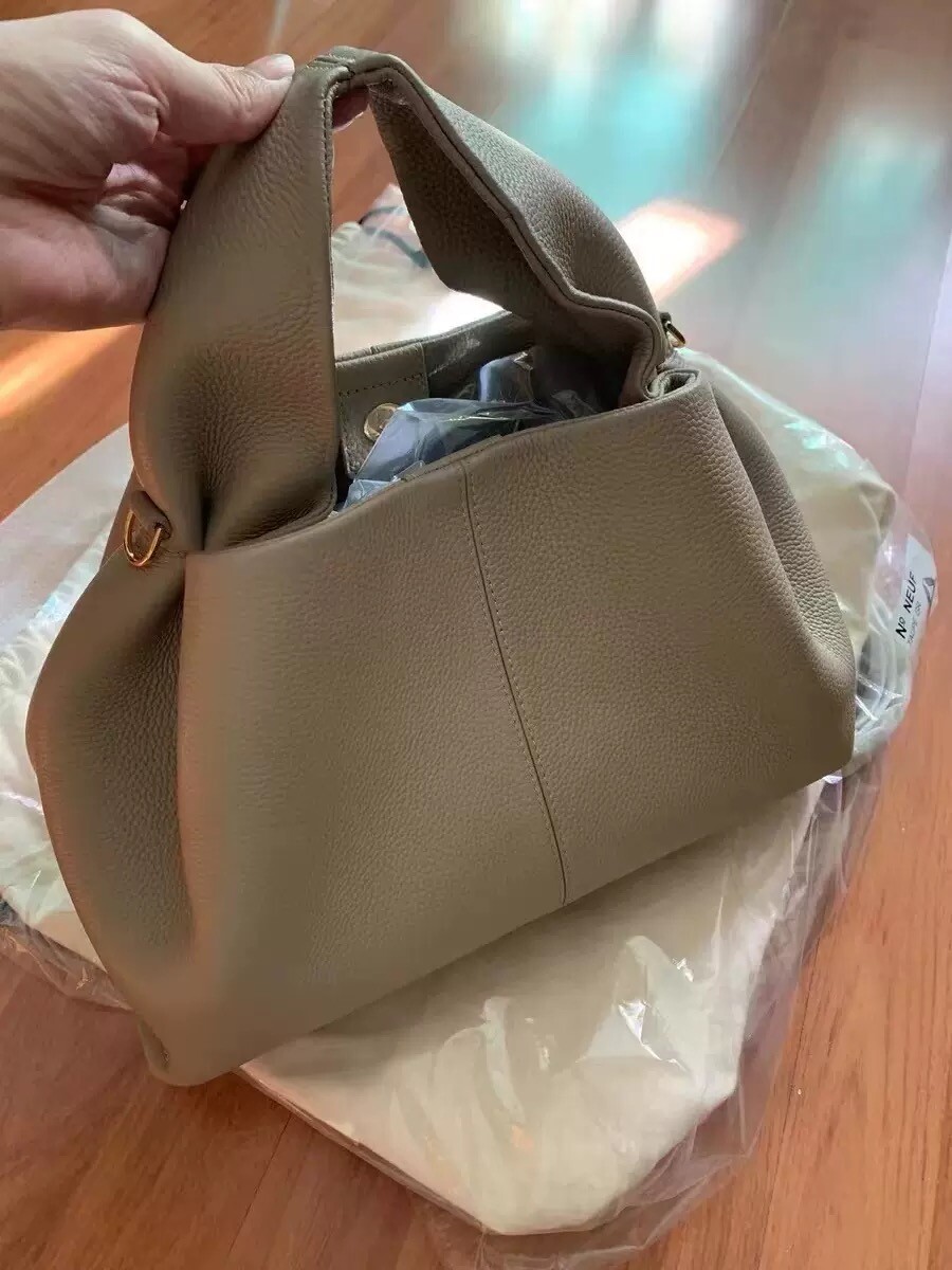 드레이프 처리된 풀 그레인 카프 스킨은 이 백의 조각성과 우아한 형태감을 선사합니다.