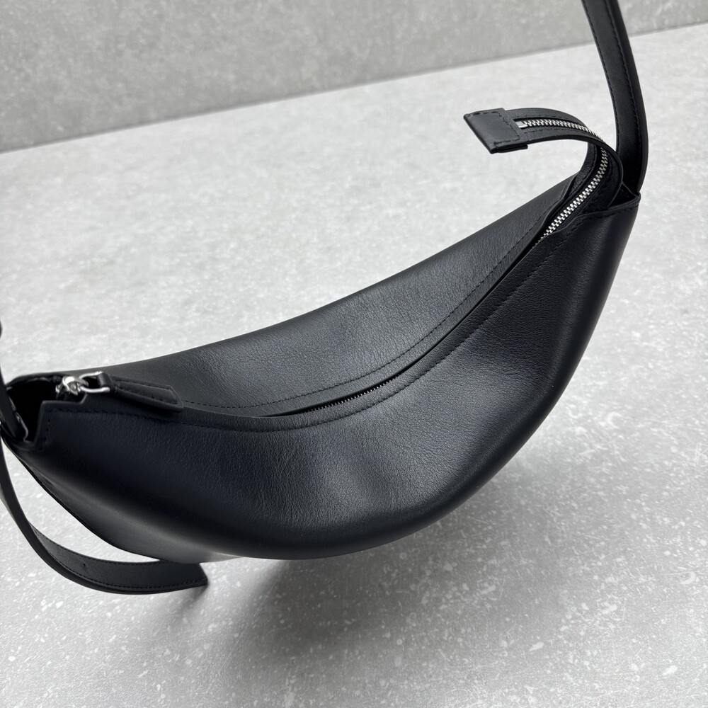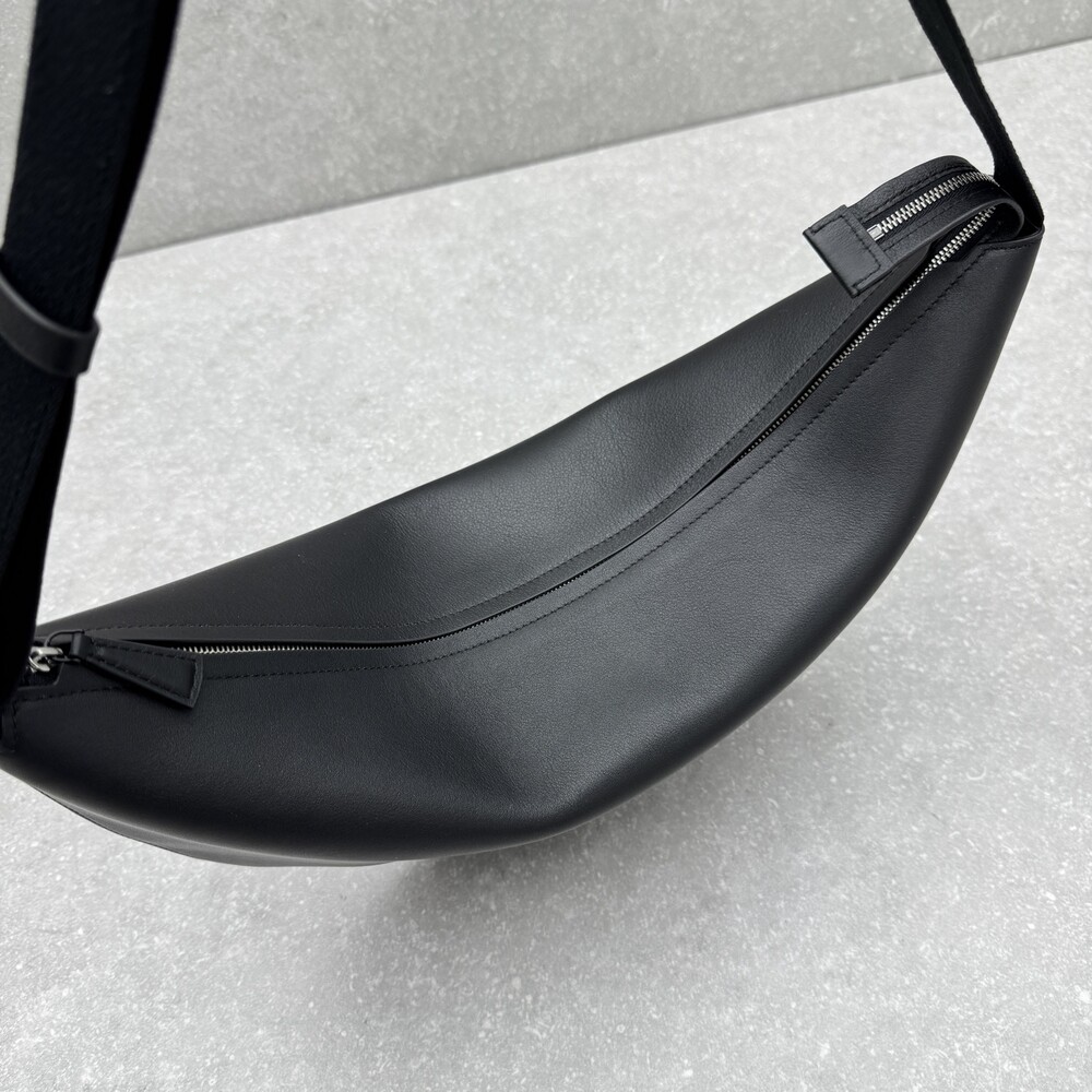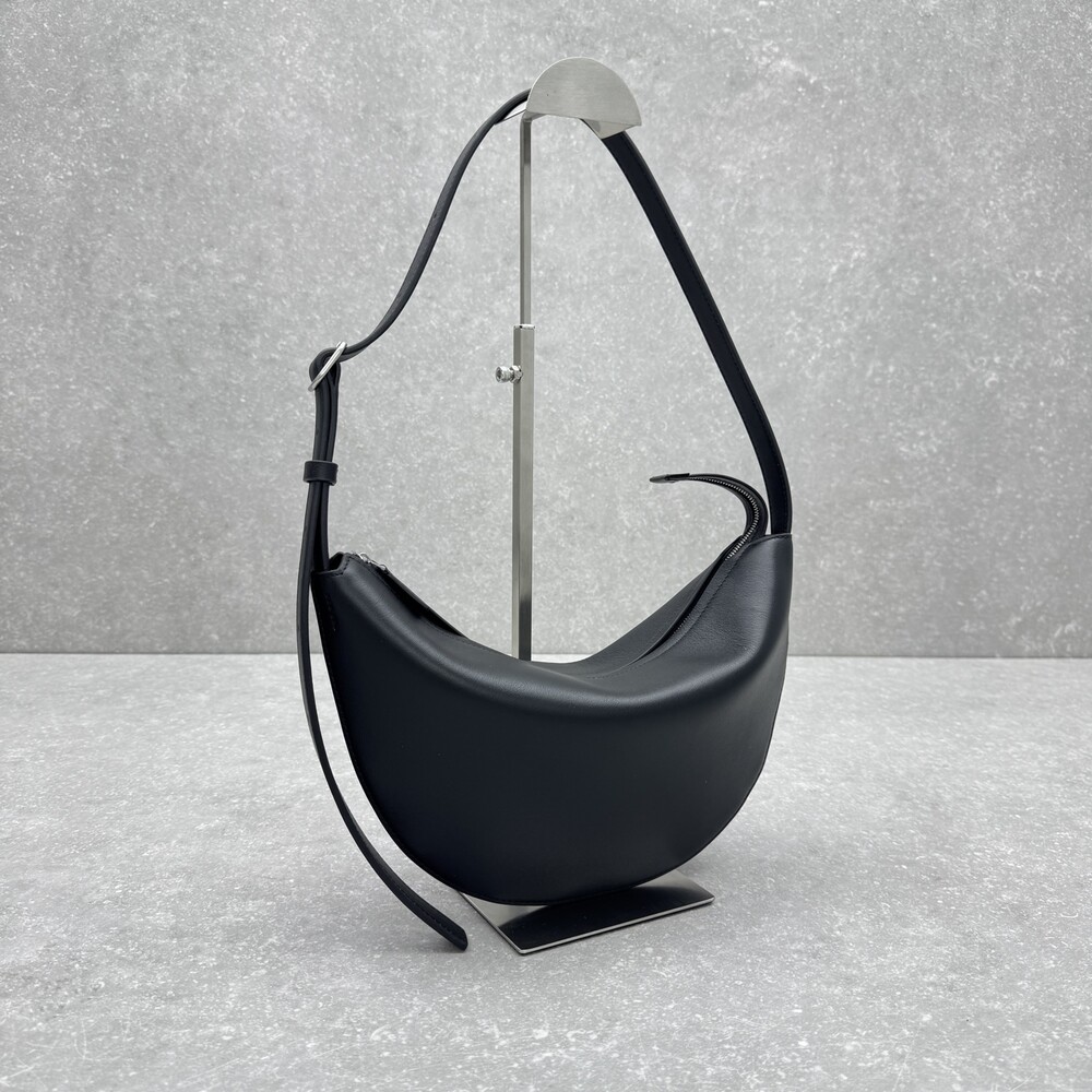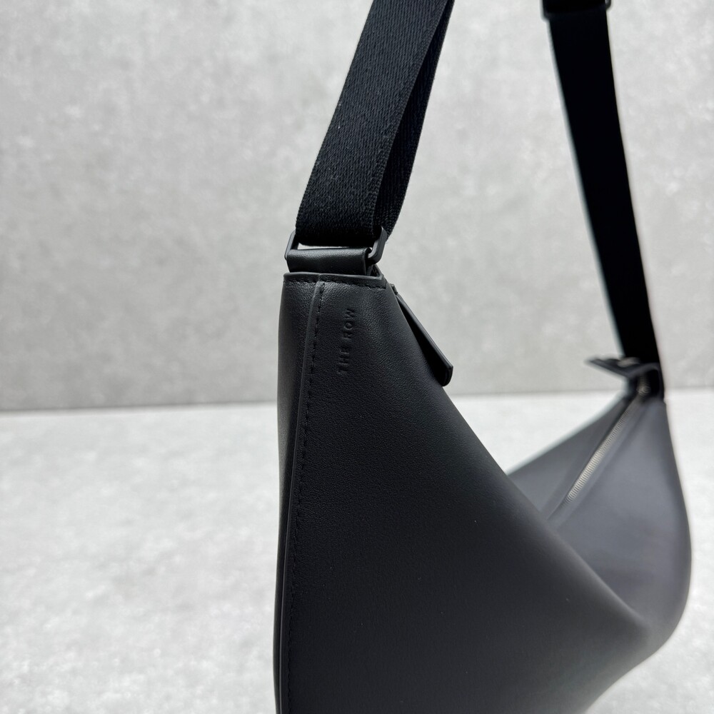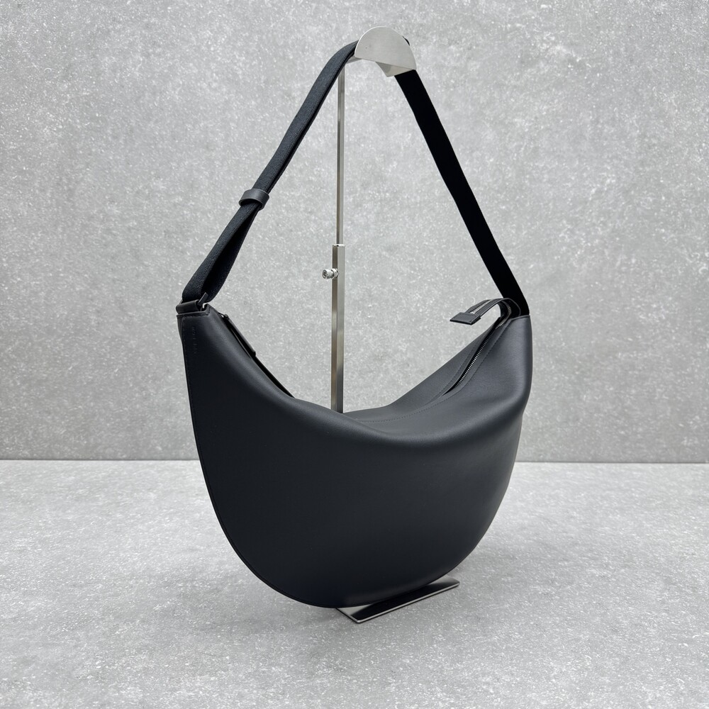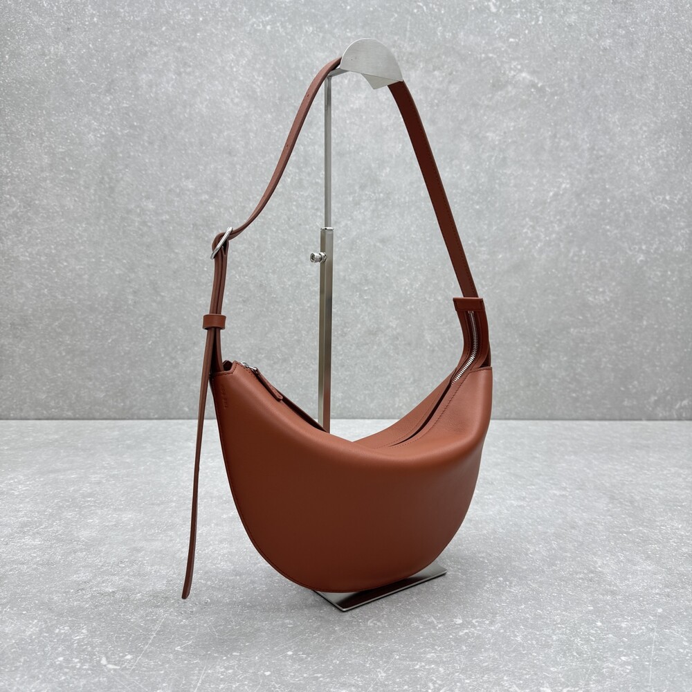 세련된 그레인 송아지 가죽 소재의 초승달 모양 크로스바디 백으로, 지퍼 클로저와 금속 버튼이 달린 조절식 스트랩이 특징입니다.