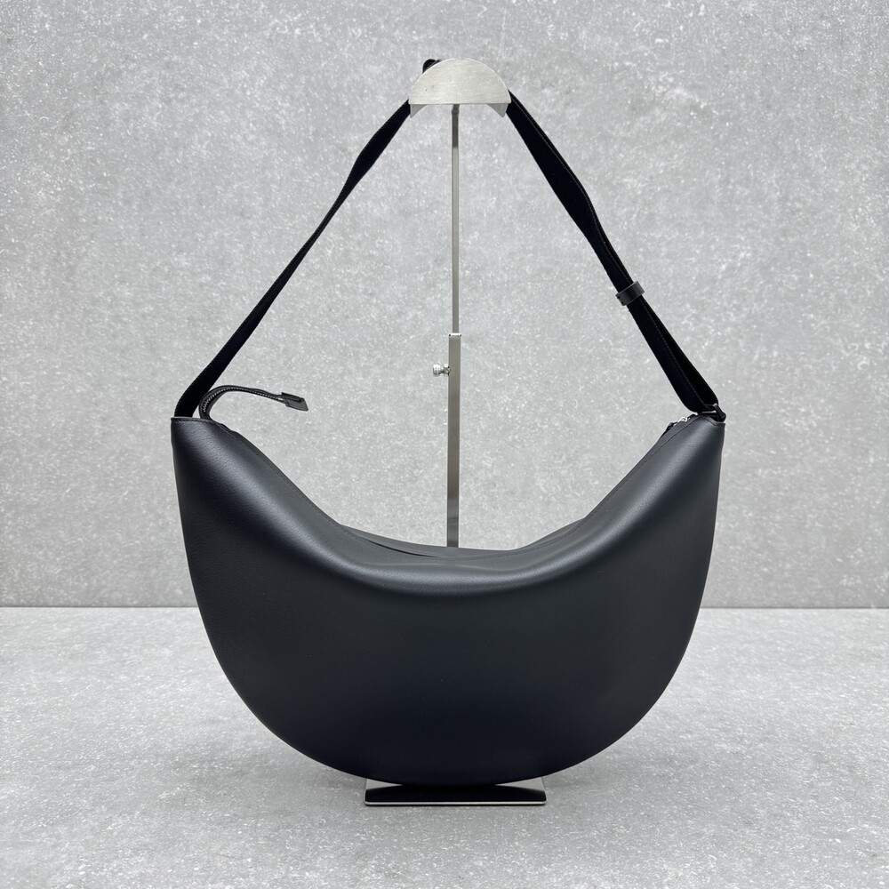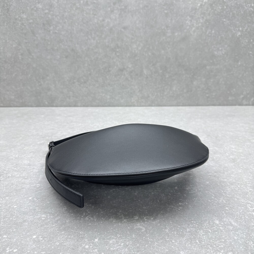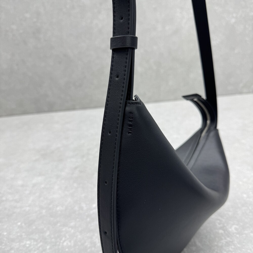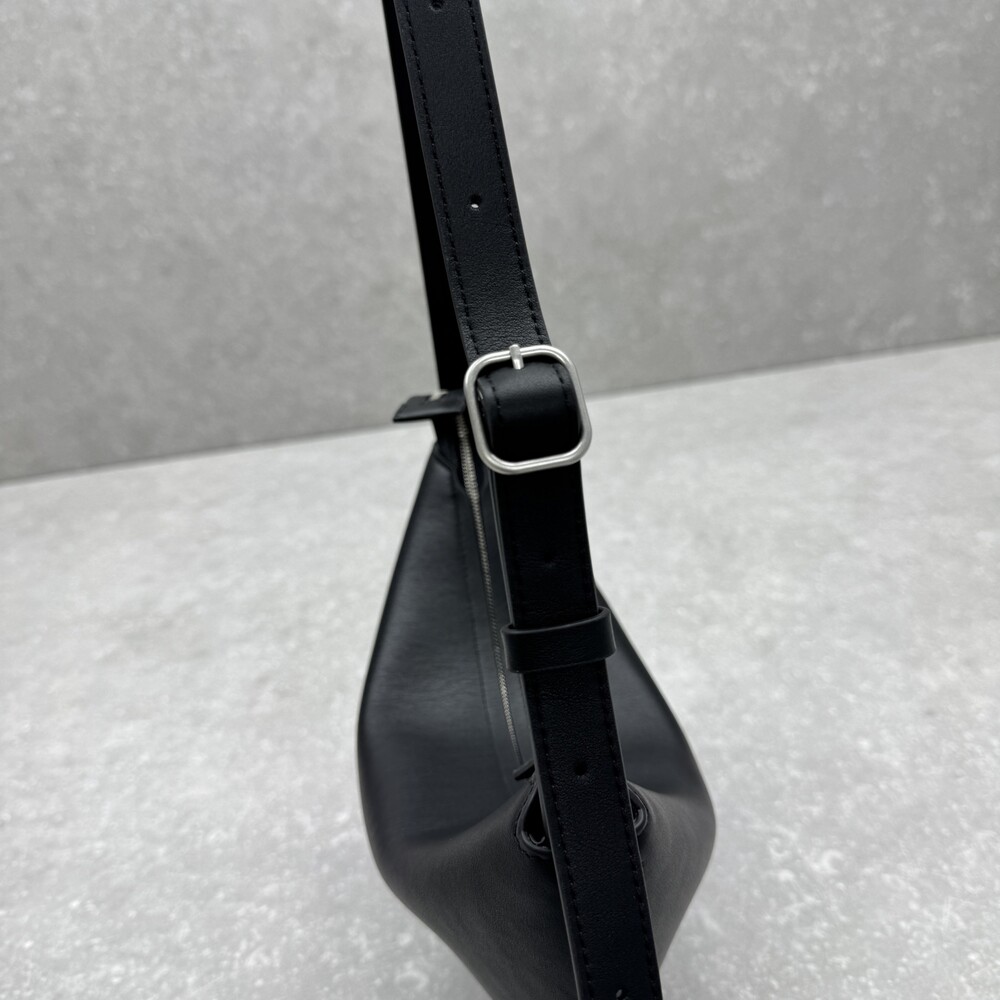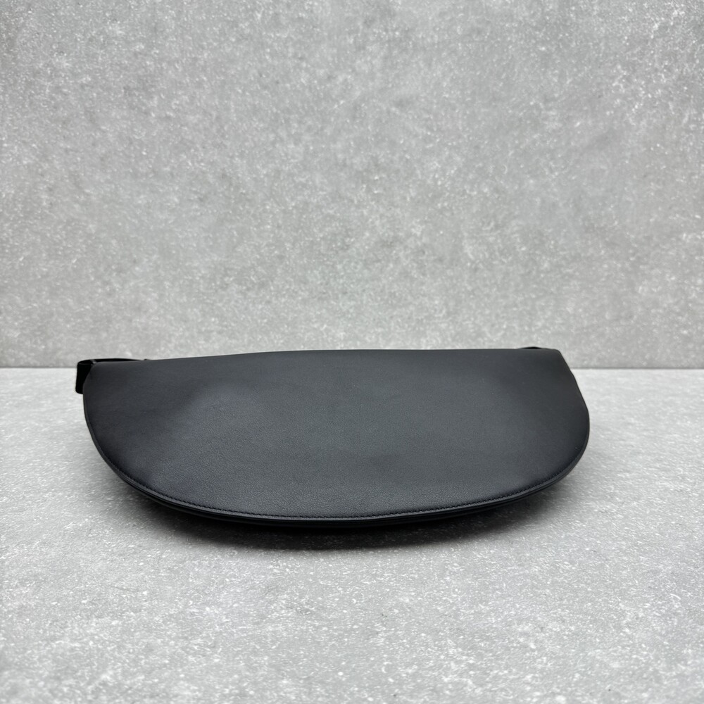 세련된 그레인 송아지 가죽 소재의 초승달 모양 크로스바디 백으로, 지퍼 클로저와 금속 버튼이 달린 조절식 스트랩이 특징입니다.
