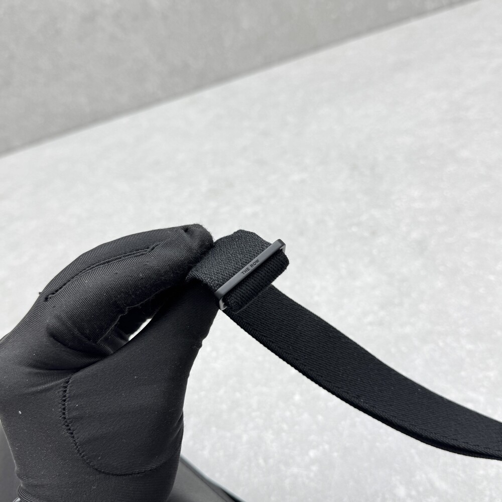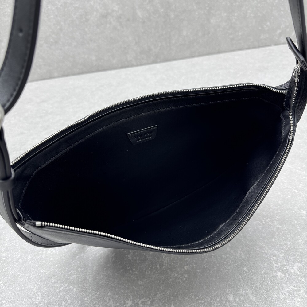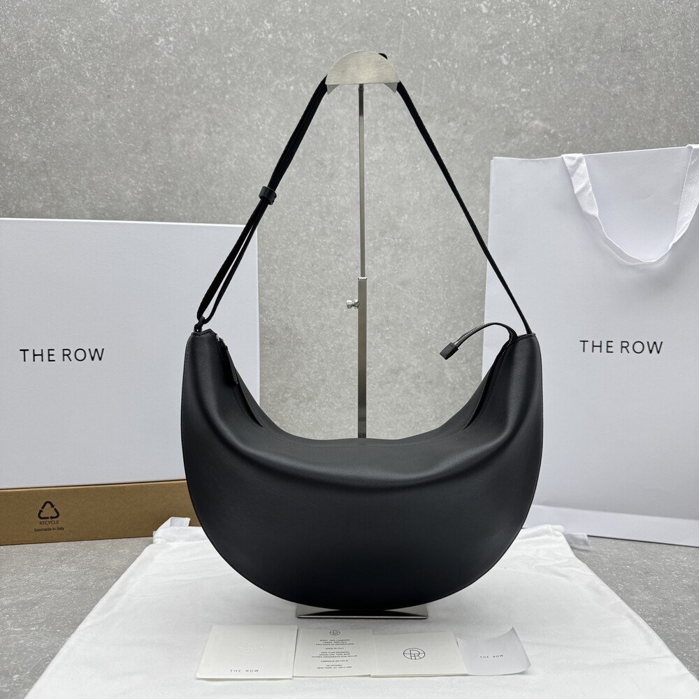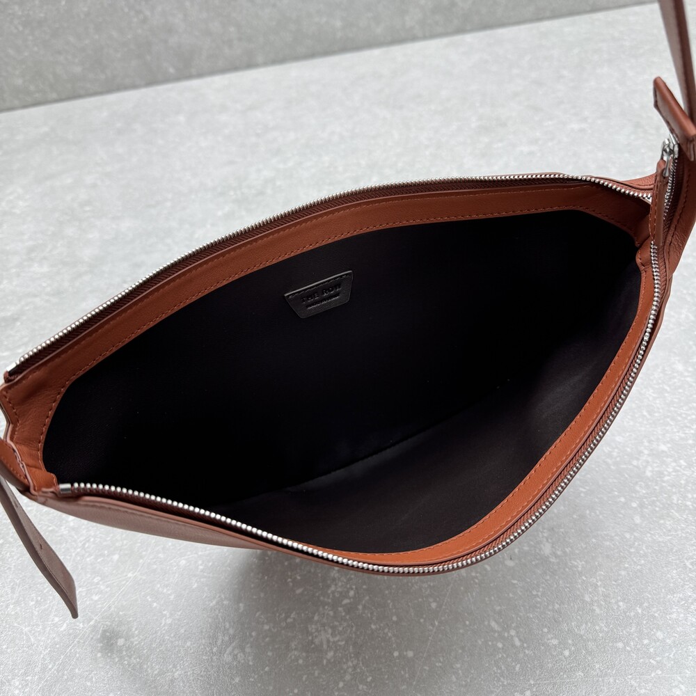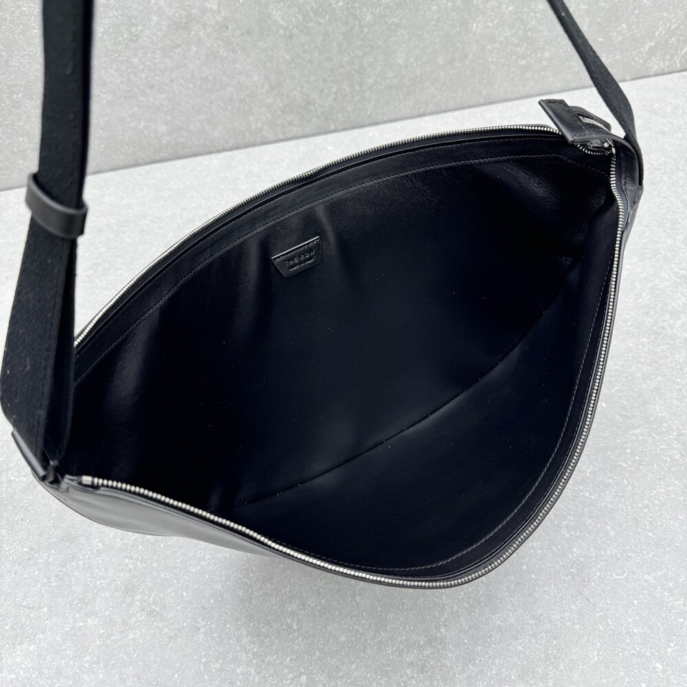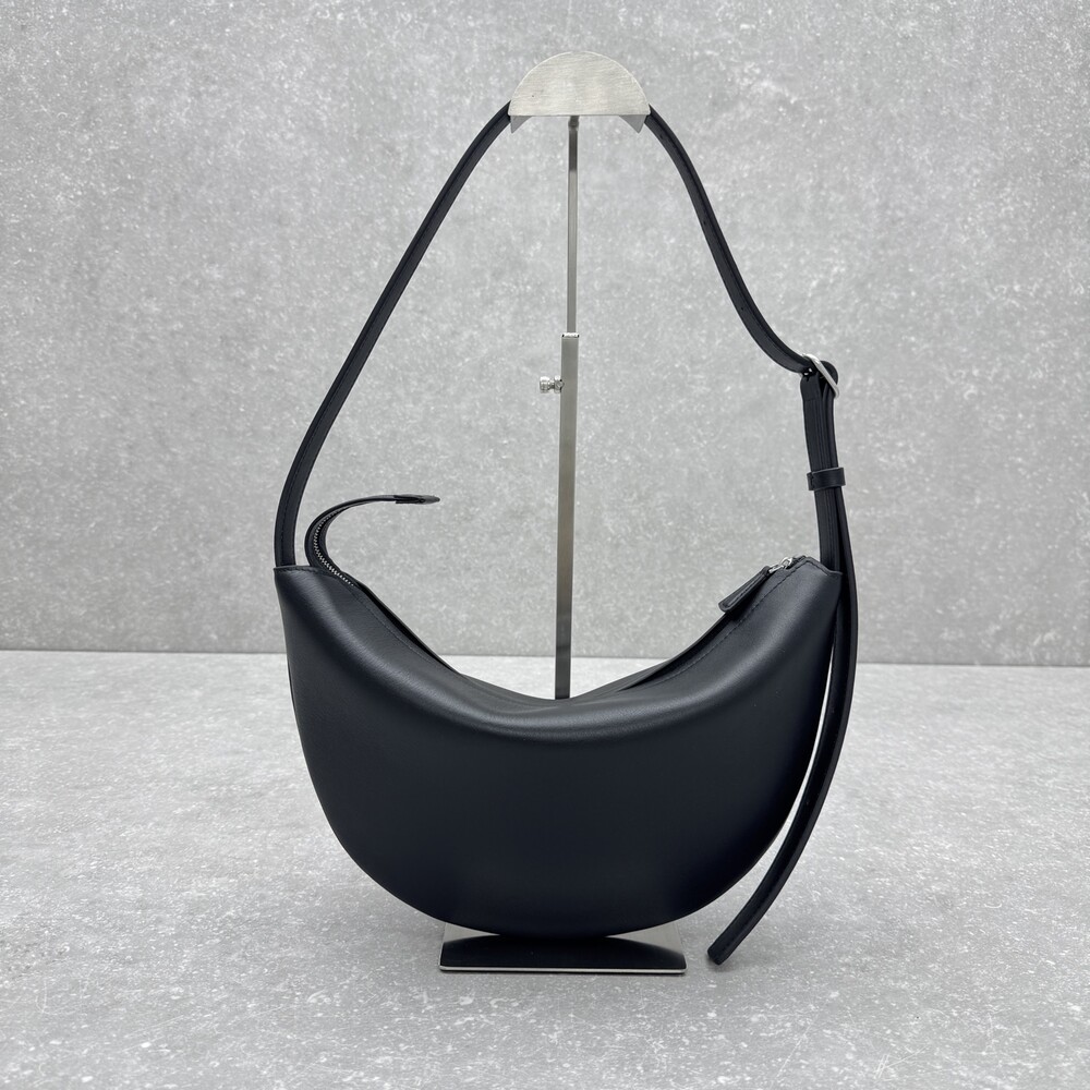 세련된 그레인 송아지 가죽 소재의 초승달 모양 크로스바디 백으로, 지퍼 클로저와 금속 버튼이 달린 조절식 스트랩이 특징입니다.