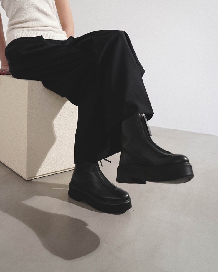 스무드 카프스킨 가죽과 그레인 누벅 가죽소재의 유틸리태리언 앵클 부츠. 앞면 지퍼 및 두꺼운 크레이프 솔.