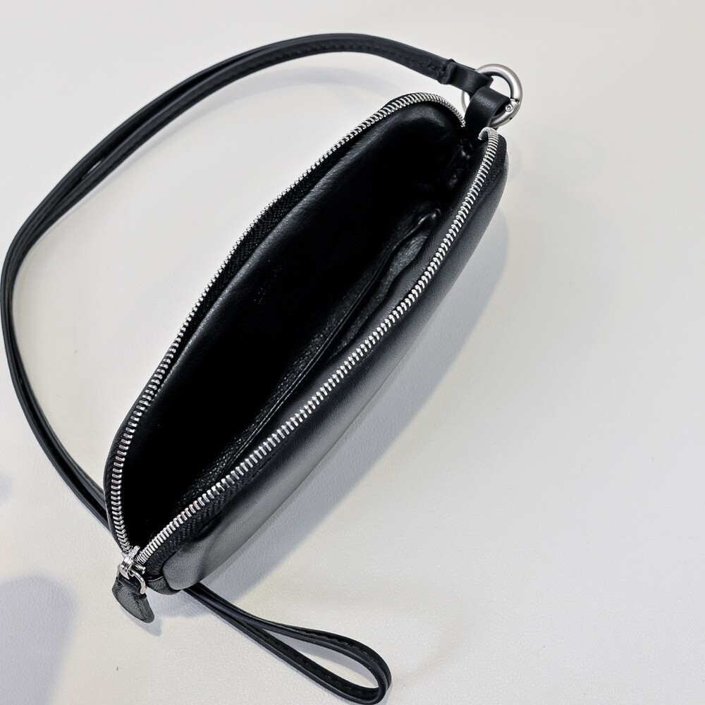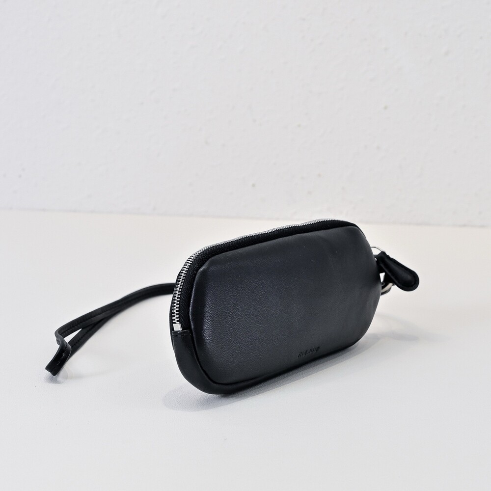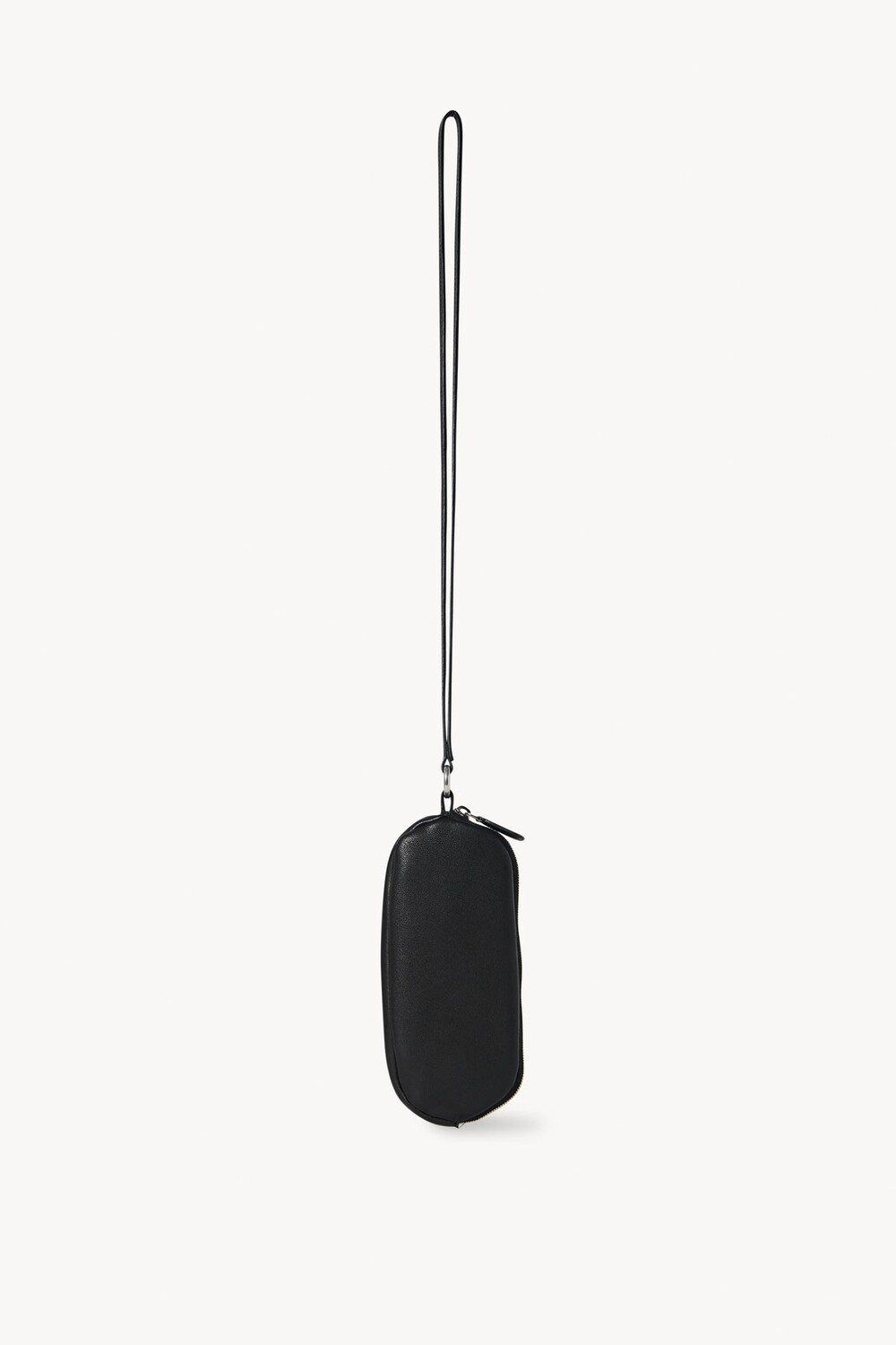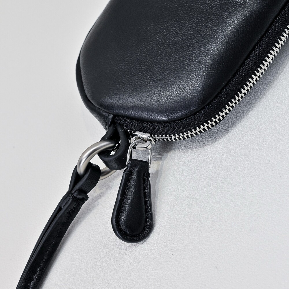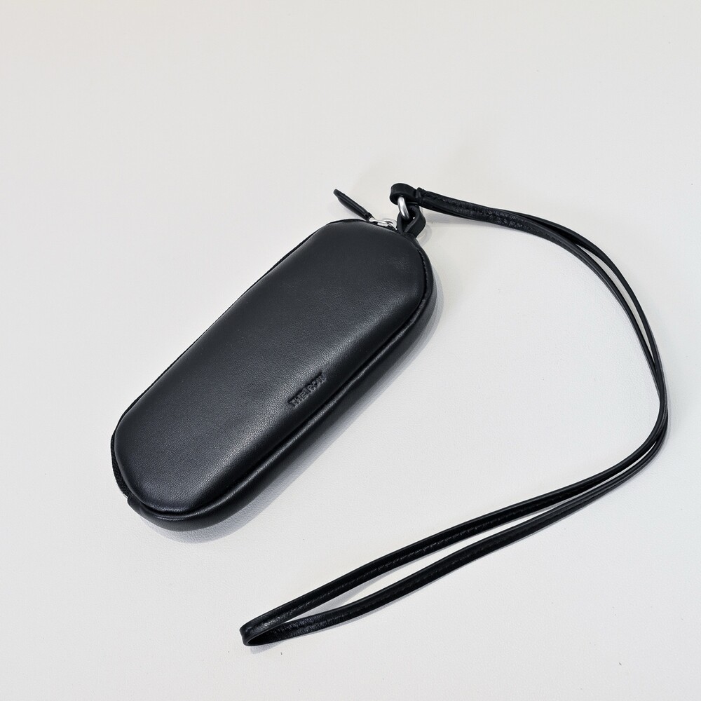 매트 나파 가죽 소재의 심플한 선글라스 케이스. 긴 가죽 스트랩과 지퍼 클로저.