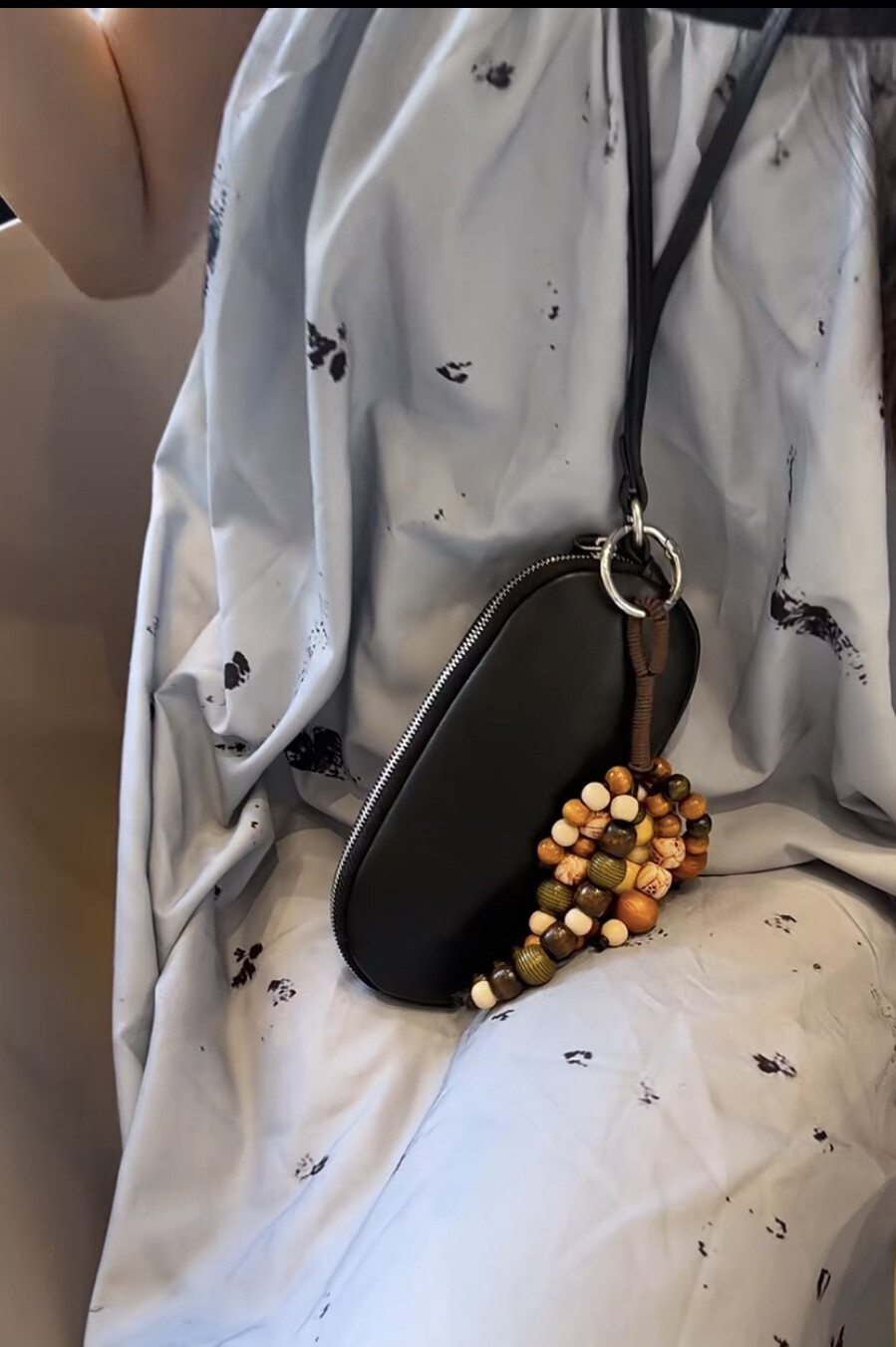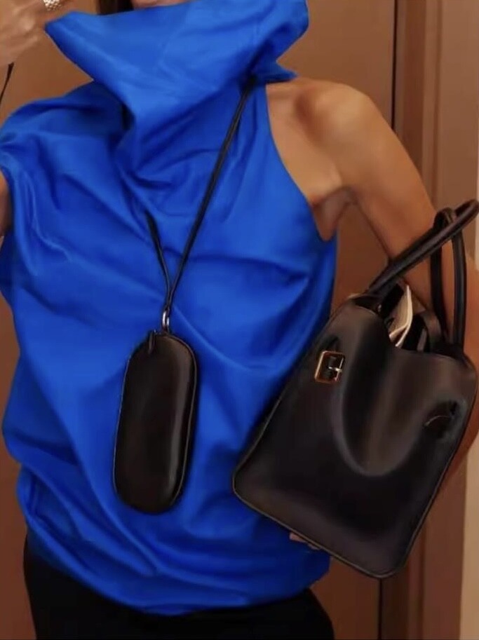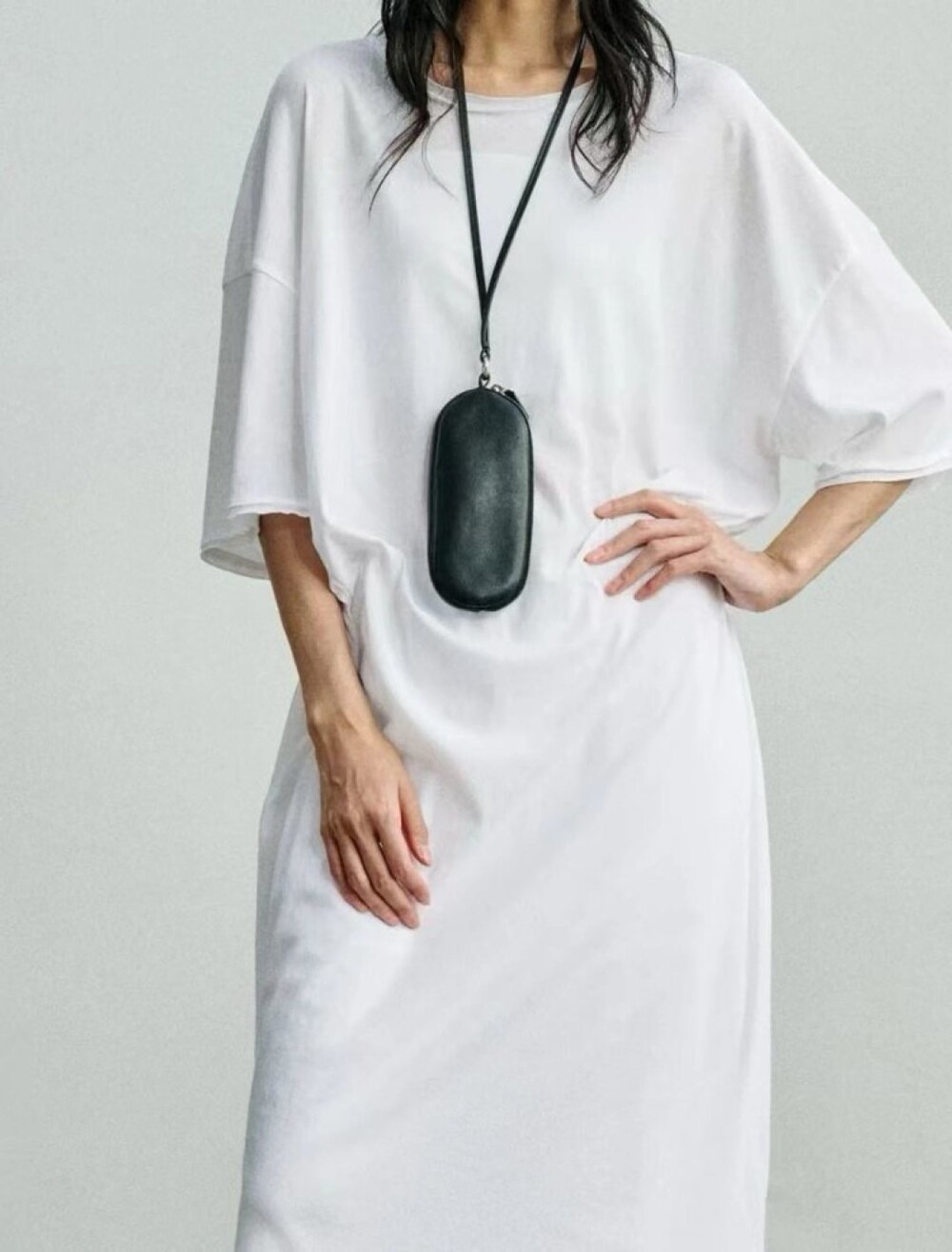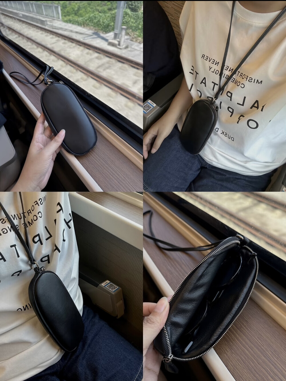 매트 나파 가죽 소재의 심플한 선글라스 케이스. 긴 가죽 스트랩과 지퍼 클로저.