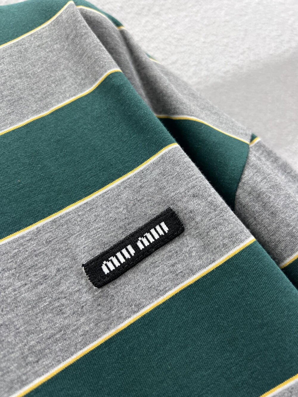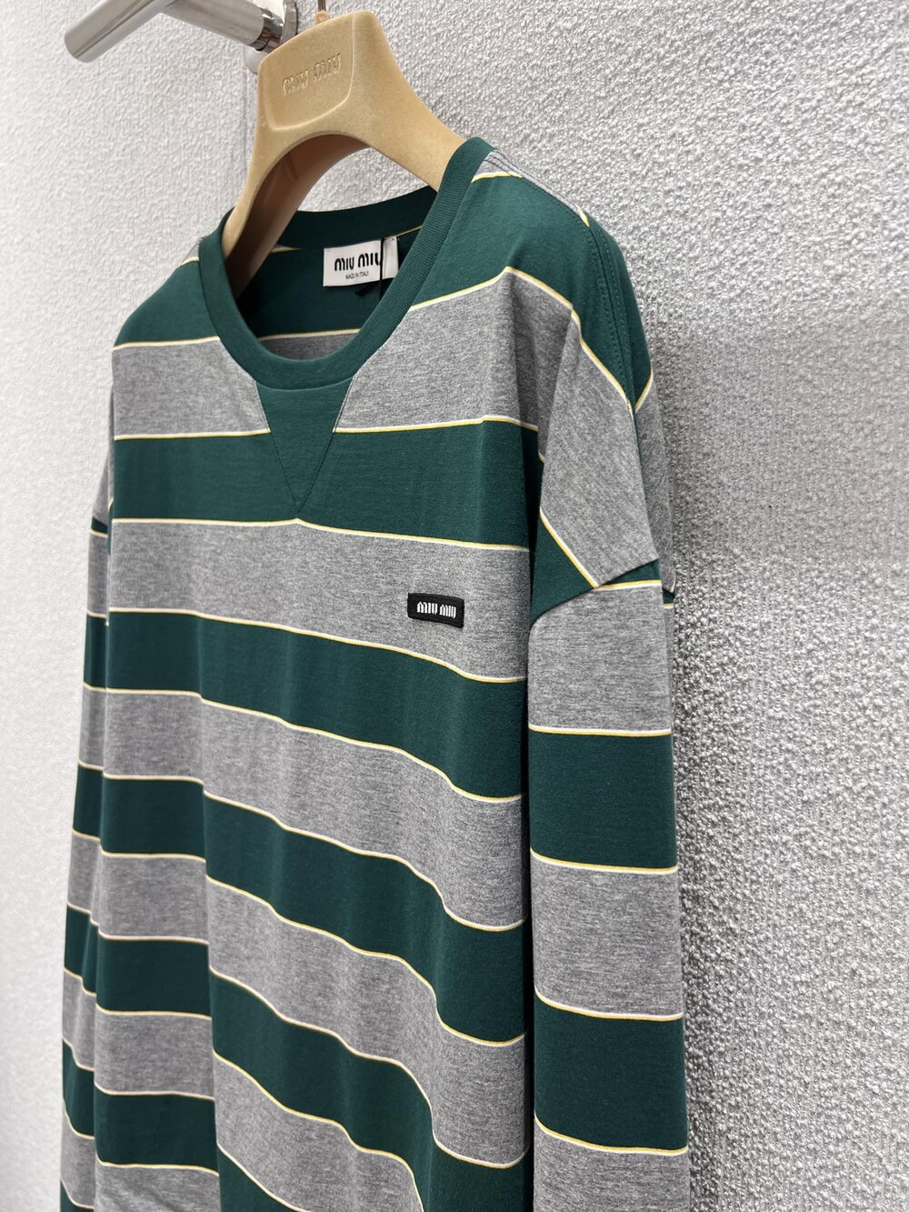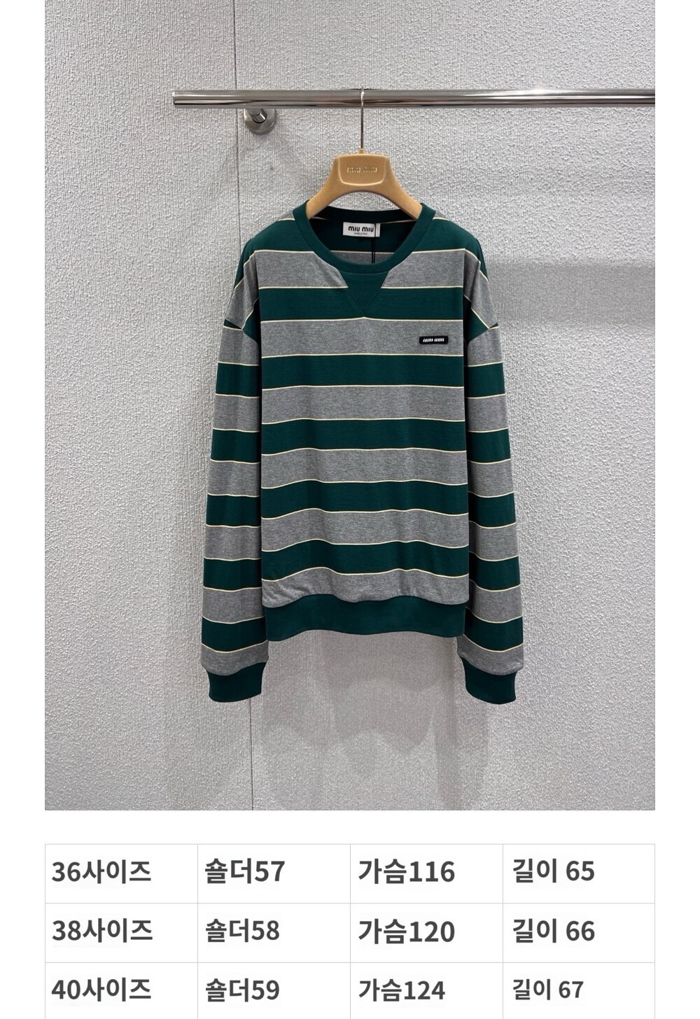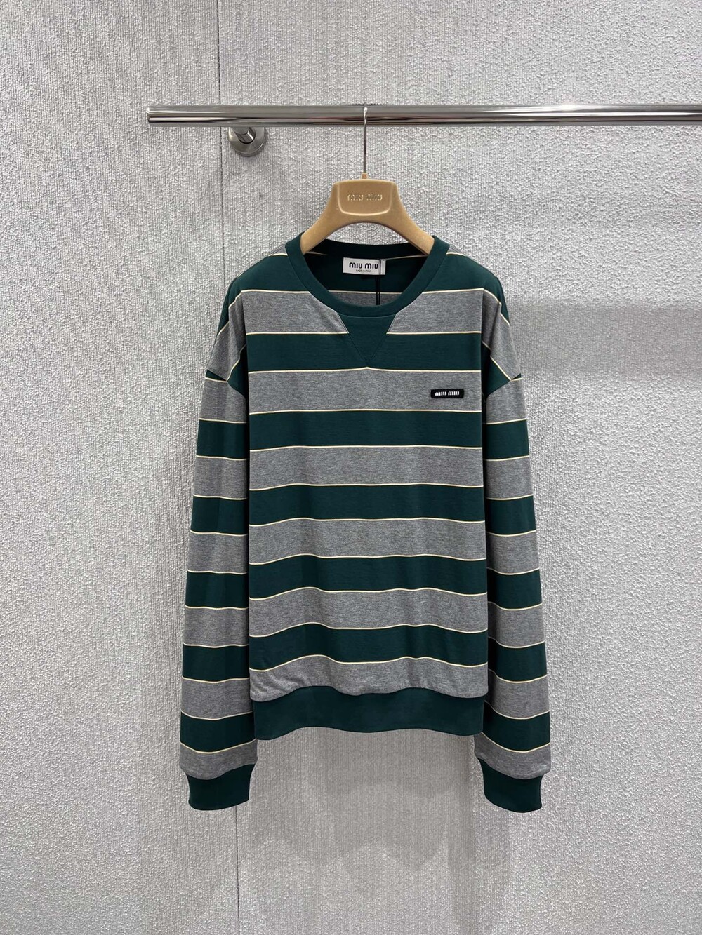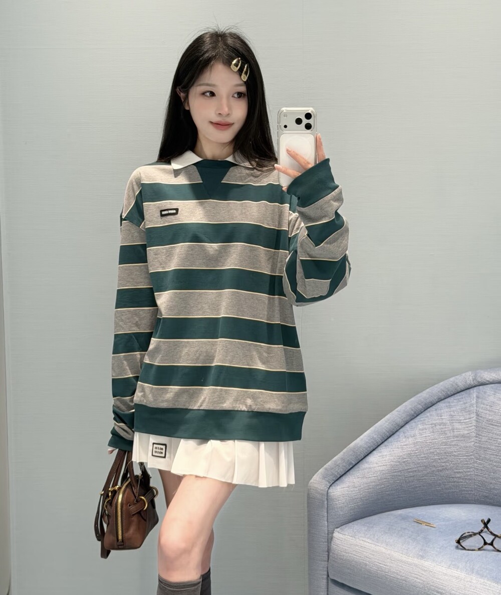 미우미우의 아이코닉한 스트라이프를 클래식한 그레이 멜란지와 대비되는 컬러로 재해석해, 저지 특유의 여유로운 감성과 스웨트셔츠의 실루엣을 한층 강조하며 레이어드 스타일에 이상적인 무드를 완성합니다.