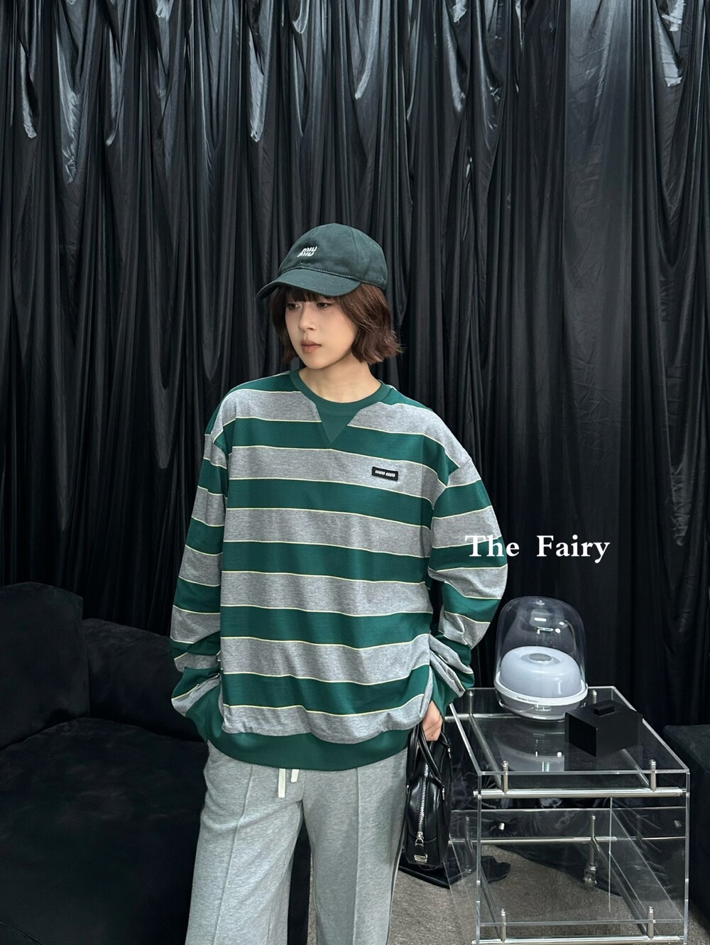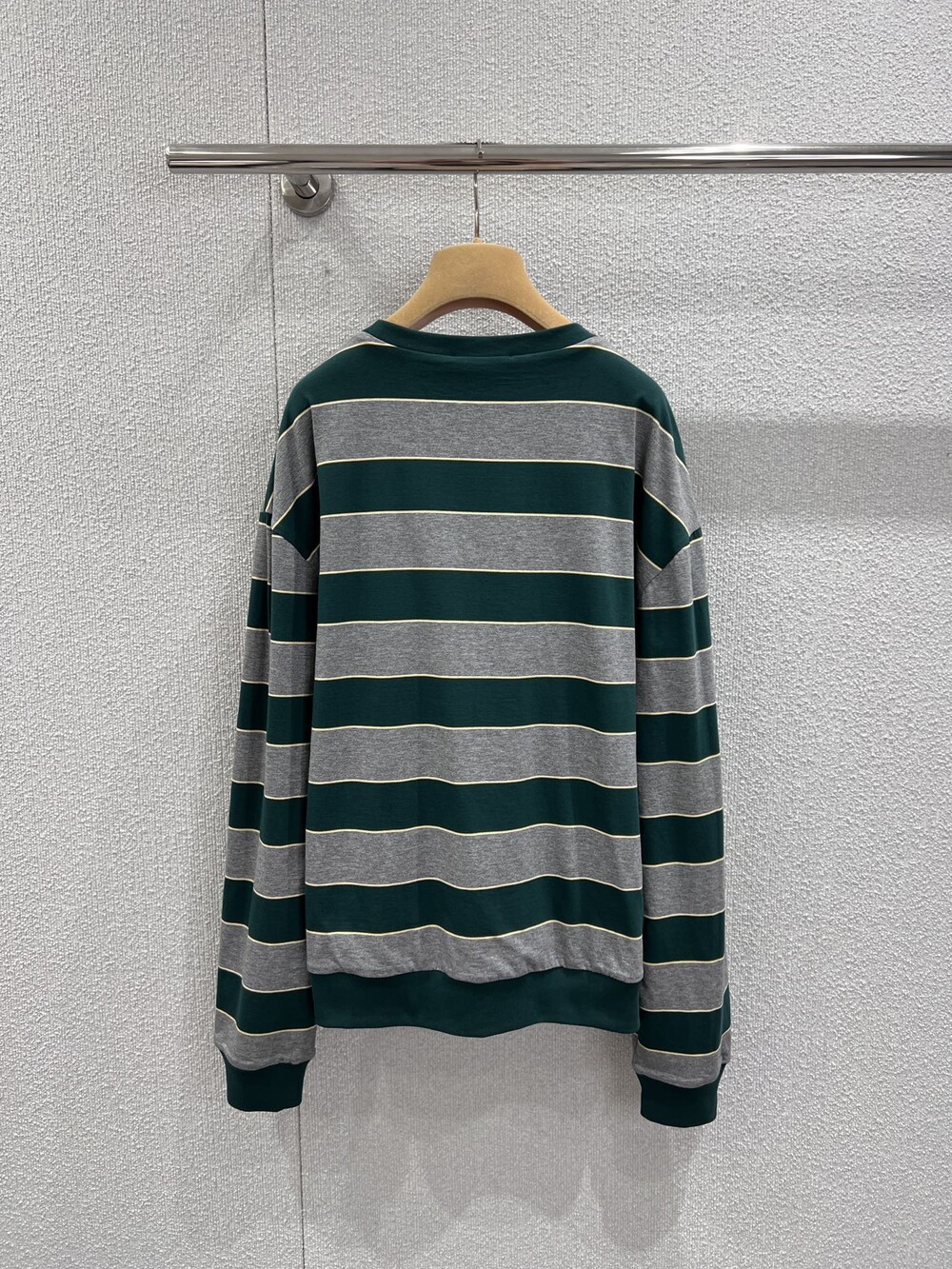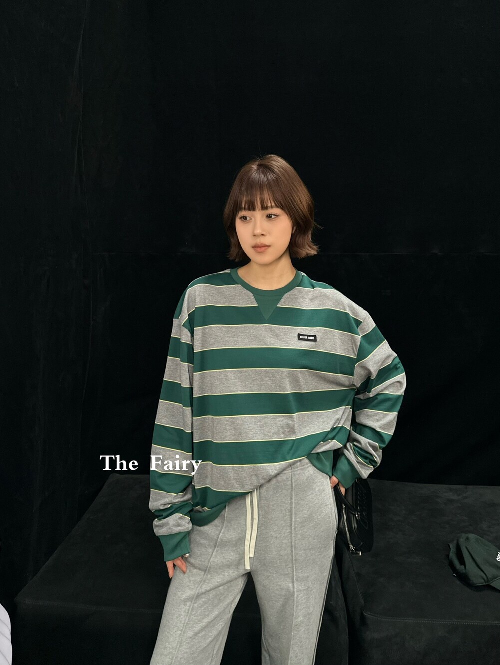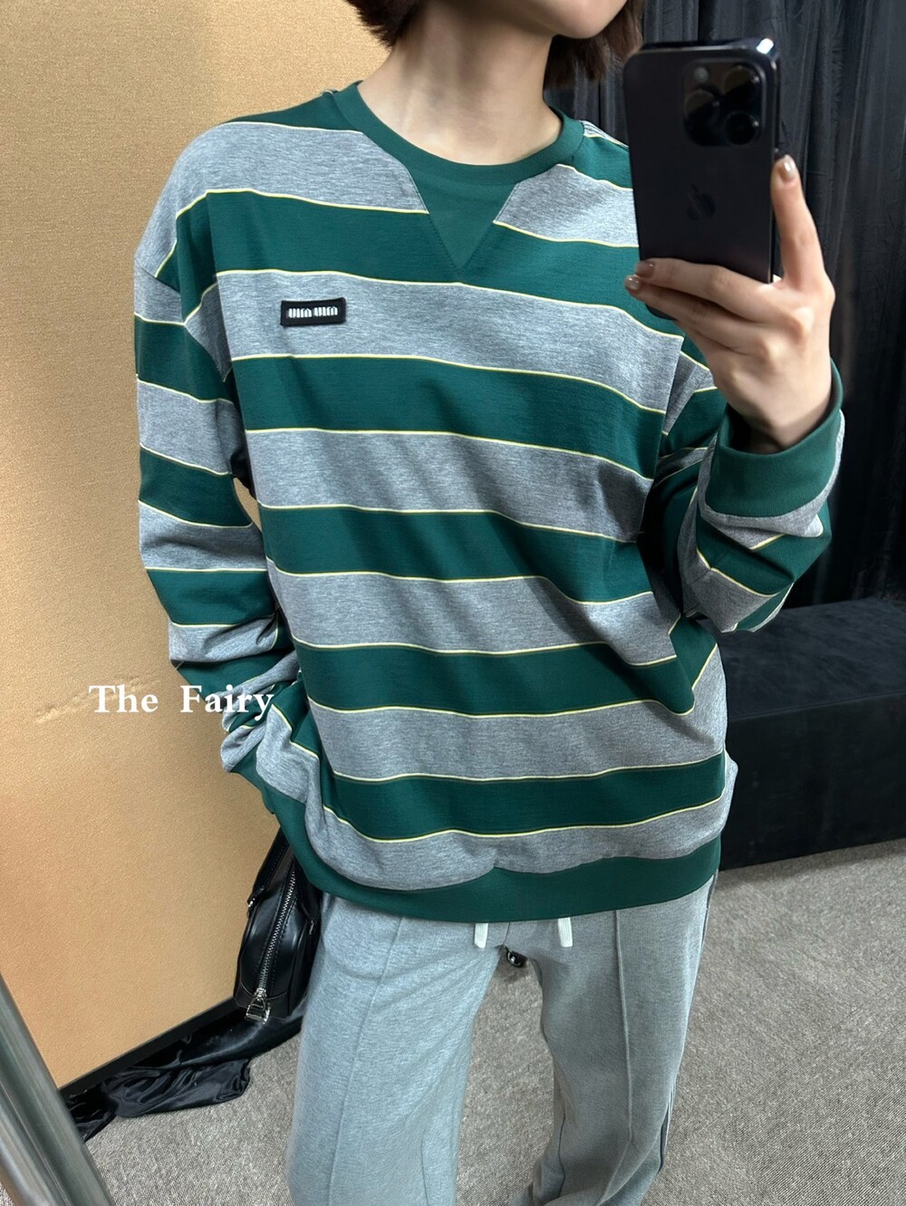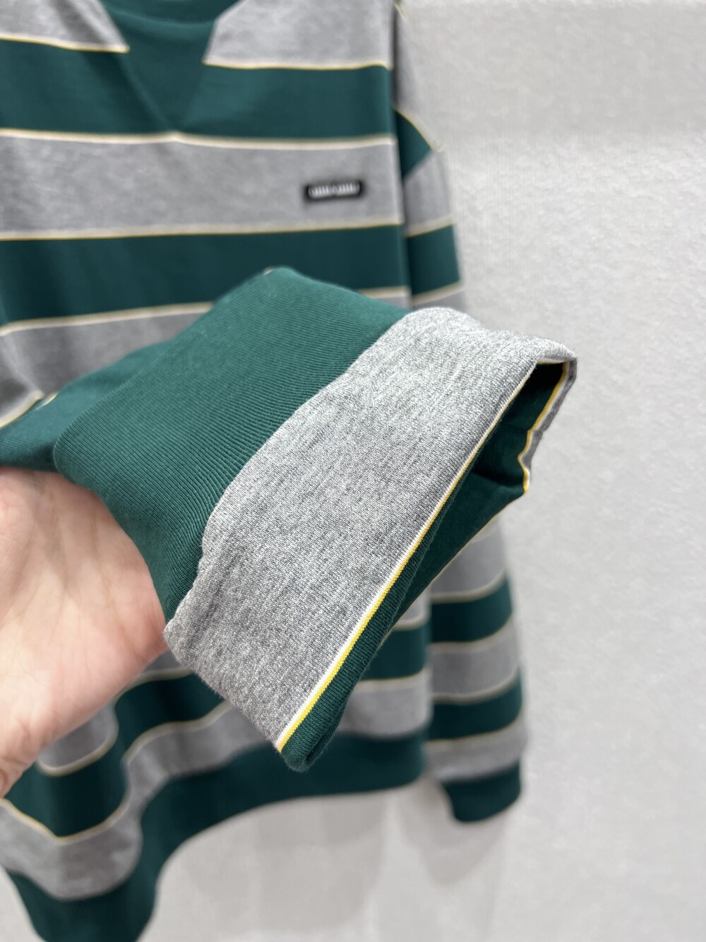 미우미우의 아이코닉한 스트라이프를 클래식한 그레이 멜란지와 대비되는 컬러로 재해석해, 저지 특유의 여유로운 감성과 스웨트셔츠의 실루엣을 한층 강조하며 레이어드 스타일에 이상적인 무드를 완성합니다.