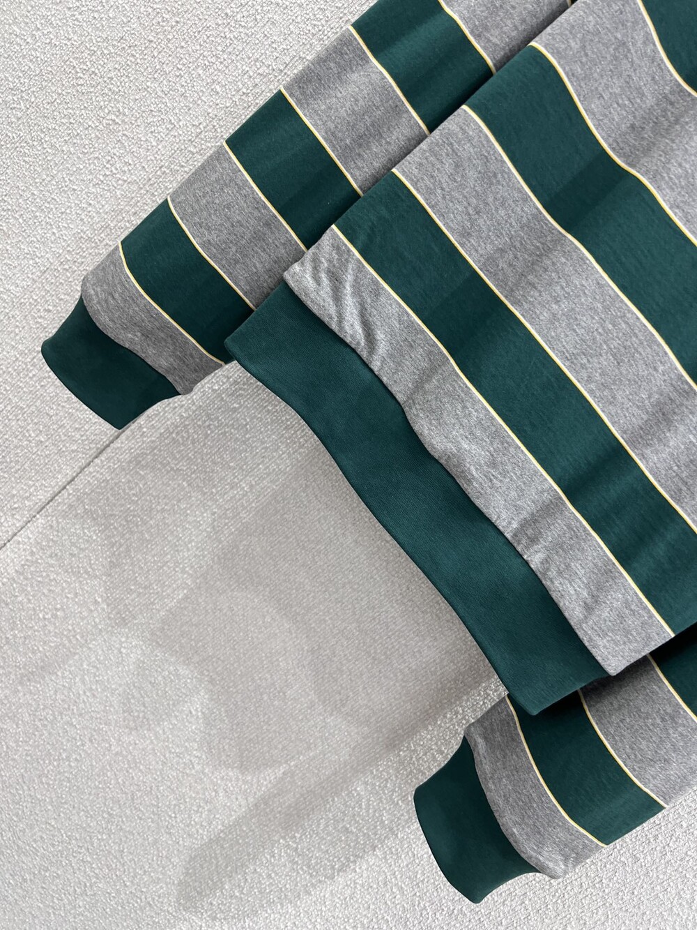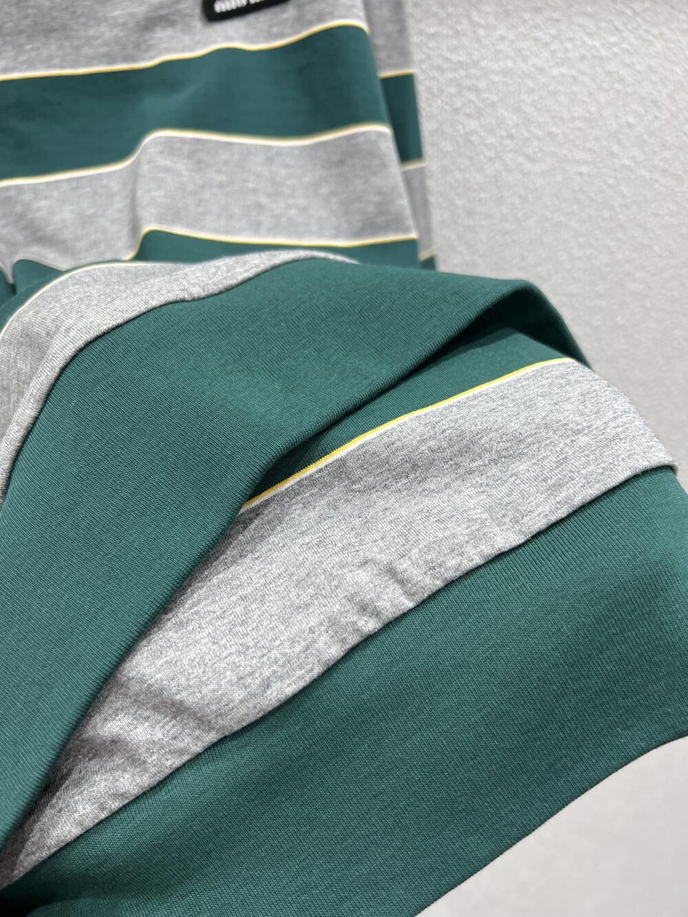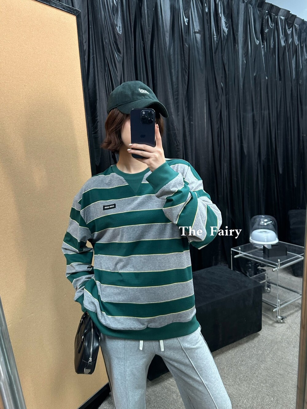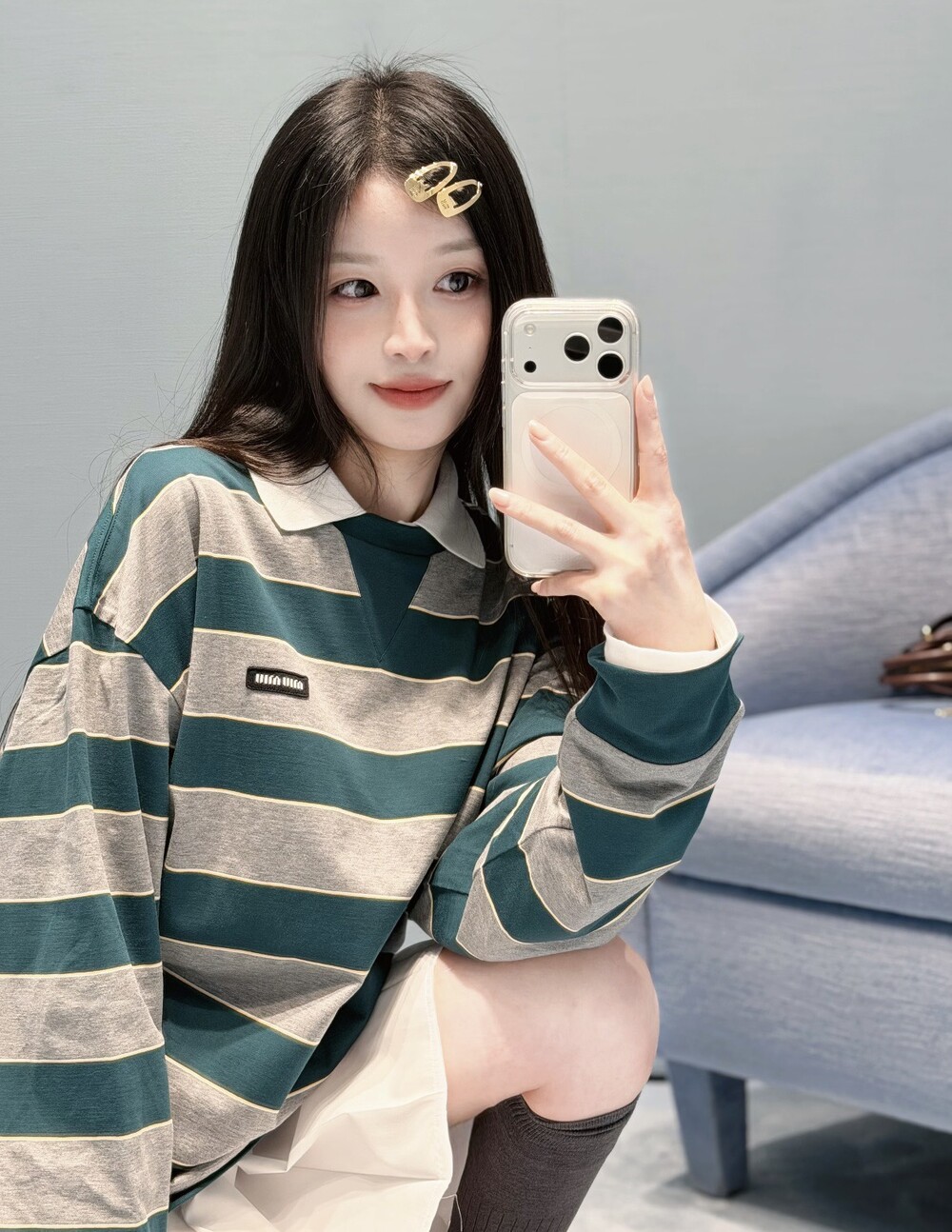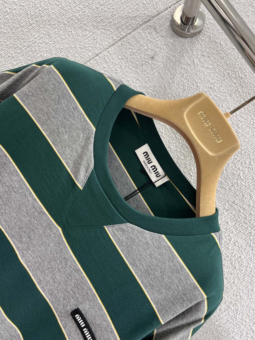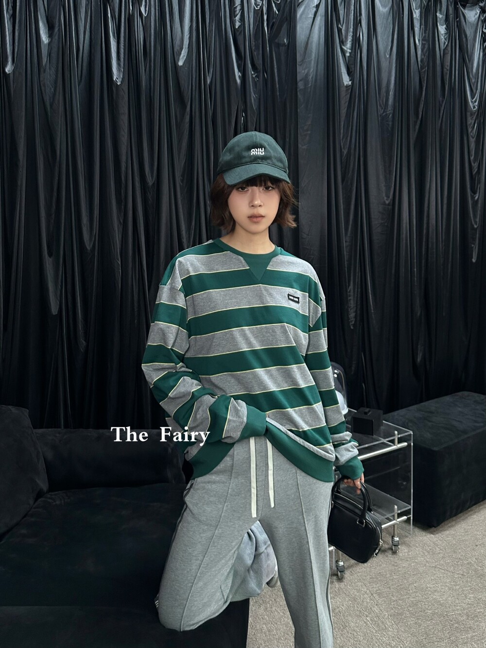 미우미우의 아이코닉한 스트라이프를 클래식한 그레이 멜란지와 대비되는 컬러로 재해석해, 저지 특유의 여유로운 감성과 스웨트셔츠의 실루엣을 한층 강조하며 레이어드 스타일에 이상적인 무드를 완성합니다.