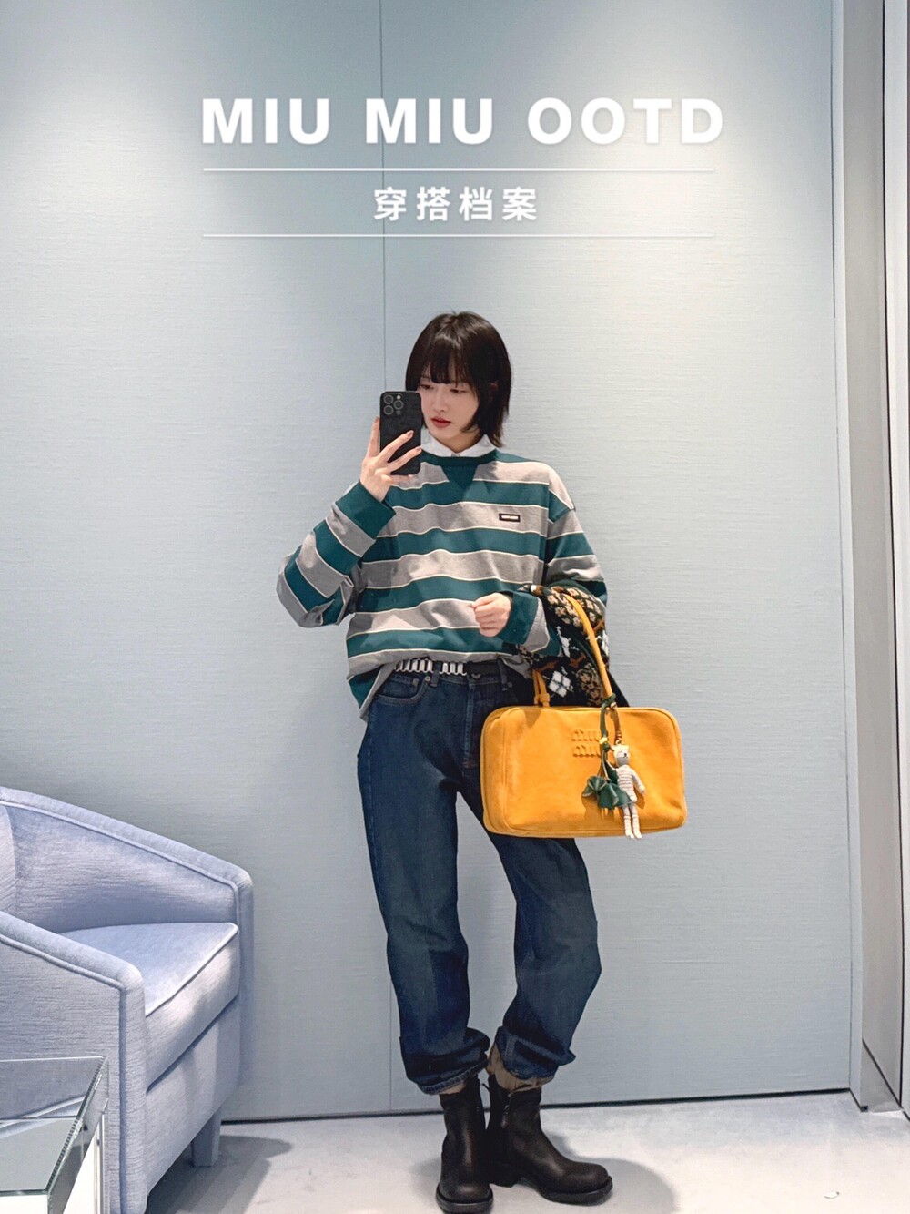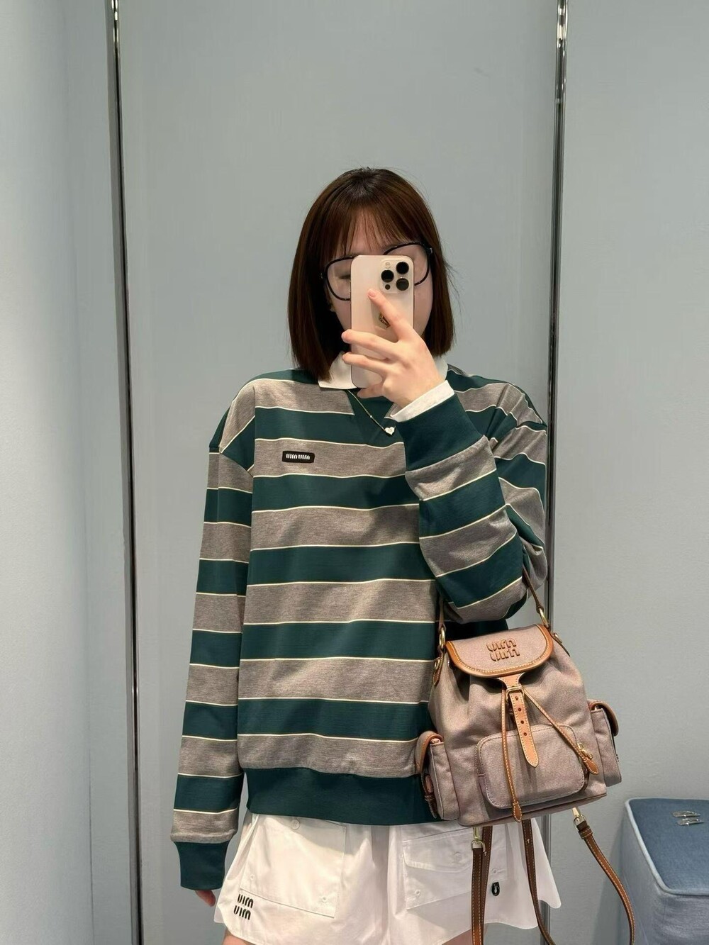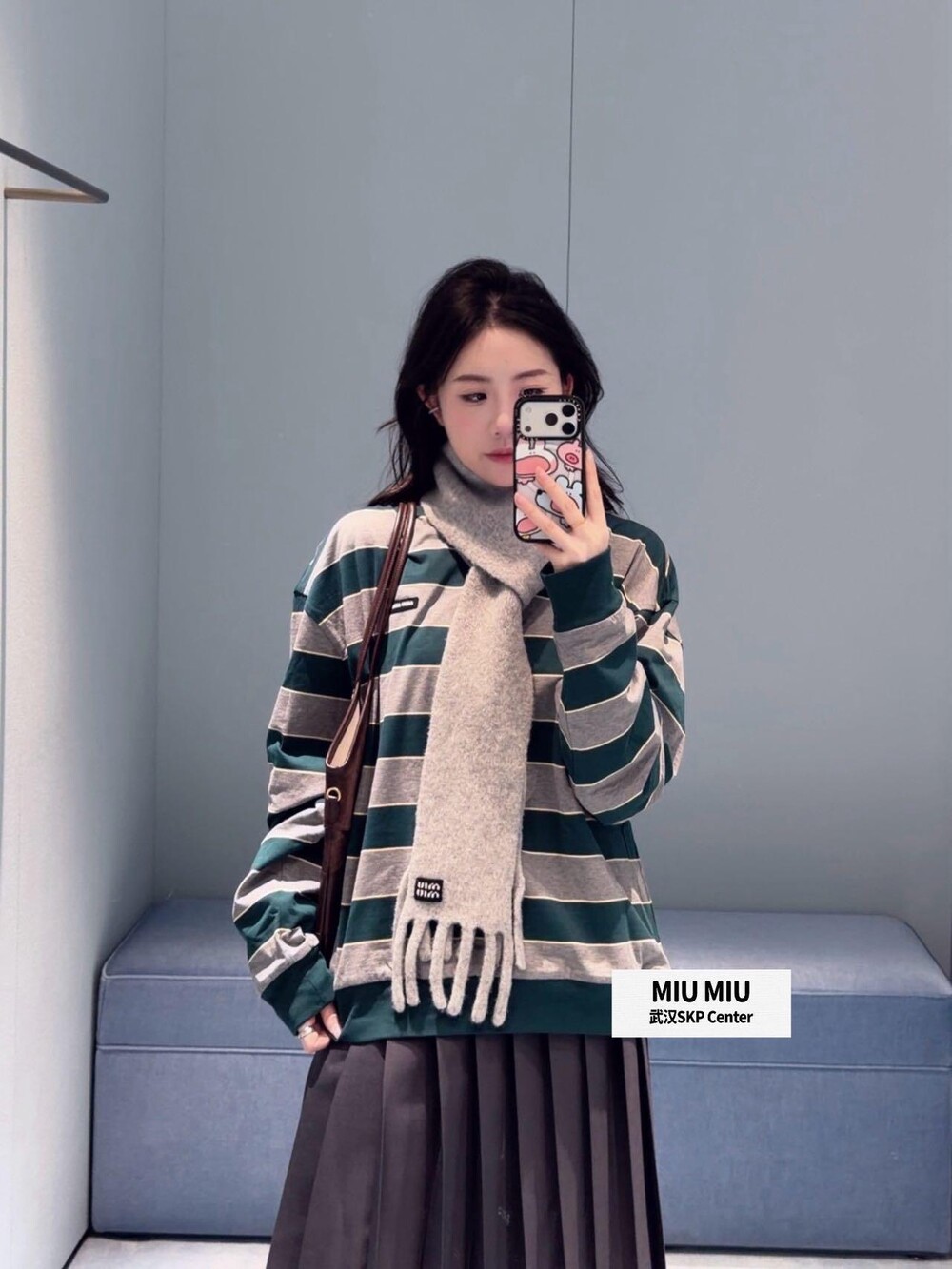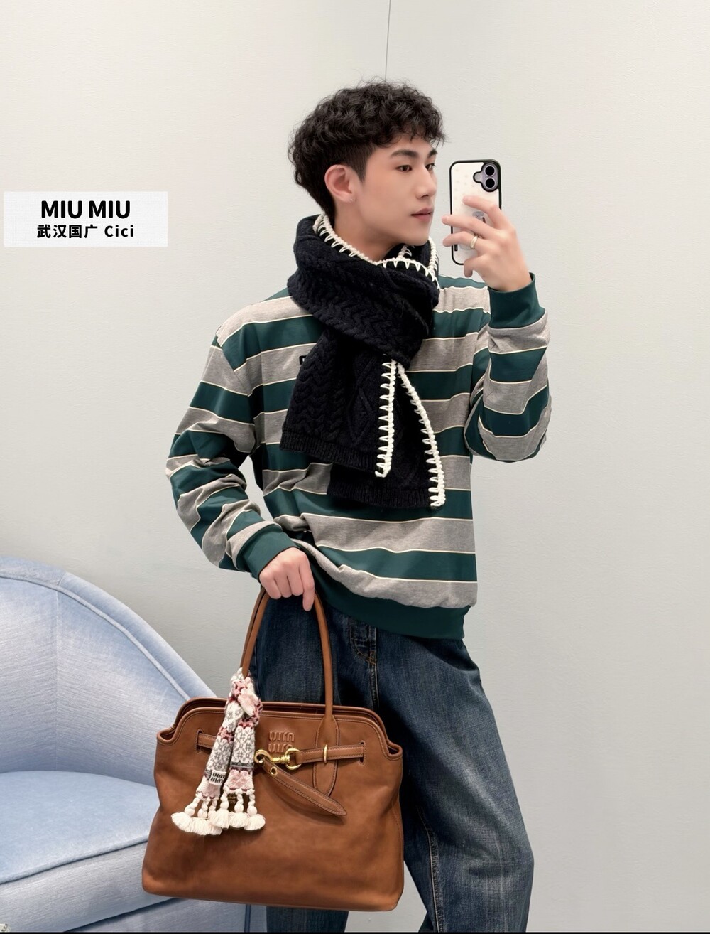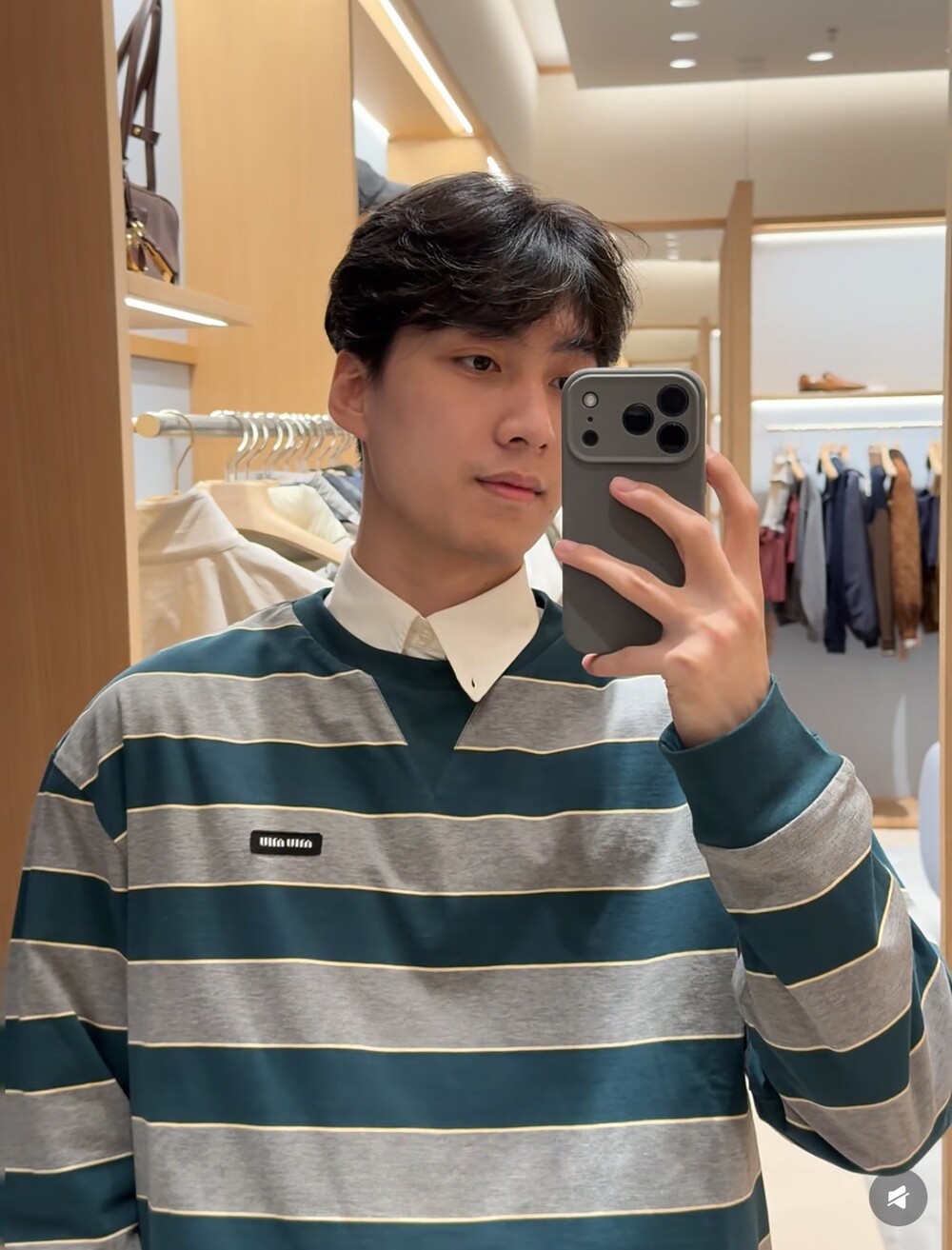 미우미우의 아이코닉한 스트라이프를 클래식한 그레이 멜란지와 대비되는 컬러로 재해석해, 저지 특유의 여유로운 감성과 스웨트셔츠의 실루엣을 한층 강조하며 레이어드 스타일에 이상적인 무드를 완성합니다.