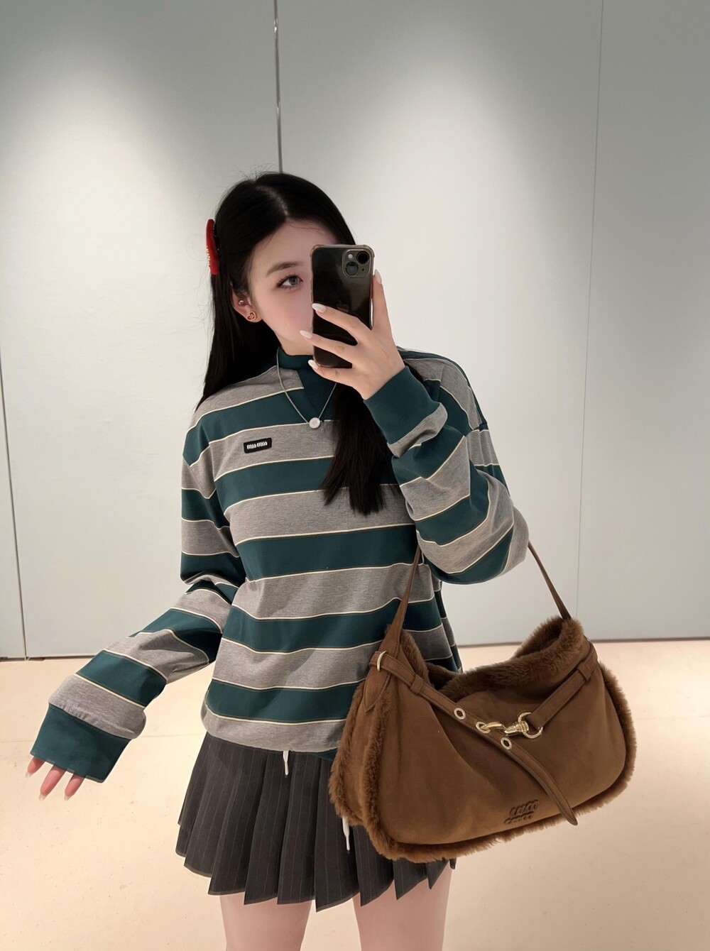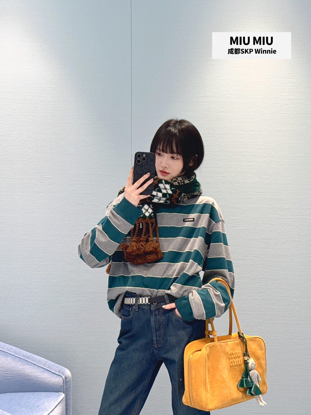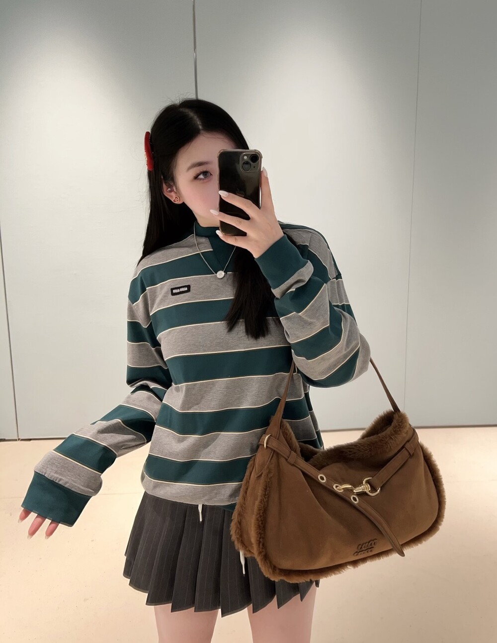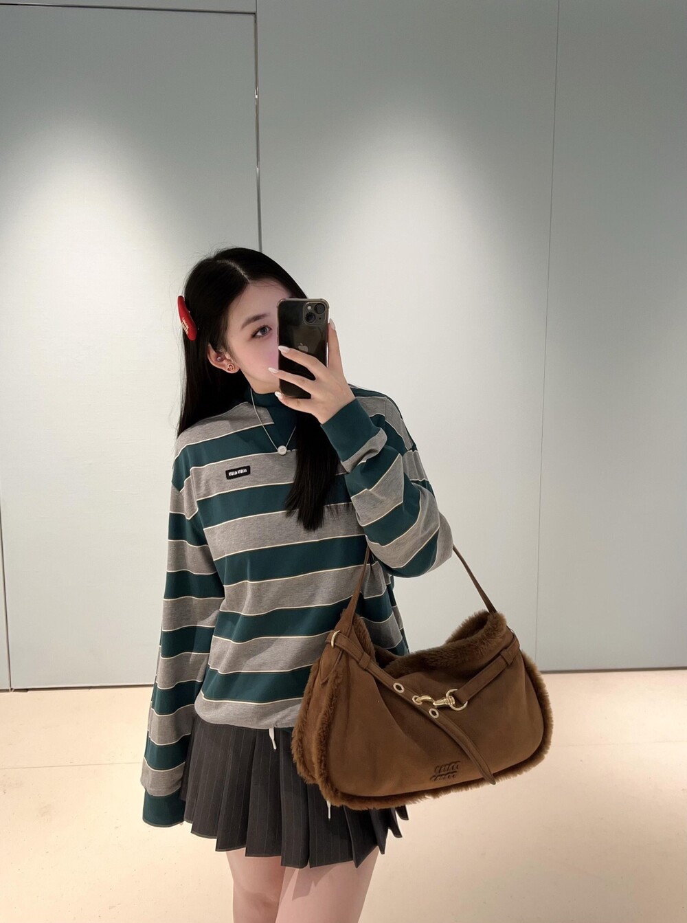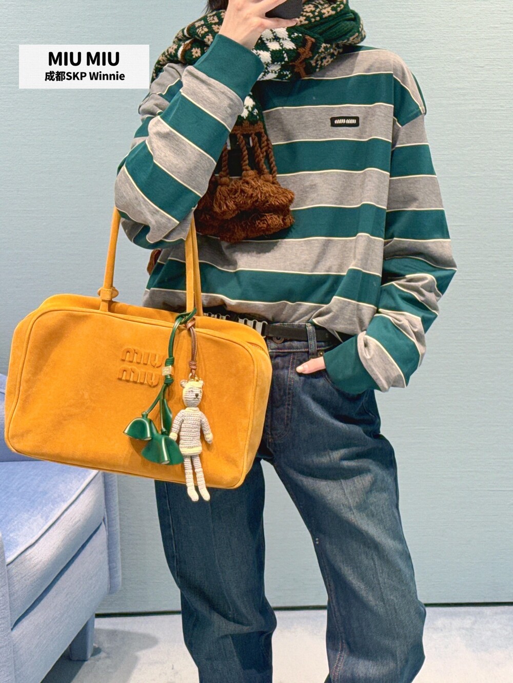미우미우의 아이코닉한 스트라이프를 클래식한 그레이 멜란지와 대비되는 컬러로 재해석해, 저지 특유의 여유로운 감성과 스웨트셔츠의 실루엣을 한층 강조하며 레이어드 스타일에 이상적인 무드를 완성합니다.