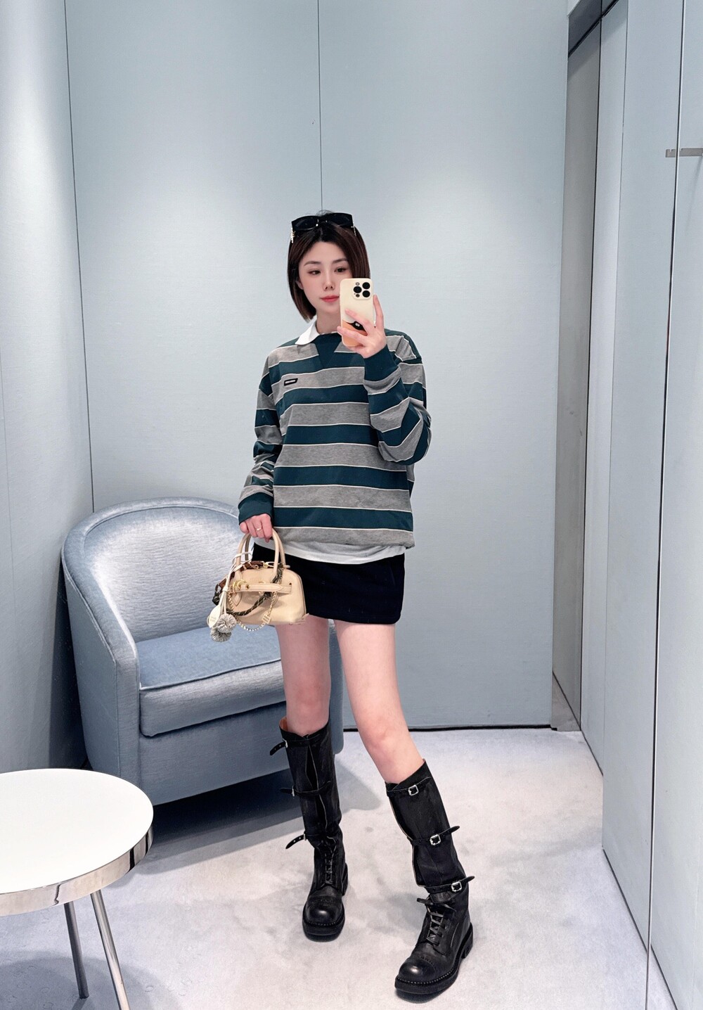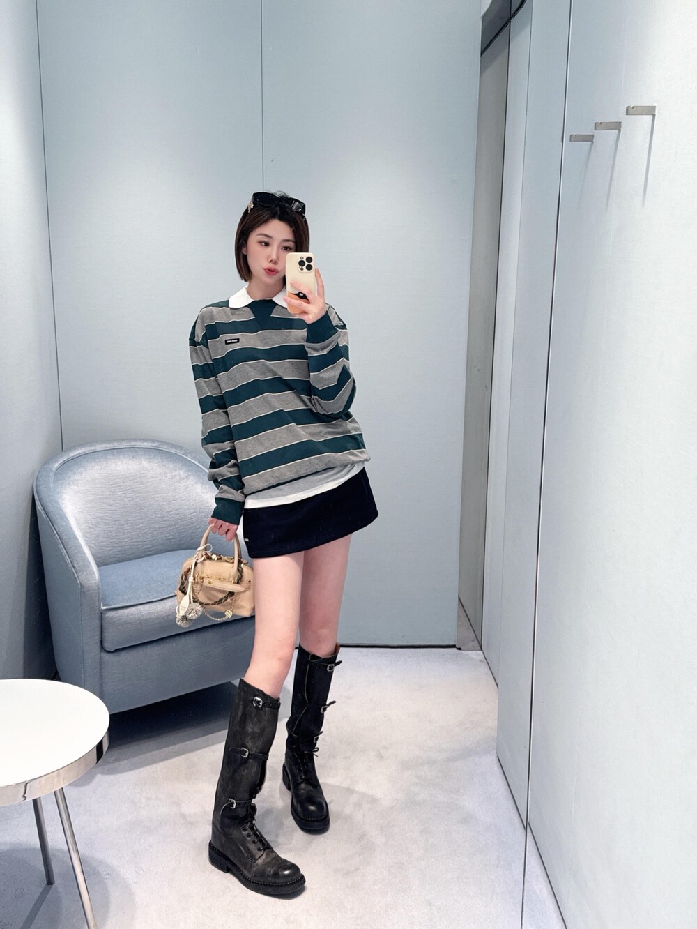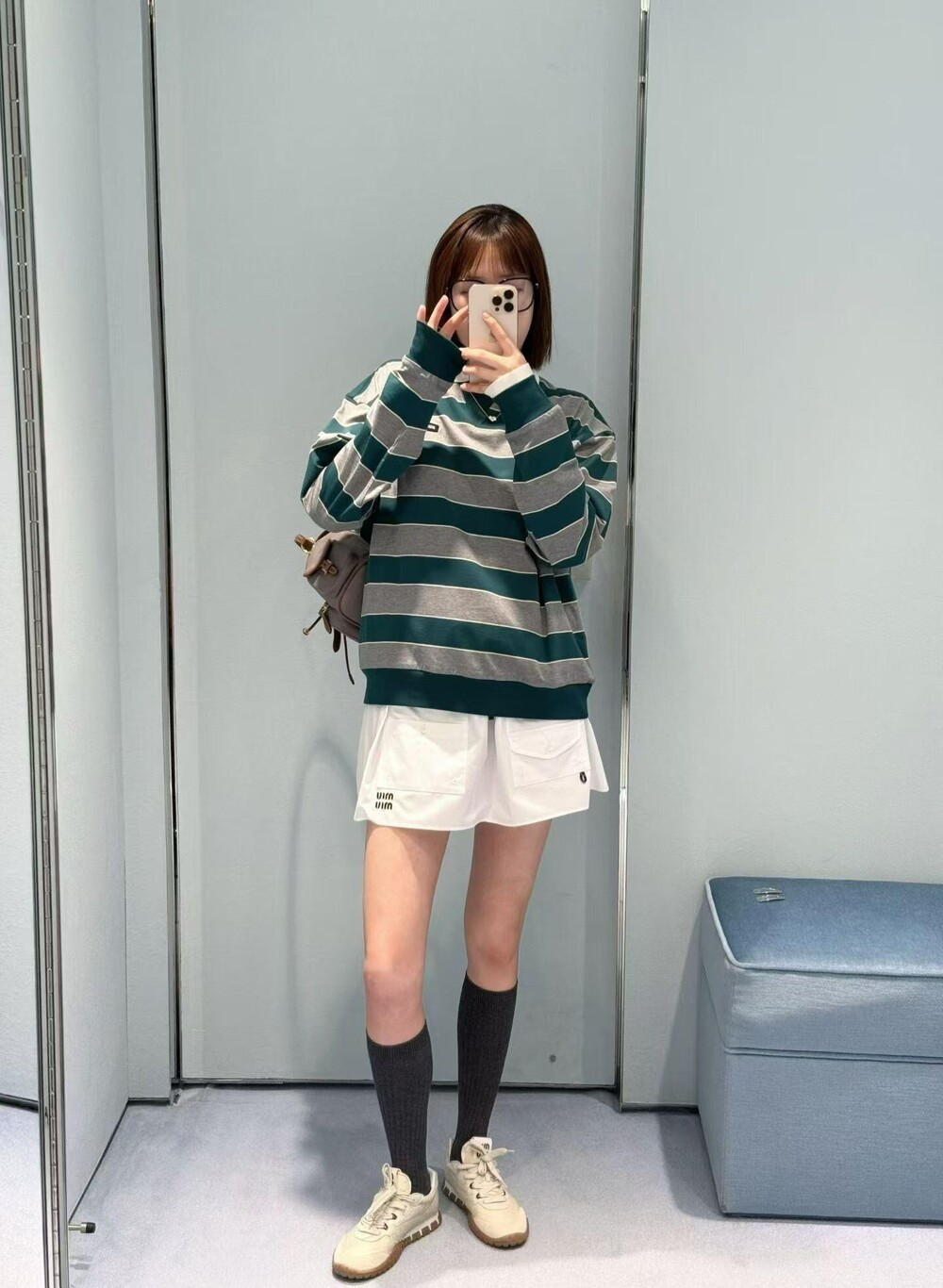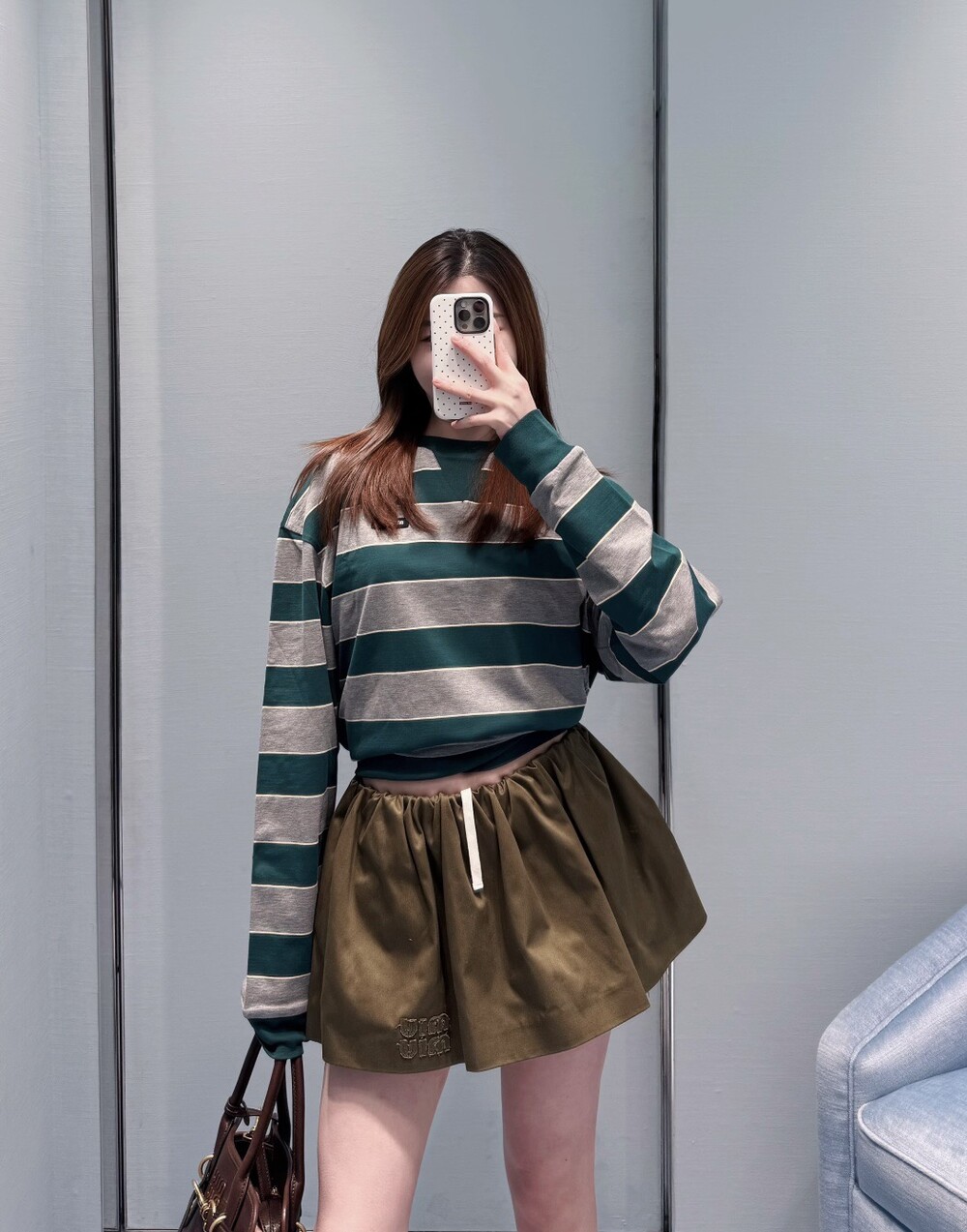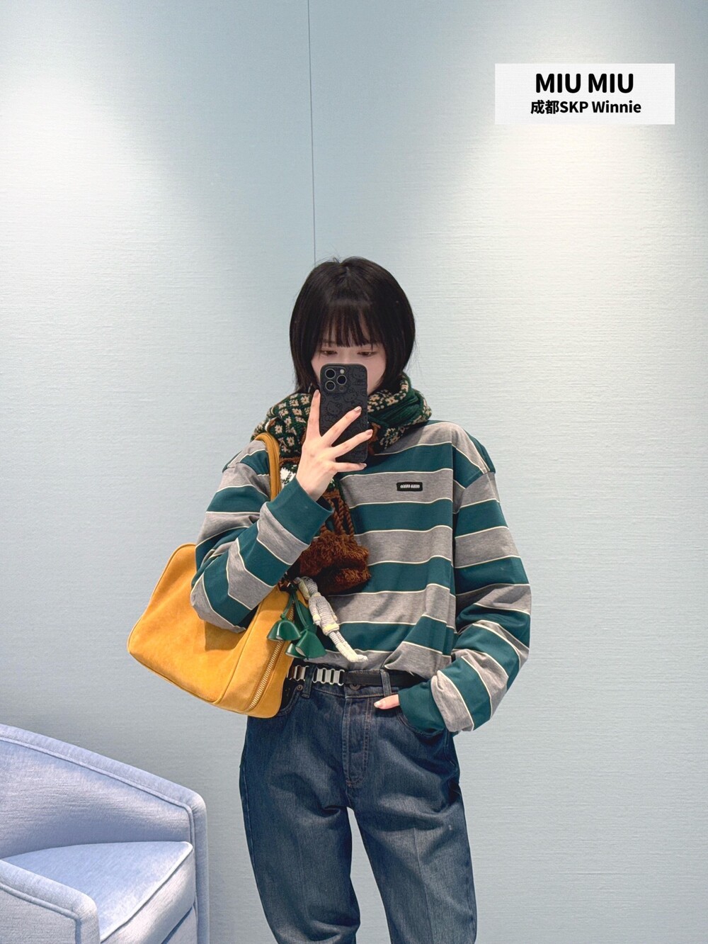 미우미우의 아이코닉한 스트라이프를 클래식한 그레이 멜란지와 대비되는 컬러로 재해석해, 저지 특유의 여유로운 감성과 스웨트셔츠의 실루엣을 한층 강조하며 레이어드 스타일에 이상적인 무드를 완성합니다.