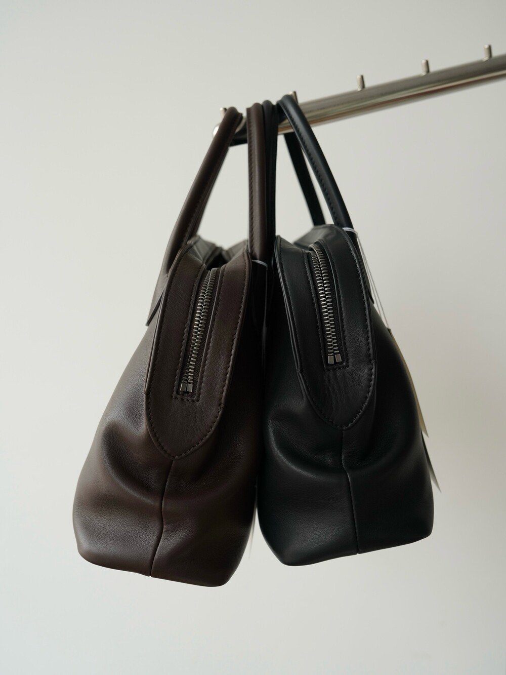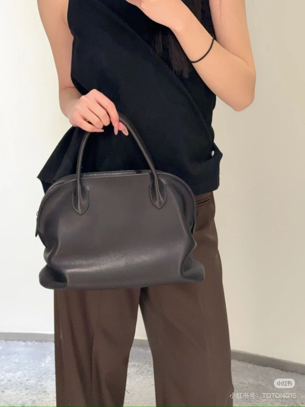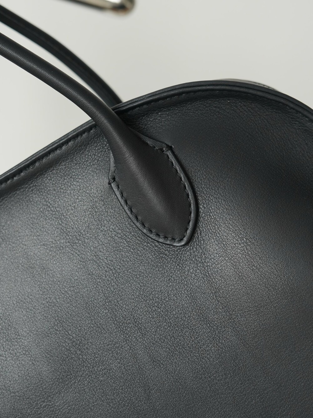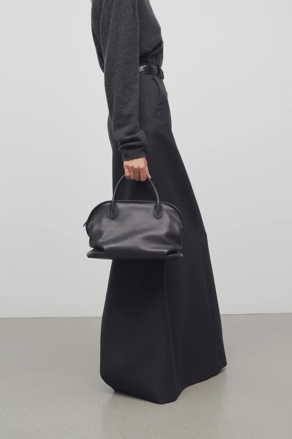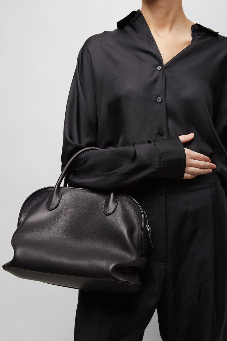 더 로우(The Row)의 블랙 가죽 슬라우치 볼링백. 아그네스 볼링백은 광택 처리된 새들 가죽으로 제작되었으며, 손으로 꿰맨 튜브형 손잡이, 모서리 마감, 지퍼 여밈, 그리고 마감 처리가 되지 않은 칼라가 특징입니다.