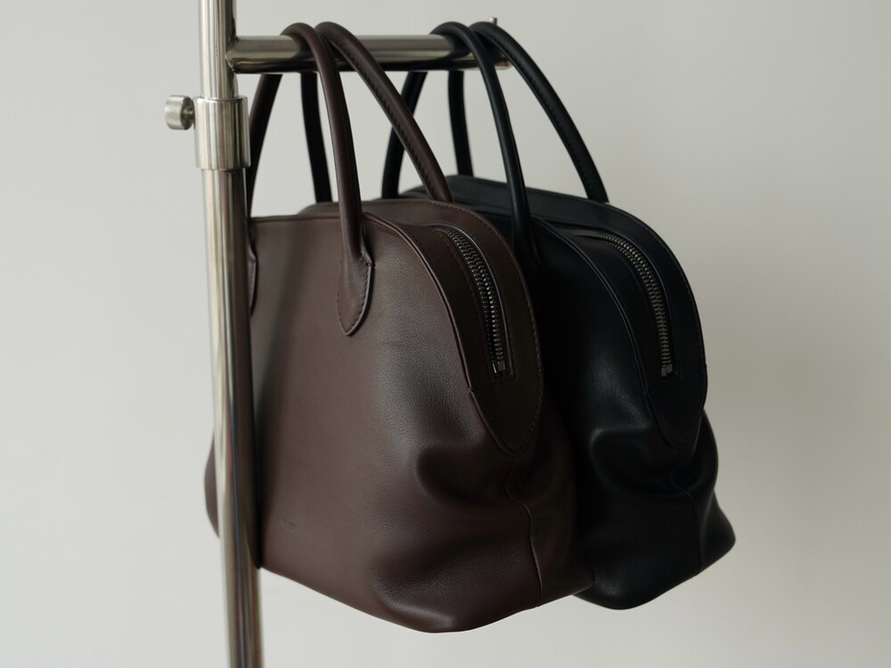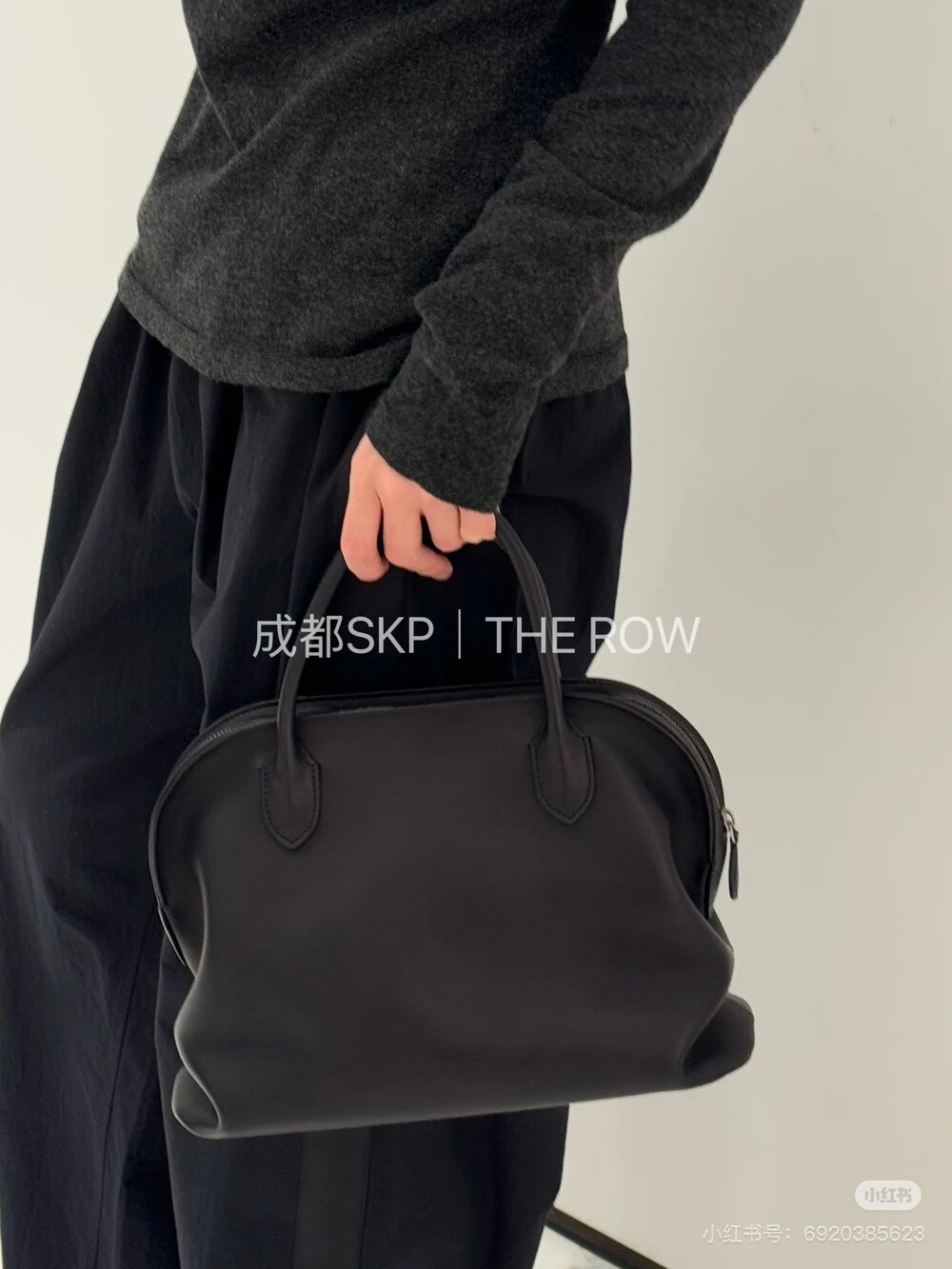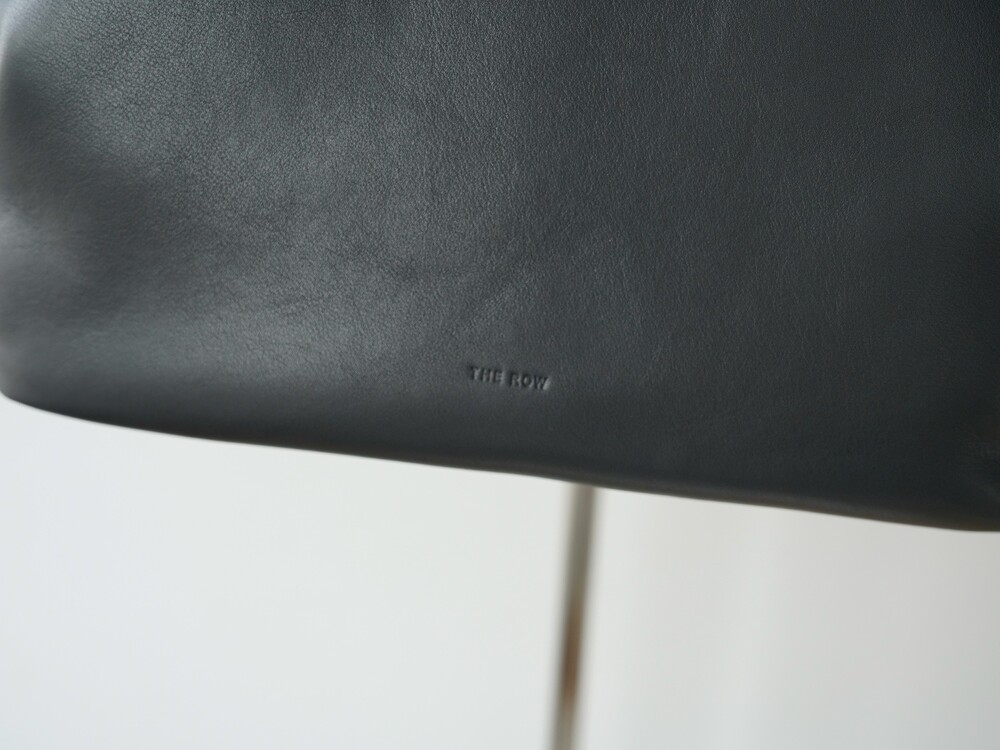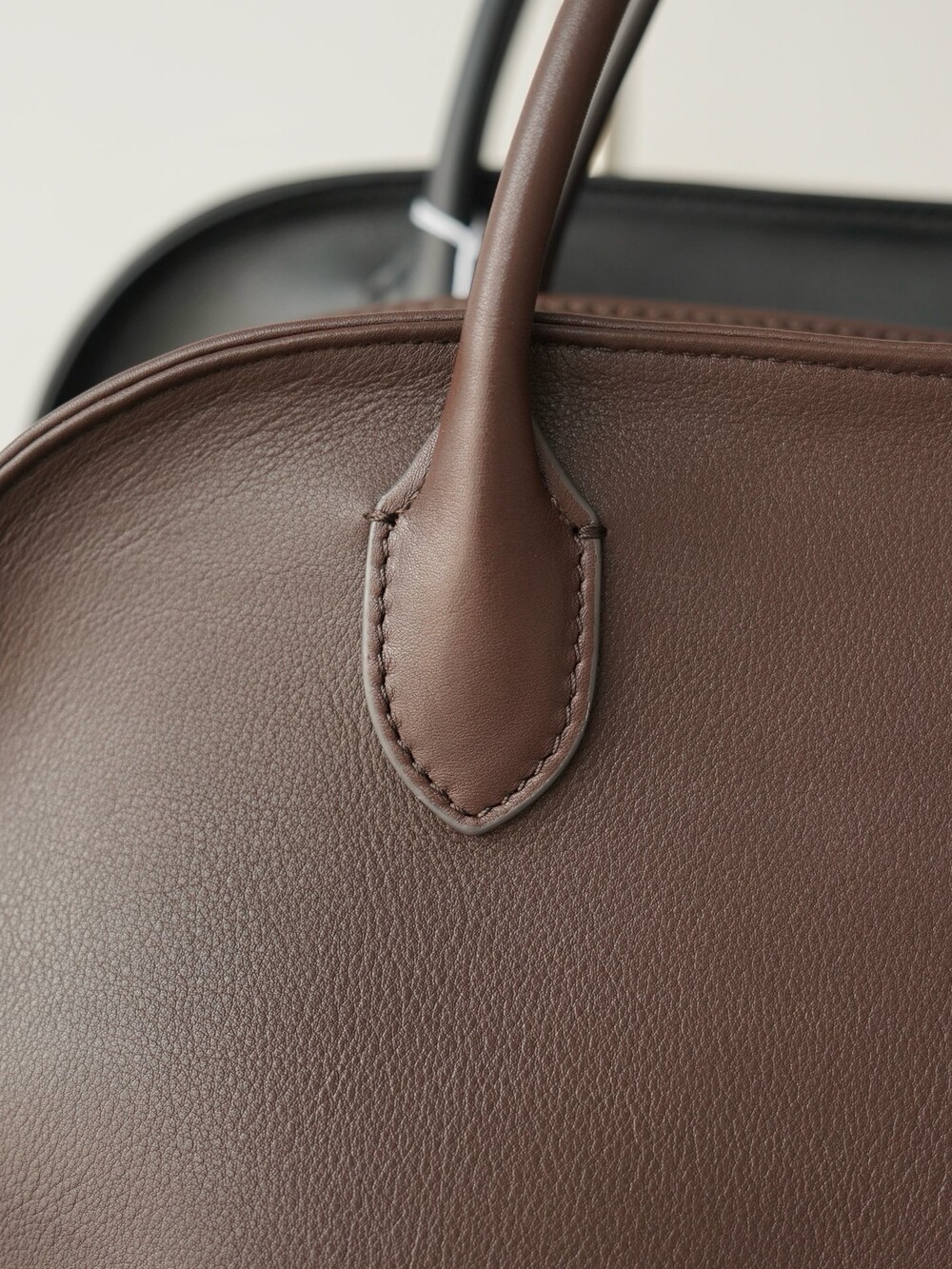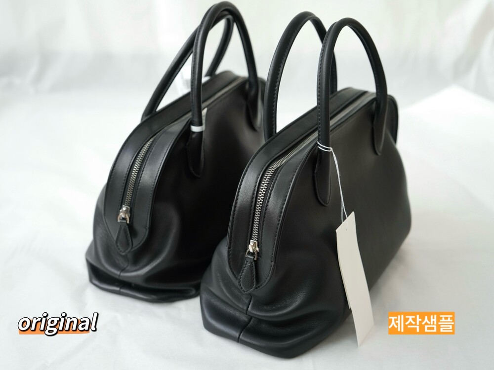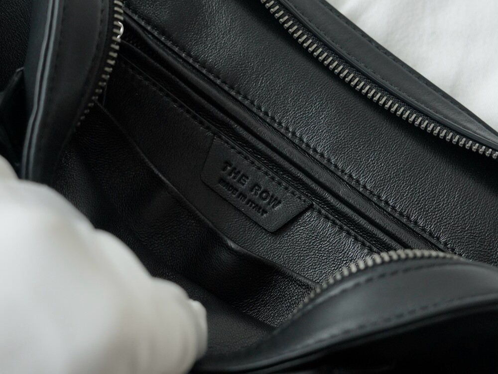 더 로우(The Row)의 블랙 가죽 슬라우치 볼링백. 아그네스 볼링백은 광택 처리된 새들 가죽으로 제작되었으며, 손으로 꿰맨 튜브형 손잡이, 모서리 마감, 지퍼 여밈, 그리고 마감 처리가 되지 않은 칼라가 특징입니다.