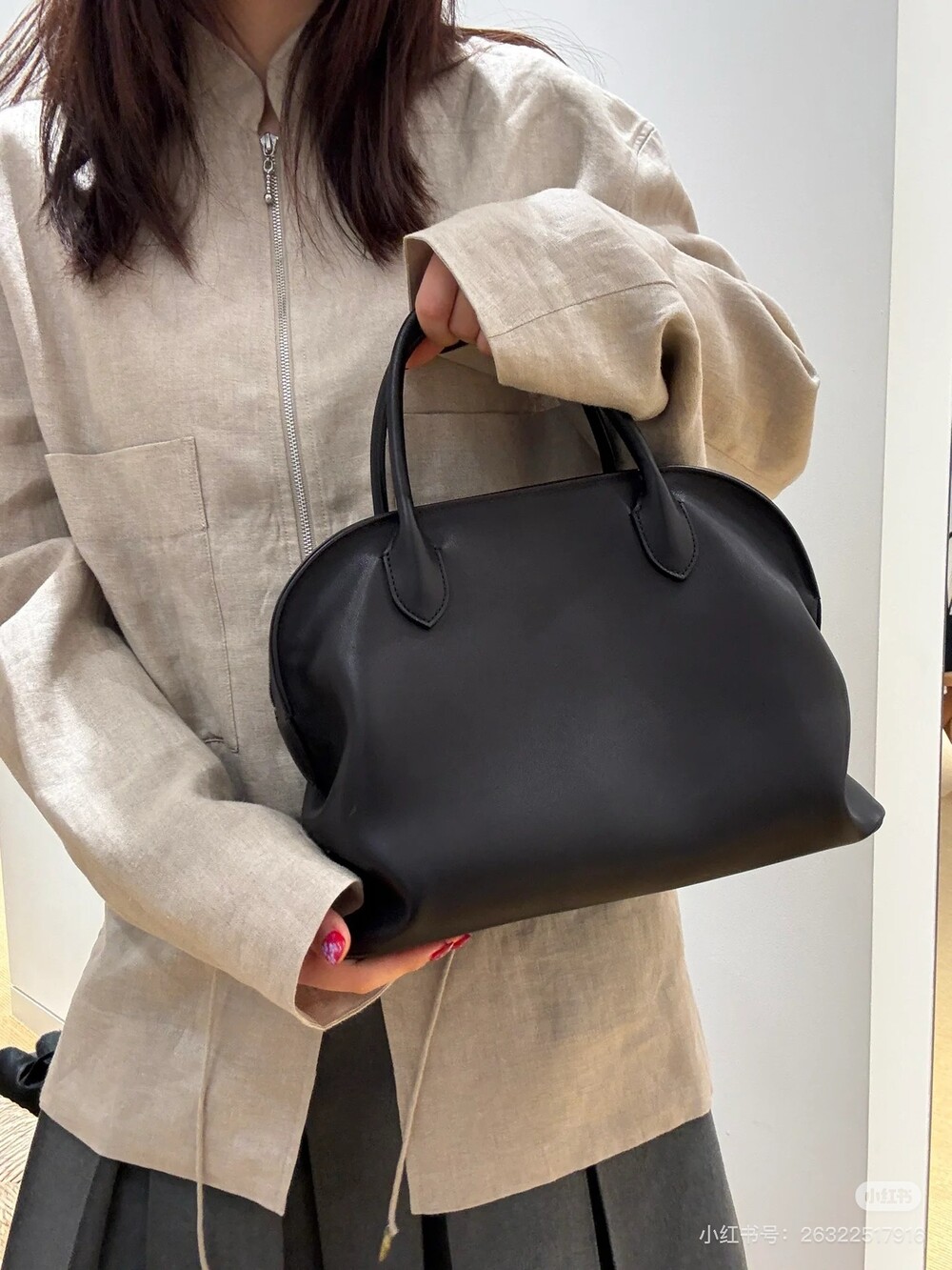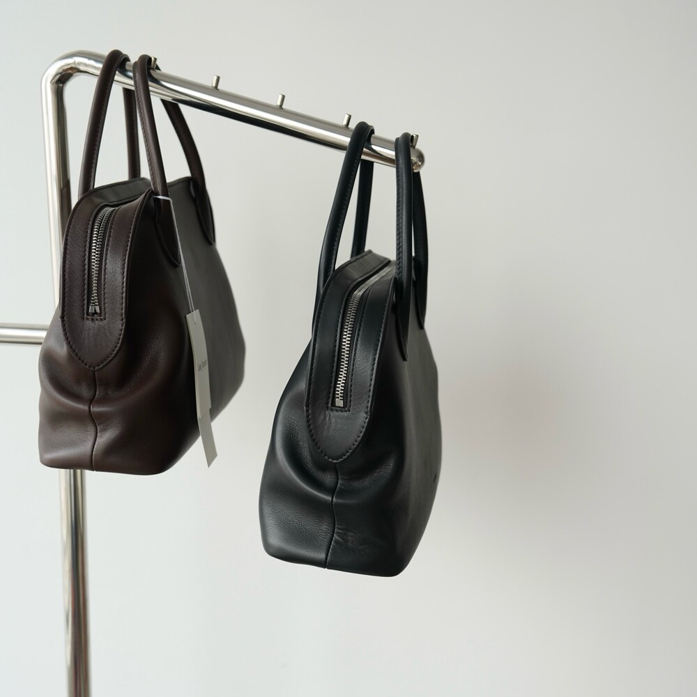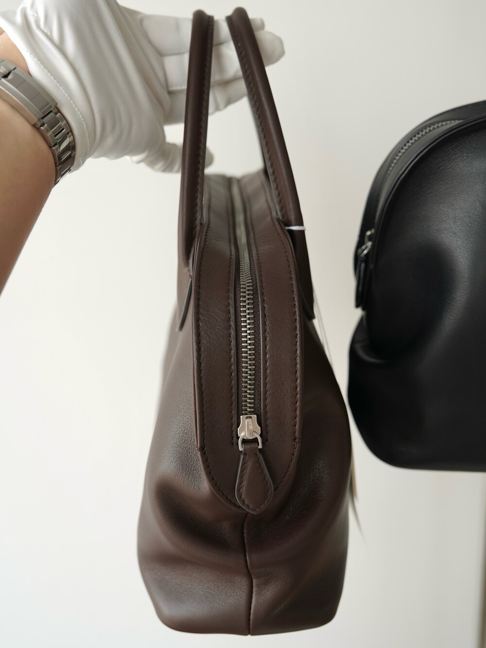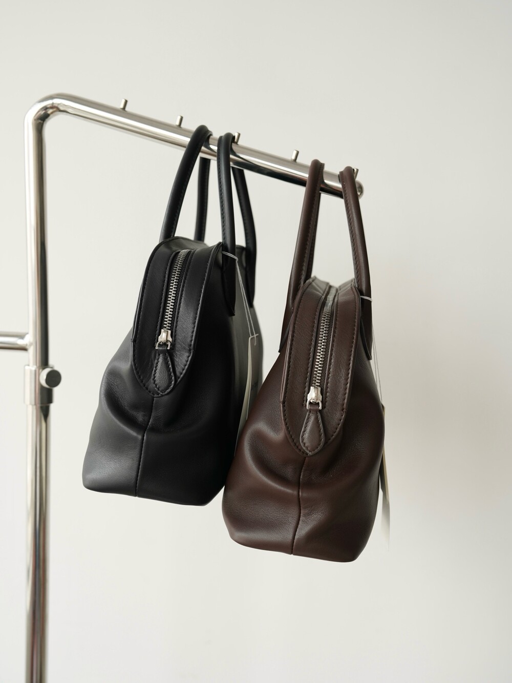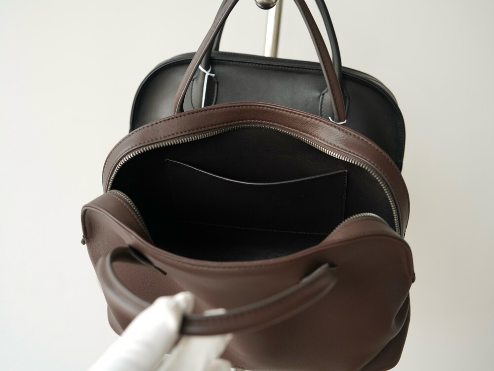 더 로우(The Row)의 블랙 가죽 슬라우치 볼링백. 아그네스 볼링백은 광택 처리된 새들 가죽으로 제작되었으며, 손으로 꿰맨 튜브형 손잡이, 모서리 마감, 지퍼 여밈, 그리고 마감 처리가 되지 않은 칼라가 특징입니다.