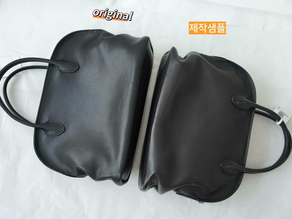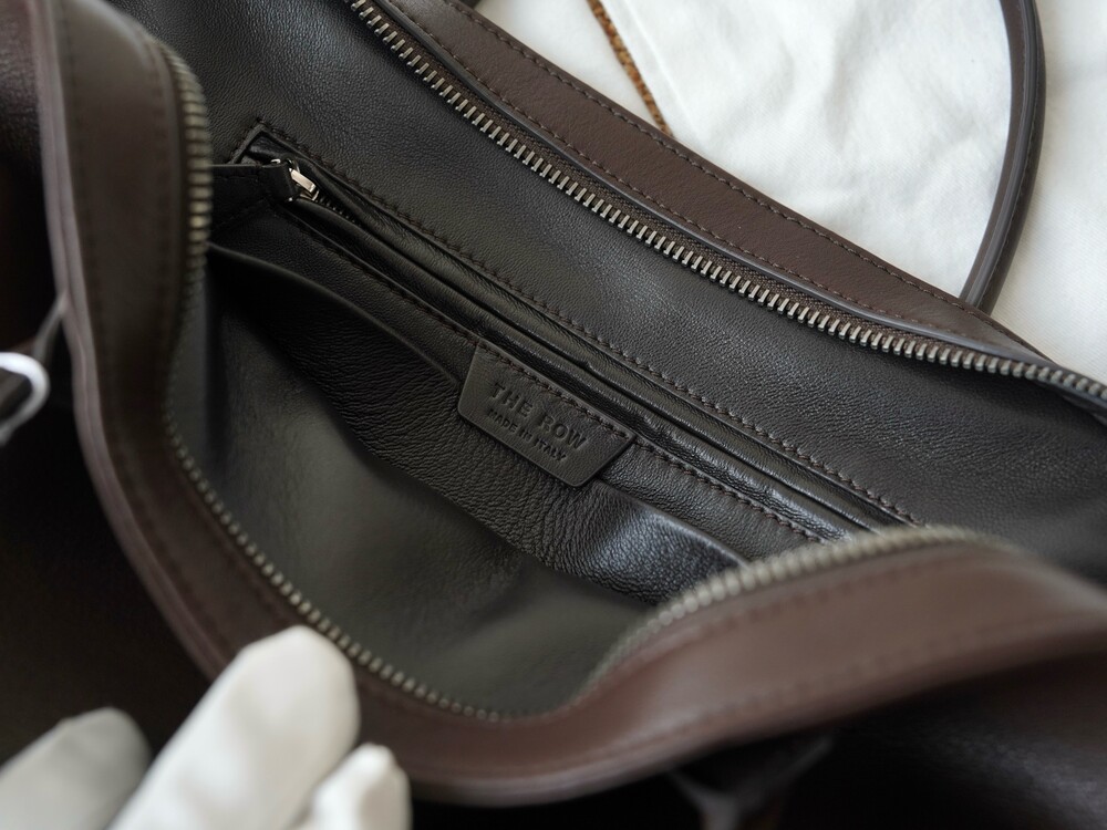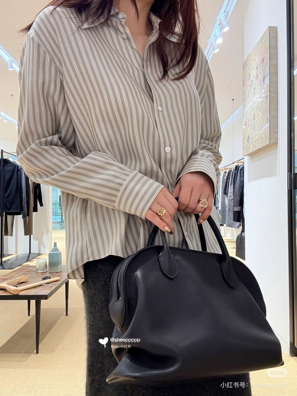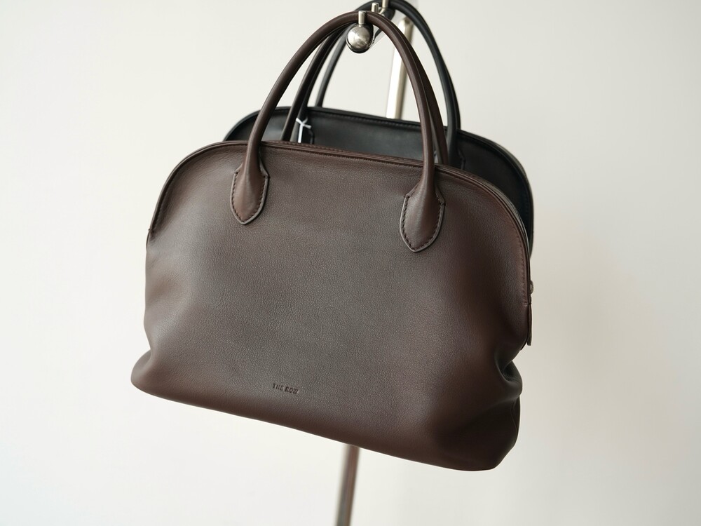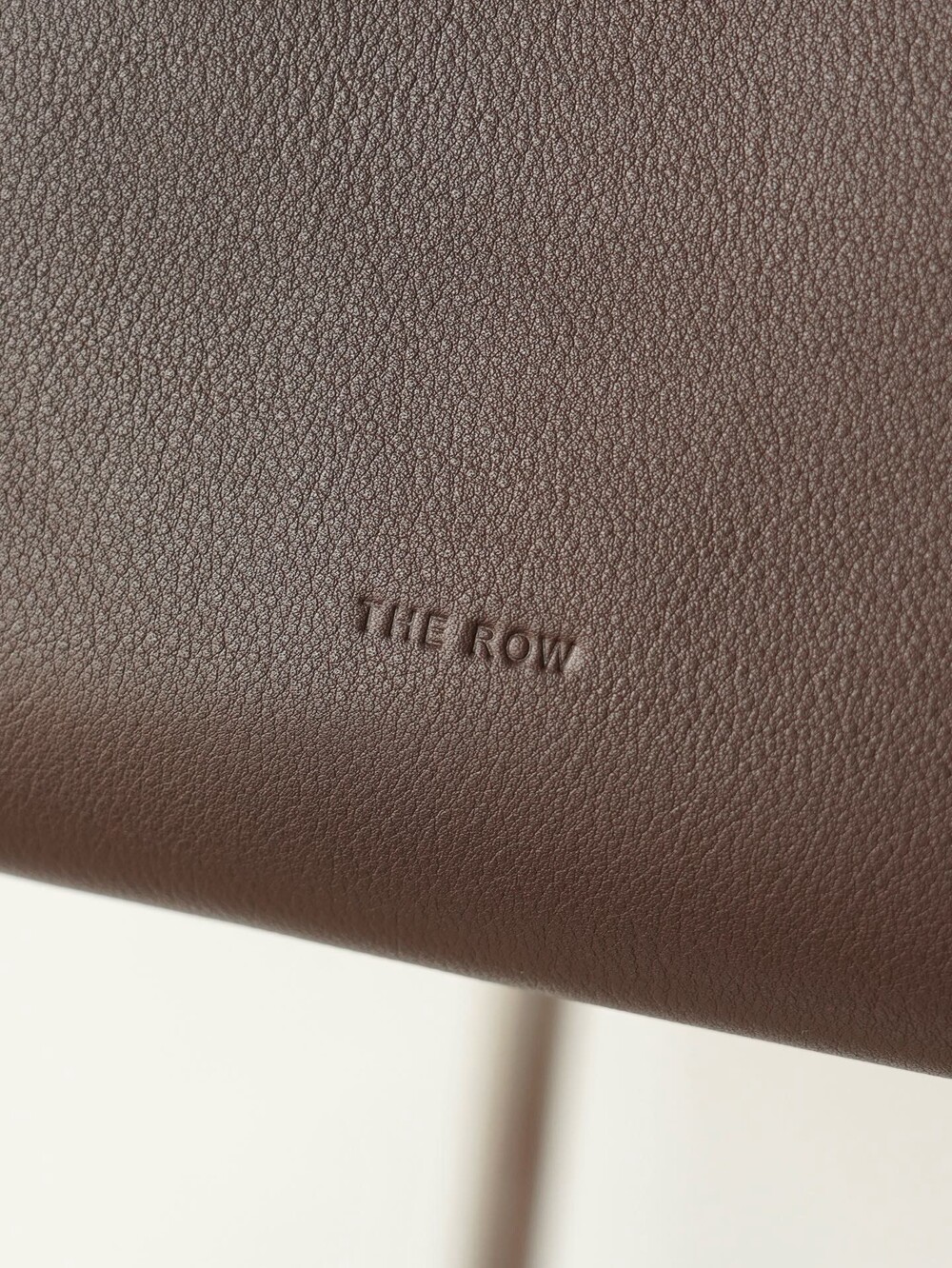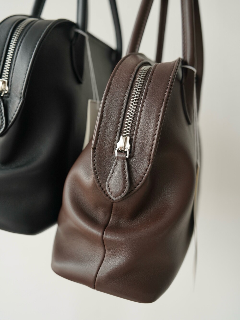 더 로우(The Row)의 블랙 가죽 슬라우치 볼링백. 아그네스 볼링백은 광택 처리된 새들 가죽으로 제작되었으며, 손으로 꿰맨 튜브형 손잡이, 모서리 마감, 지퍼 여밈, 그리고 마감 처리가 되지 않은 칼라가 특징입니다.