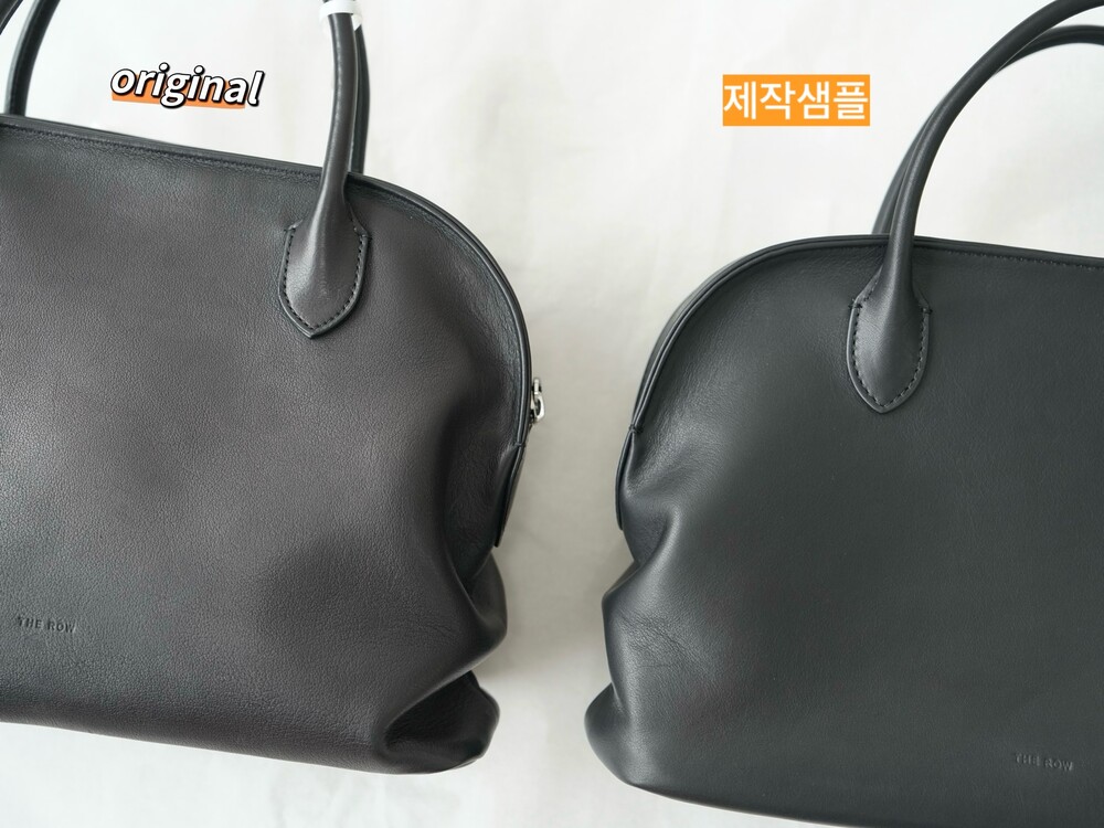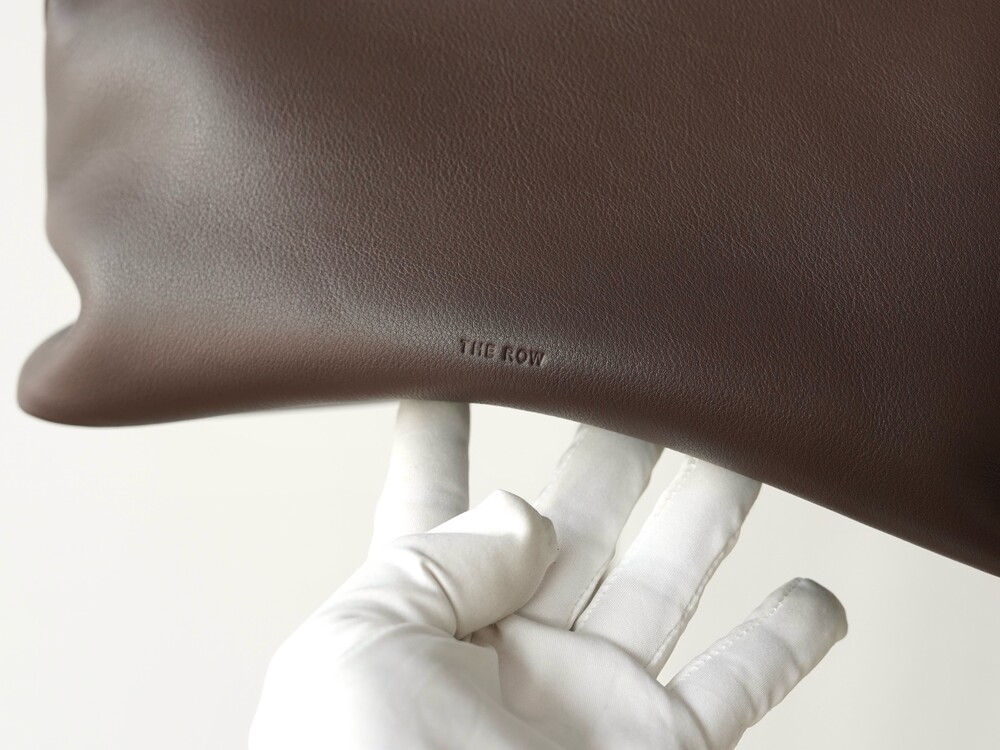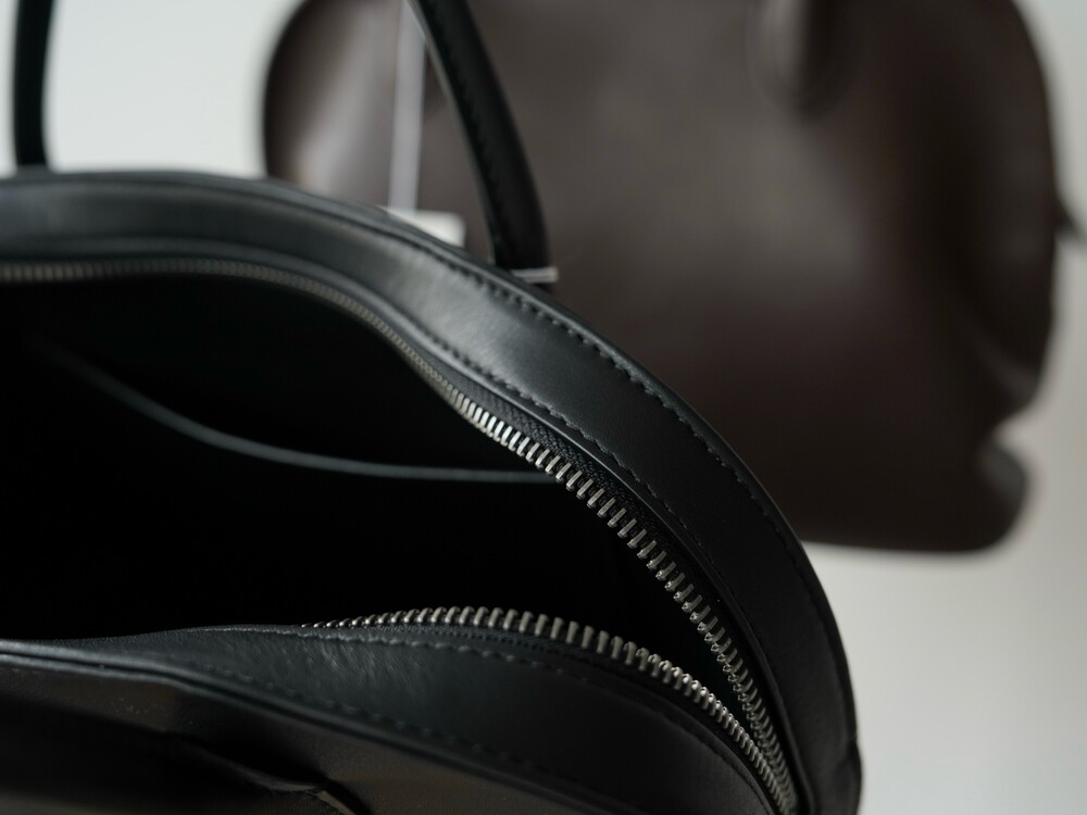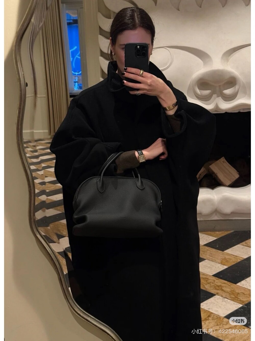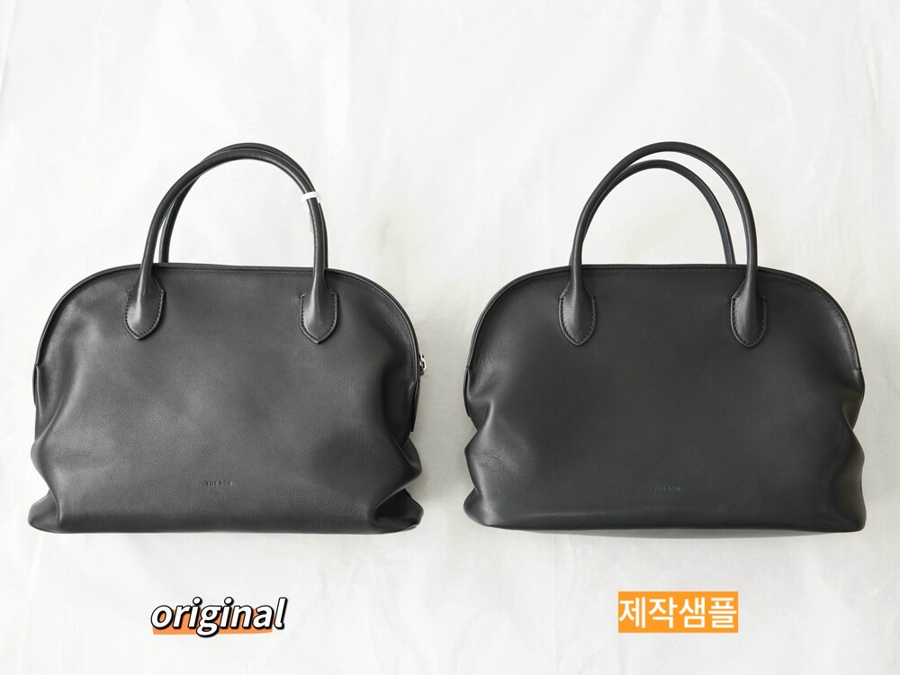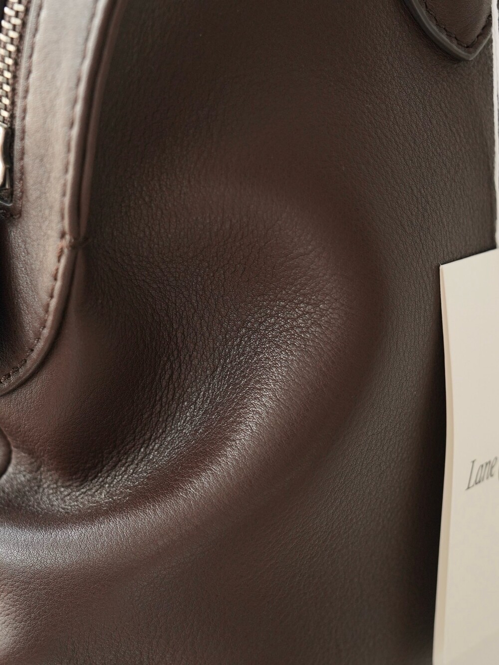 더 로우(The Row)의 블랙 가죽 슬라우치 볼링백. 아그네스 볼링백은 광택 처리된 새들 가죽으로 제작되었으며, 손으로 꿰맨 튜브형 손잡이, 모서리 마감, 지퍼 여밈, 그리고 마감 처리가 되지 않은 칼라가 특징입니다.