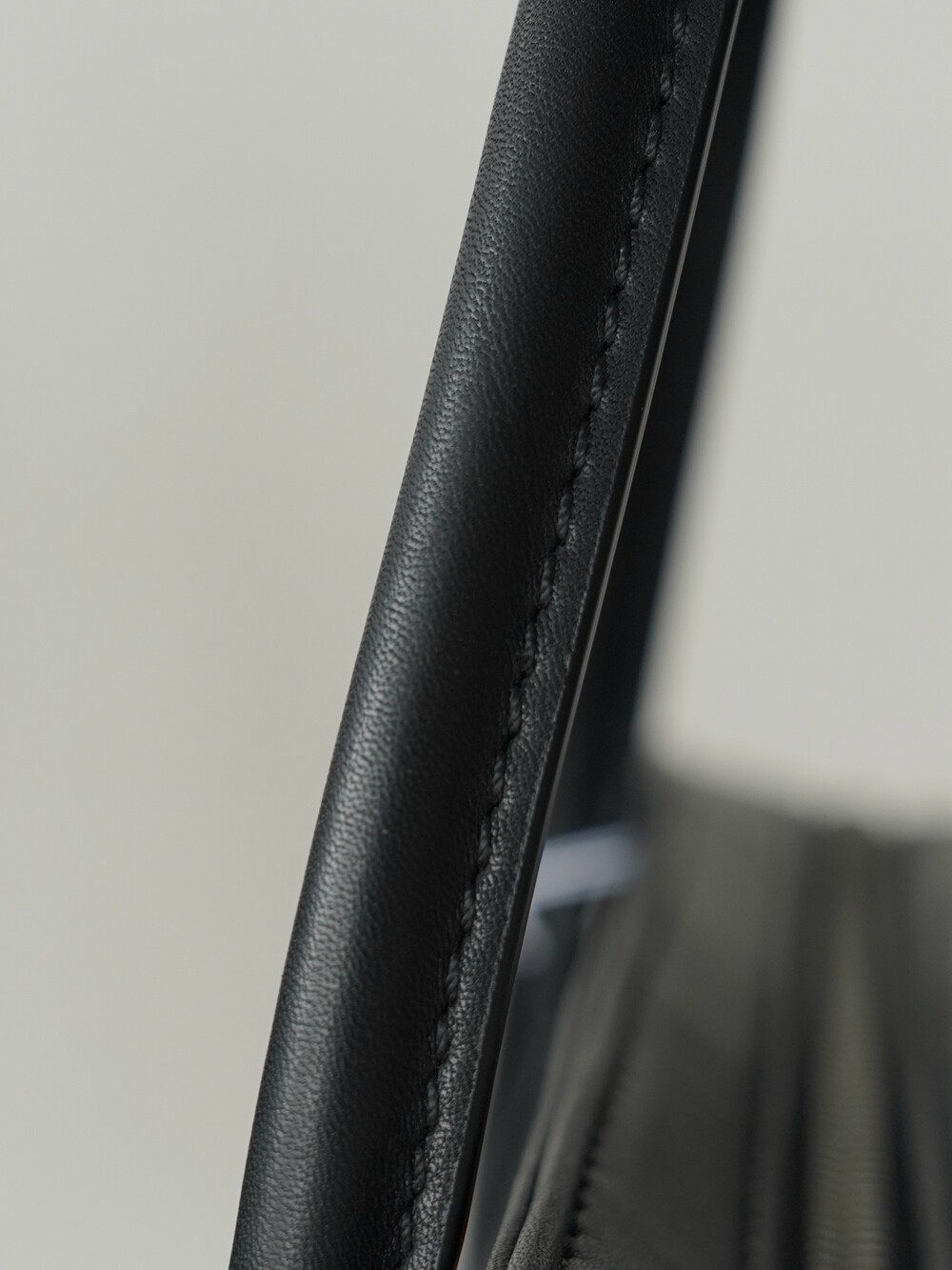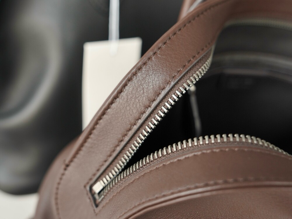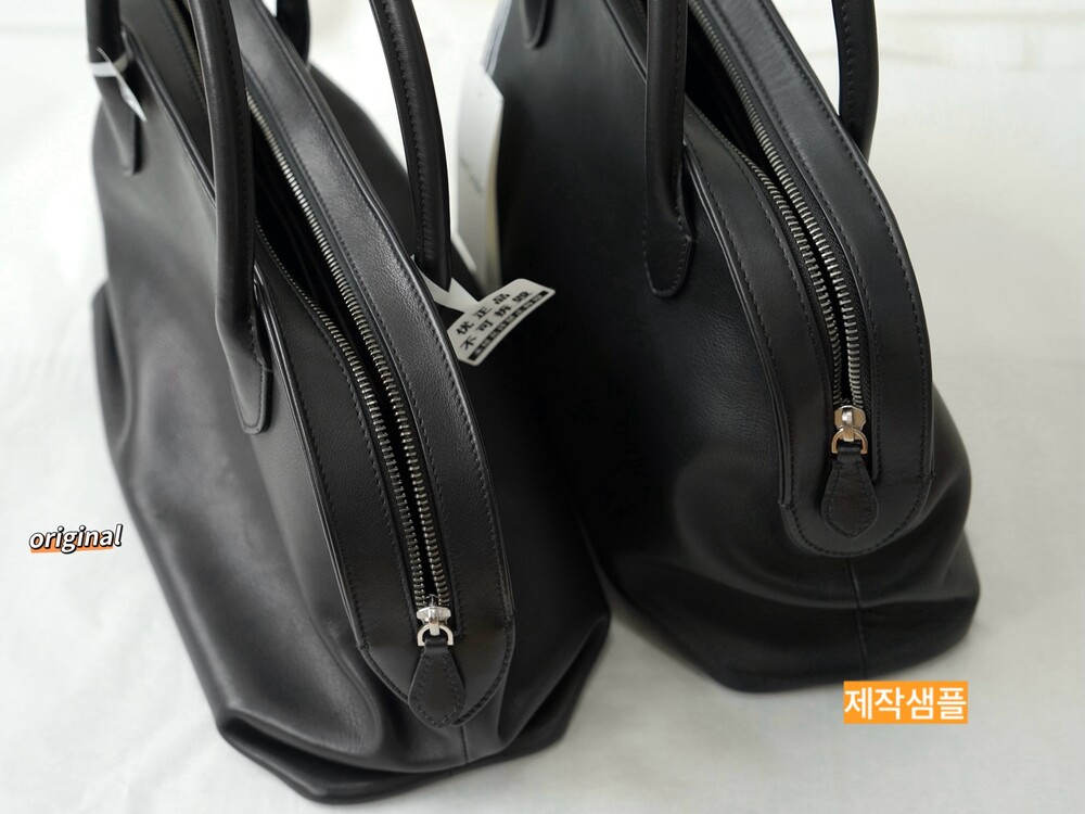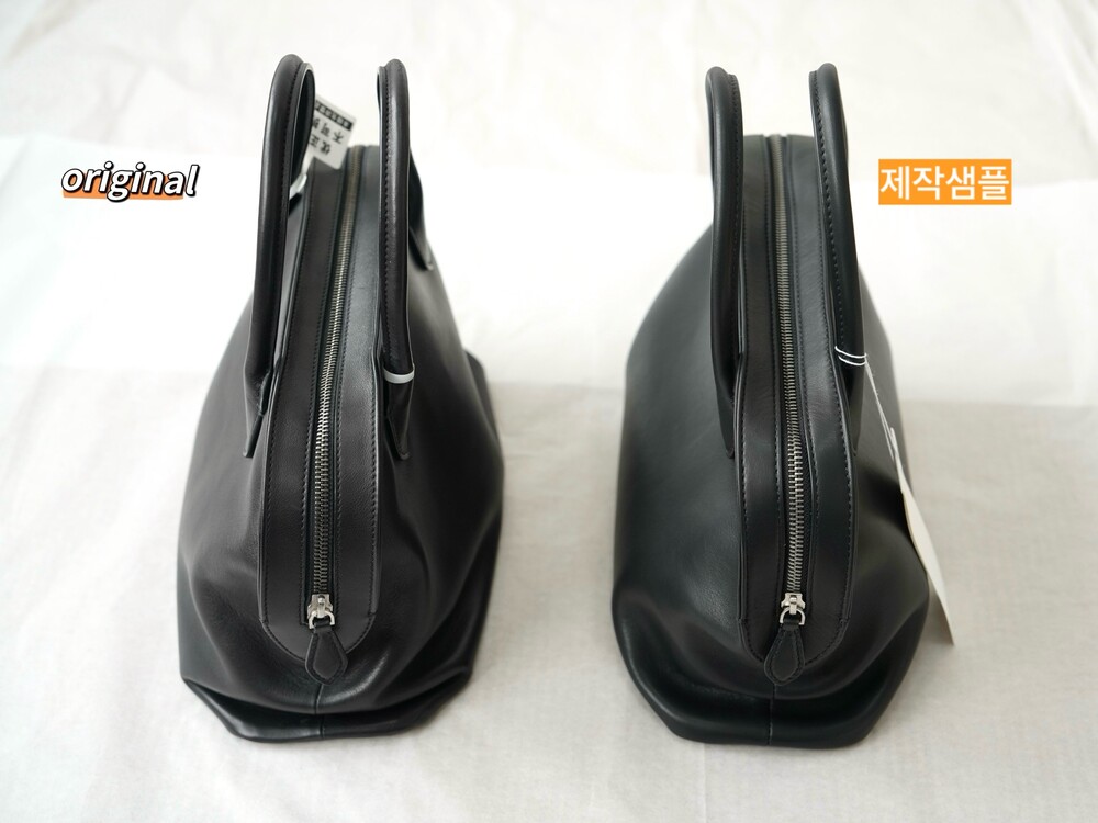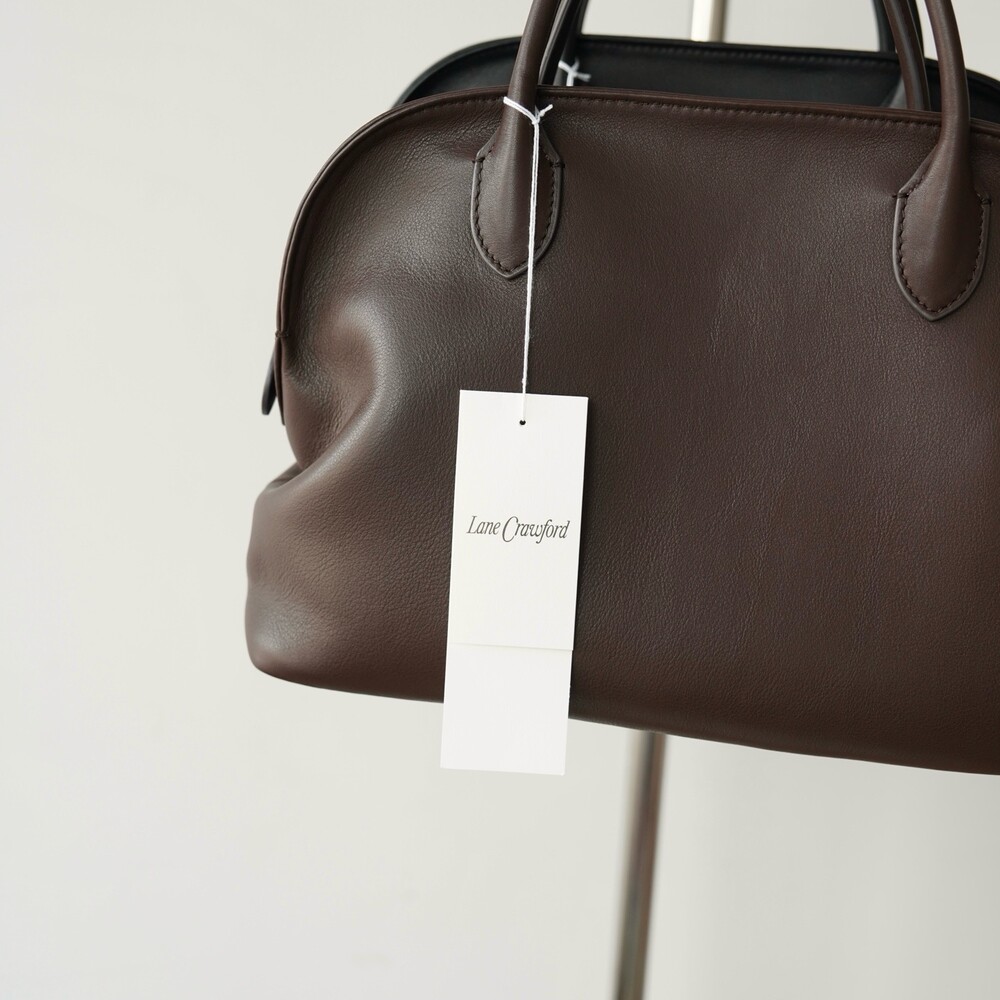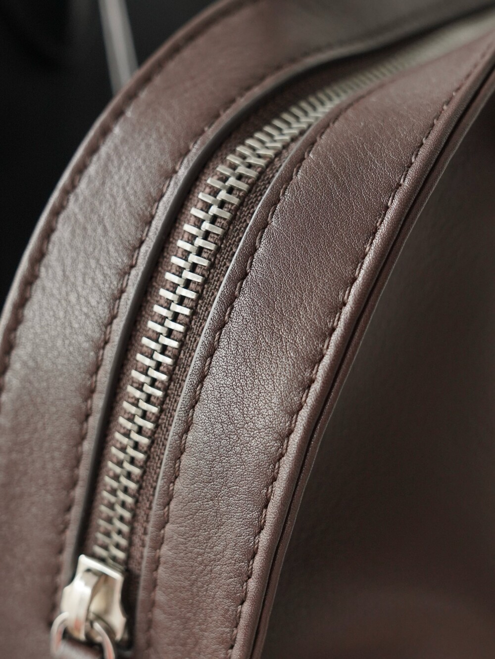 더 로우(The Row)의 블랙 가죽 슬라우치 볼링백. 아그네스 볼링백은 광택 처리된 새들 가죽으로 제작되었으며, 손으로 꿰맨 튜브형 손잡이, 모서리 마감, 지퍼 여밈, 그리고 마감 처리가 되지 않은 칼라가 특징입니다.