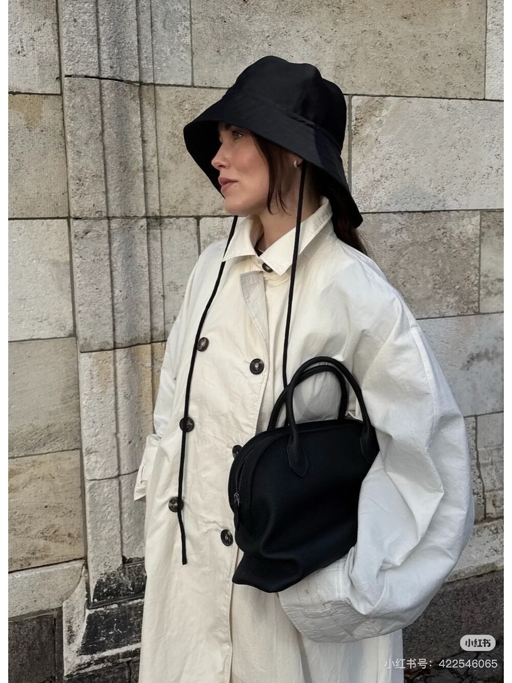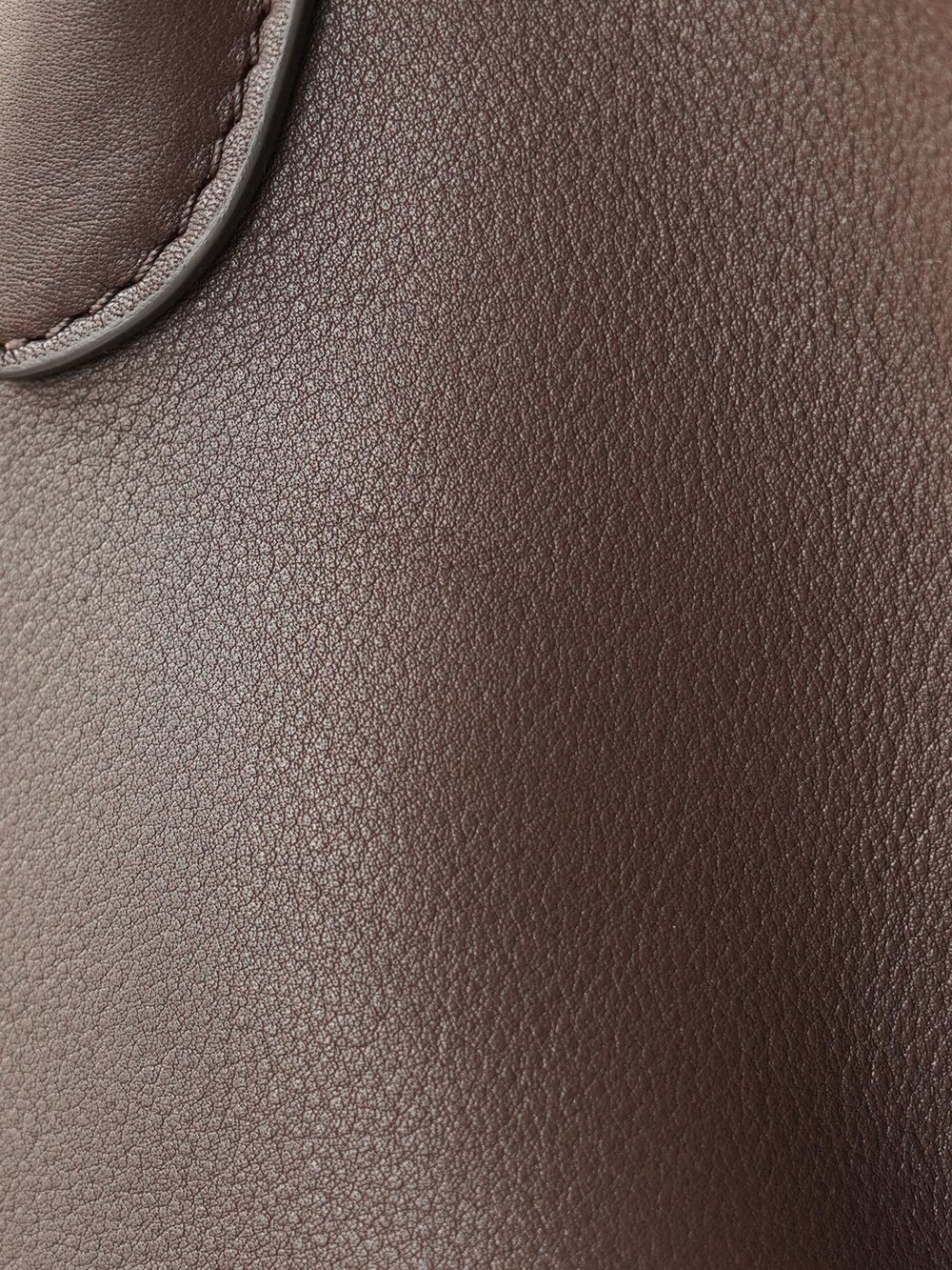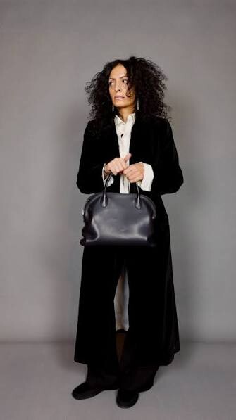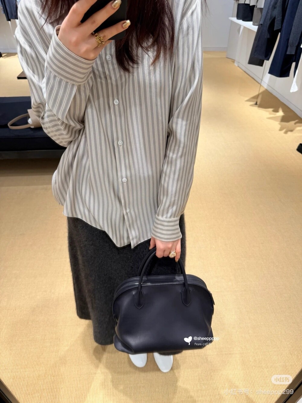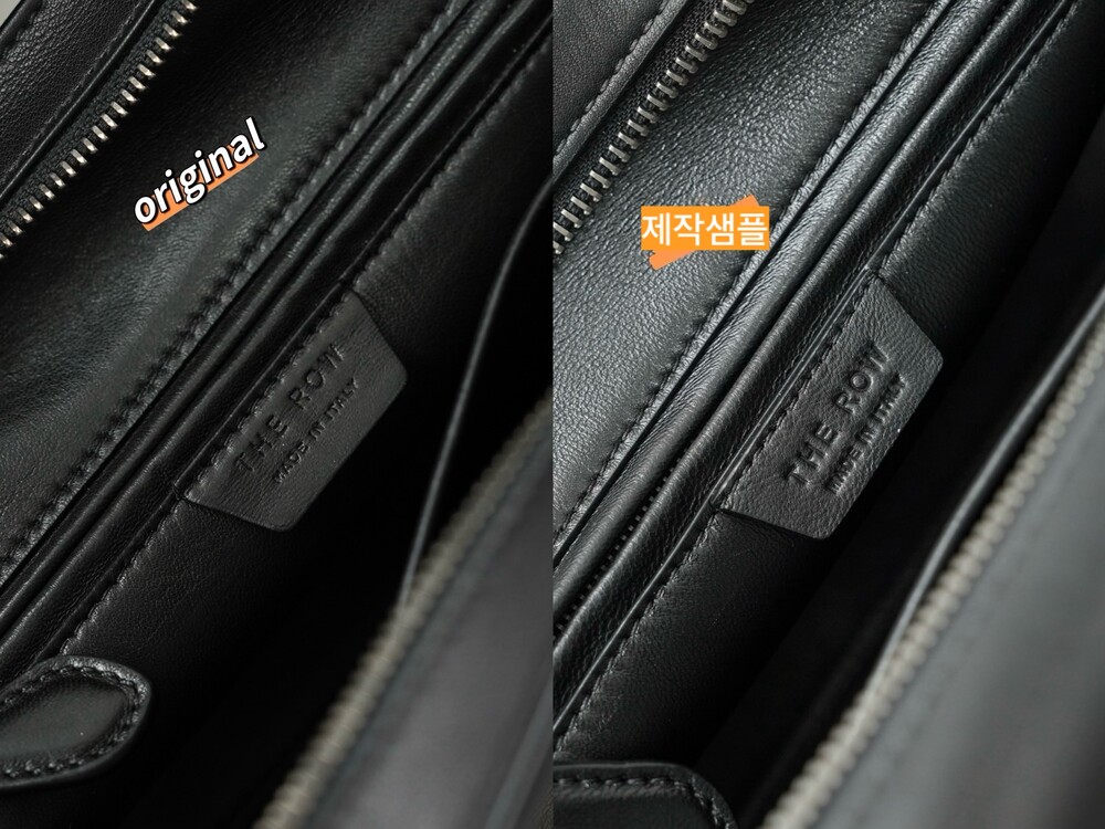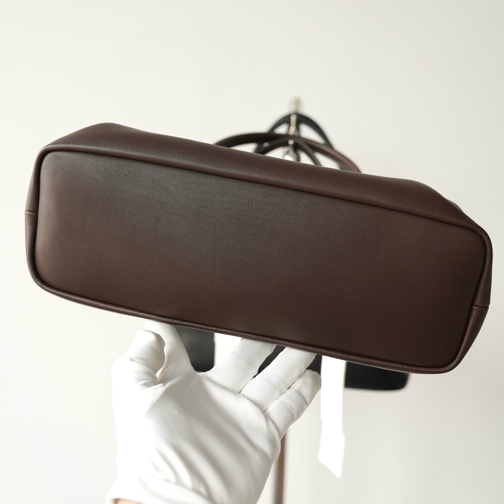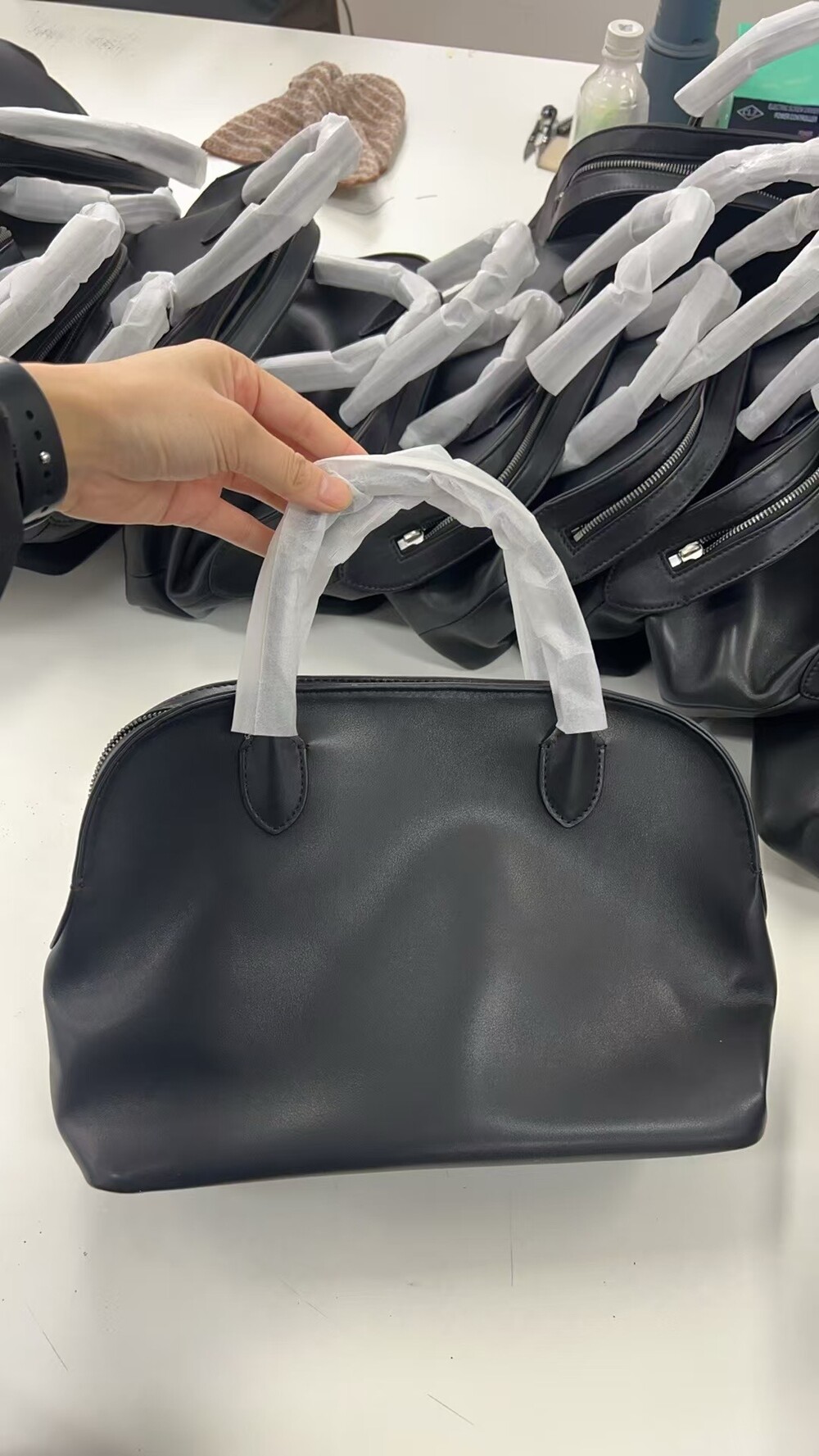 더 로우(The Row)의 블랙 가죽 슬라우치 볼링백. 아그네스 볼링백은 광택 처리된 새들 가죽으로 제작되었으며, 손으로 꿰맨 튜브형 손잡이, 모서리 마감, 지퍼 여밈, 그리고 마감 처리가 되지 않은 칼라가 특징입니다.