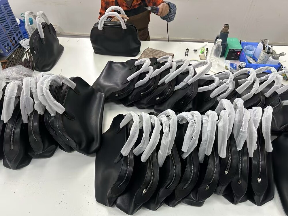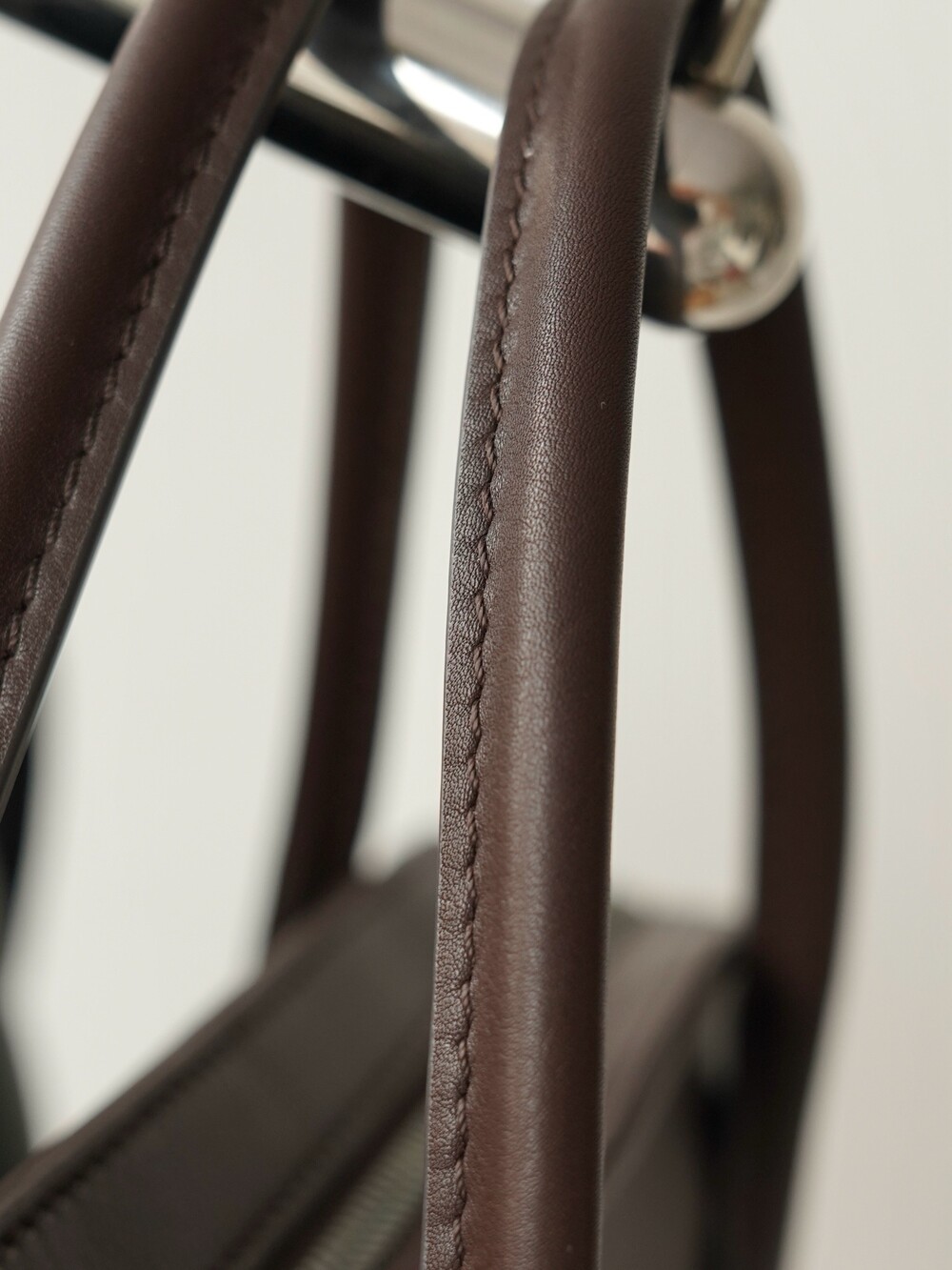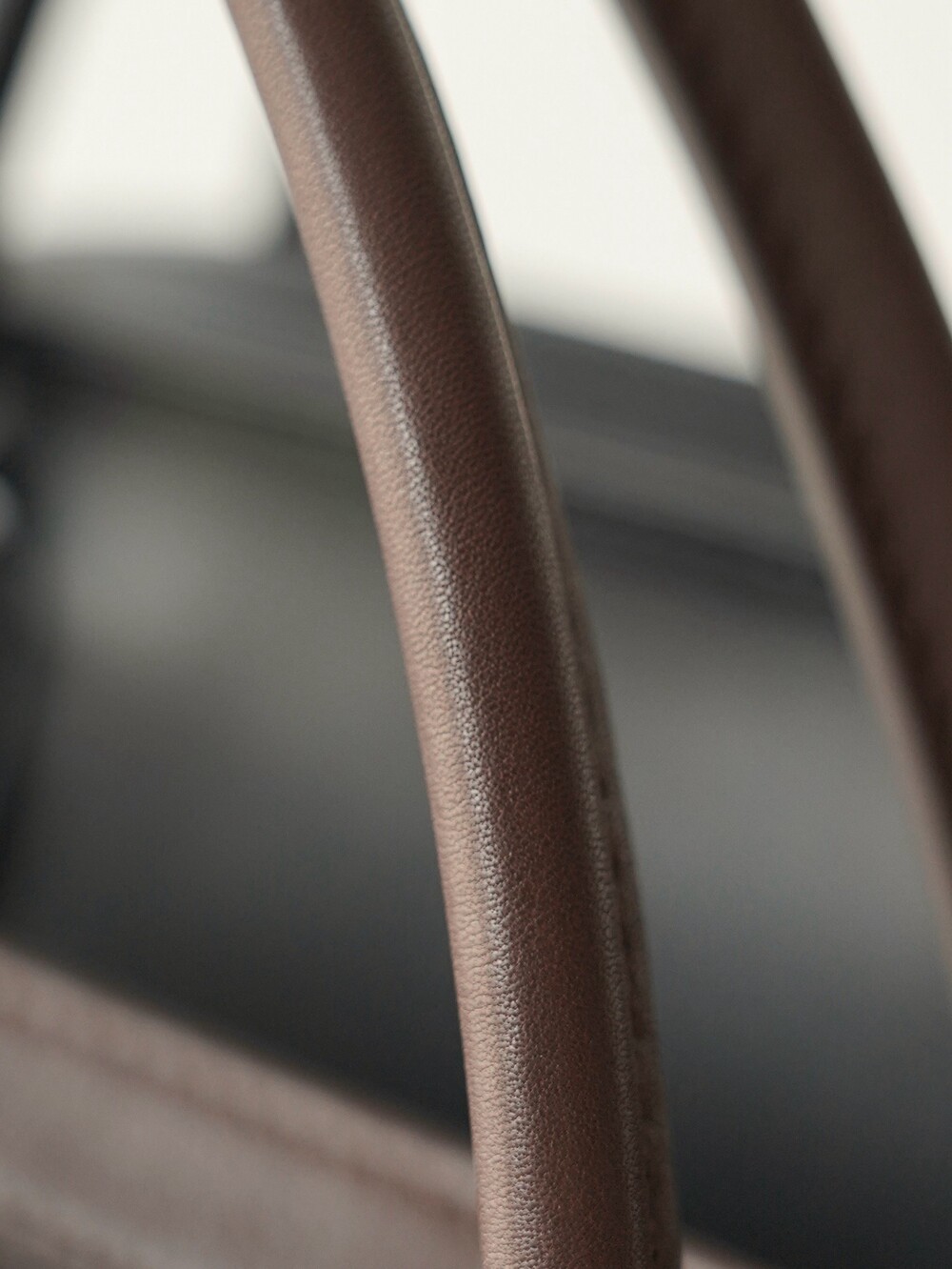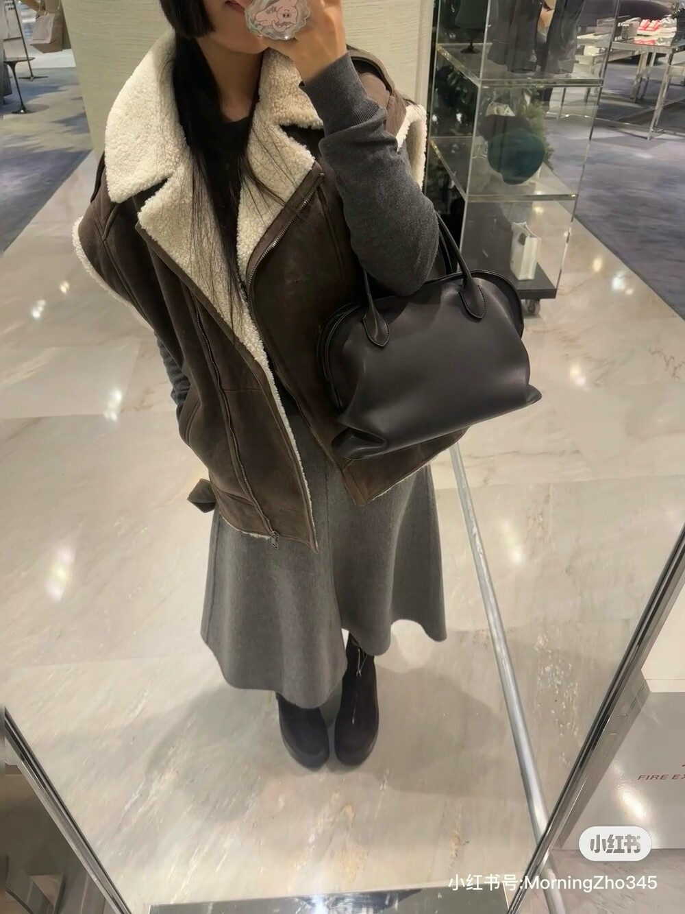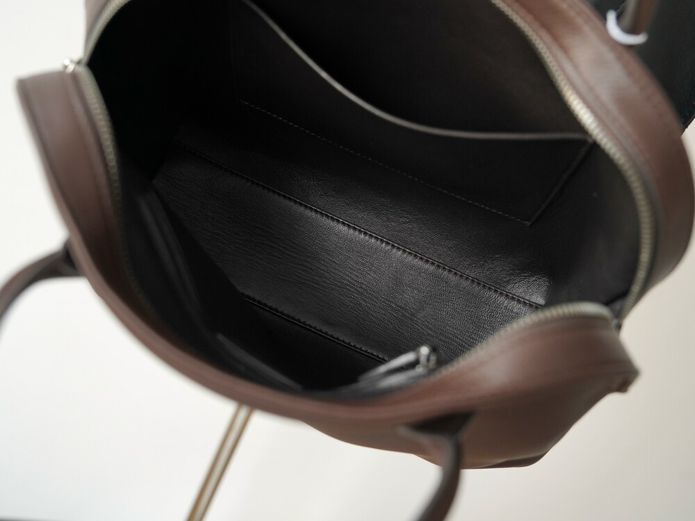 더 로우(The Row)의 블랙 가죽 슬라우치 볼링백. 아그네스 볼링백은 광택 처리된 새들 가죽으로 제작되었으며, 손으로 꿰맨 튜브형 손잡이, 모서리 마감, 지퍼 여밈, 그리고 마감 처리가 되지 않은 칼라가 특징입니다.