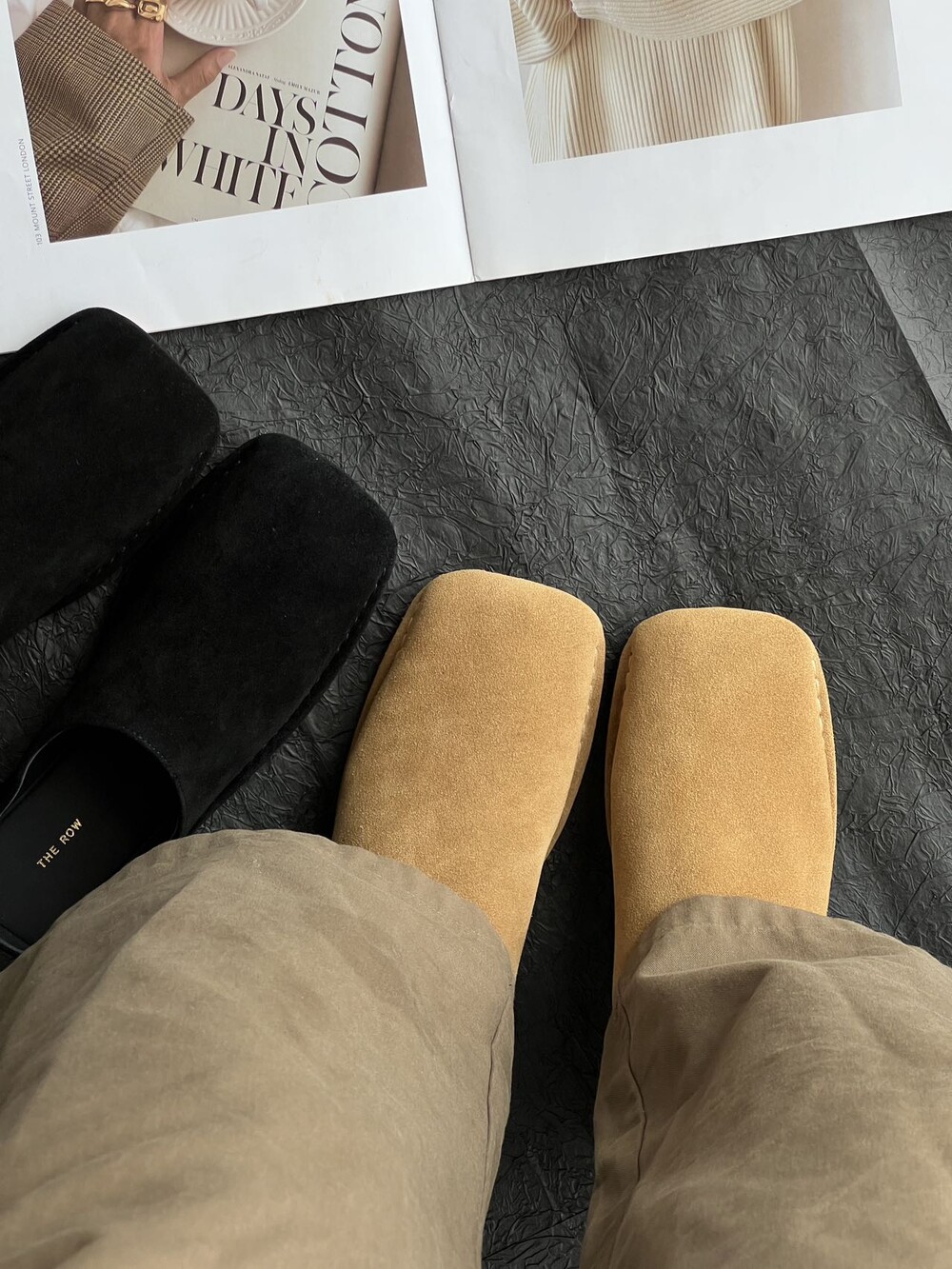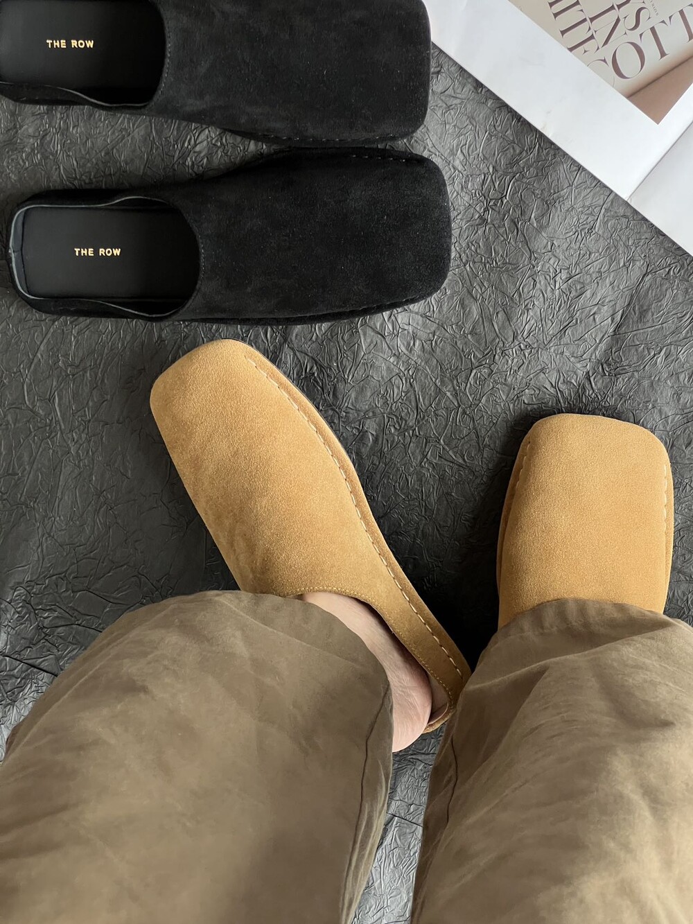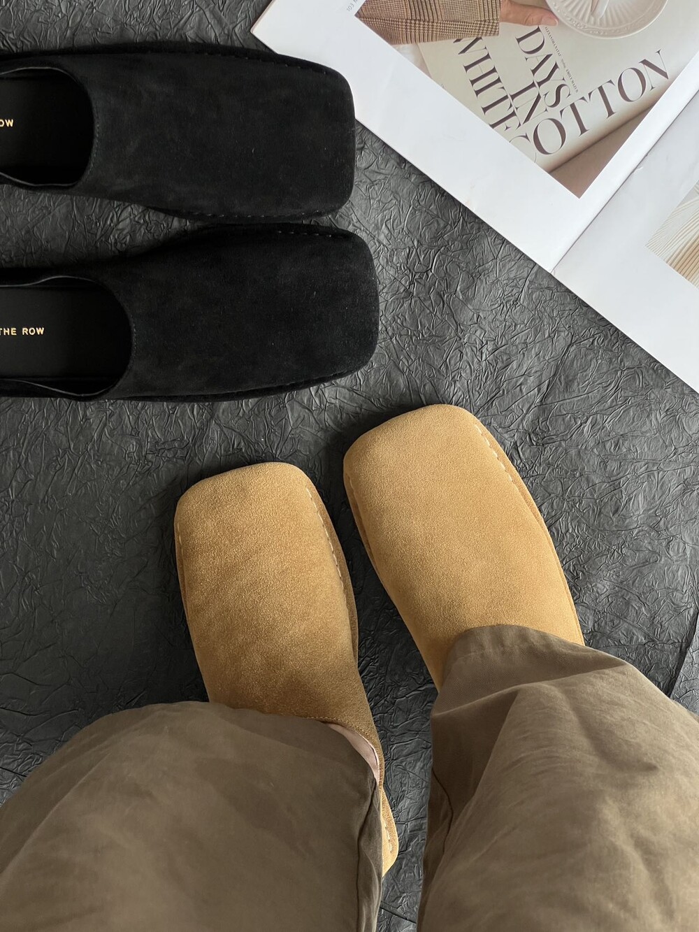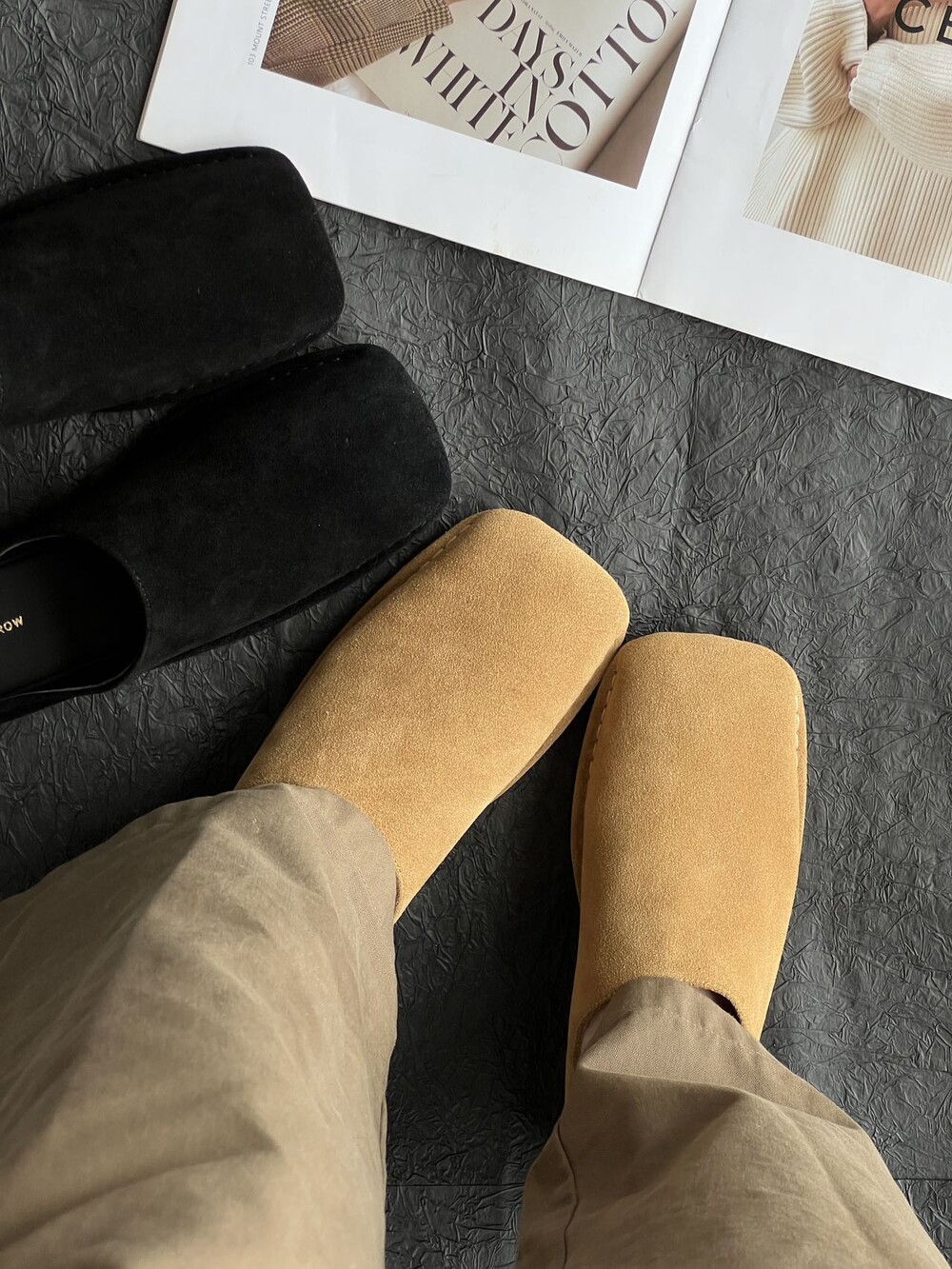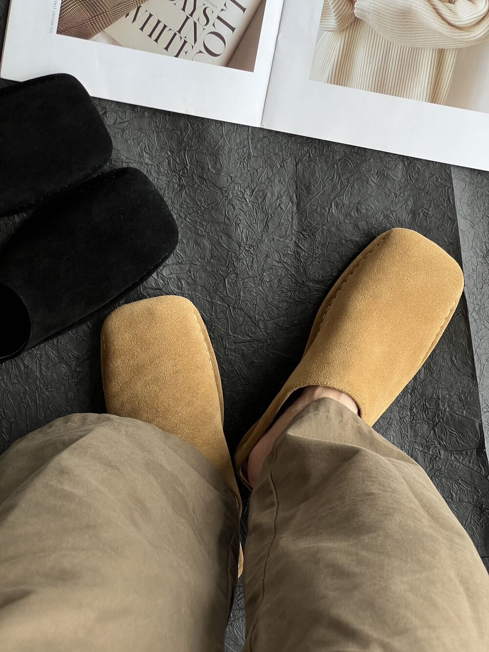 수작업으로 제작한 부드러운 카프스킨 스웨이드 소재의 슬립온 슈즈. 스퀘어 토, 겉면의 스티치 디테일, 부드러운 나파 가죽 소재의 안감, 가죽 밑창.