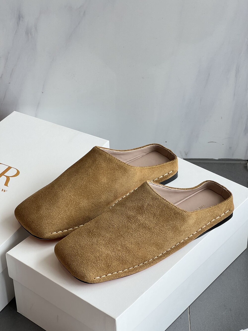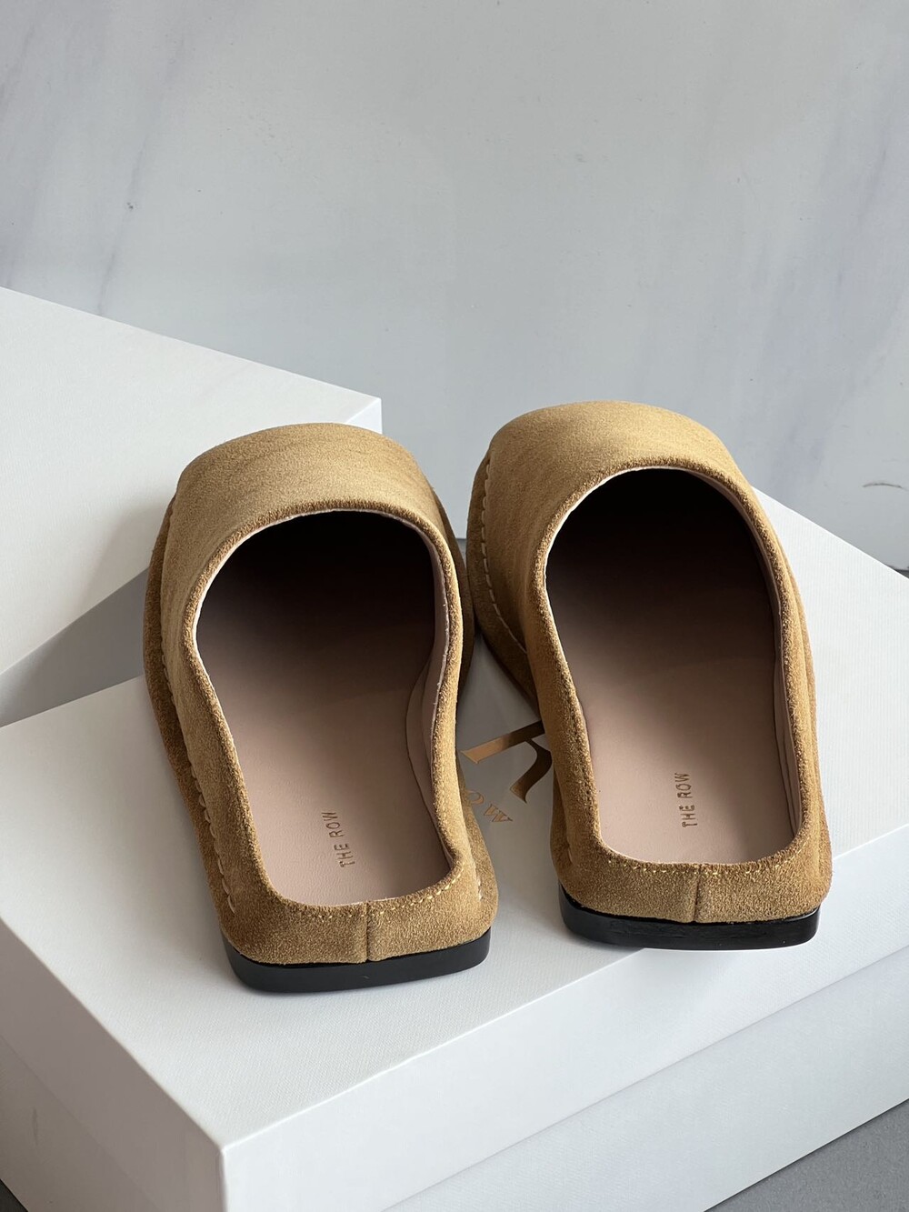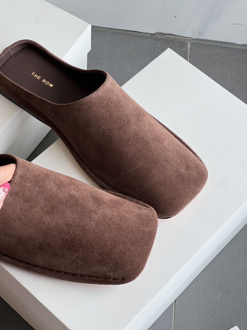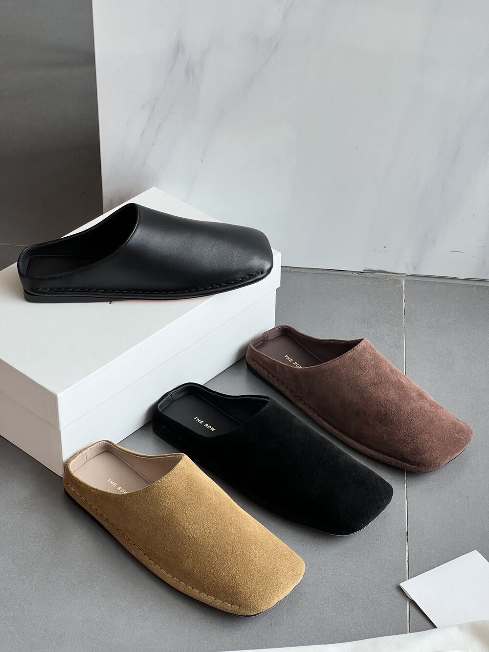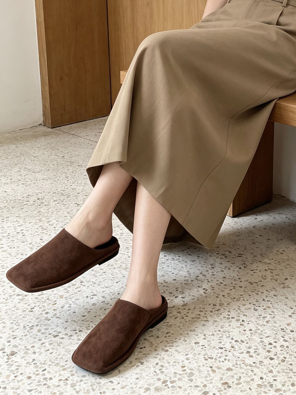수작업으로 제작한 부드러운 카프스킨 스웨이드 소재의 슬립온 슈즈. 스퀘어 토, 겉면의 스티치 디테일, 부드러운 나파 가죽 소재의 안감, 가죽 밑창.