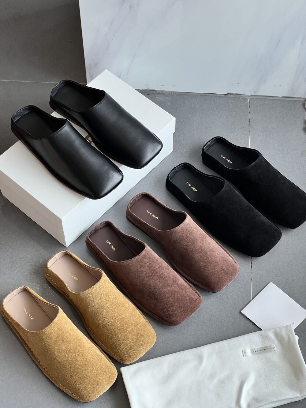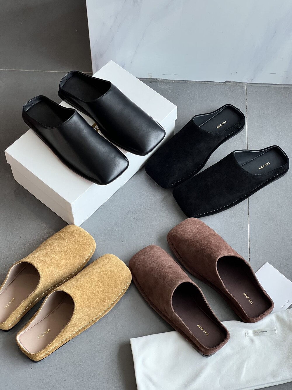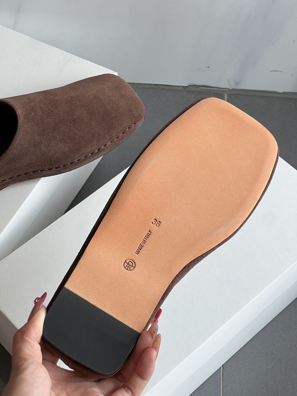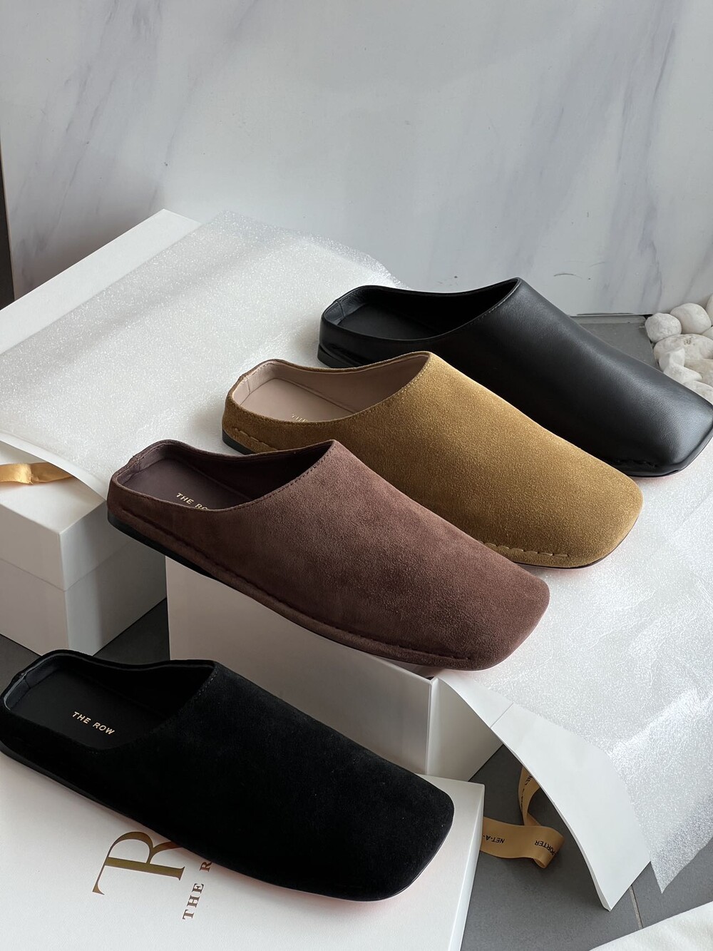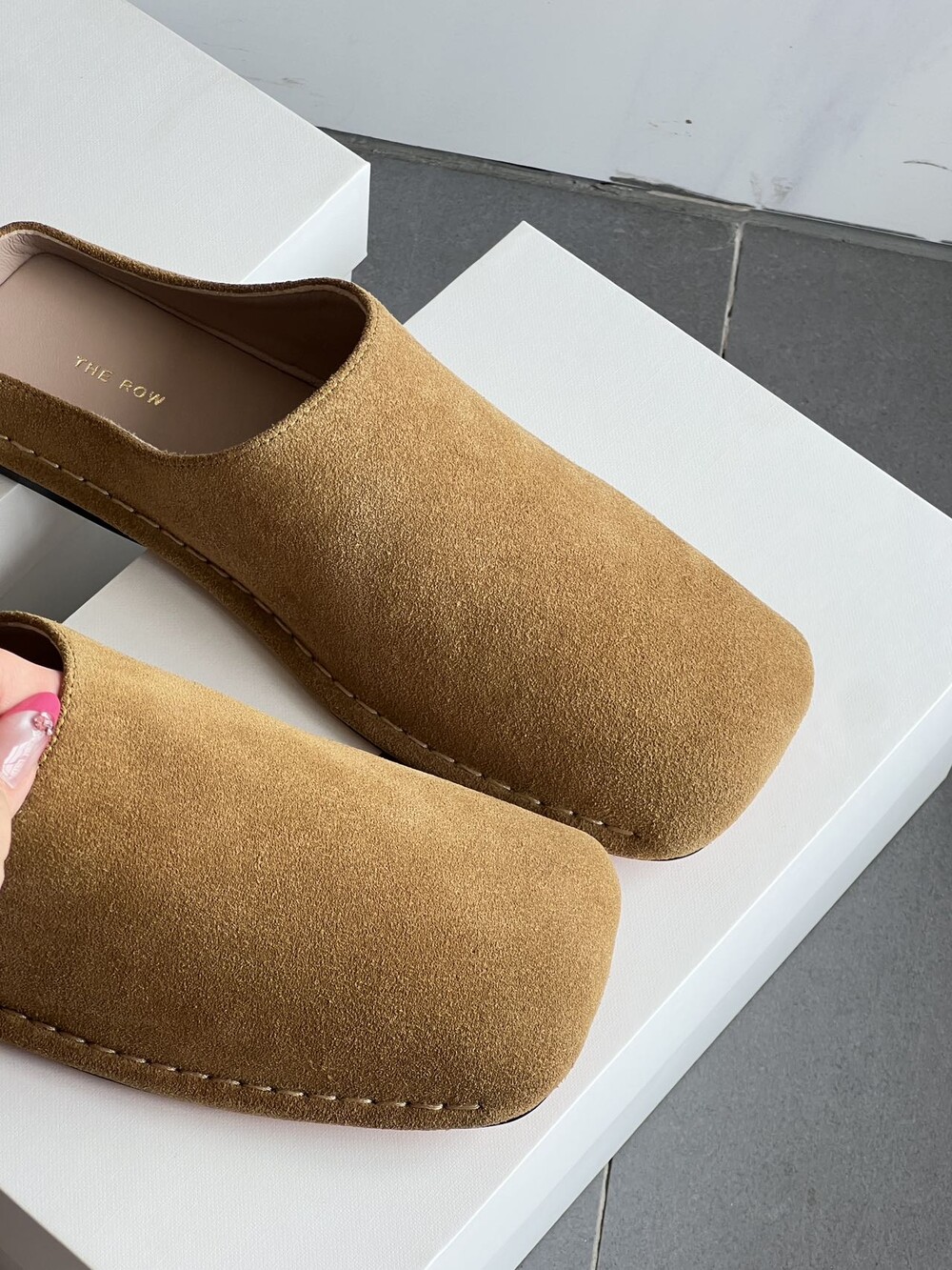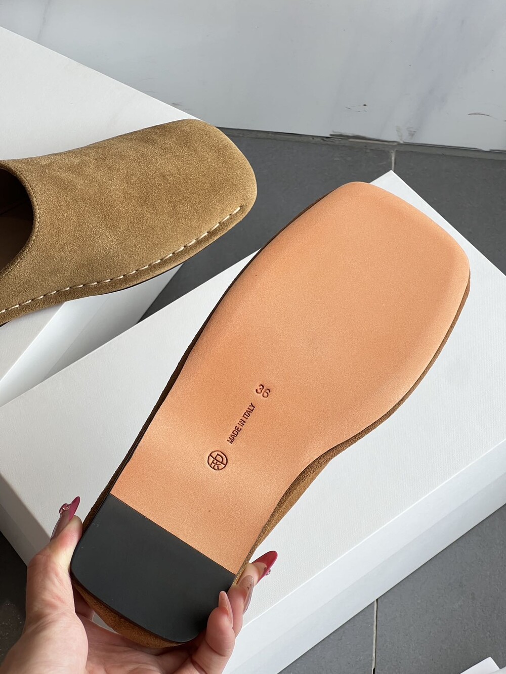 수작업으로 제작한 부드러운 카프스킨 스웨이드 소재의 슬립온 슈즈. 스퀘어 토, 겉면의 스티치 디테일, 부드러운 나파 가죽 소재의 안감, 가죽 밑창.