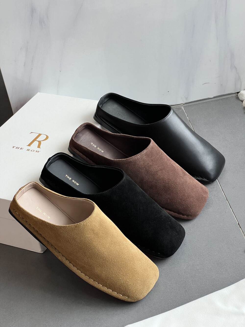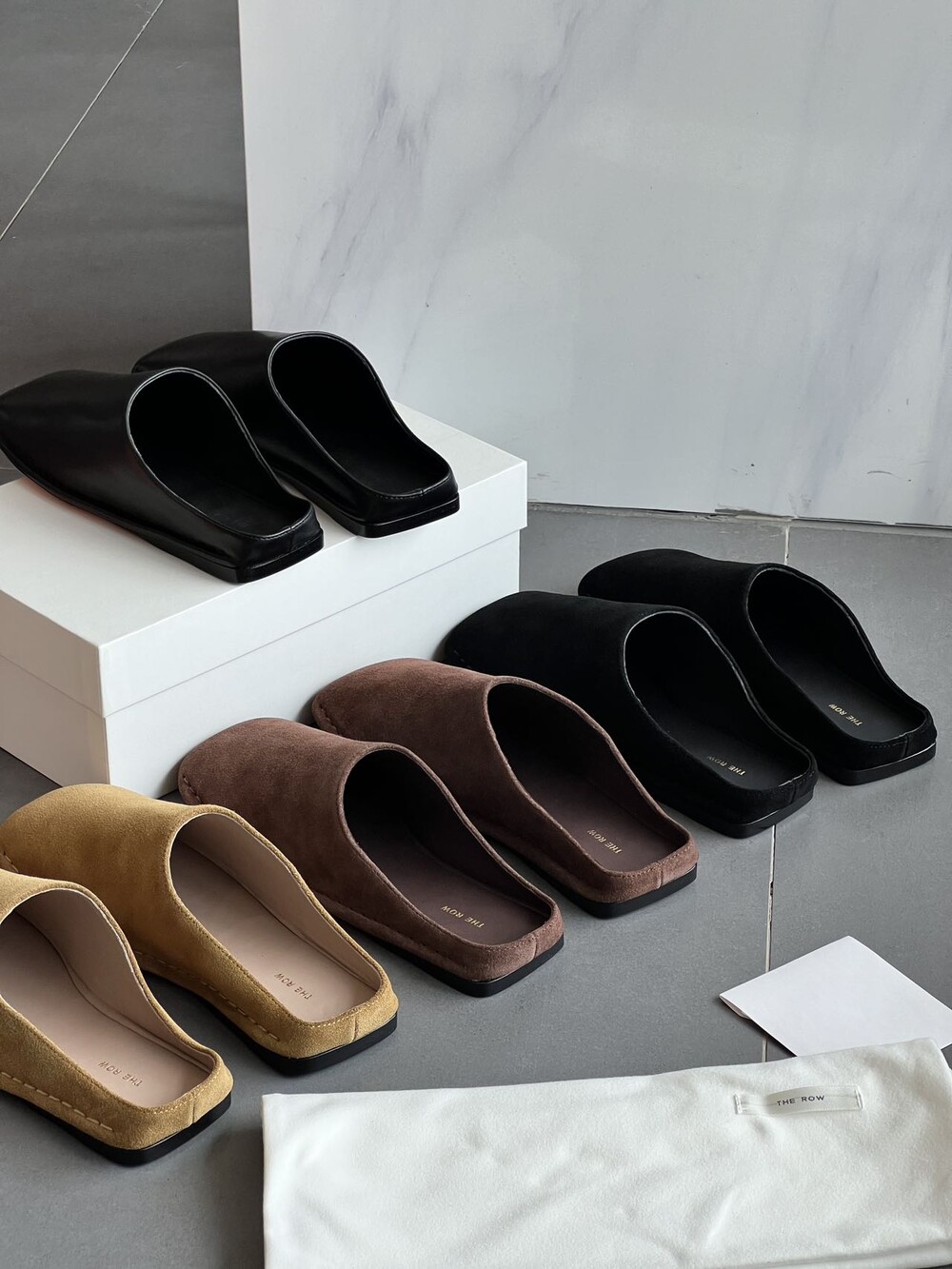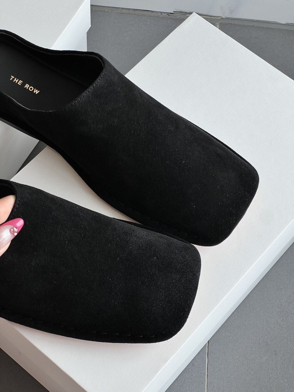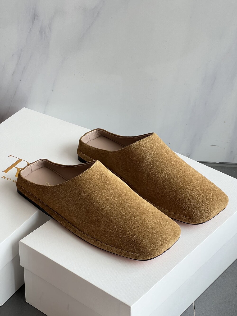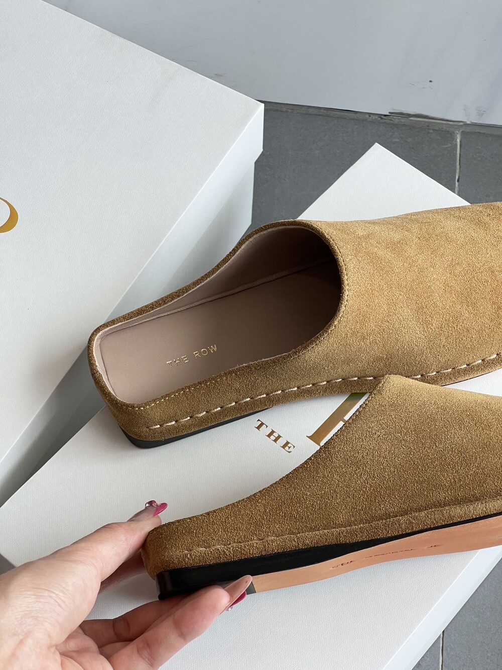수작업으로 제작한 부드러운 카프스킨 스웨이드 소재의 슬립온 슈즈. 스퀘어 토, 겉면의 스티치 디테일, 부드러운 나파 가죽 소재의 안감, 가죽 밑창.