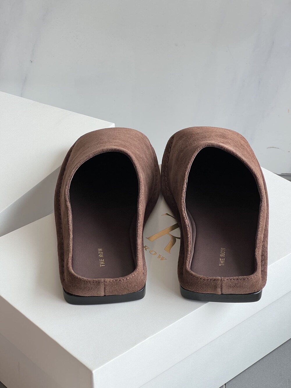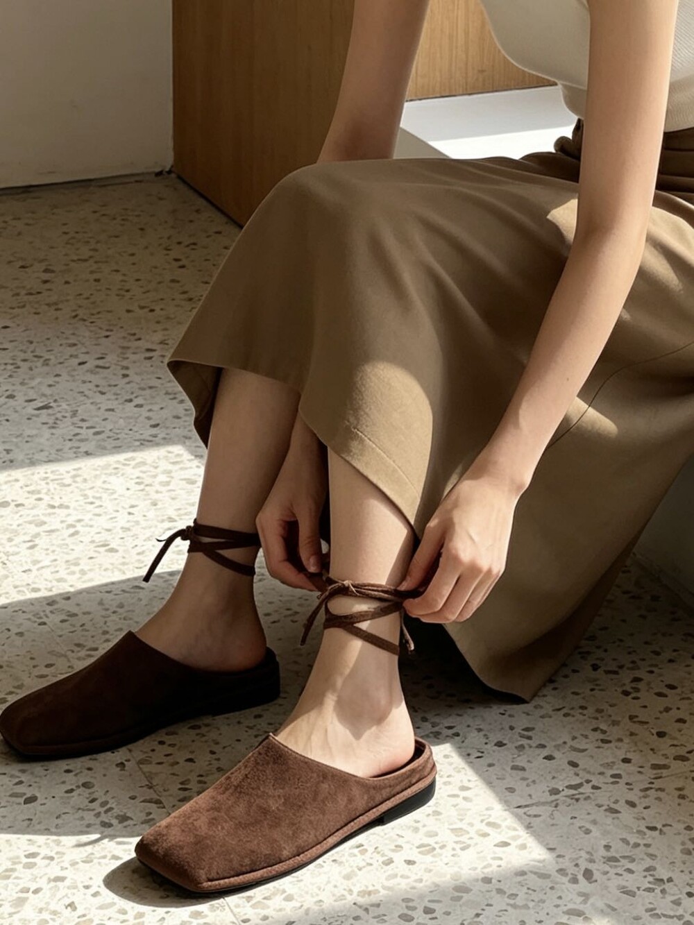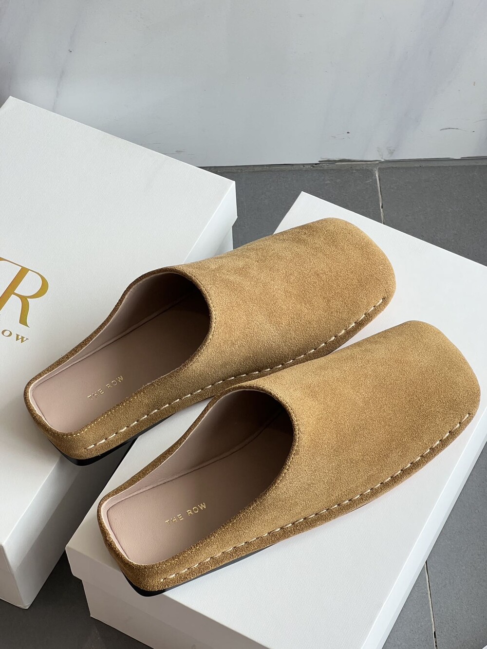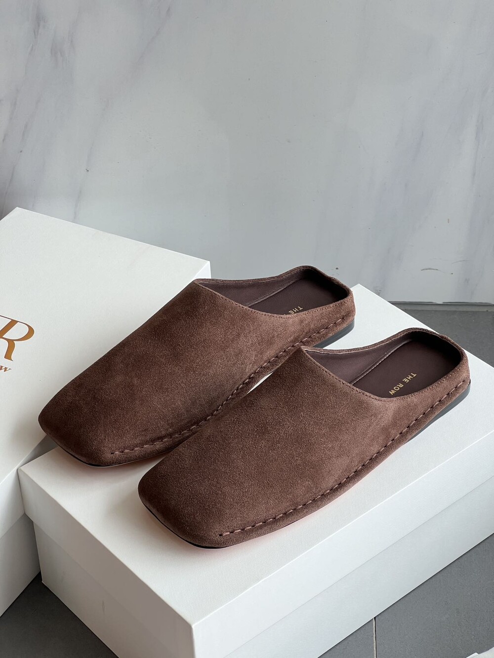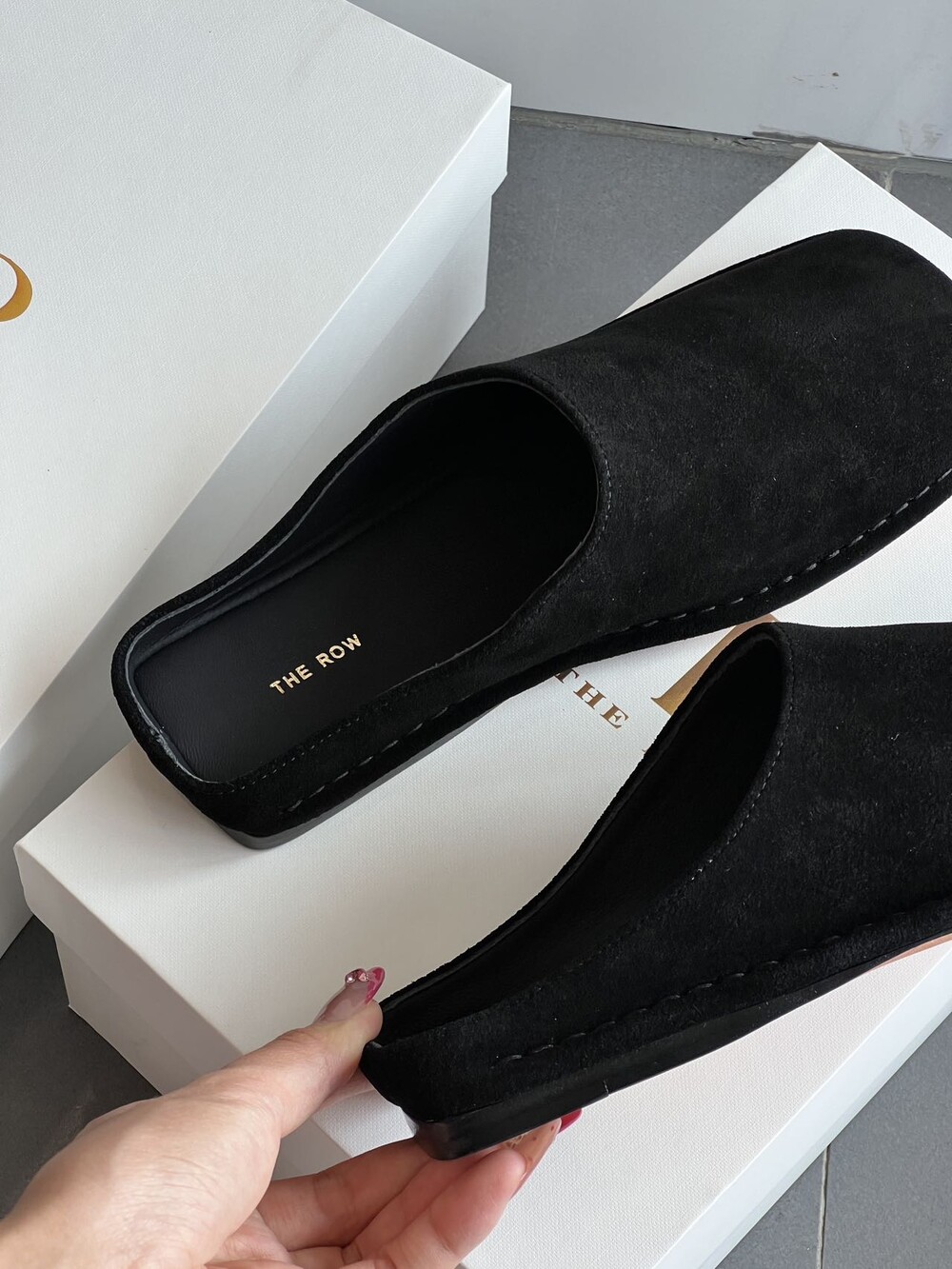수작업으로 제작한 부드러운 카프스킨 스웨이드 소재의 슬립온 슈즈. 스퀘어 토, 겉면의 스티치 디테일, 부드러운 나파 가죽 소재의 안감, 가죽 밑창.