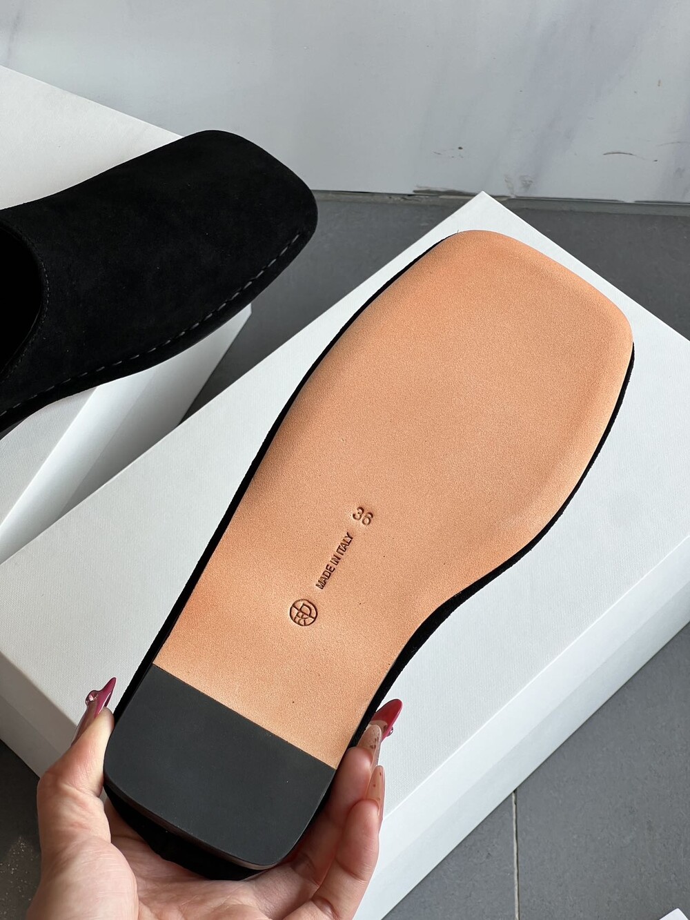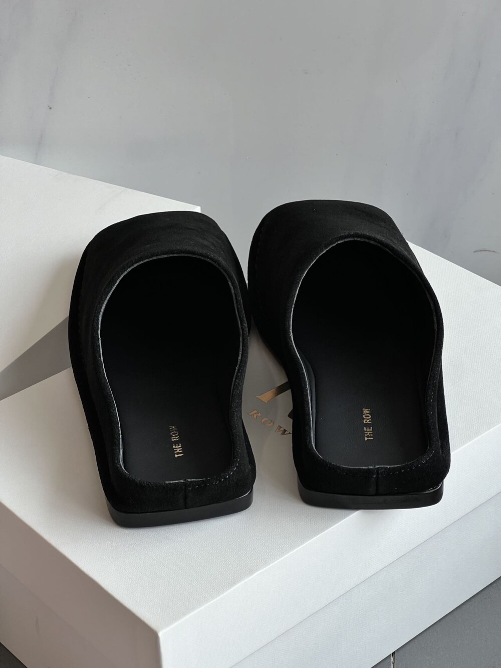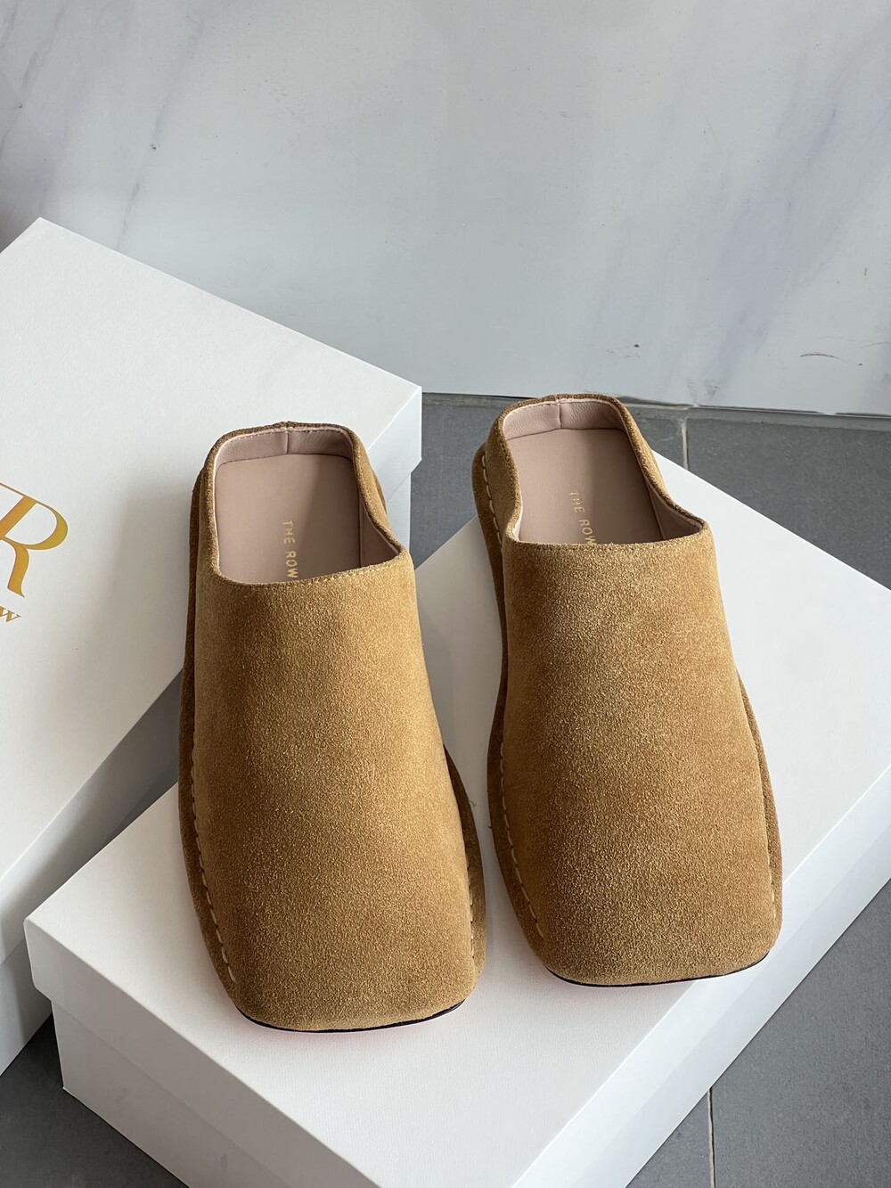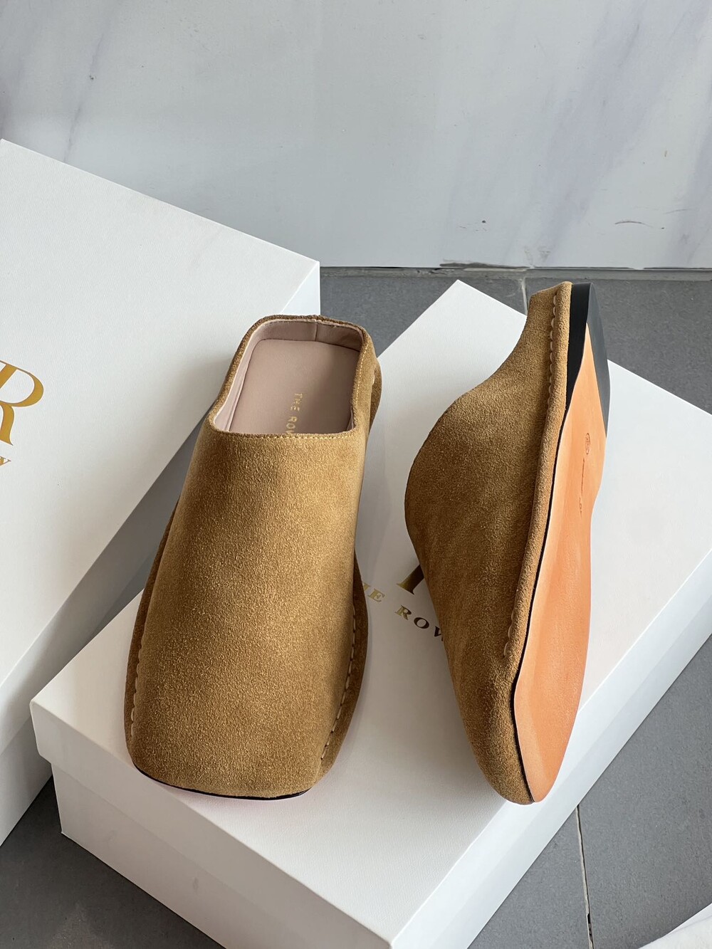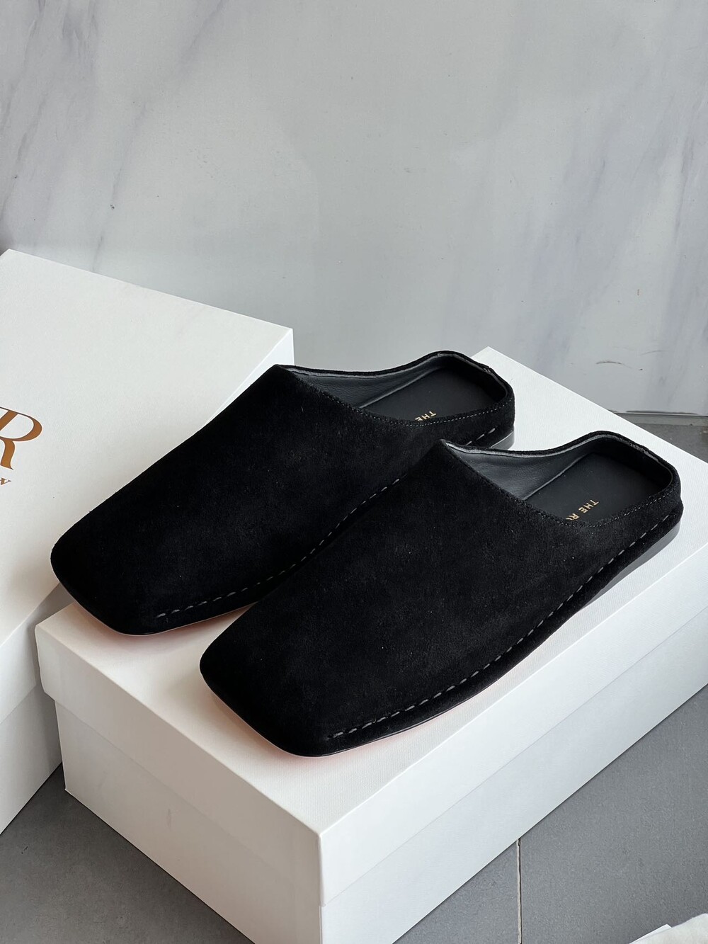 수작업으로 제작한 부드러운 카프스킨 스웨이드 소재의 슬립온 슈즈. 스퀘어 토, 겉면의 스티치 디테일, 부드러운 나파 가죽 소재의 안감, 가죽 밑창.