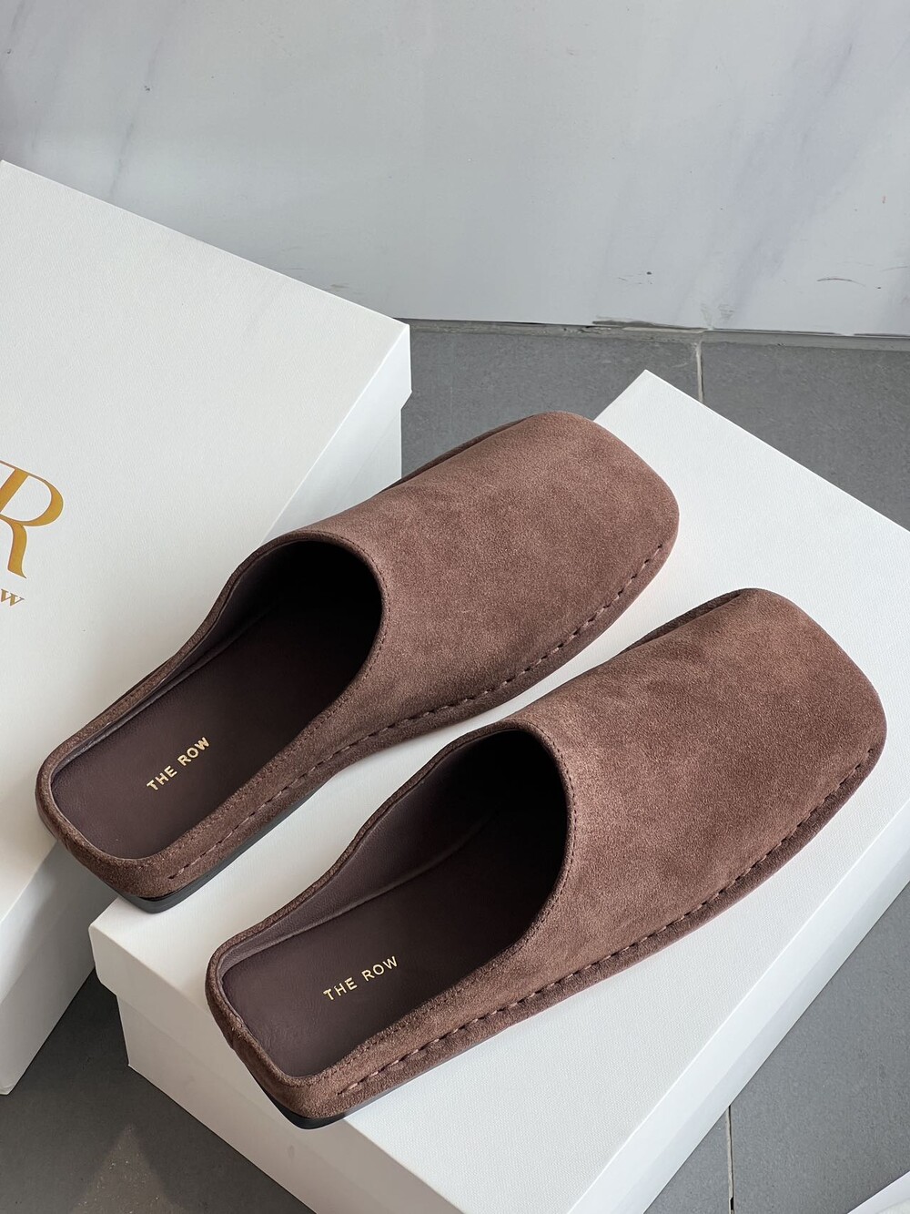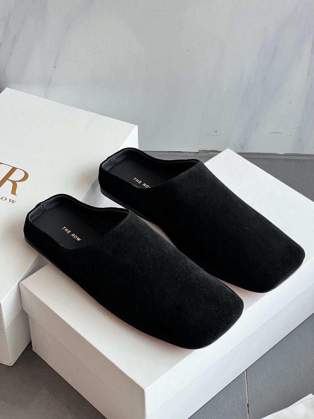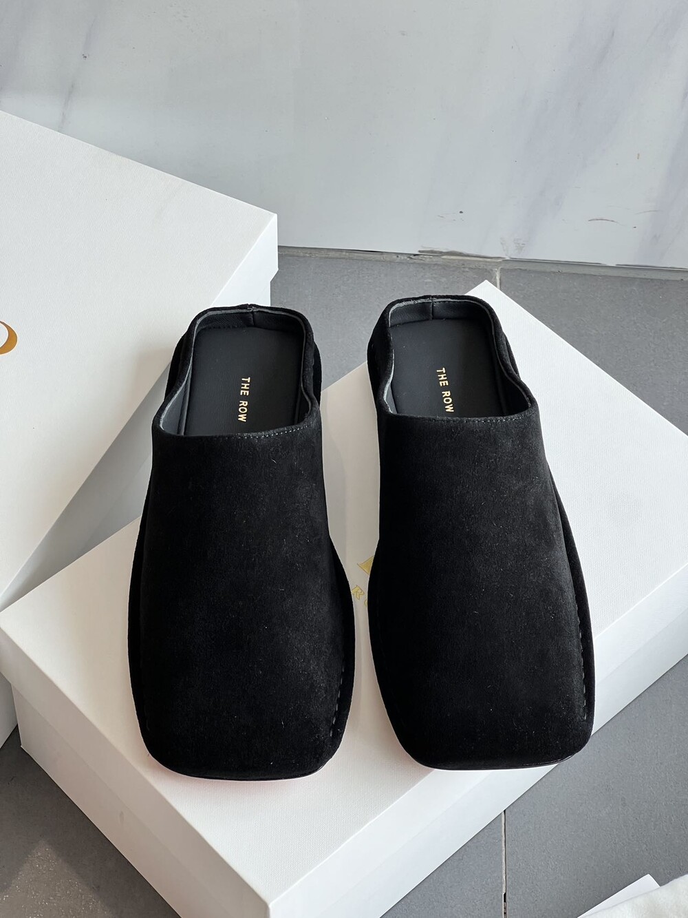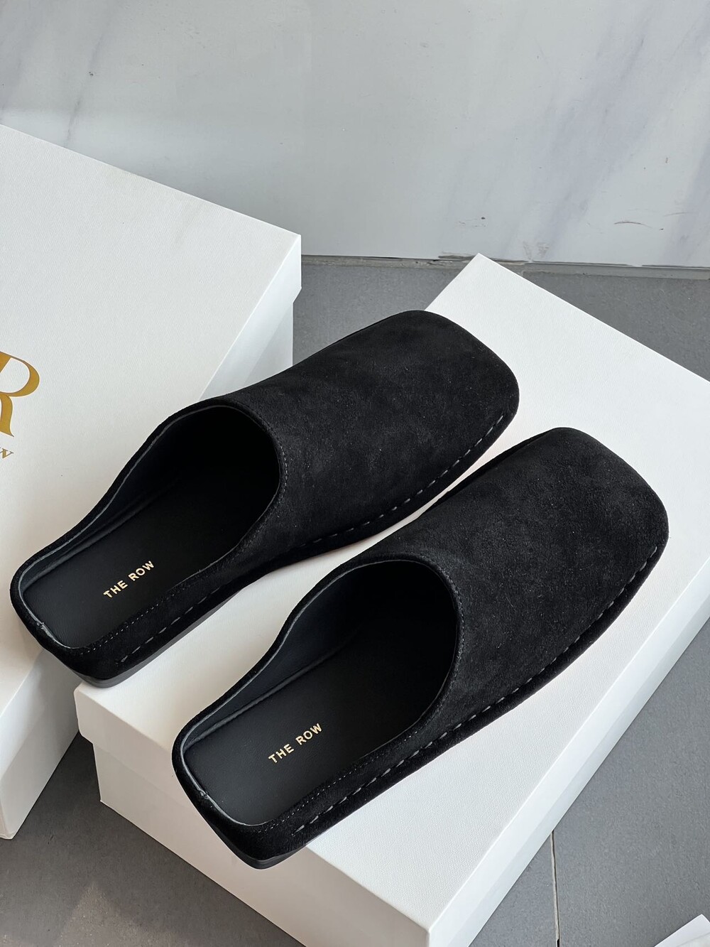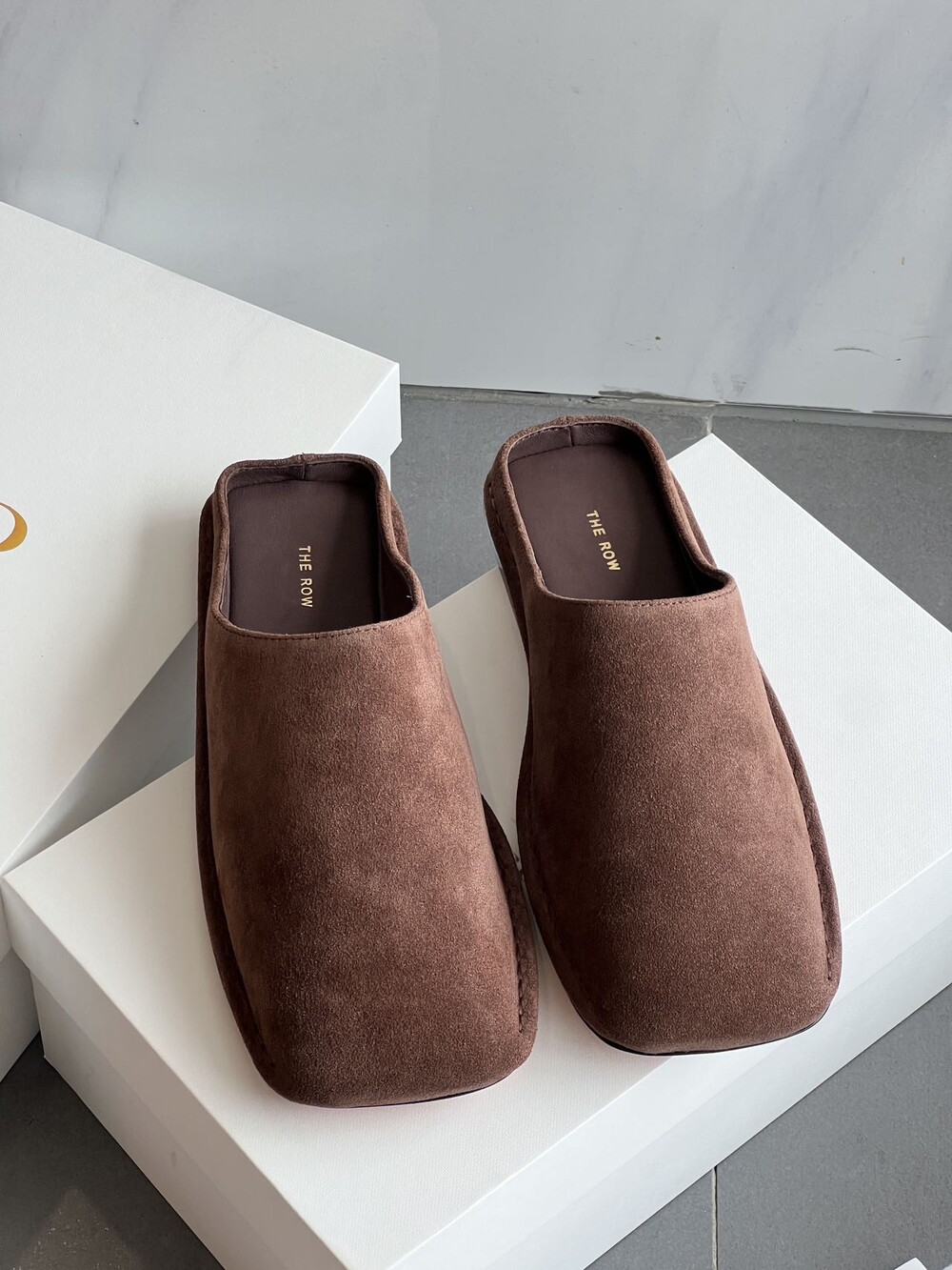 수작업으로 제작한 부드러운 카프스킨 스웨이드 소재의 슬립온 슈즈. 스퀘어 토, 겉면의 스티치 디테일, 부드러운 나파 가죽 소재의 안감, 가죽 밑창.