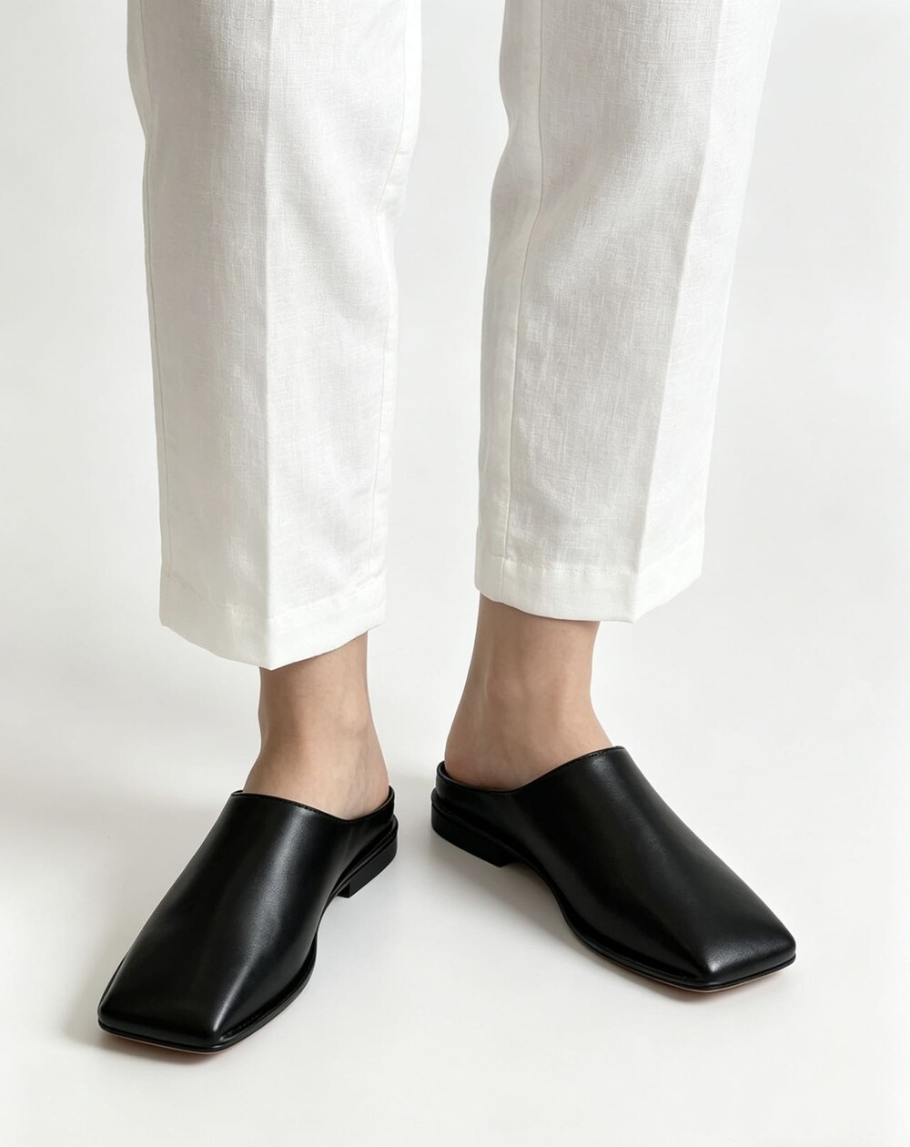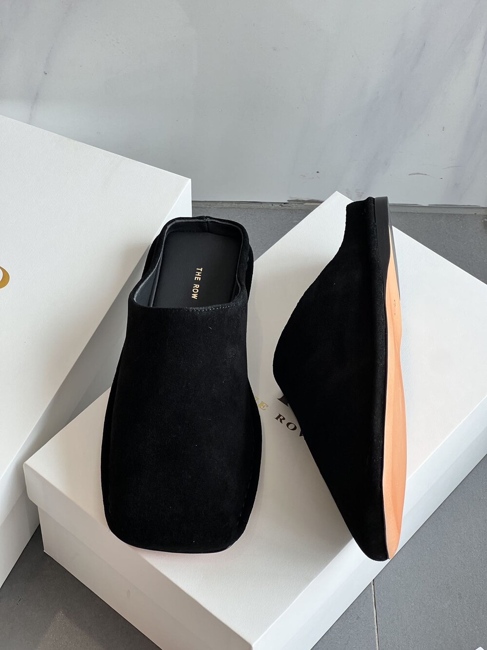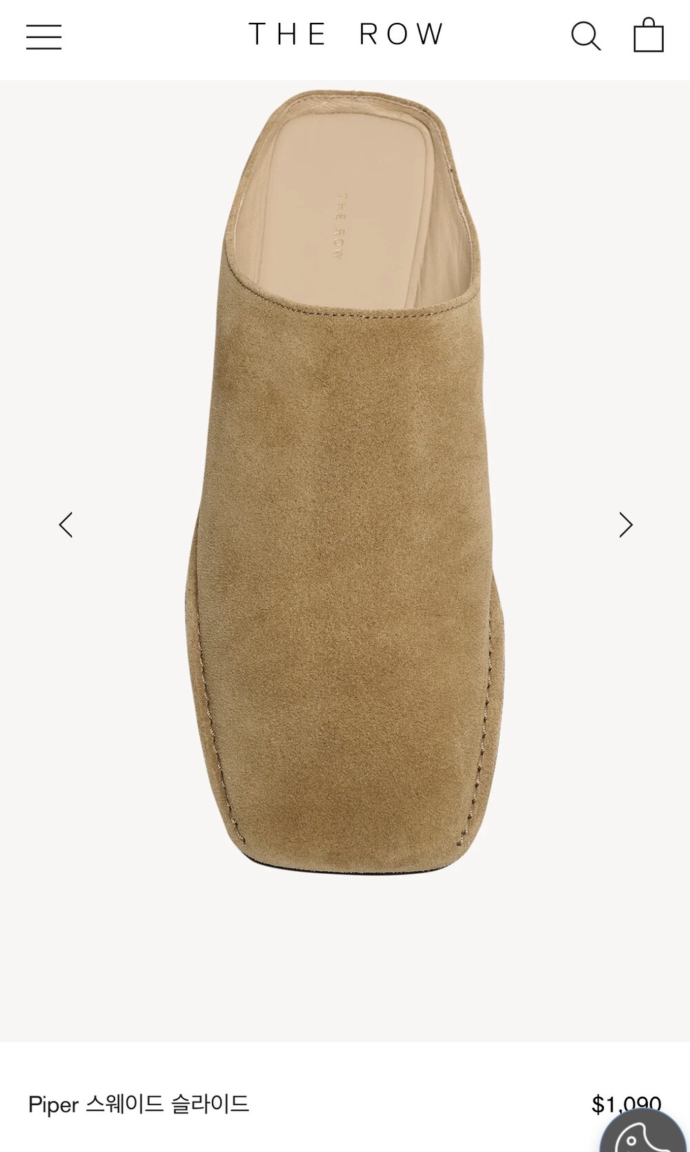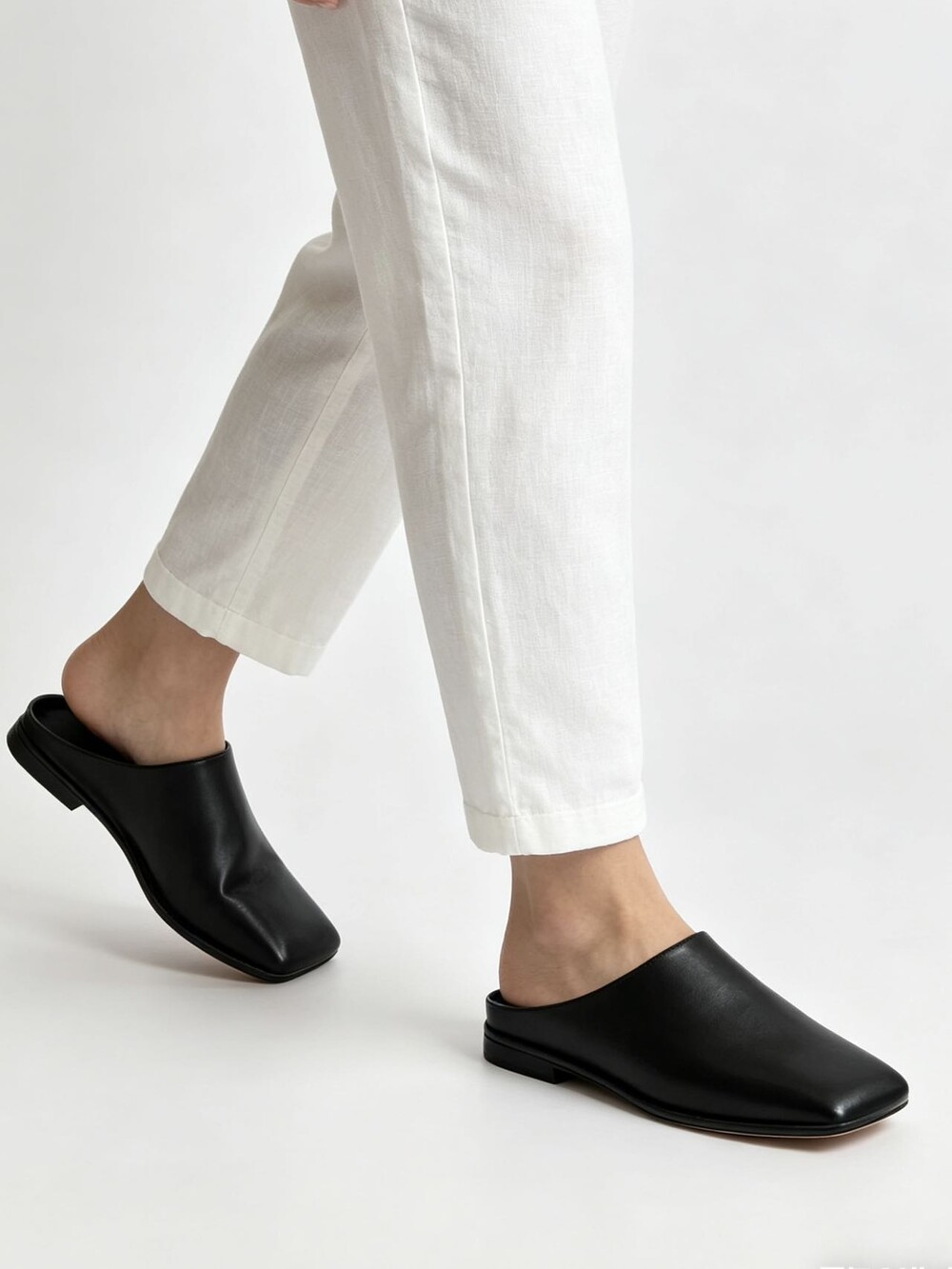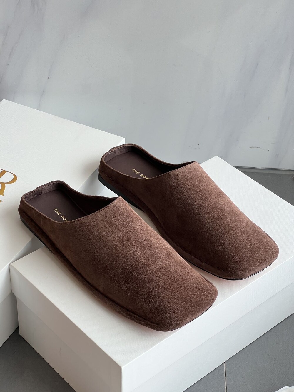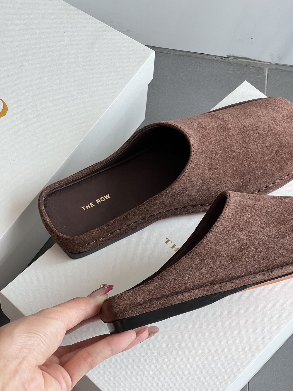 수작업으로 제작한 부드러운 카프스킨 스웨이드 소재의 슬립온 슈즈. 스퀘어 토, 겉면의 스티치 디테일, 부드러운 나파 가죽 소재의 안감, 가죽 밑창.