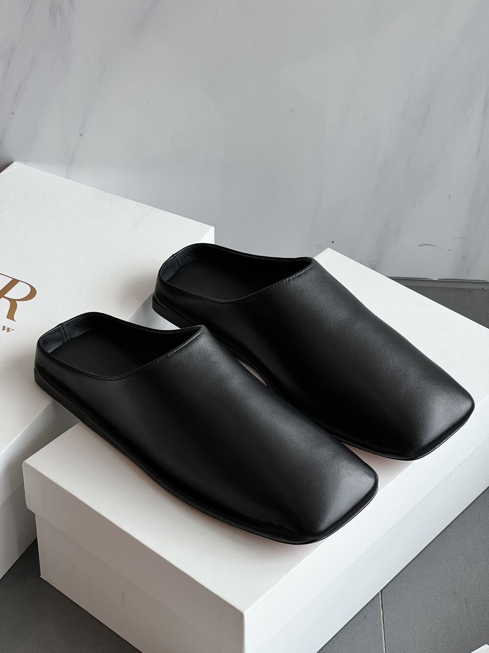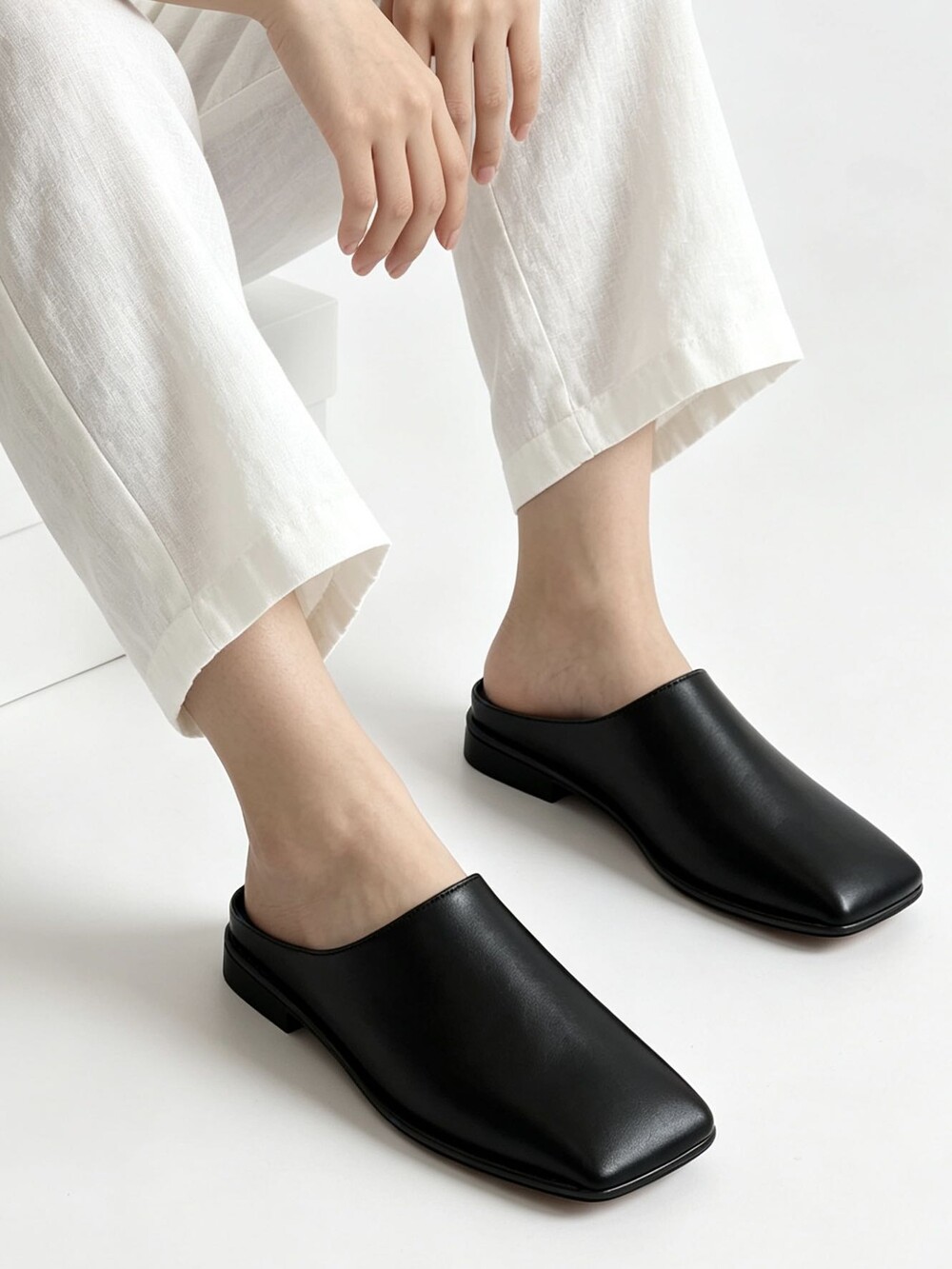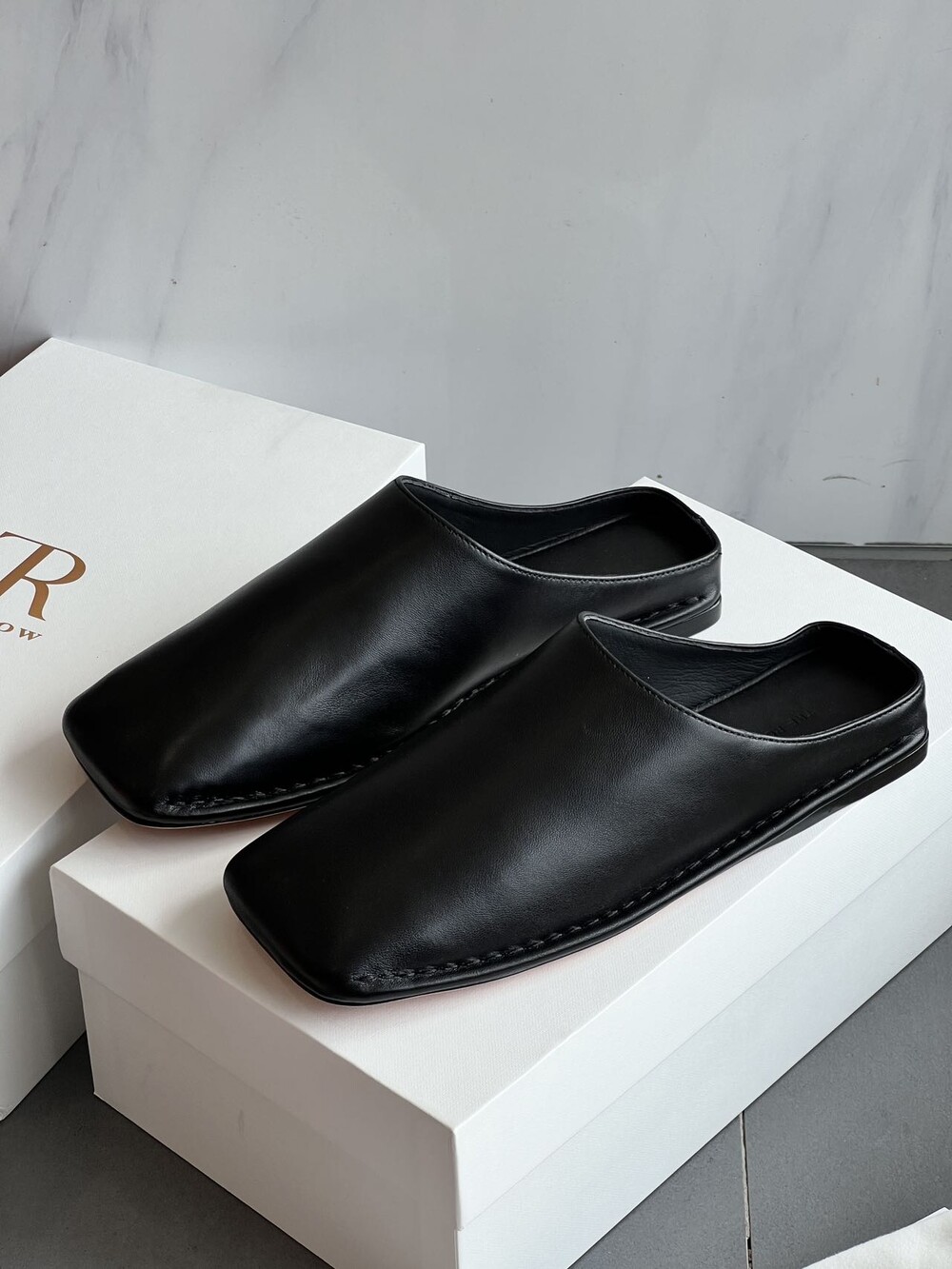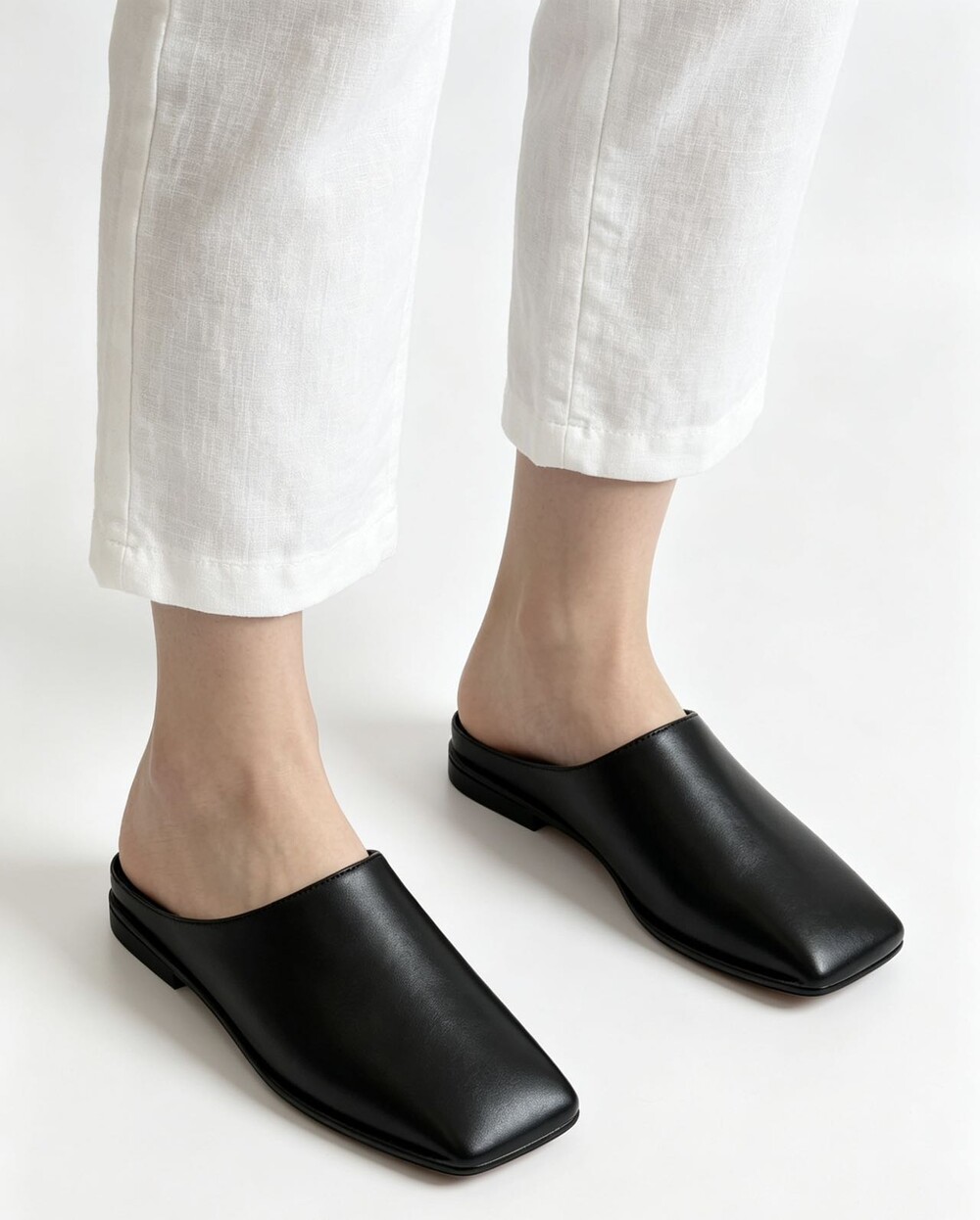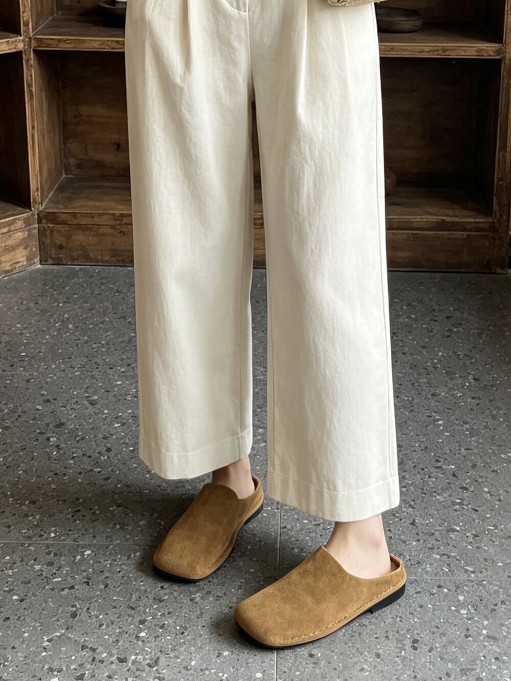 수작업으로 제작한 부드러운 카프스킨 스웨이드 소재의 슬립온 슈즈. 스퀘어 토, 겉면의 스티치 디테일, 부드러운 나파 가죽 소재의 안감, 가죽 밑창.