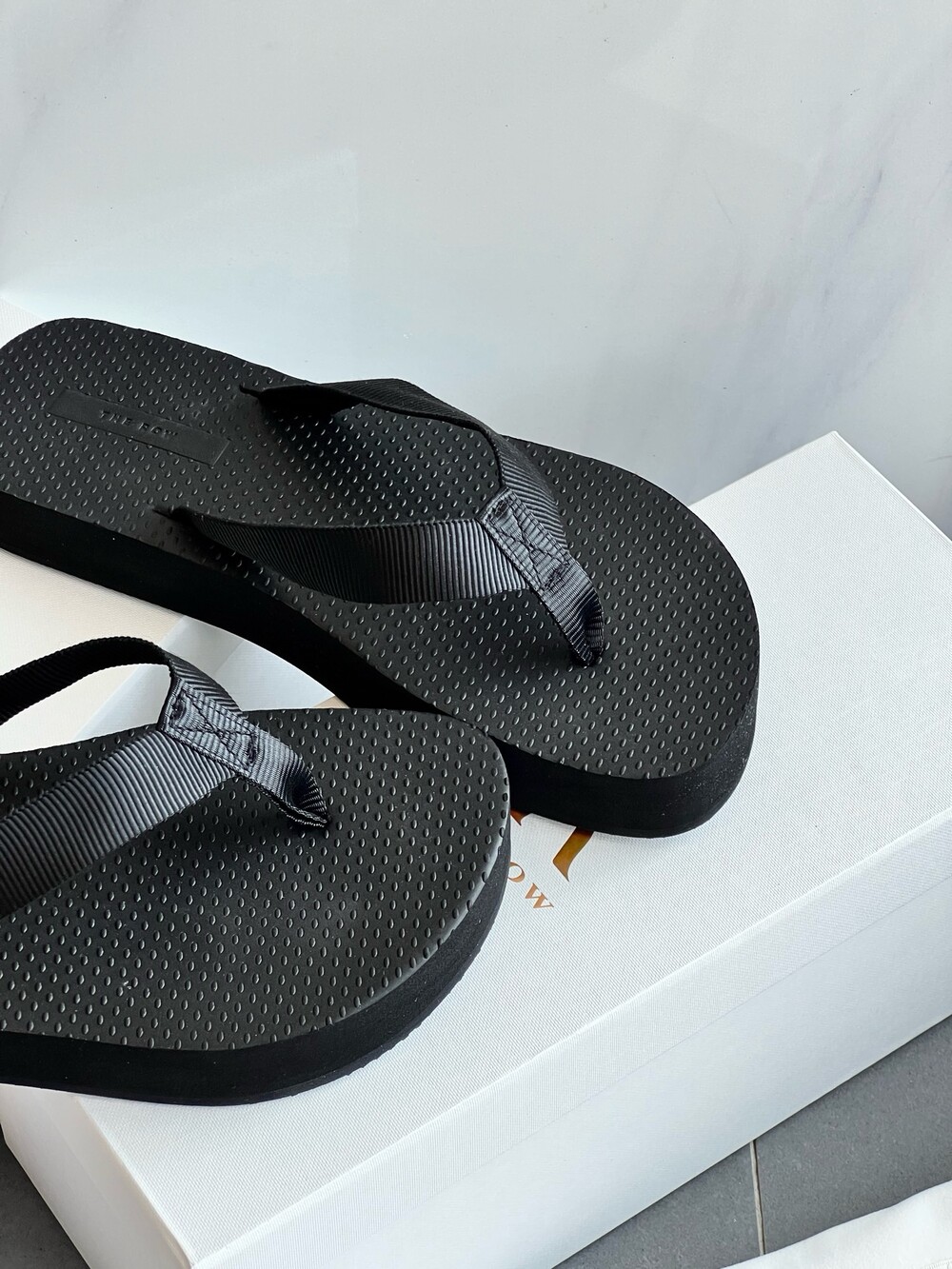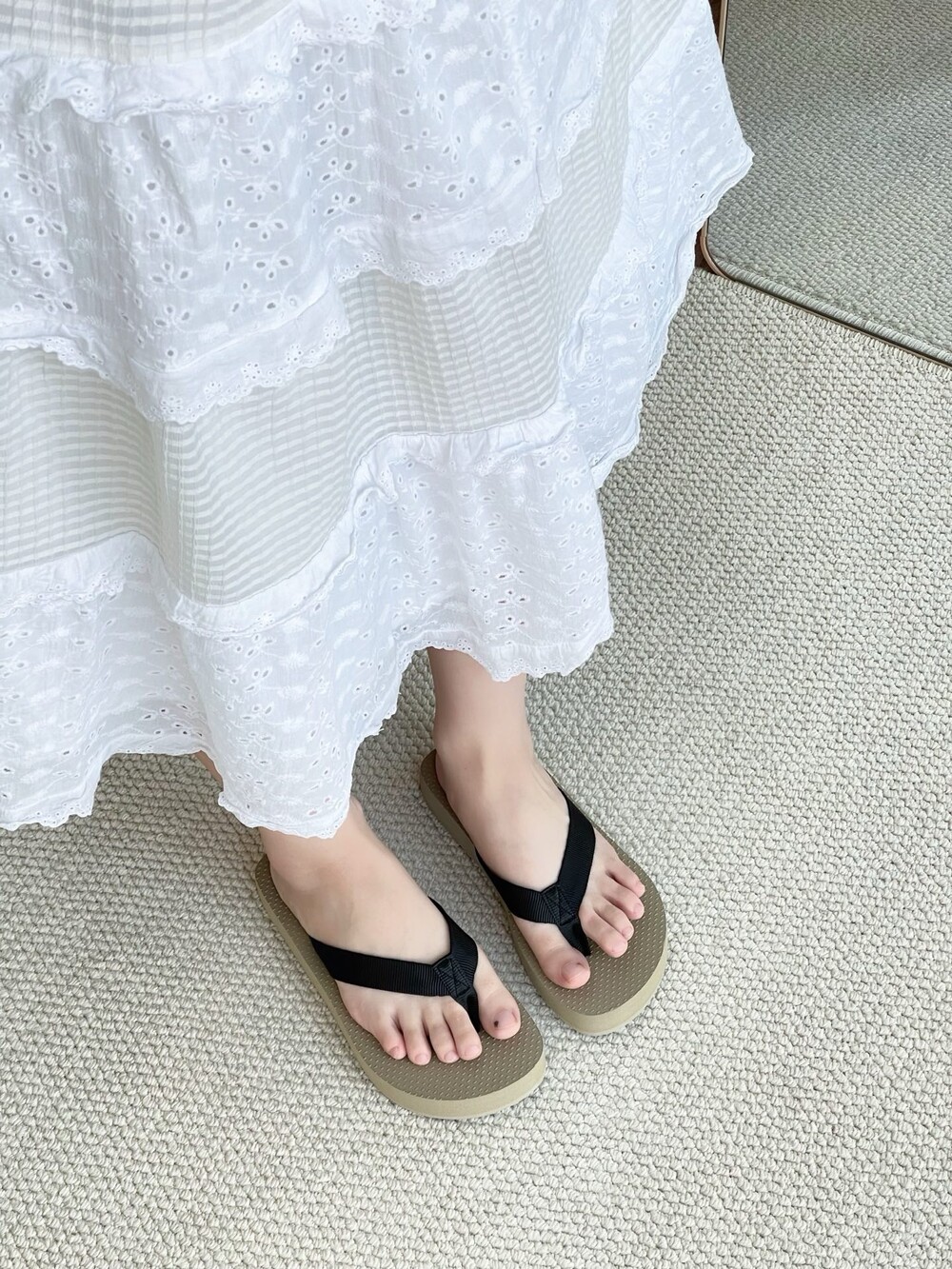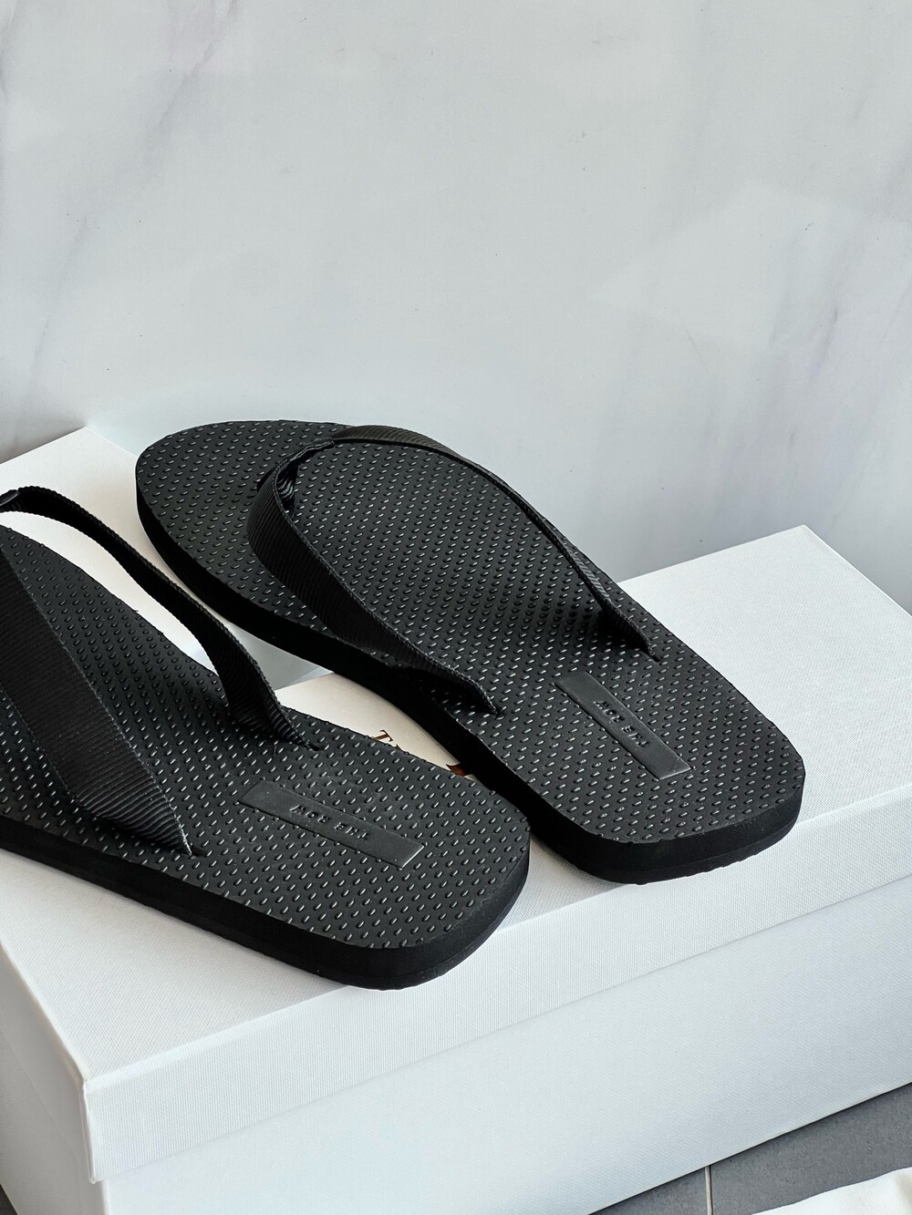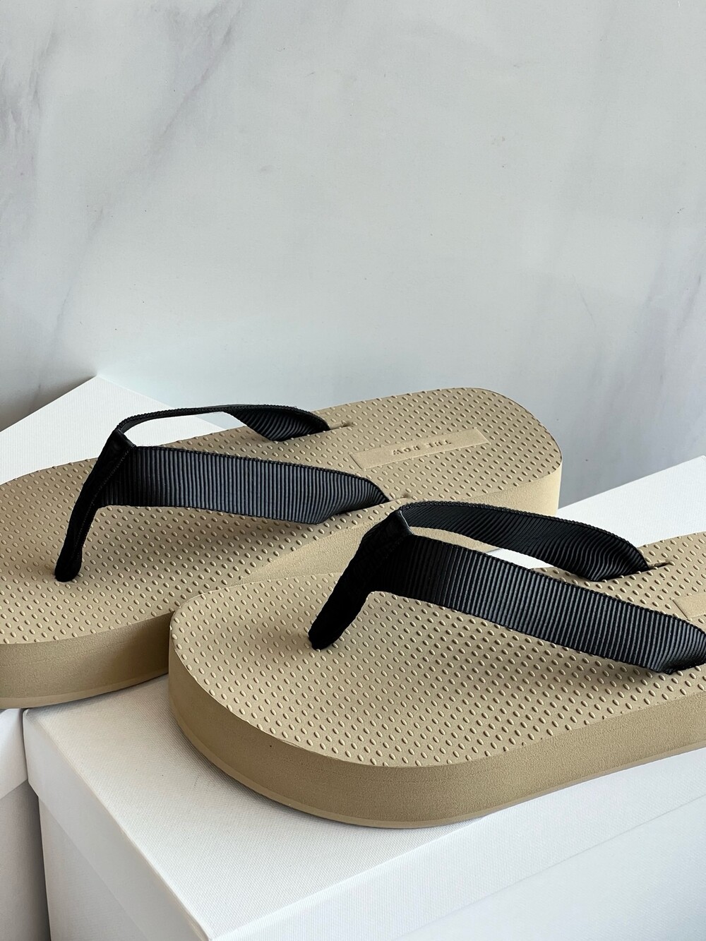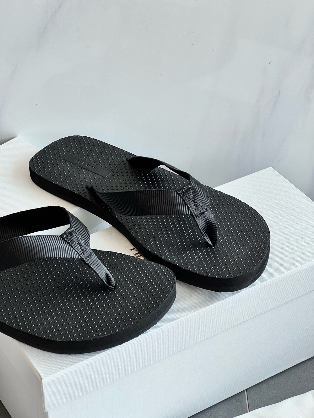 코튼 그로그랭 소재의 활용도 높은 플립플랍 샌들. 질감이 있는 풋베드와 가벼운 고무 밑창.