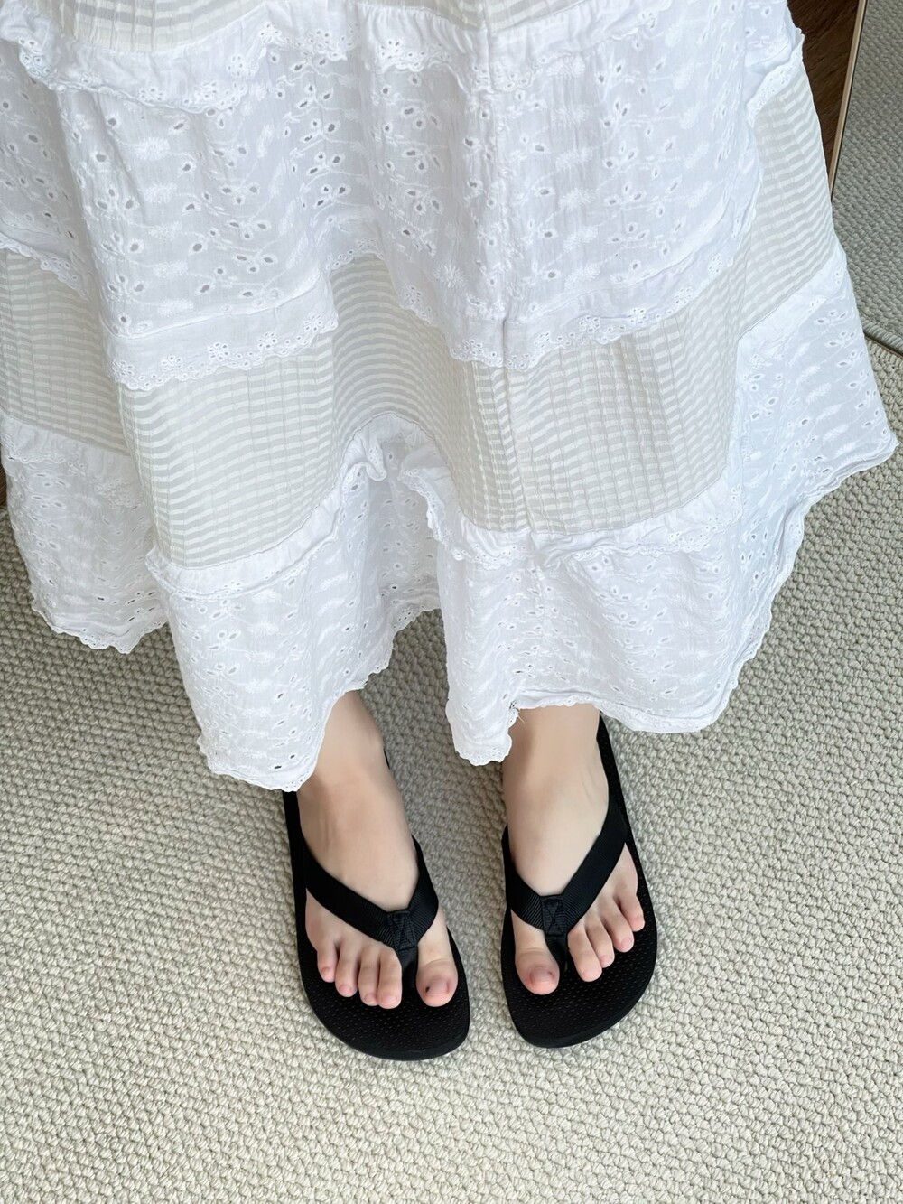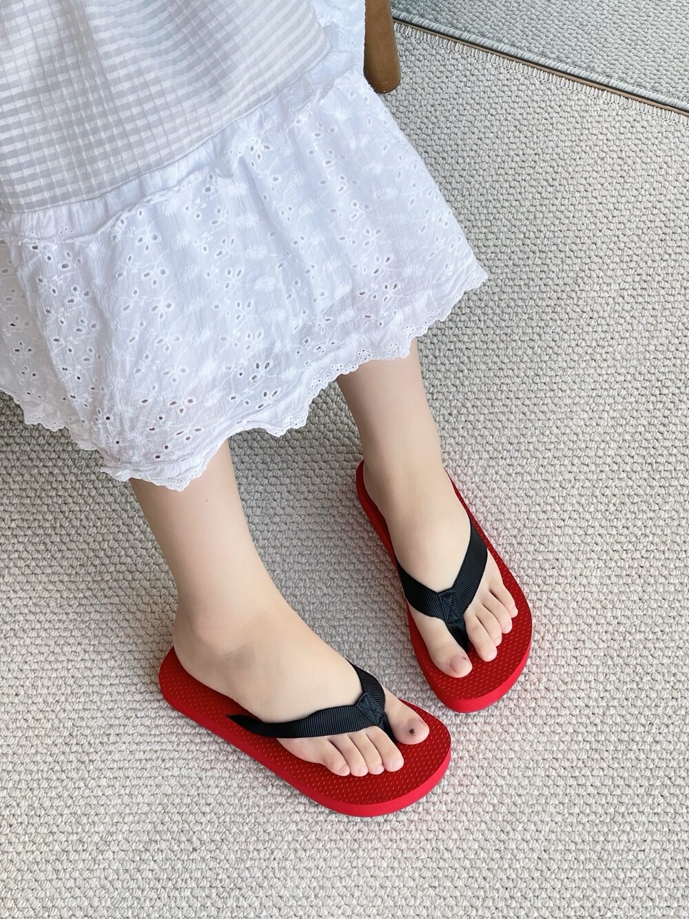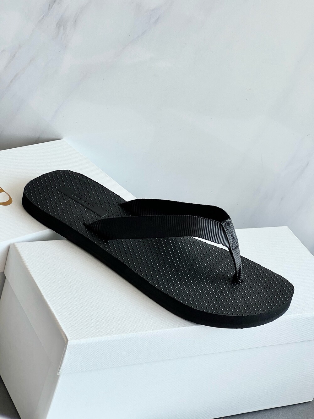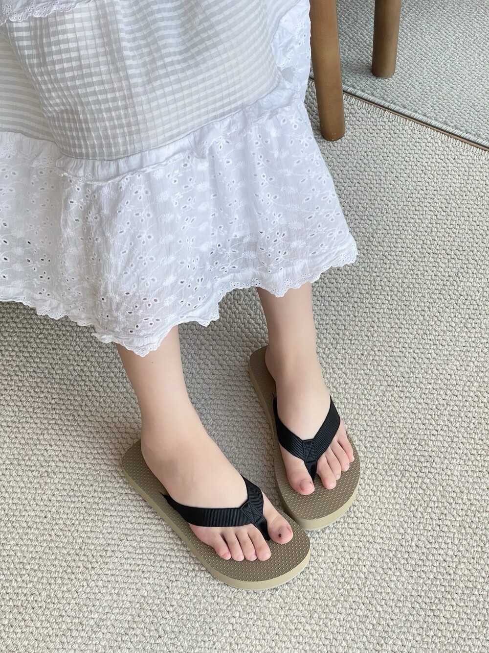 코튼 그로그랭 소재의 활용도 높은 플립플랍 샌들. 질감이 있는 풋베드와 가벼운 고무 밑창.
