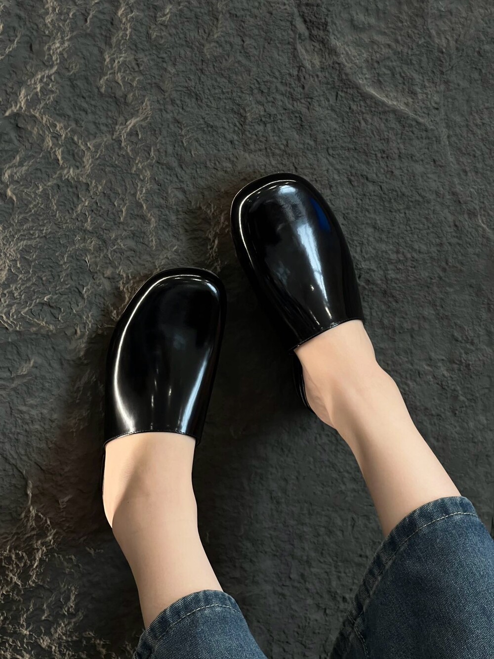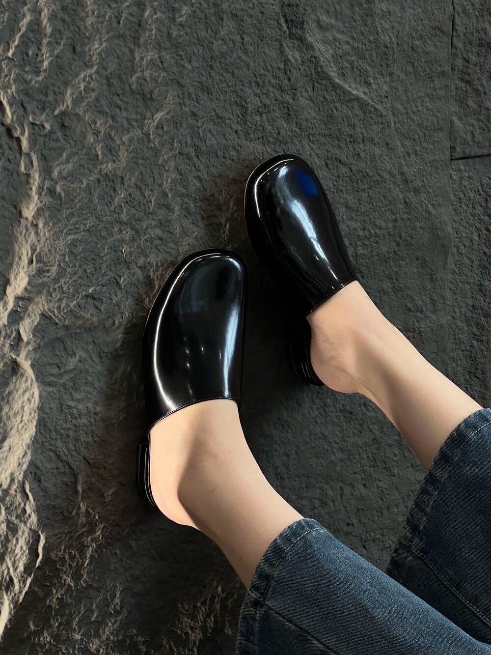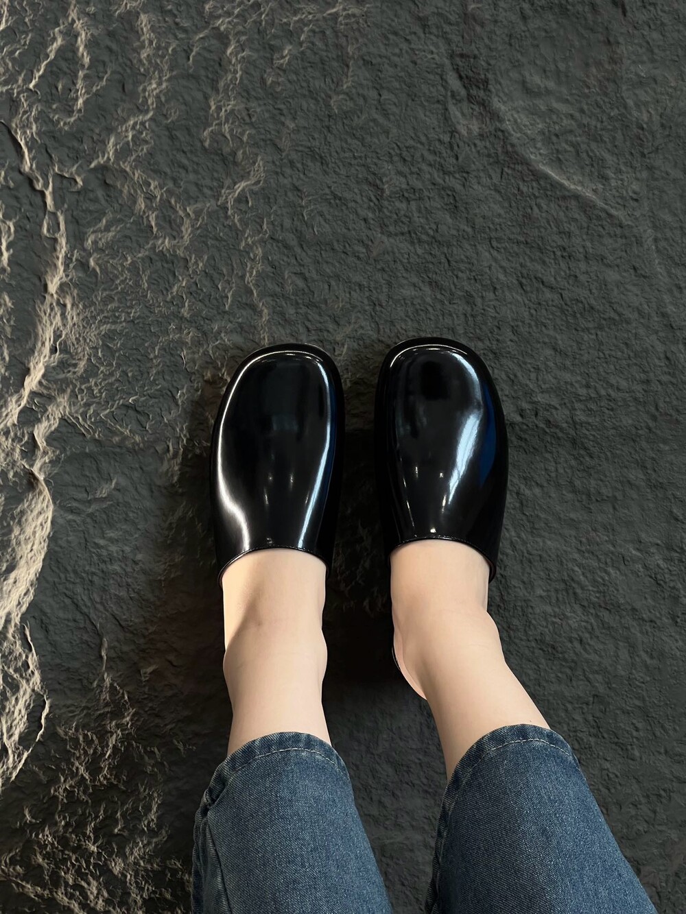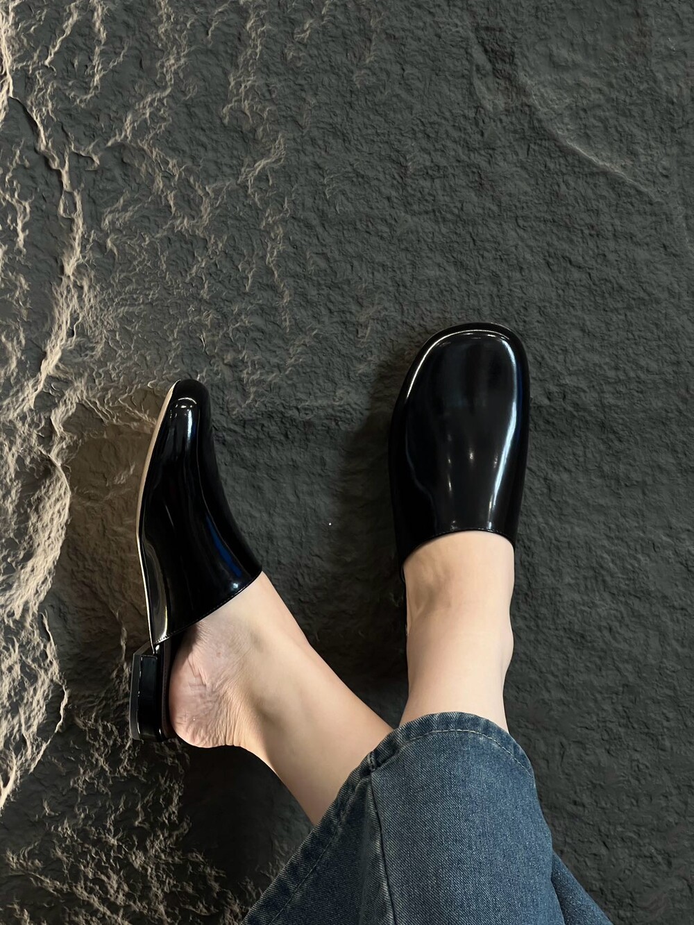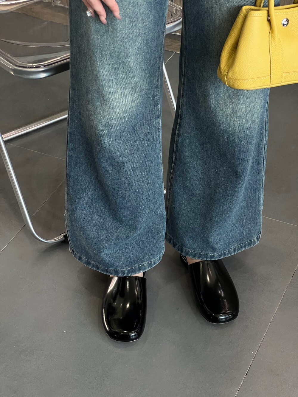 광택 페이턴트 가죽 소재의 간결한 슬립온 슈즈로, 스퀘어 토, 스택형 힐, 고무 밑창이 특징입니다.