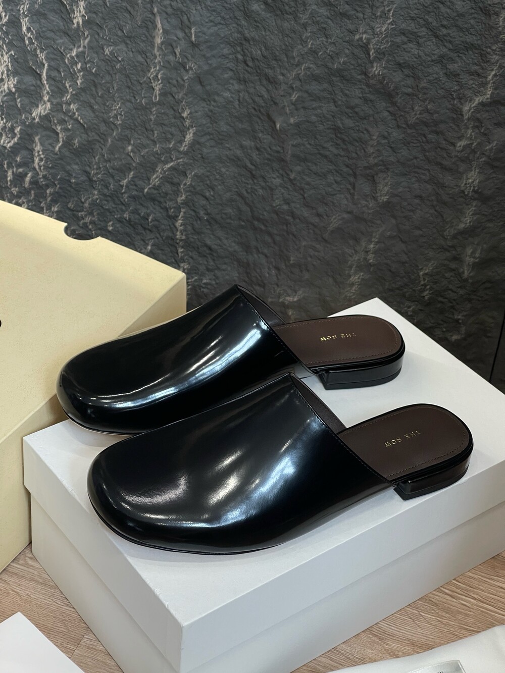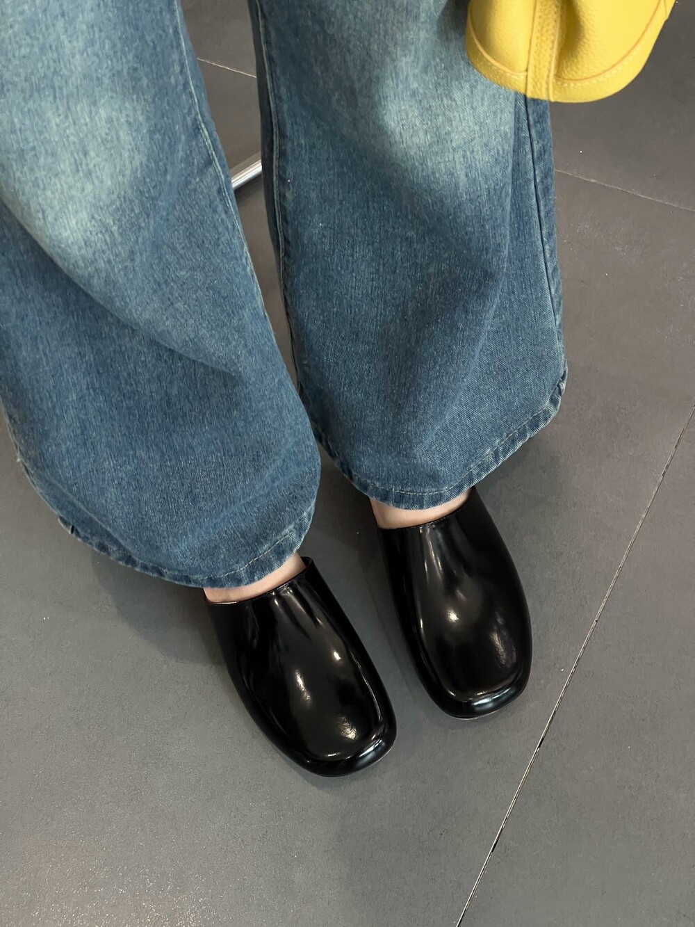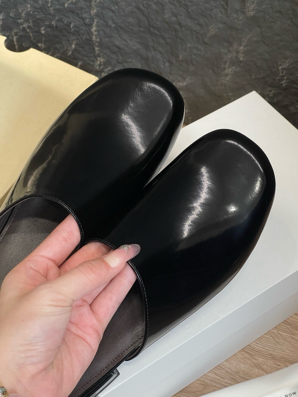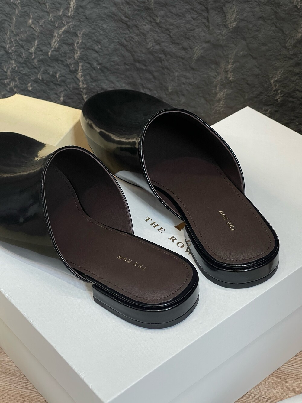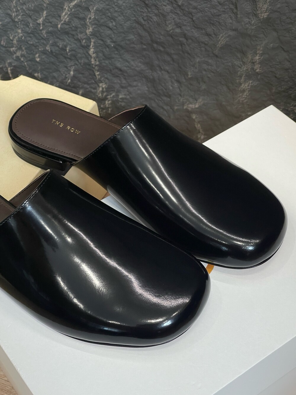 광택 페이턴트 가죽 소재의 간결한 슬립온 슈즈로, 스퀘어 토, 스택형 힐, 고무 밑창이 특징입니다.