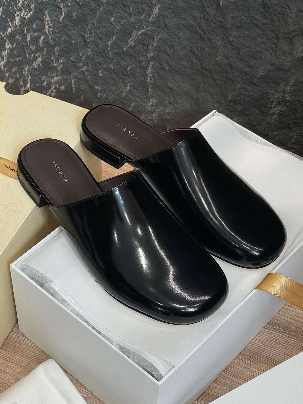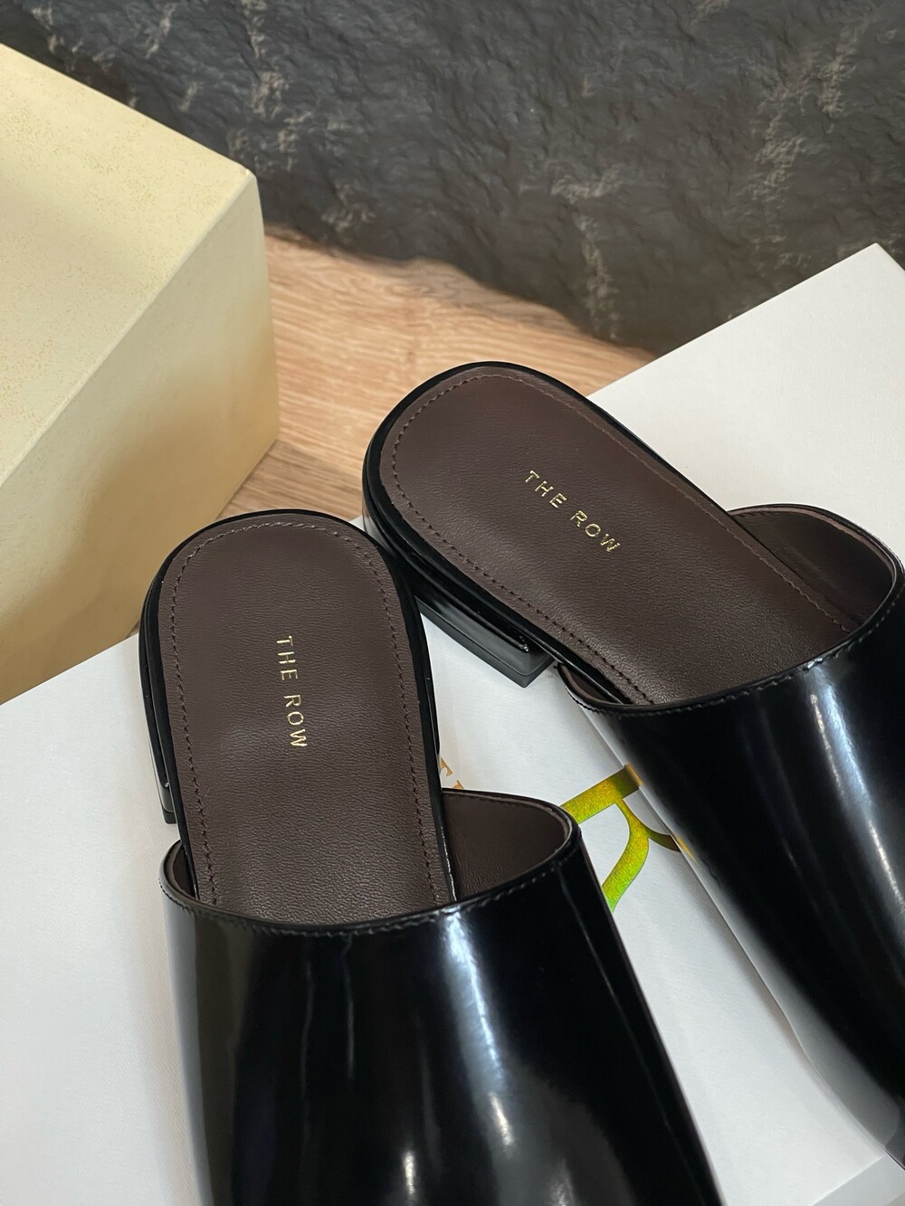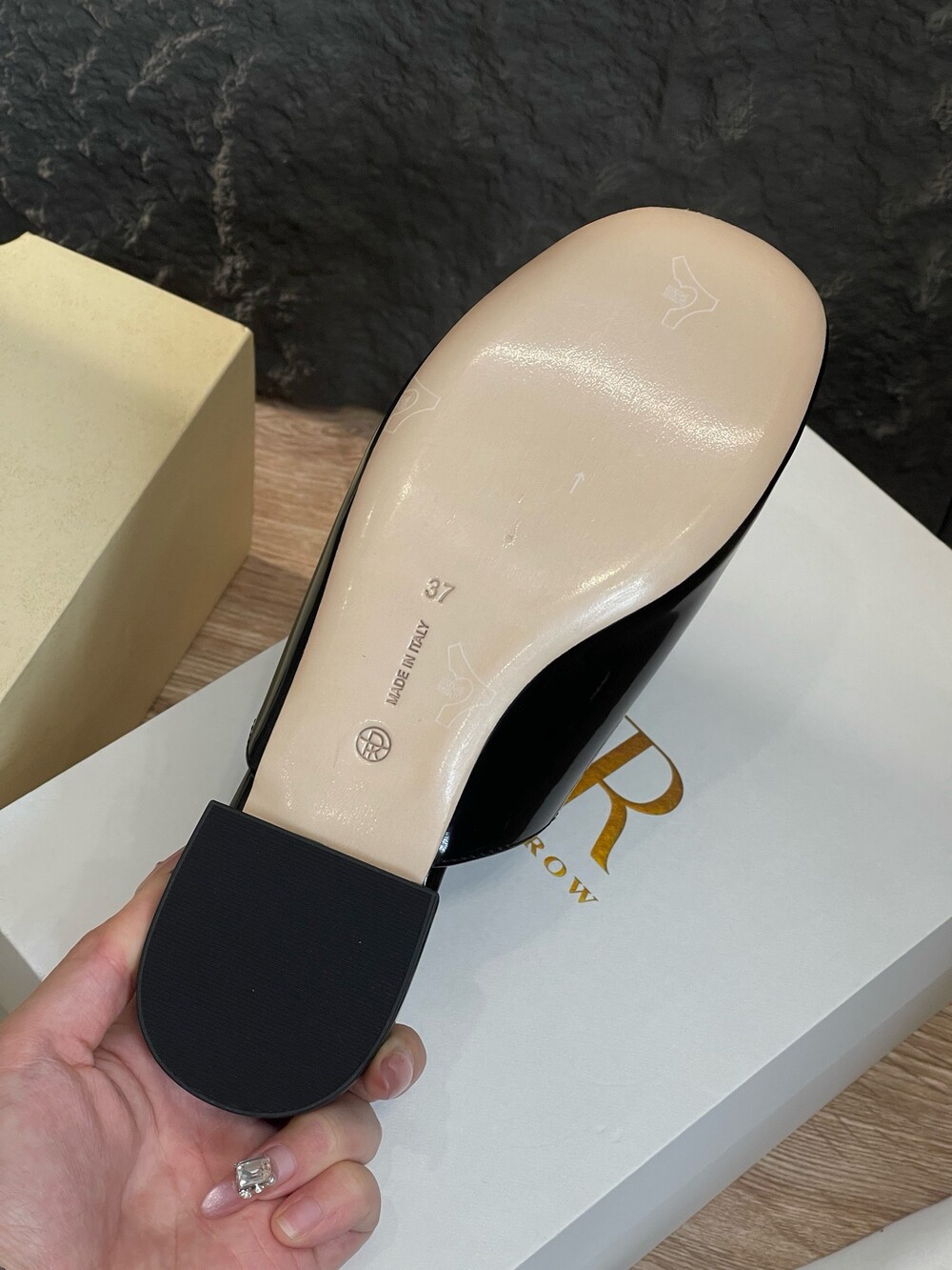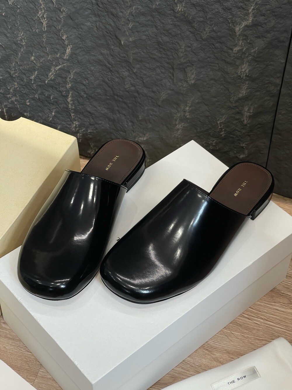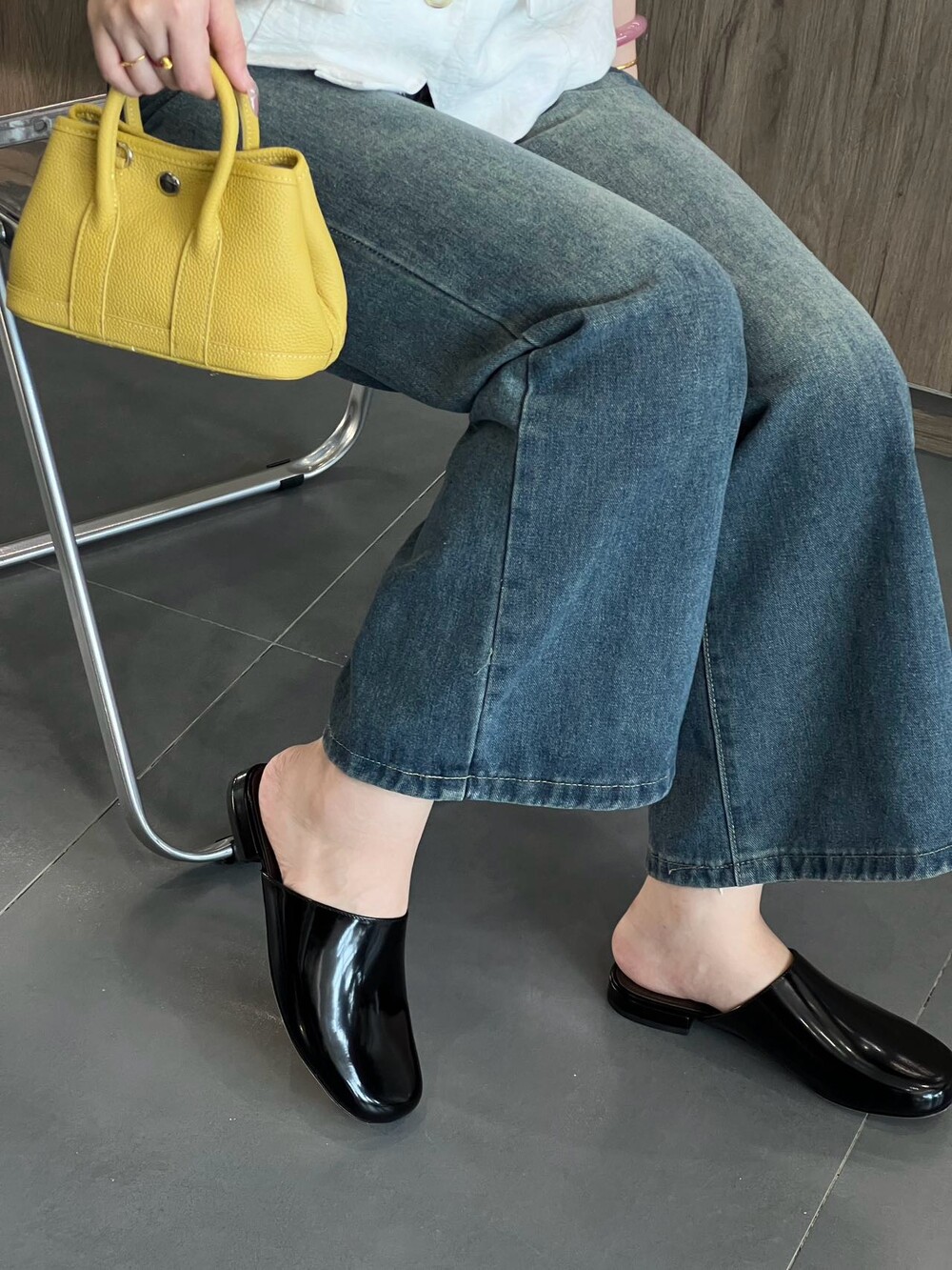 광택 페이턴트 가죽 소재의 간결한 슬립온 슈즈로, 스퀘어 토, 스택형 힐, 고무 밑창이 특징입니다.