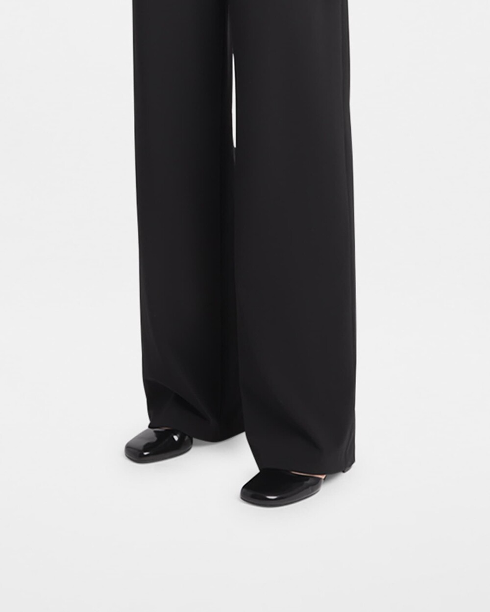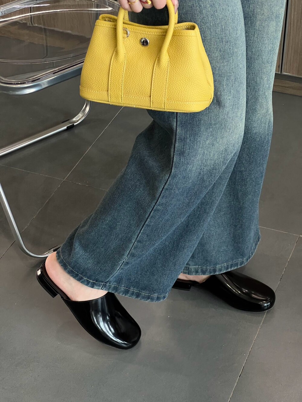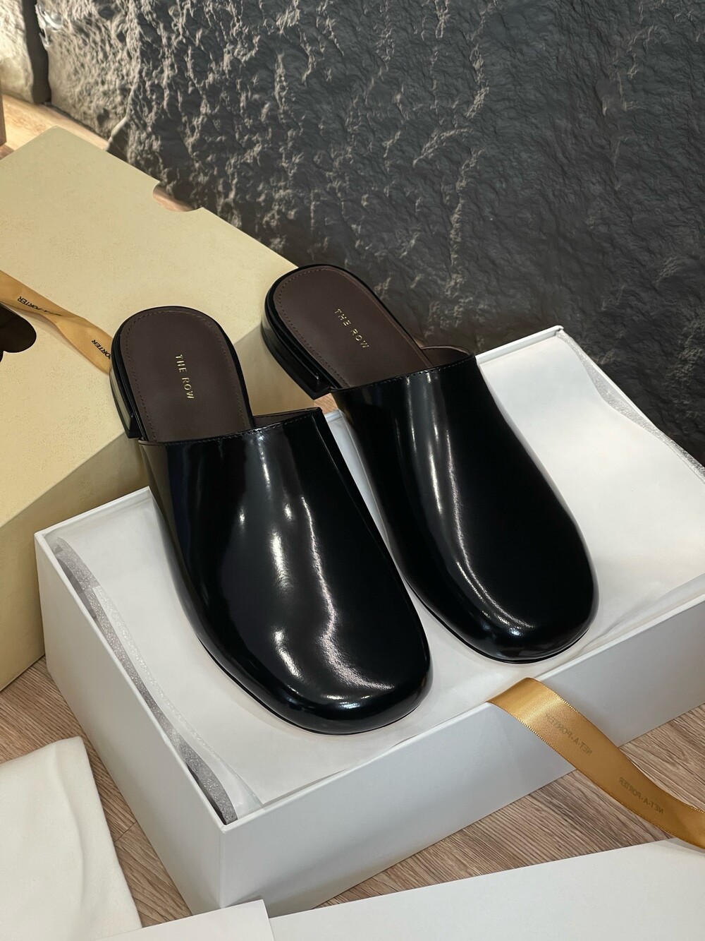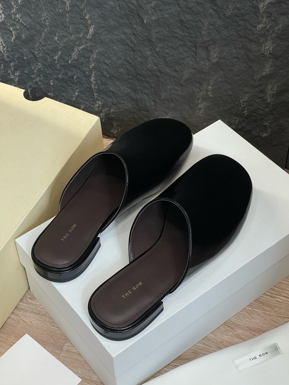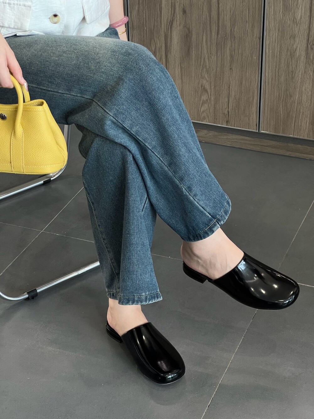 광택 페이턴트 가죽 소재의 간결한 슬립온 슈즈로, 스퀘어 토, 스택형 힐, 고무 밑창이 특징입니다.