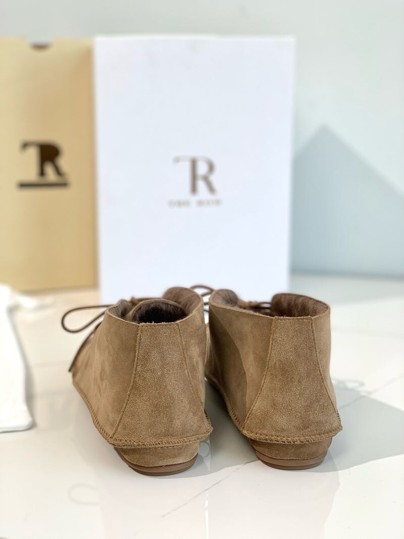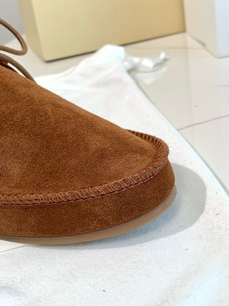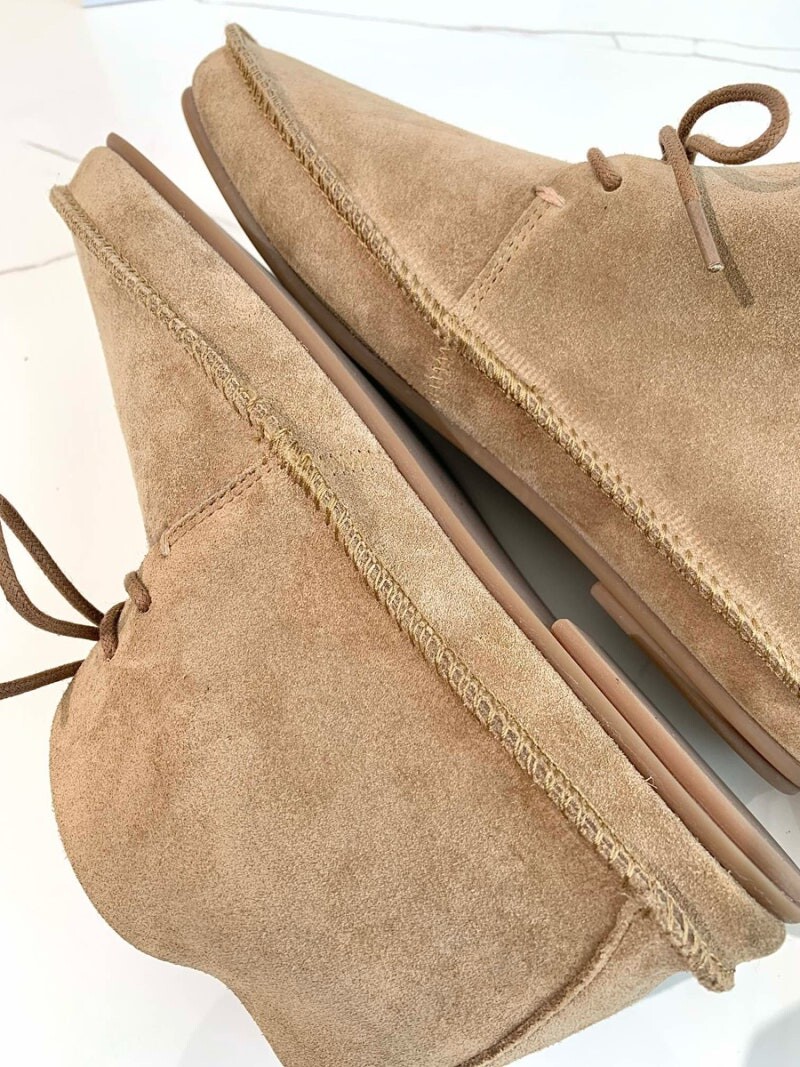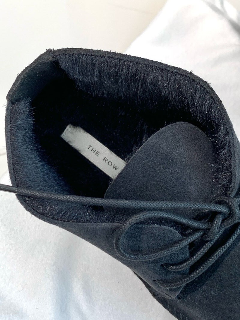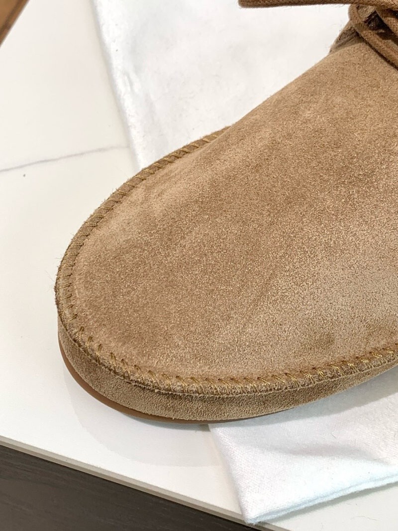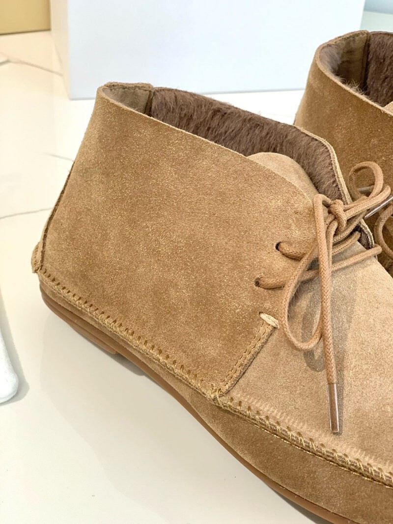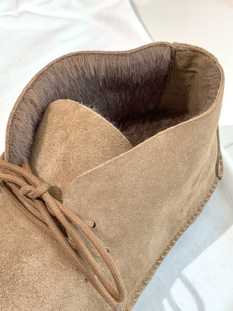 왁스 마감된 코튼 레이스와 고무로 마감된 솔을 갖춘 시어링 안감을 댄 스웨이드 소재의 디컨스트럭티드 레이스업 슈즈.