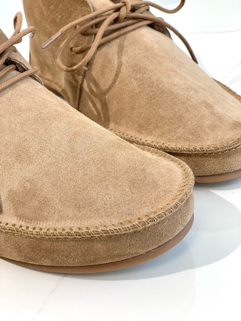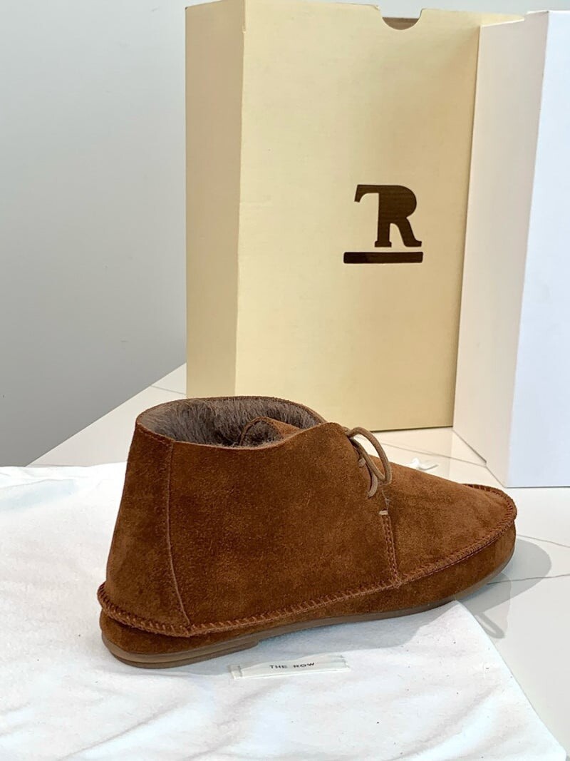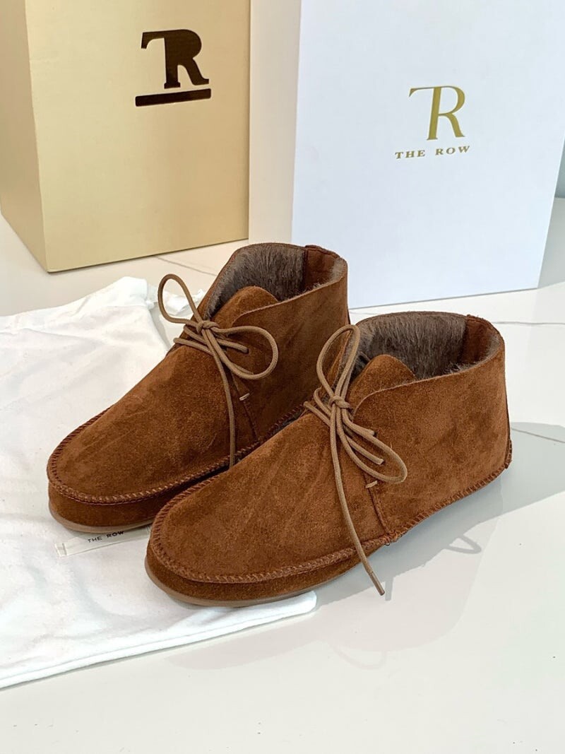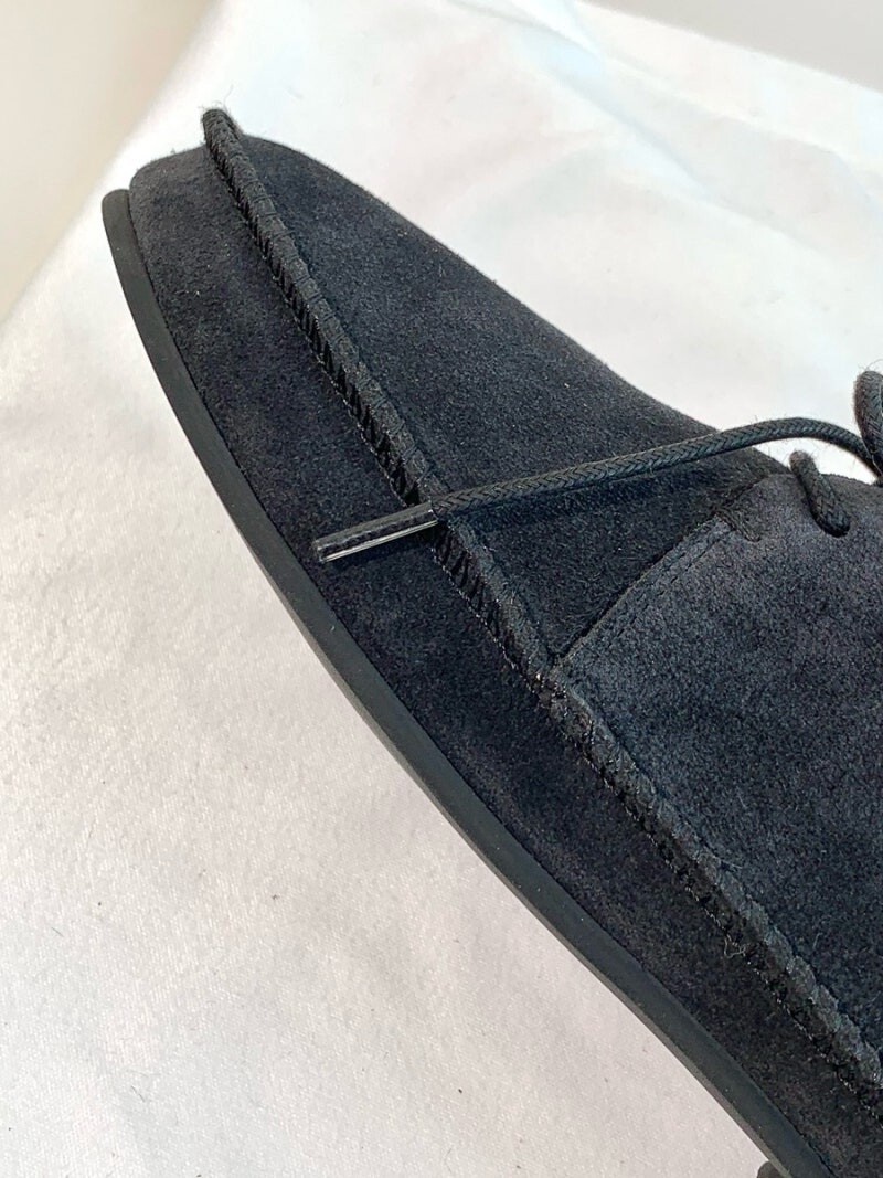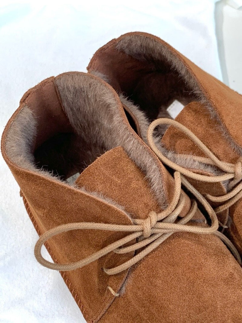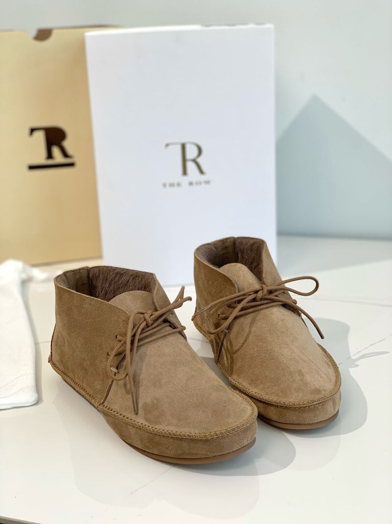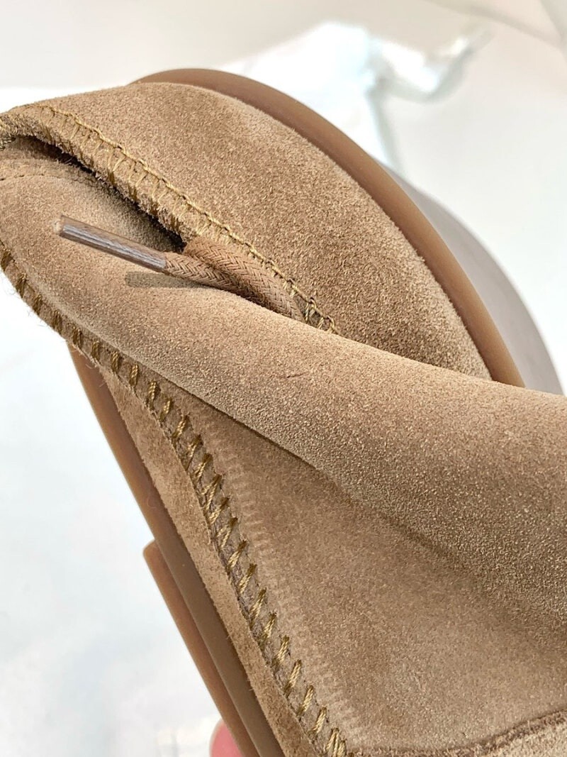 왁스 마감된 코튼 레이스와 고무로 마감된 솔을 갖춘 시어링 안감을 댄 스웨이드 소재의 디컨스트럭티드 레이스업 슈즈.