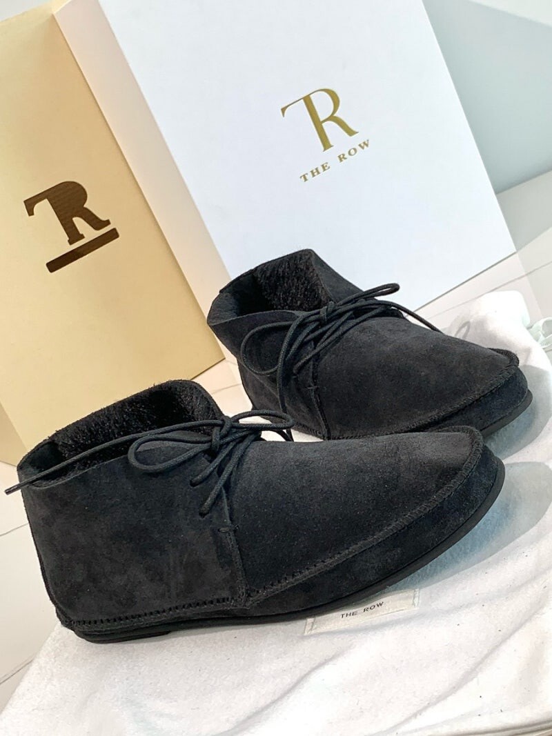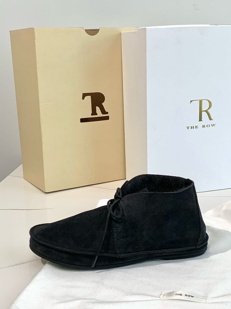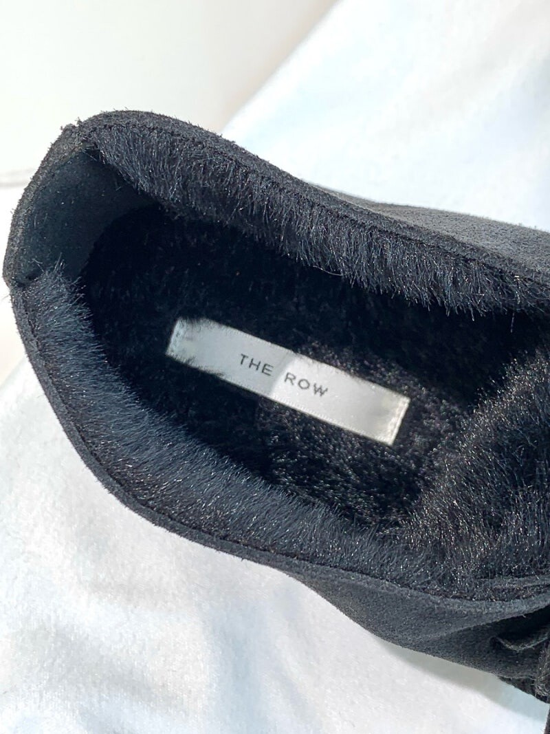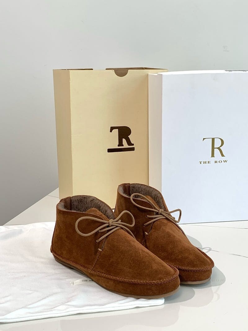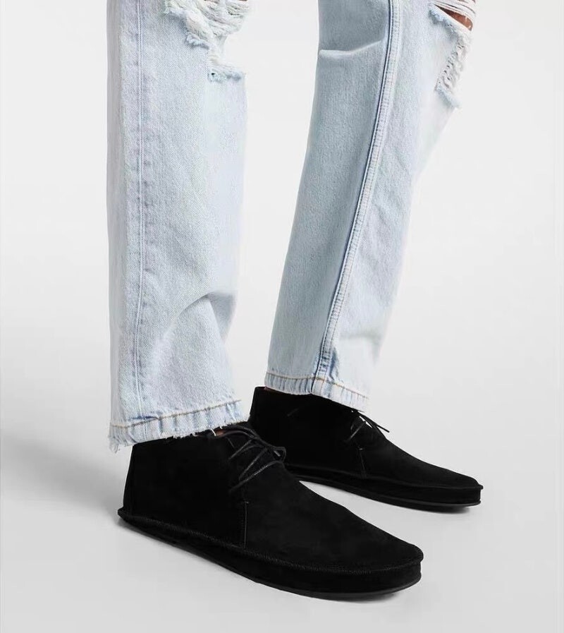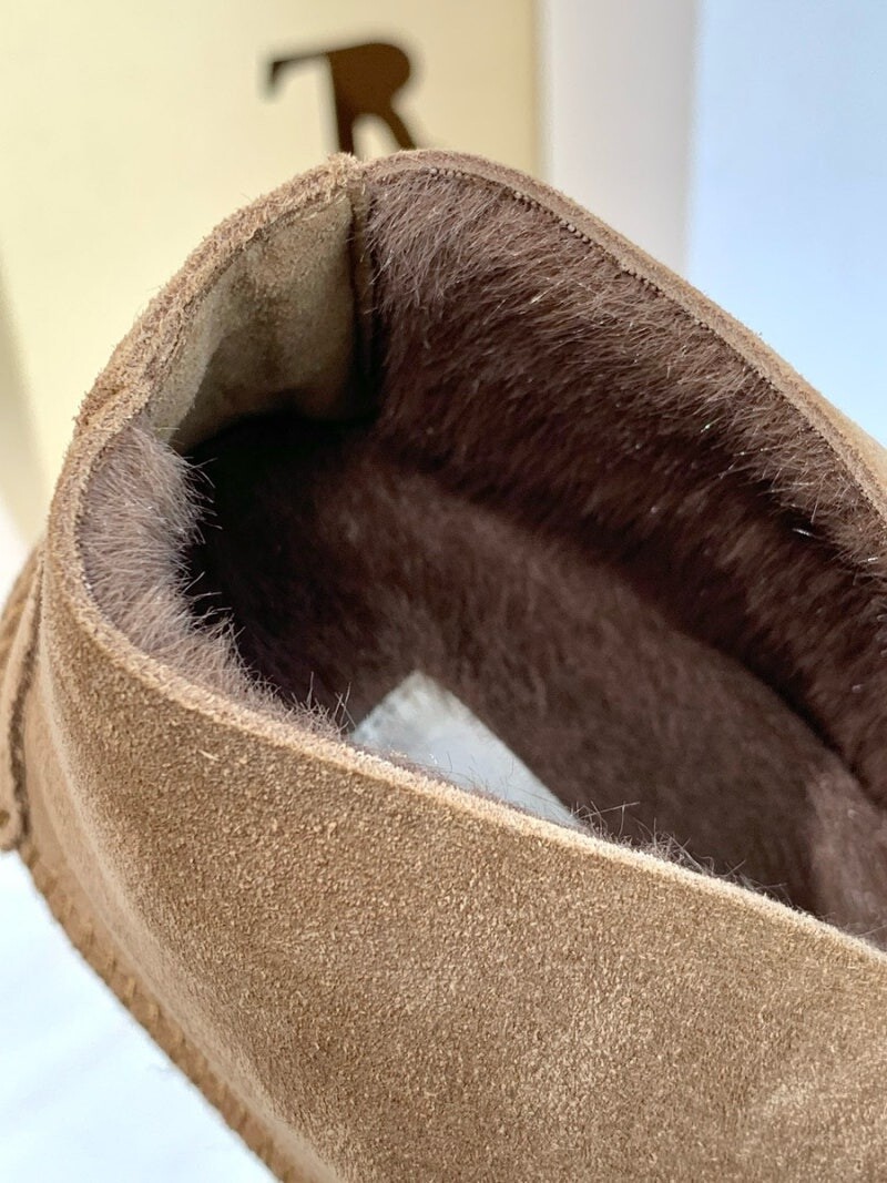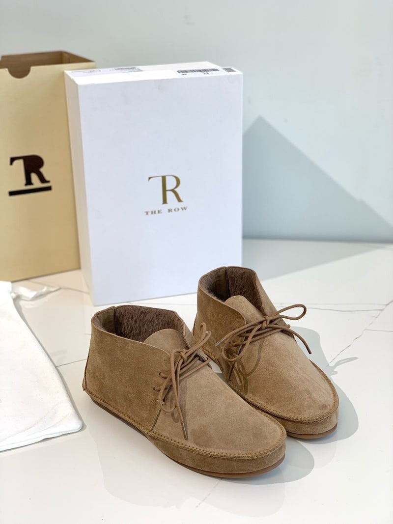 왁스 마감된 코튼 레이스와 고무로 마감된 솔을 갖춘 시어링 안감을 댄 스웨이드 소재의 디컨스트럭티드 레이스업 슈즈.