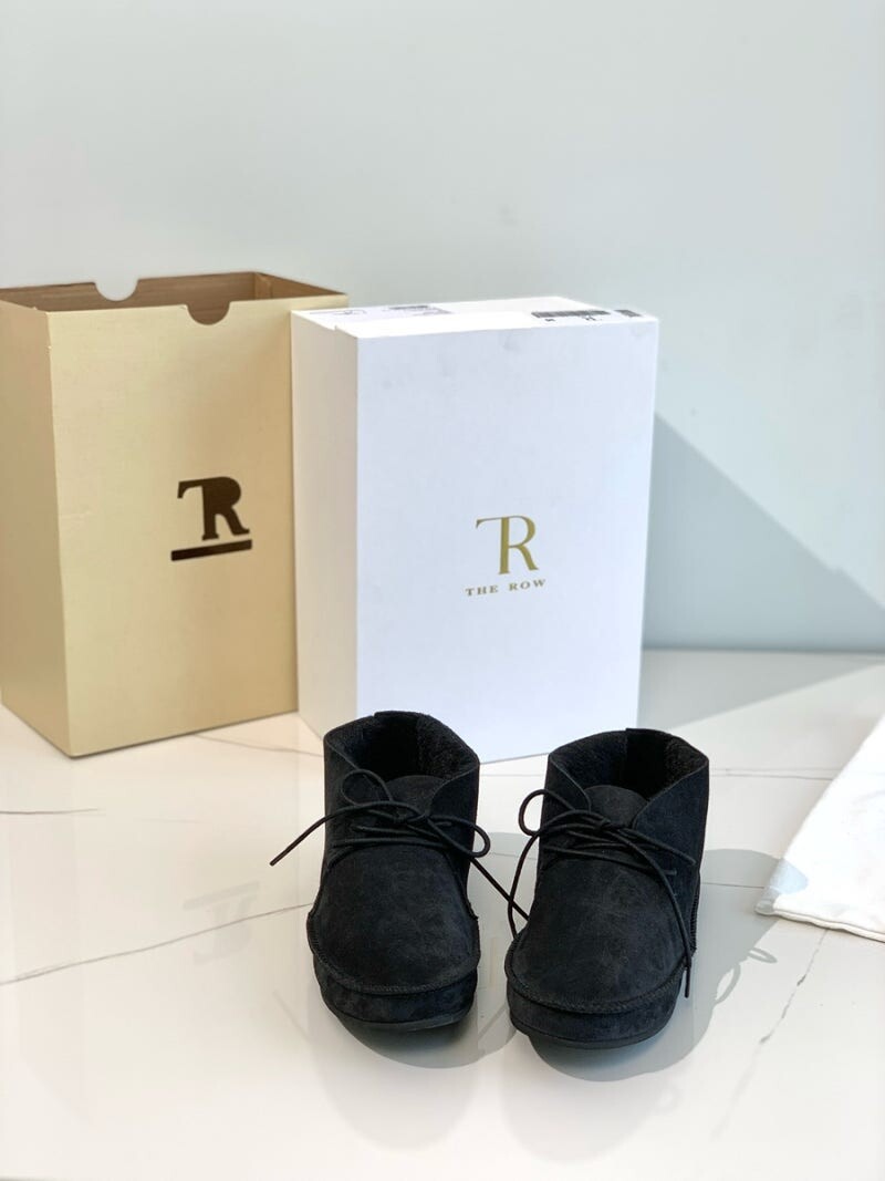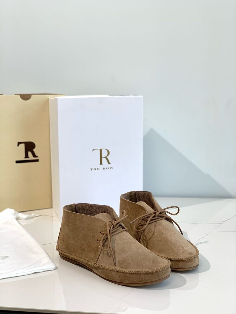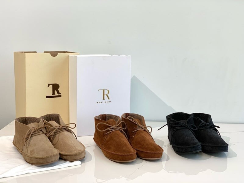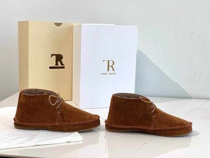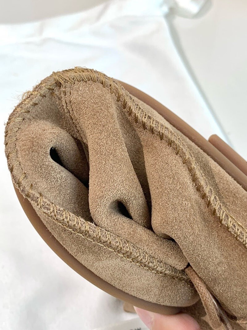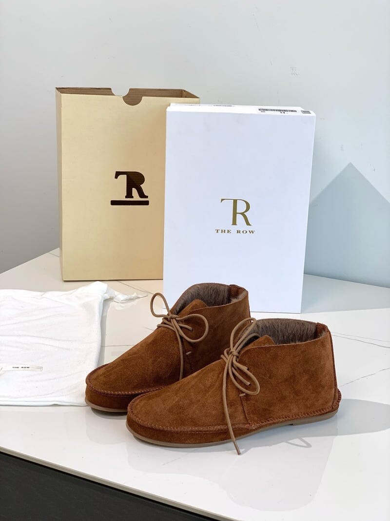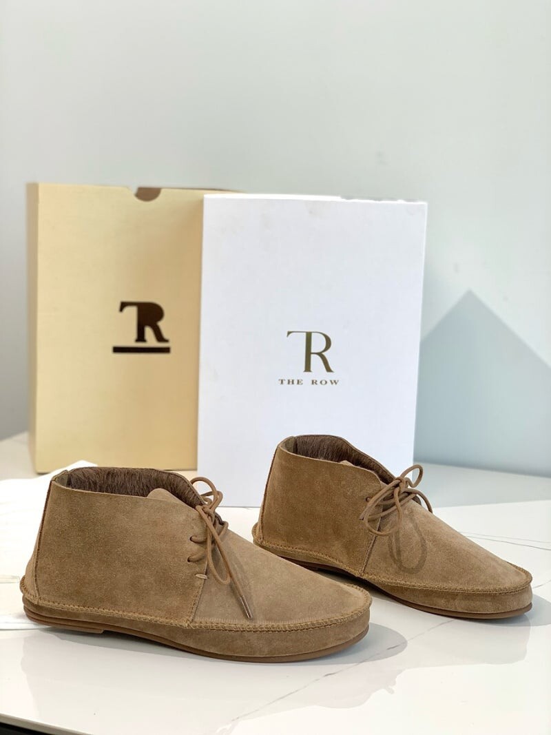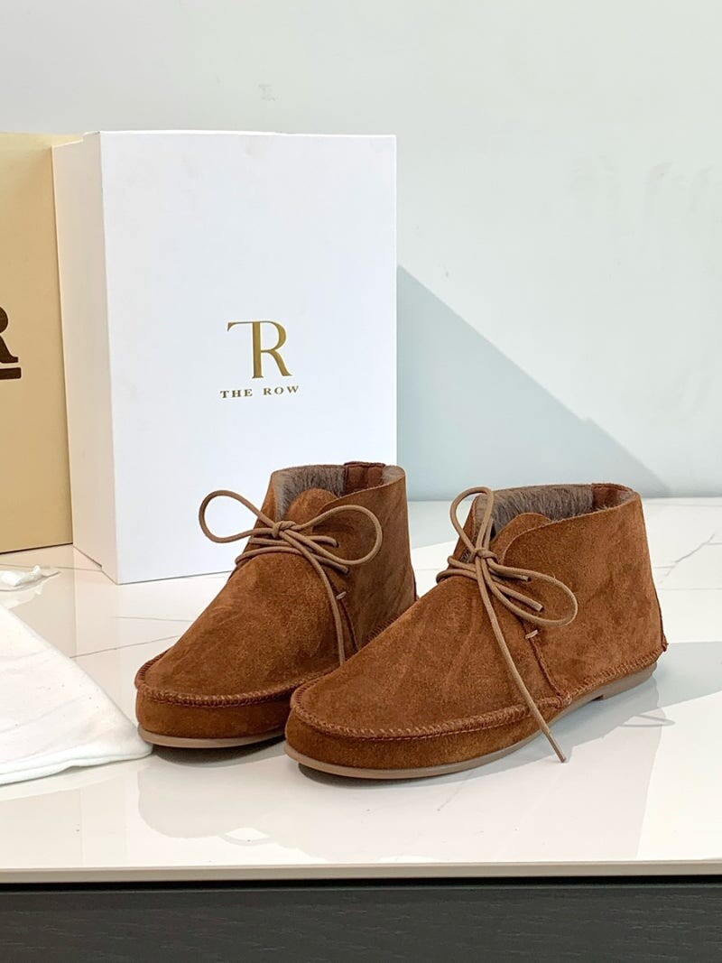 왁스 마감된 코튼 레이스와 고무로 마감된 솔을 갖춘 시어링 안감을 댄 스웨이드 소재의 디컨스트럭티드 레이스업 슈즈.