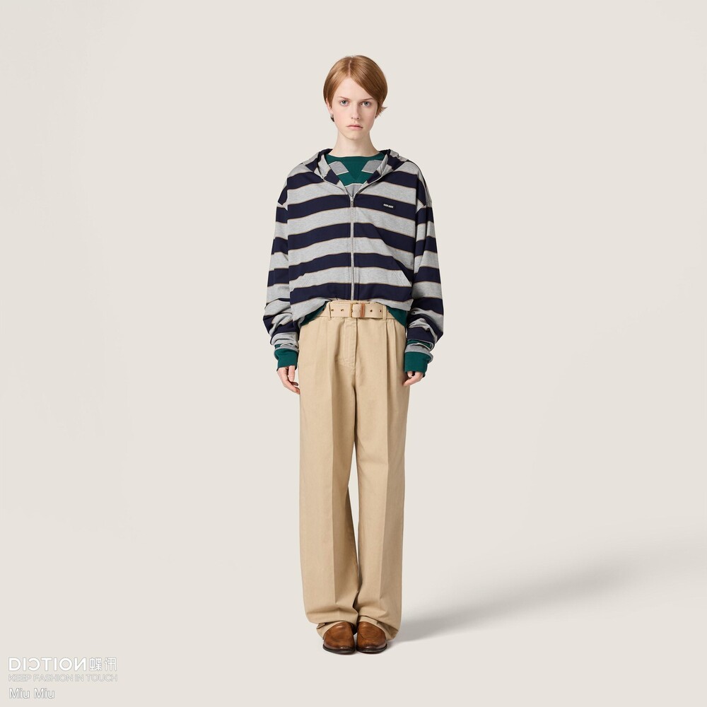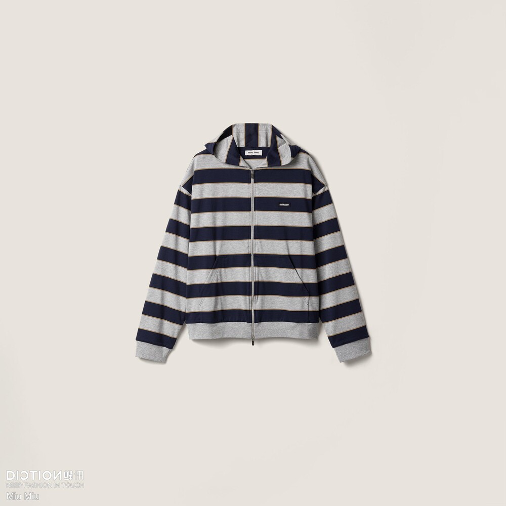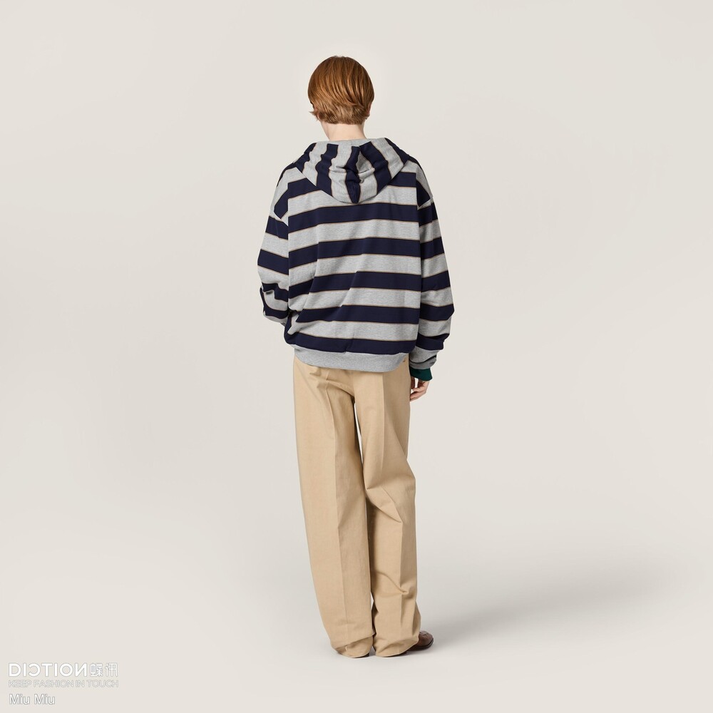 미우미우의 아이코닉한 스트라이프가 클래식한 그레이 멜란지와 컬러 대비로 재해석되어, 레이어드 룩에 이상적인 후디의 실루엣과 저지의 편안한 특성을 강조합니다.