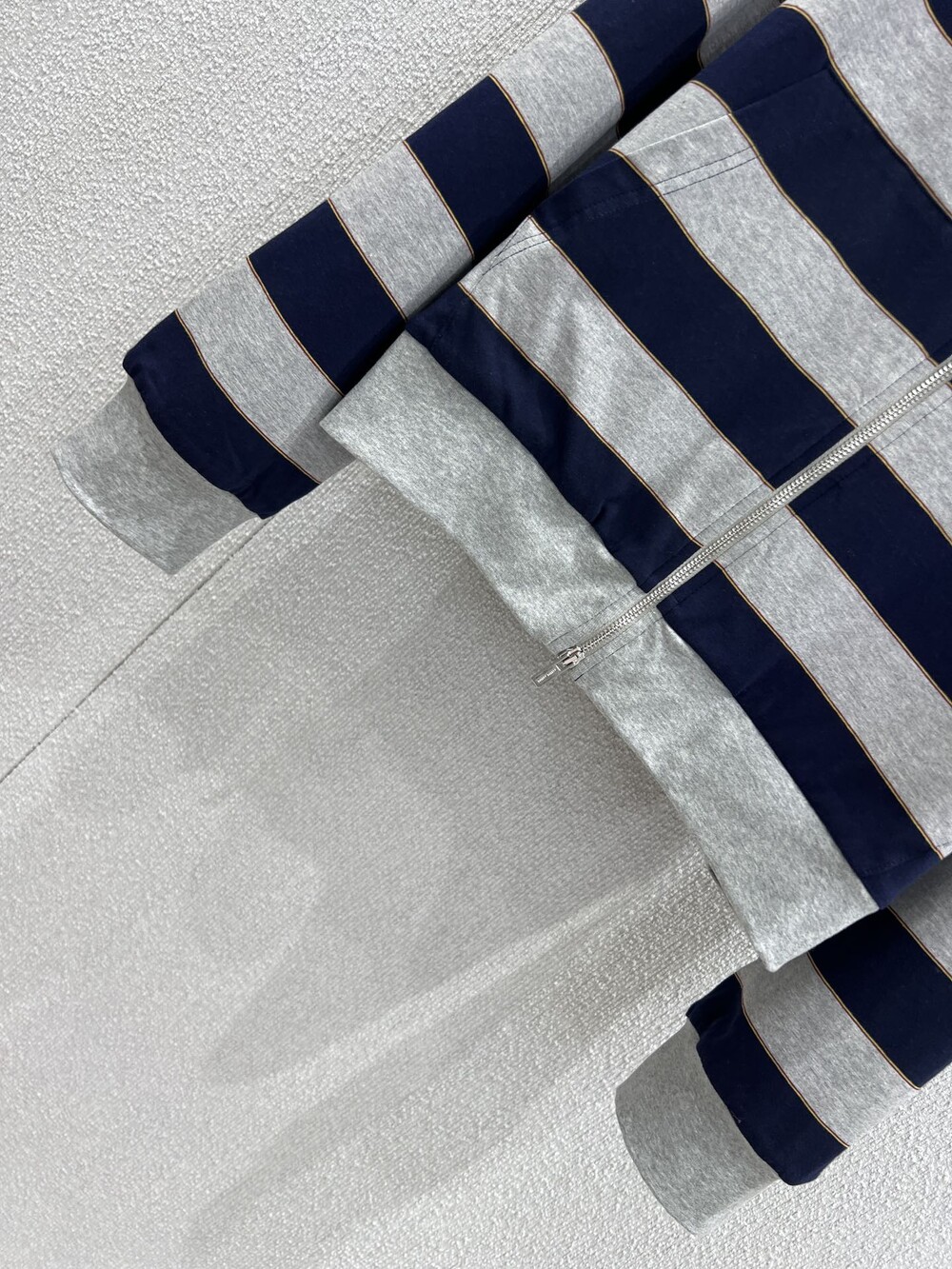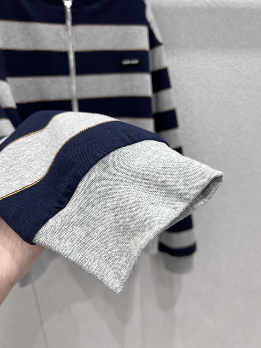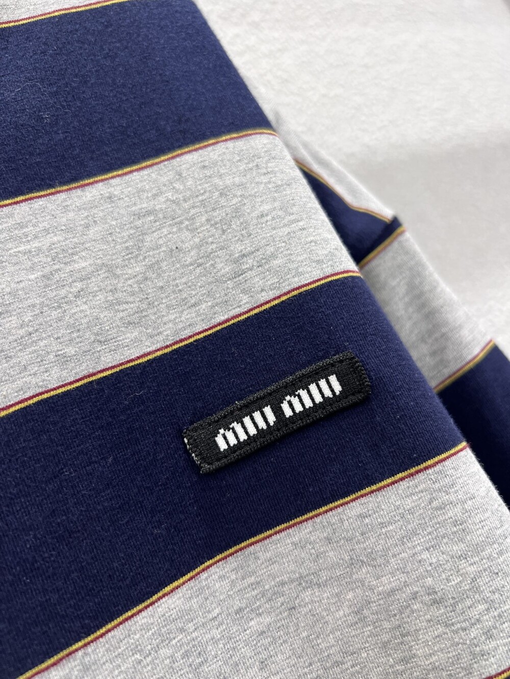 미우미우의 아이코닉한 스트라이프가 클래식한 그레이 멜란지와 컬러 대비로 재해석되어, 레이어드 룩에 이상적인 후디의 실루엣과 저지의 편안한 특성을 강조합니다.