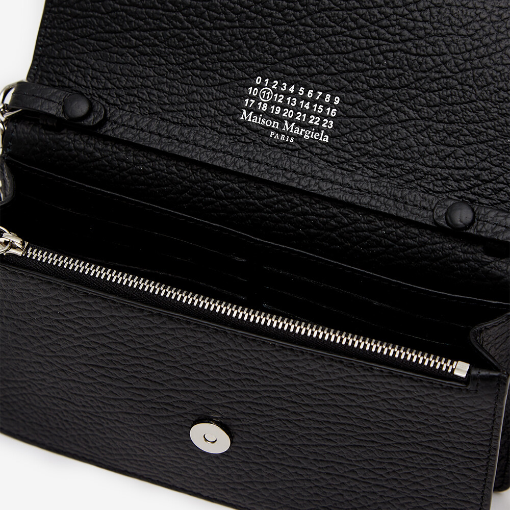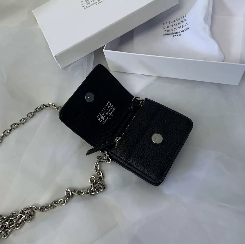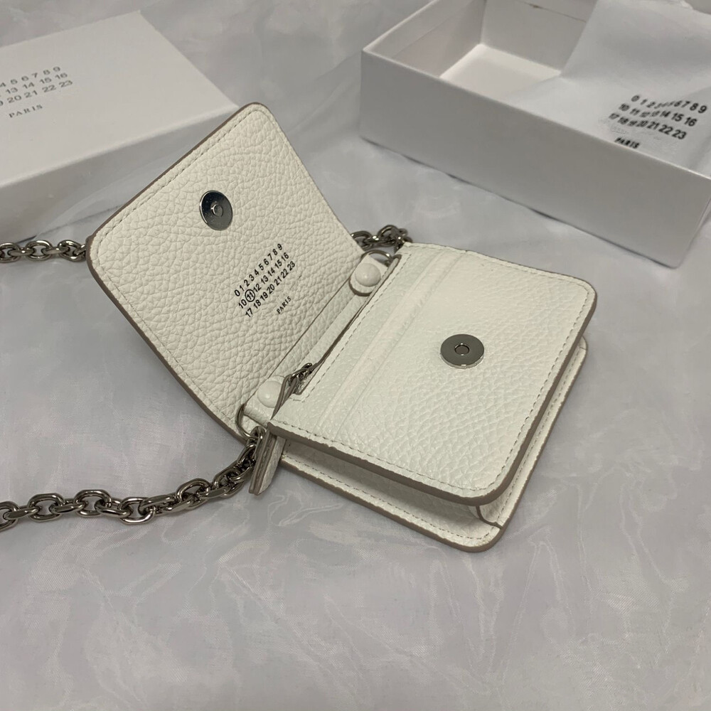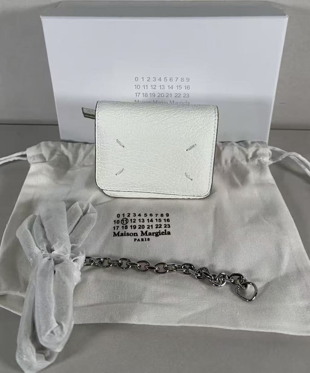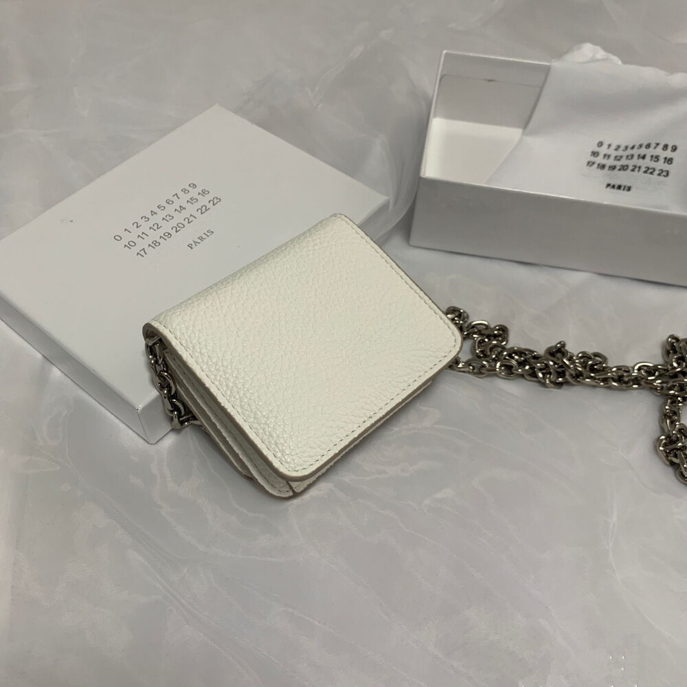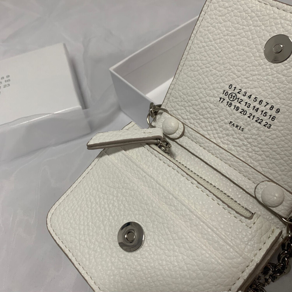그레인 가죽 소재의 지갑. 체인. 내부에 숫자 로고, 지퍼 동전 지갑, 카드 및 지폐 슬롯. 뒷면에 메종 마르지엘라의 손길을 보여주는 라벨 반대편에서 보이는 4개의 화이트 스티치