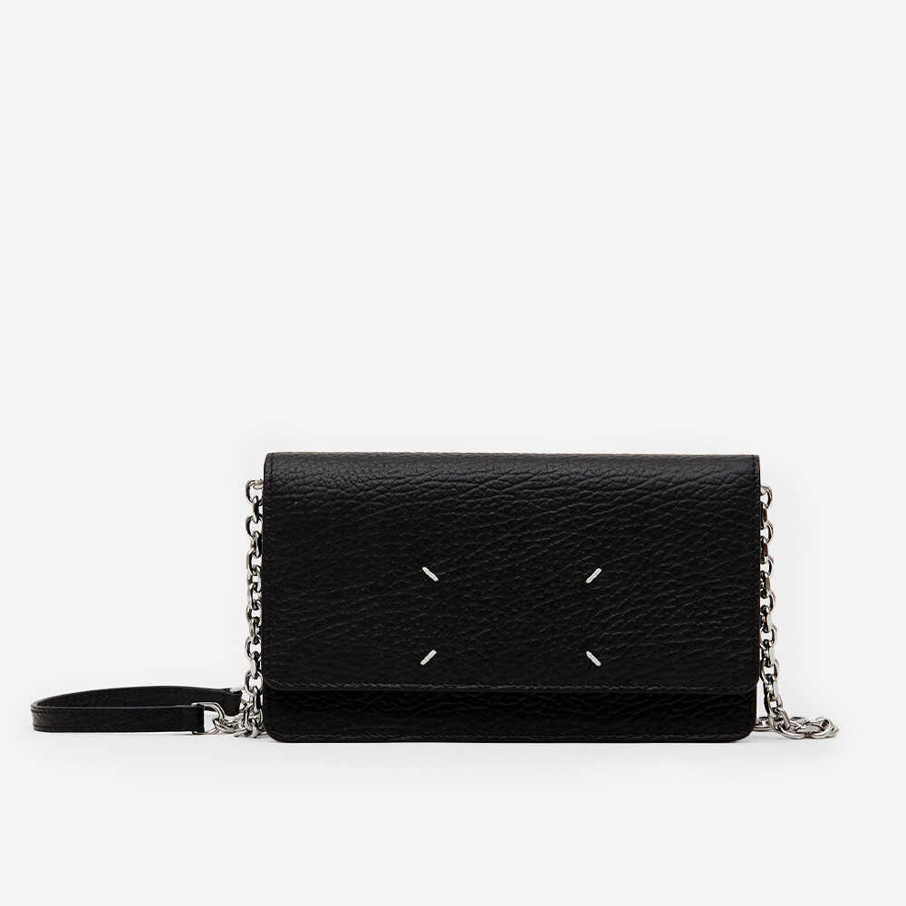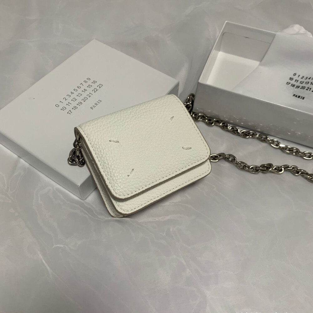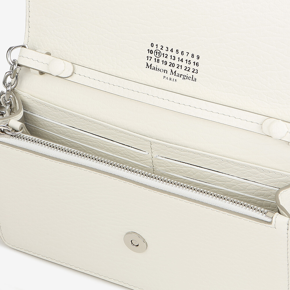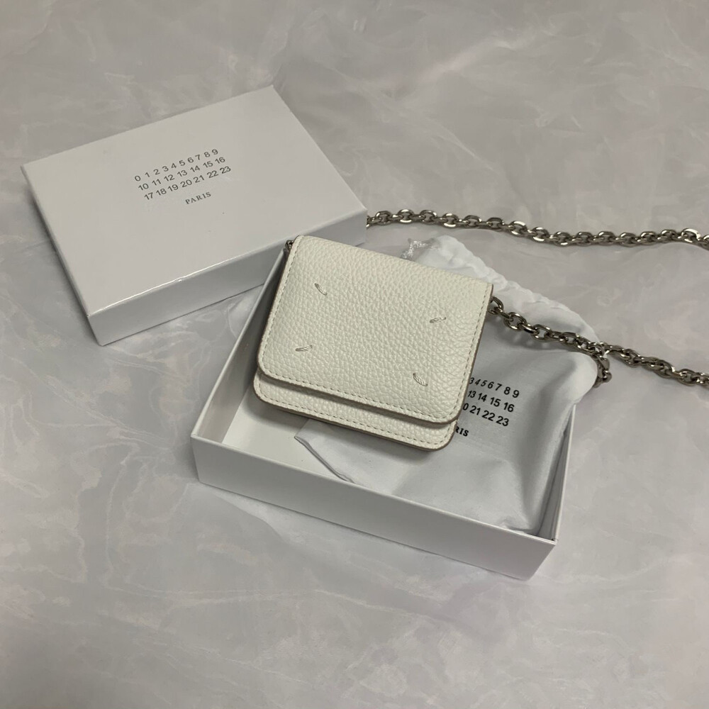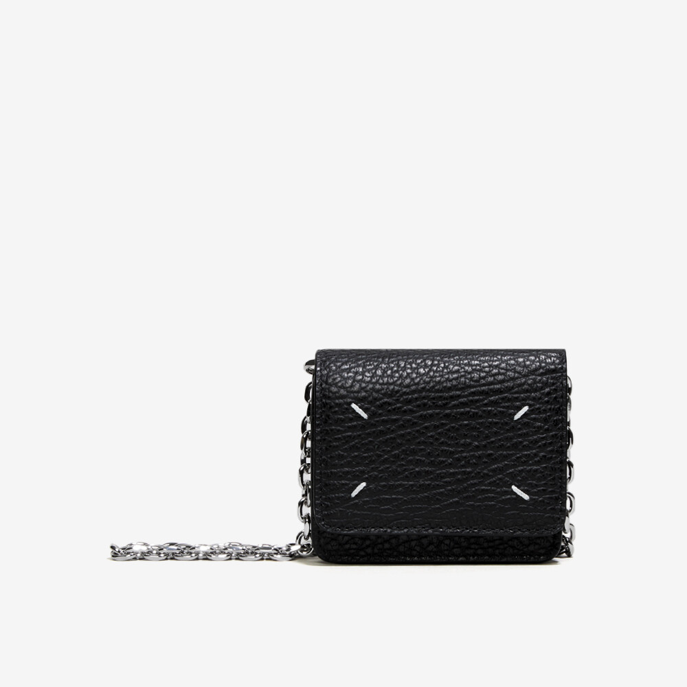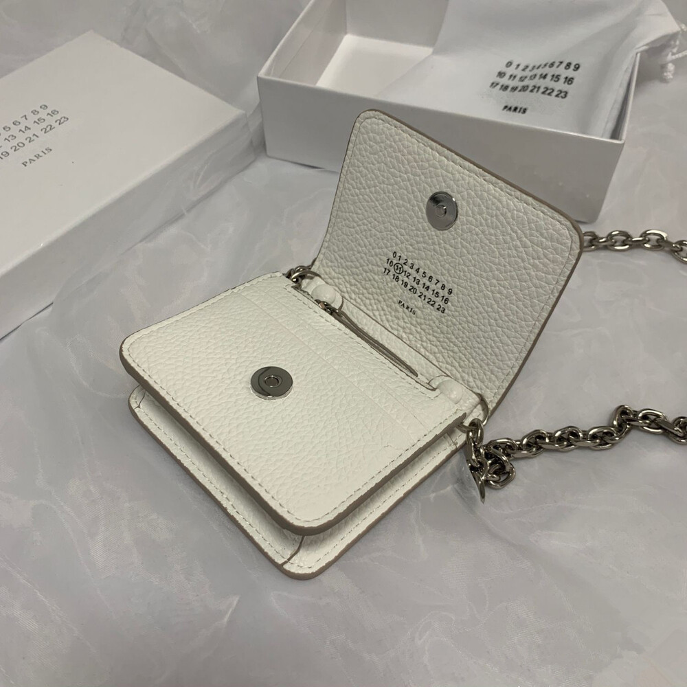 그레인 가죽 소재의 지갑. 체인. 내부에 숫자 로고, 지퍼 동전 지갑, 카드 및 지폐 슬롯. 뒷면에 메종 마르지엘라의 손길을 보여주는 라벨 반대편에서 보이는 4개의 화이트 스티치