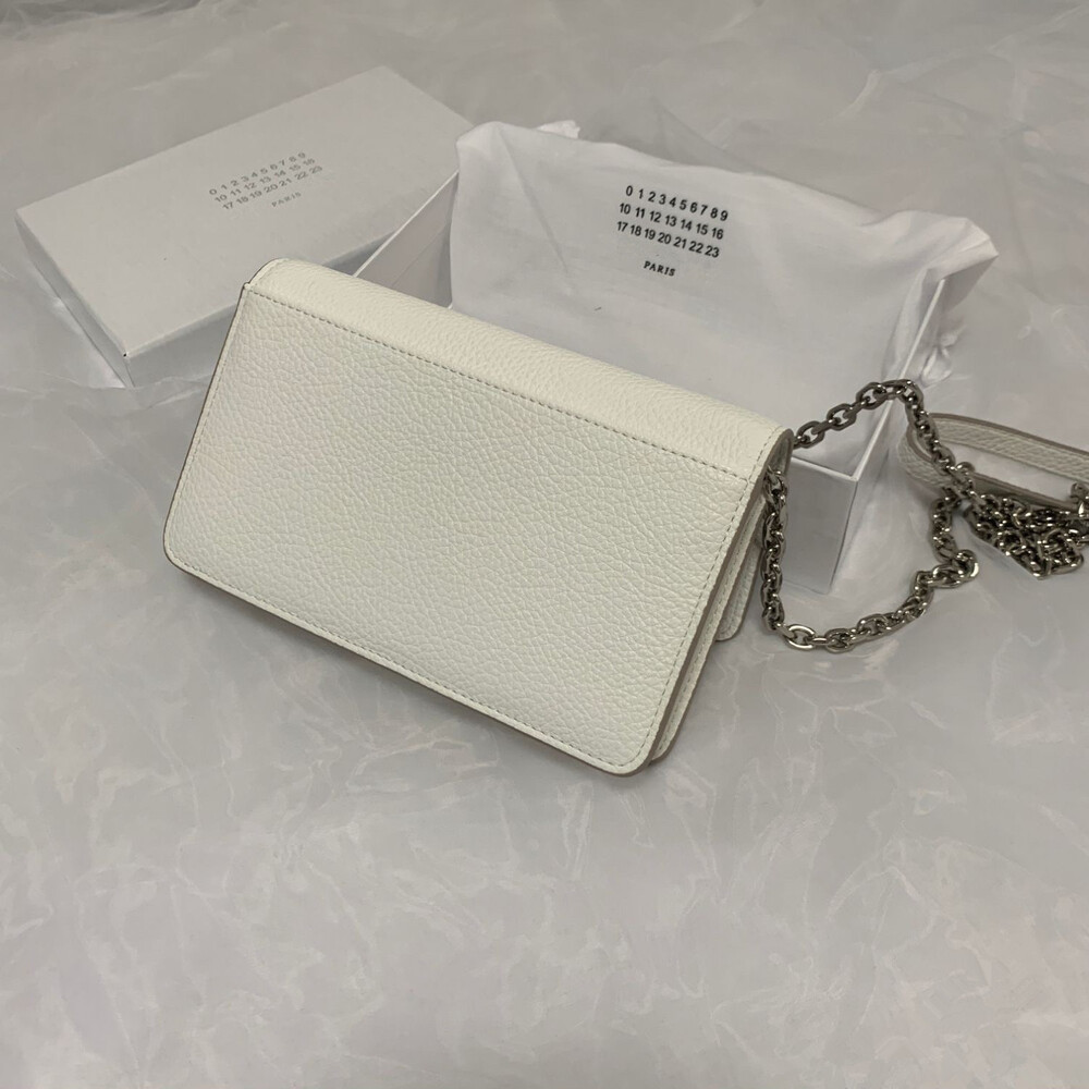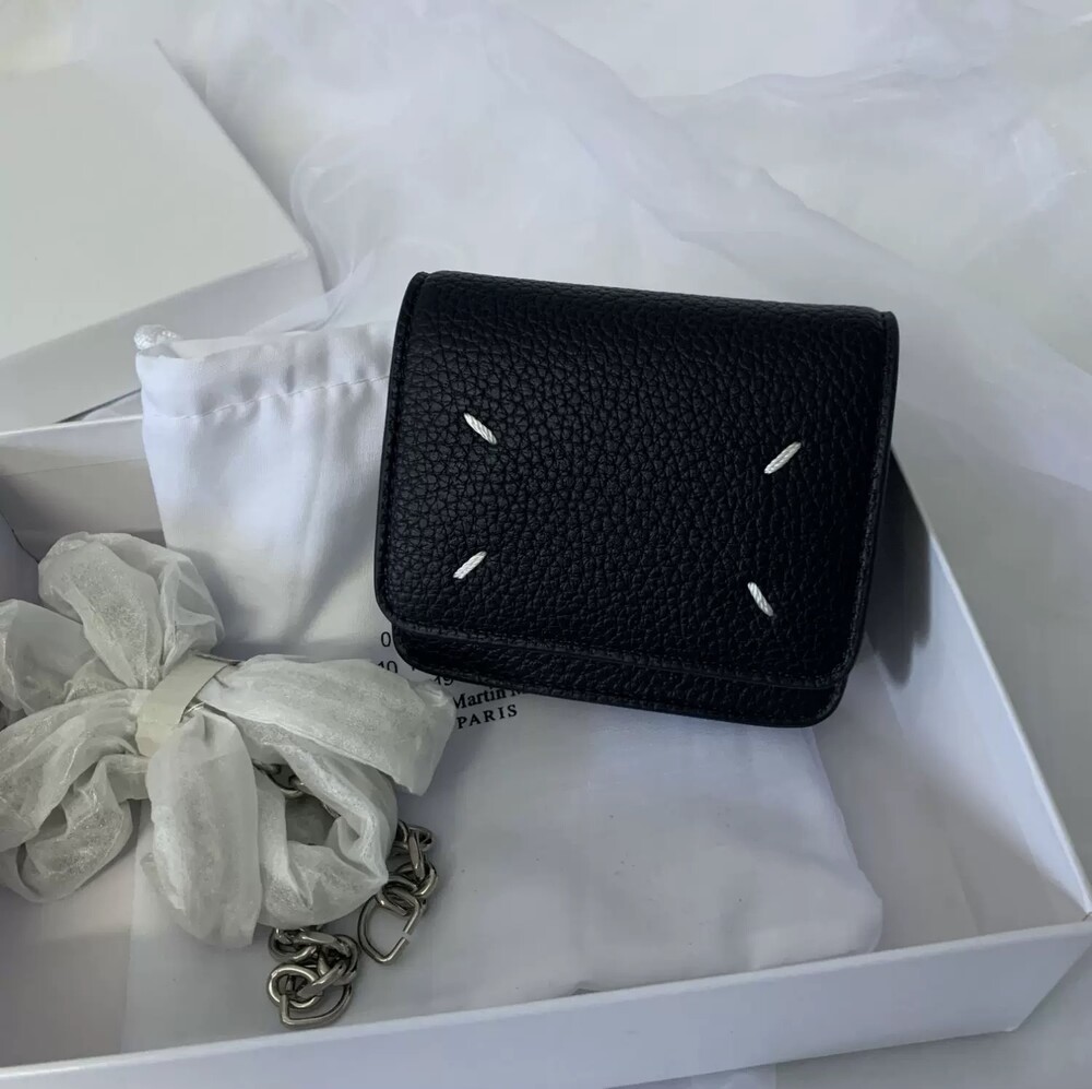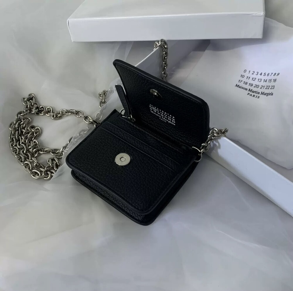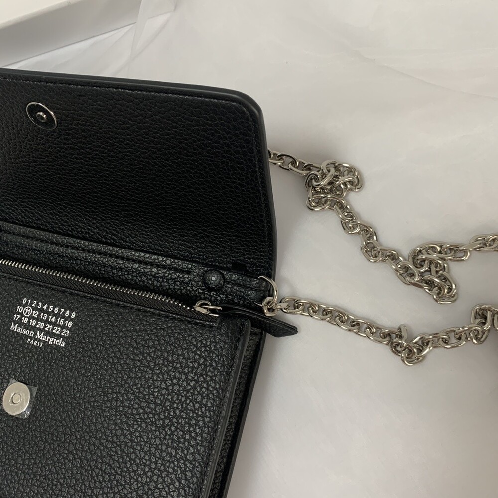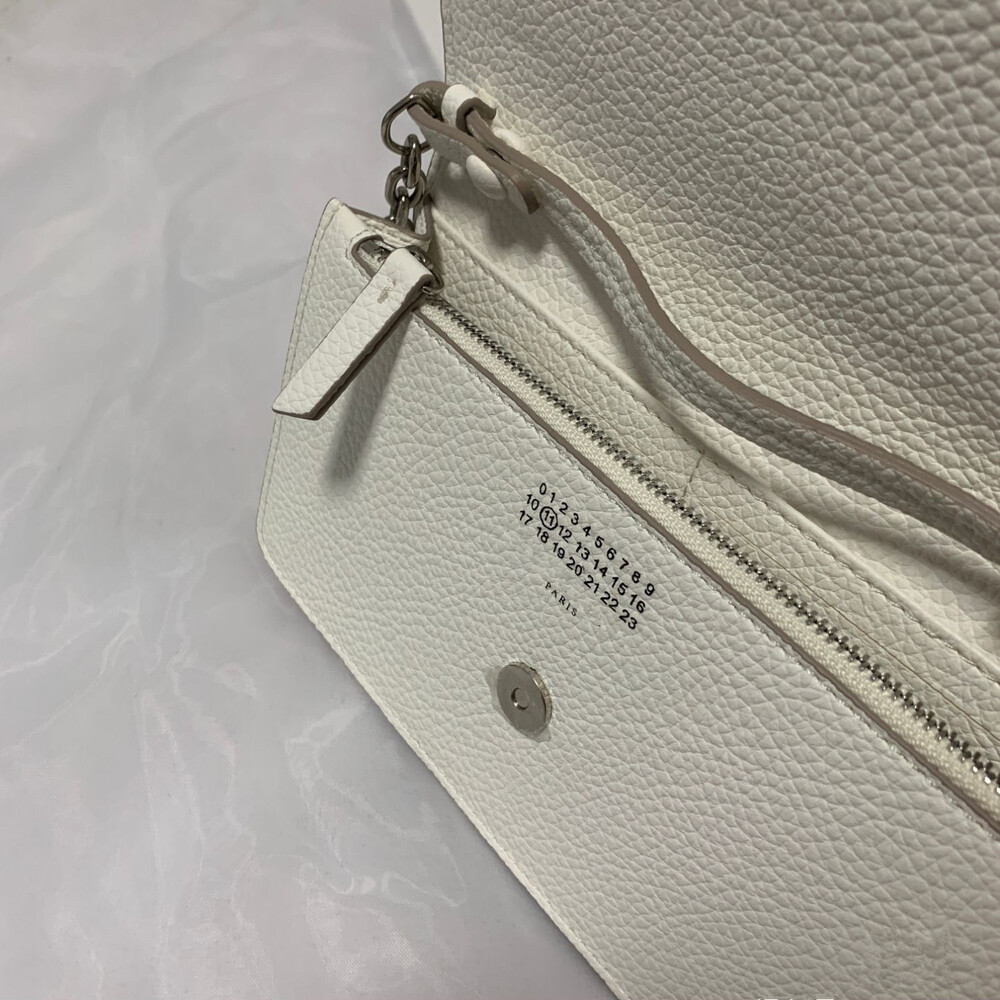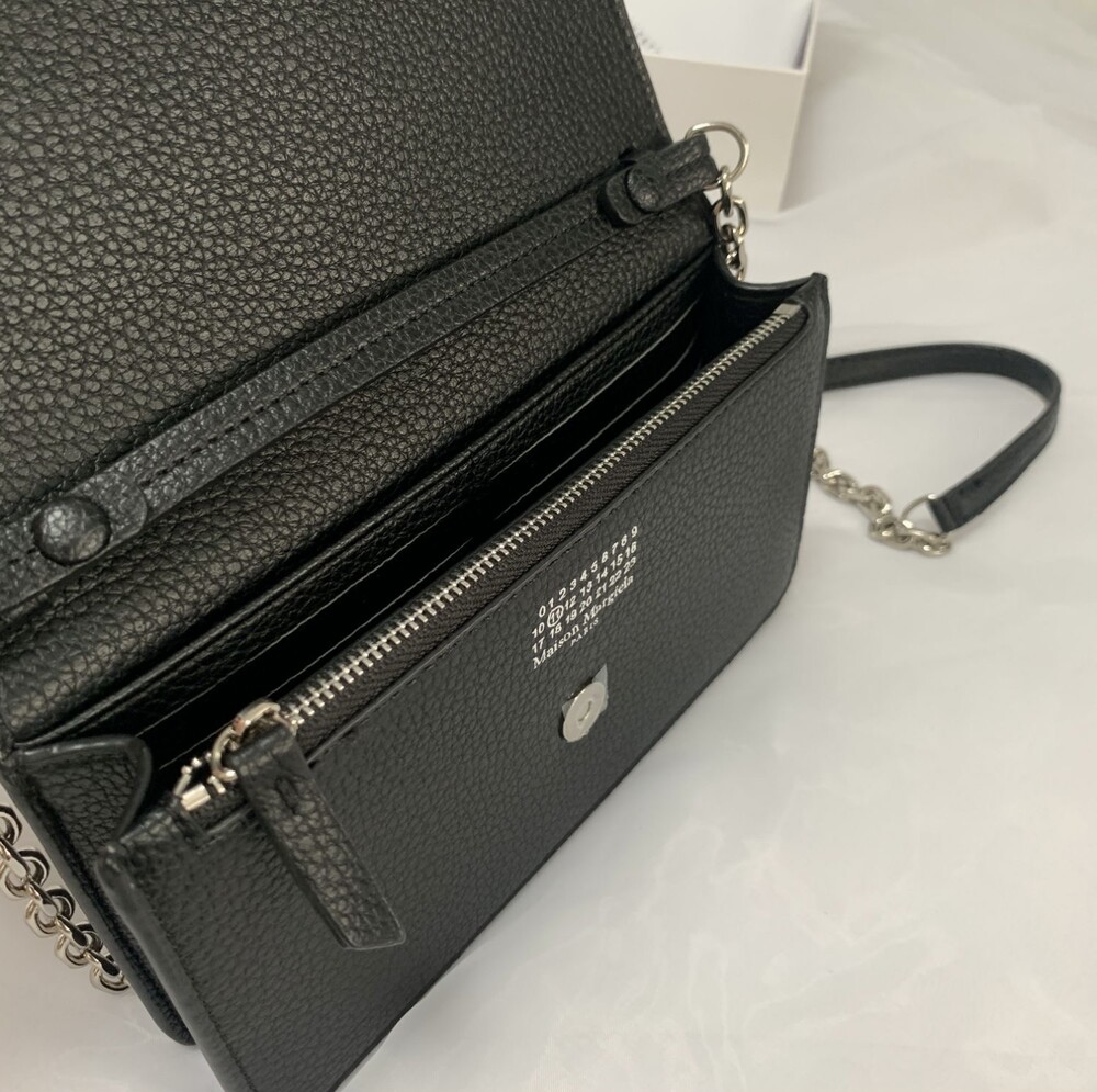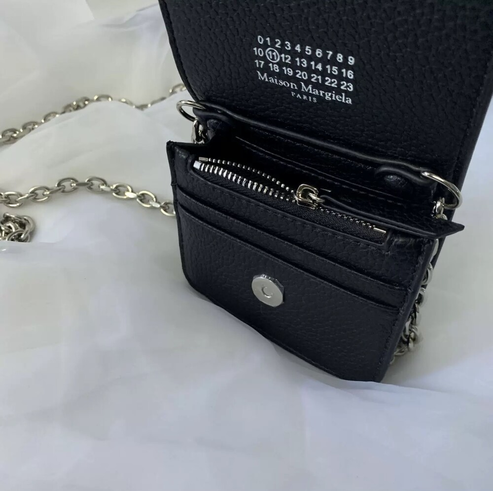 그레인 가죽 소재의 지갑. 체인. 내부에 숫자 로고, 지퍼 동전 지갑, 카드 및 지폐 슬롯. 뒷면에 메종 마르지엘라의 손길을 보여주는 라벨 반대편에서 보이는 4개의 화이트 스티치