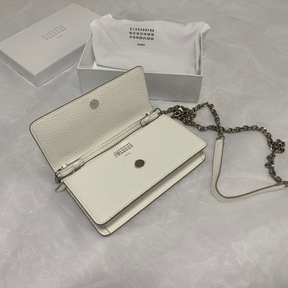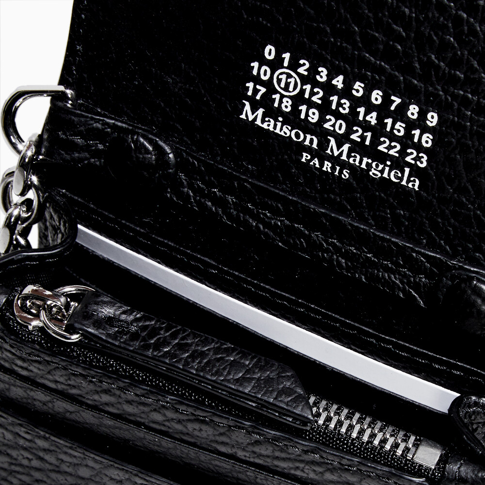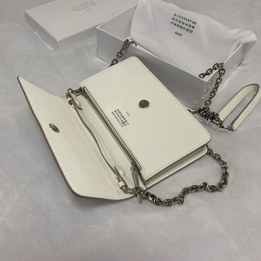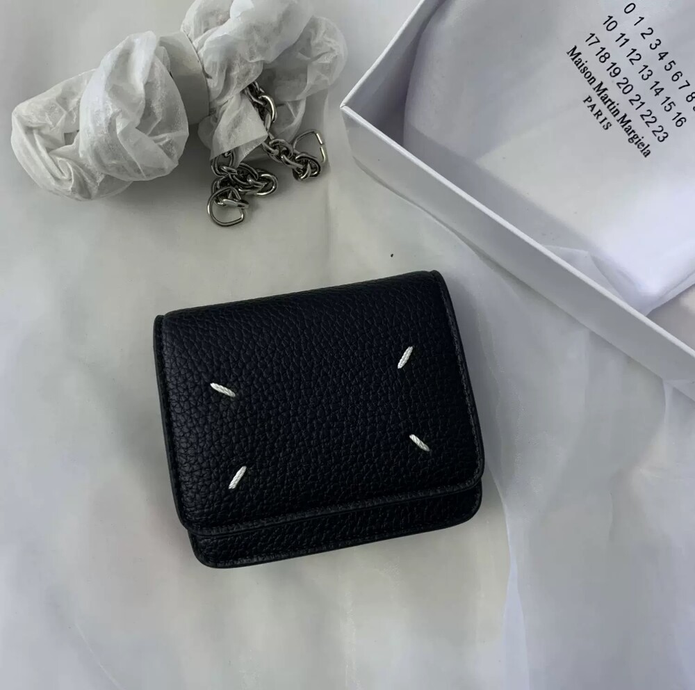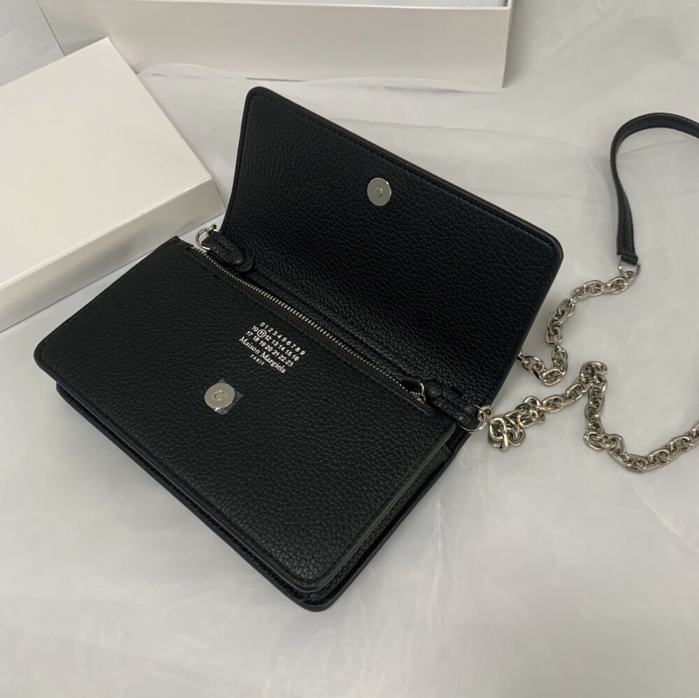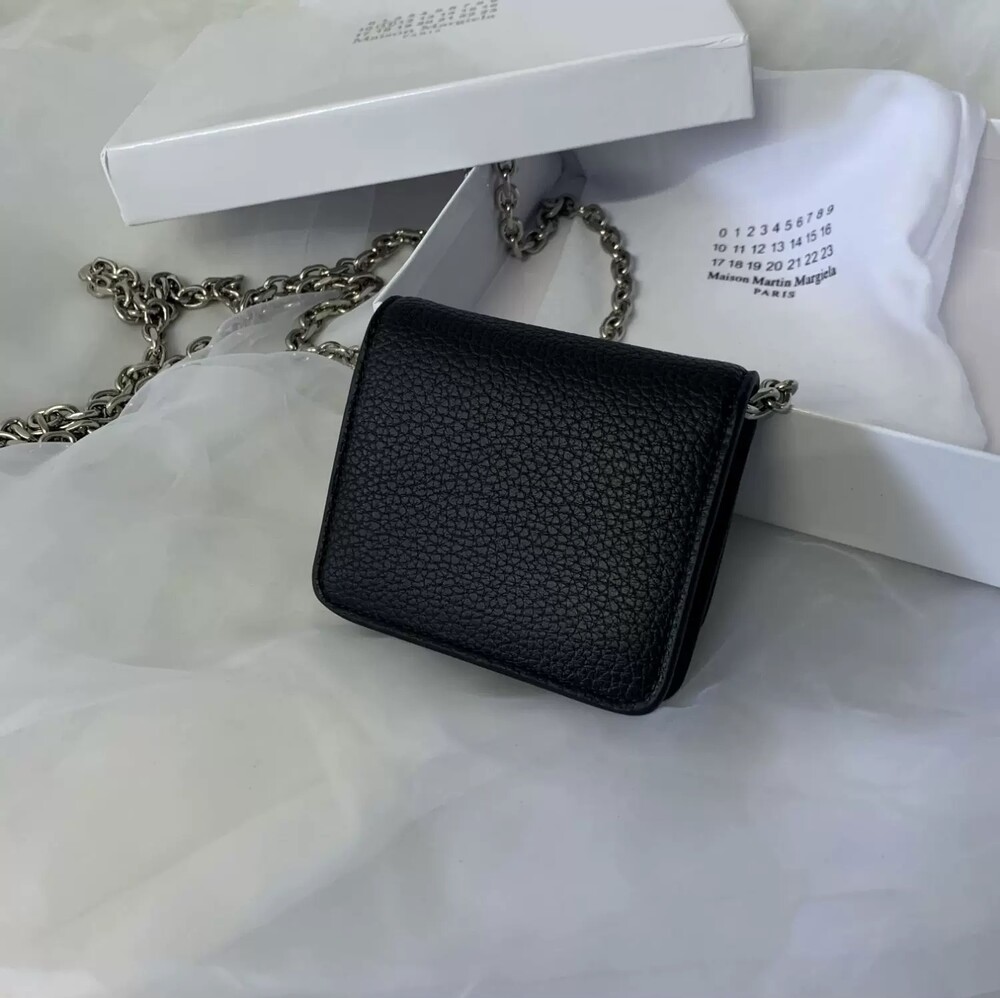 그레인 가죽 소재의 지갑. 체인. 내부에 숫자 로고, 지퍼 동전 지갑, 카드 및 지폐 슬롯. 뒷면에 메종 마르지엘라의 손길을 보여주는 라벨 반대편에서 보이는 4개의 화이트 스티치